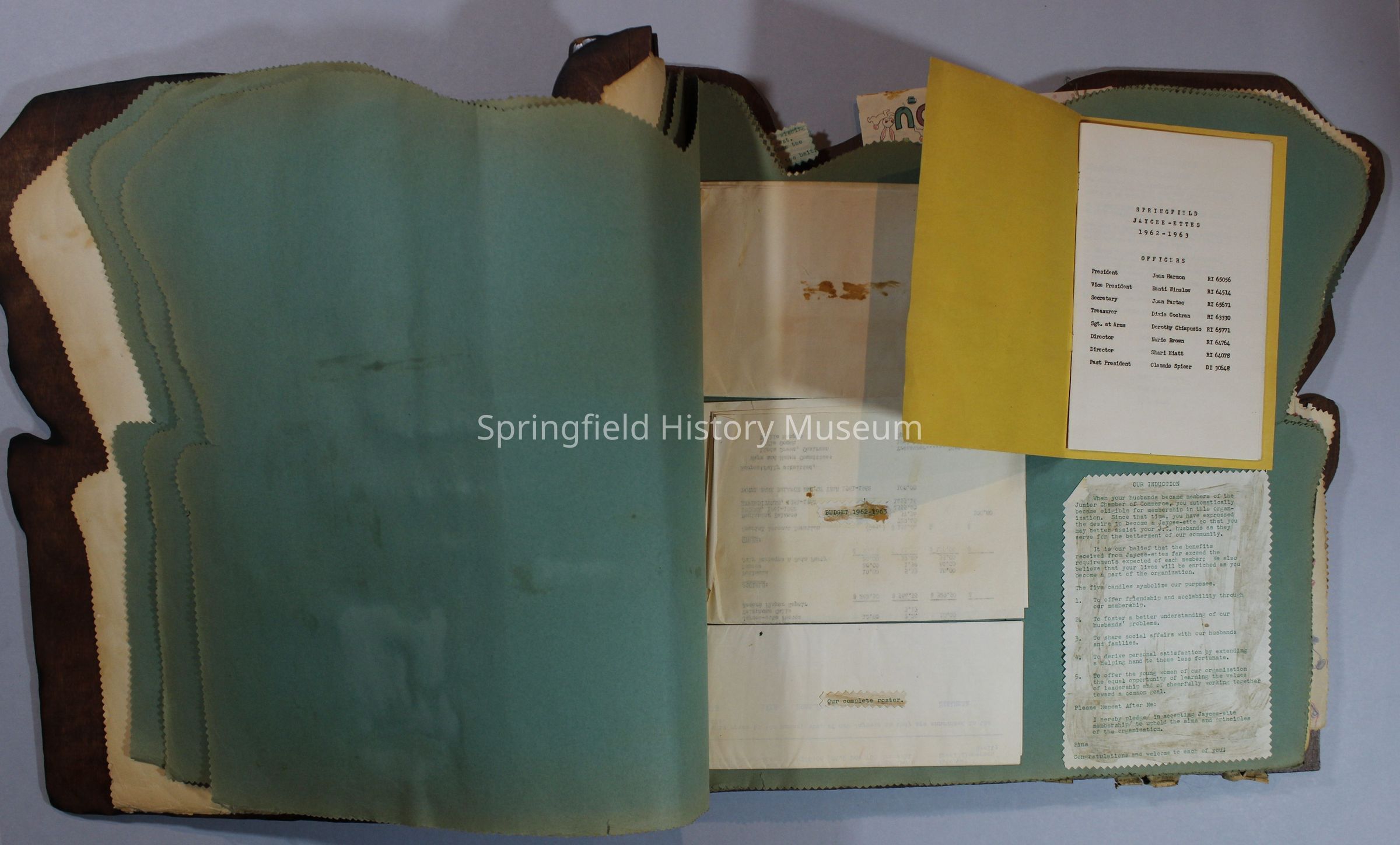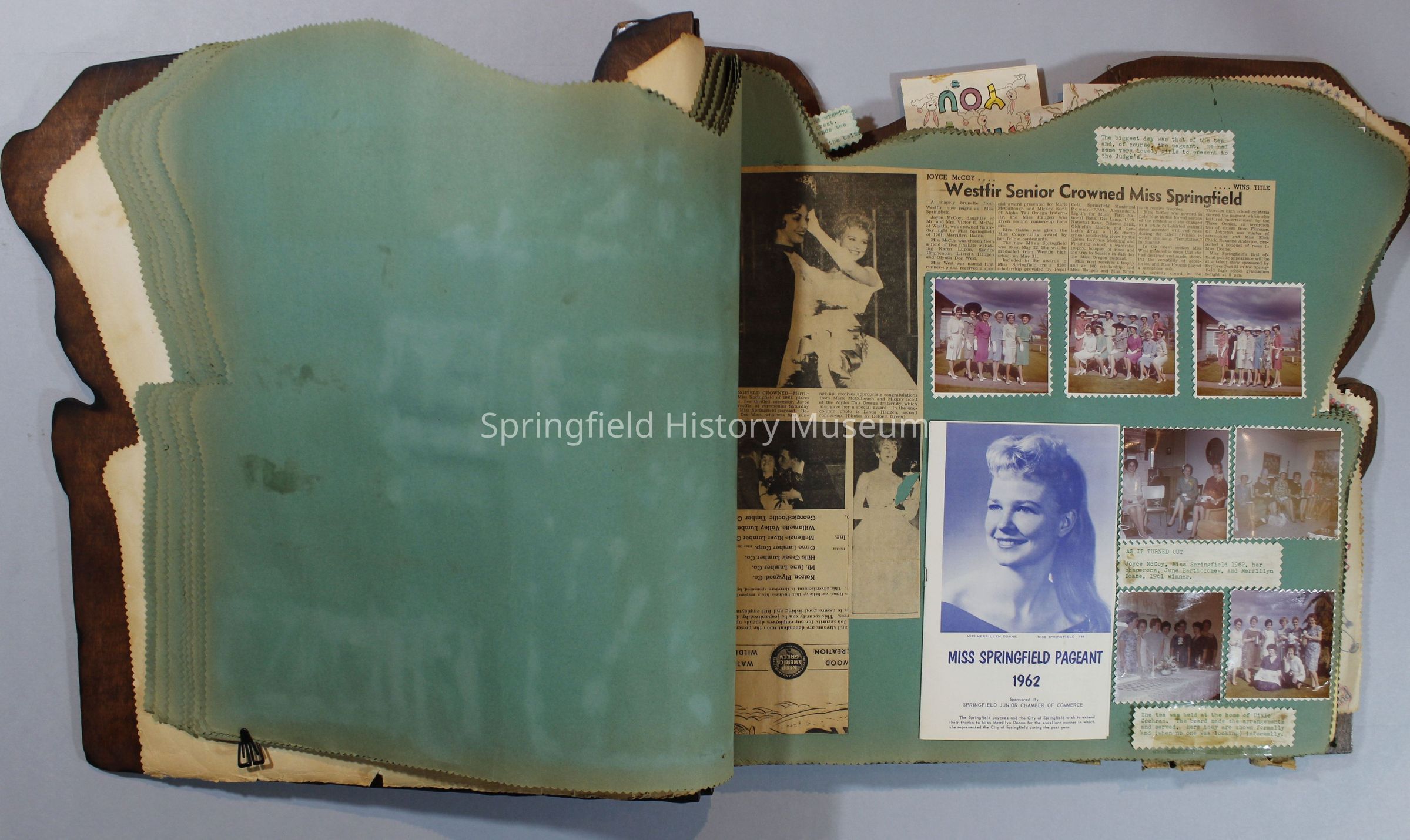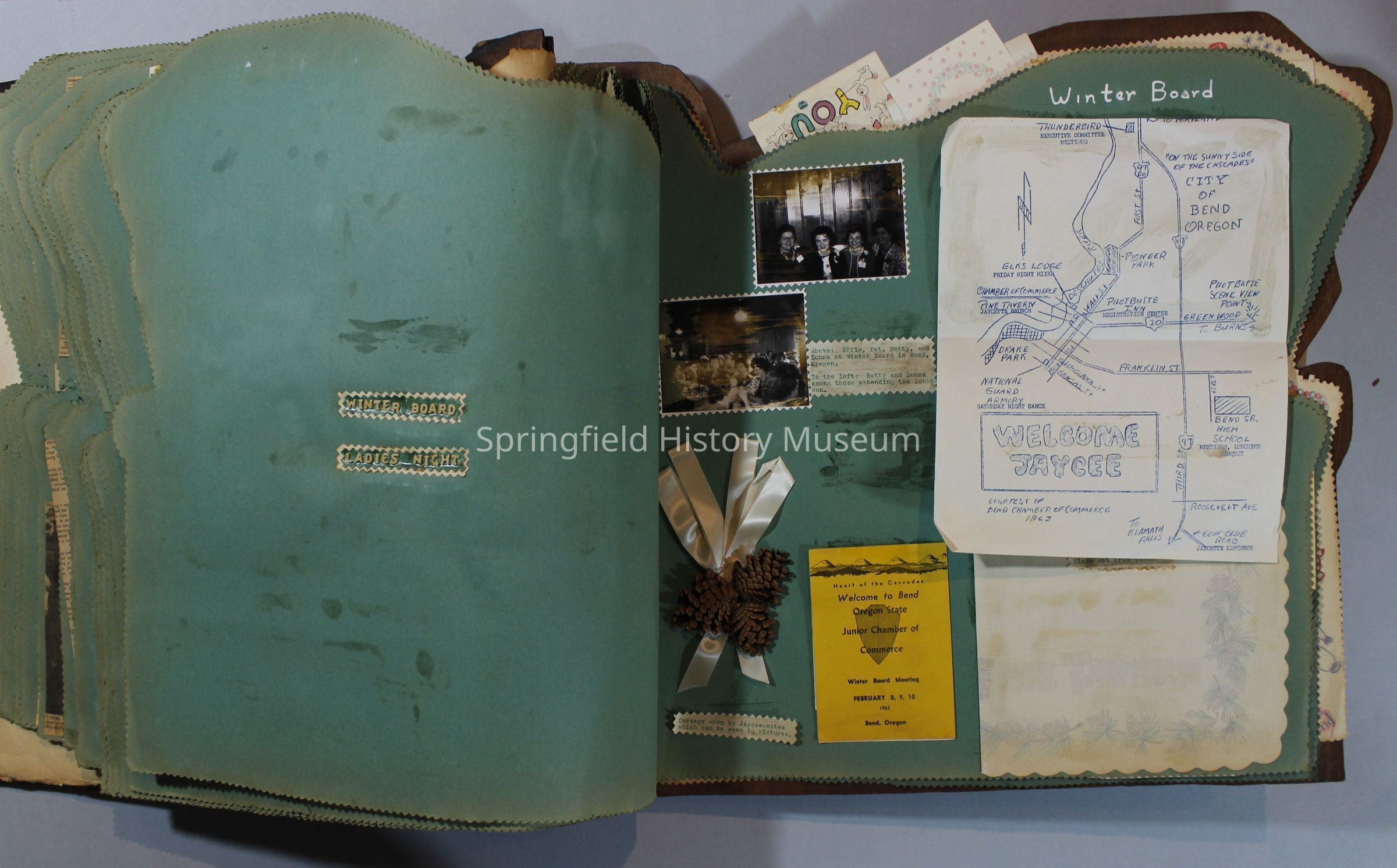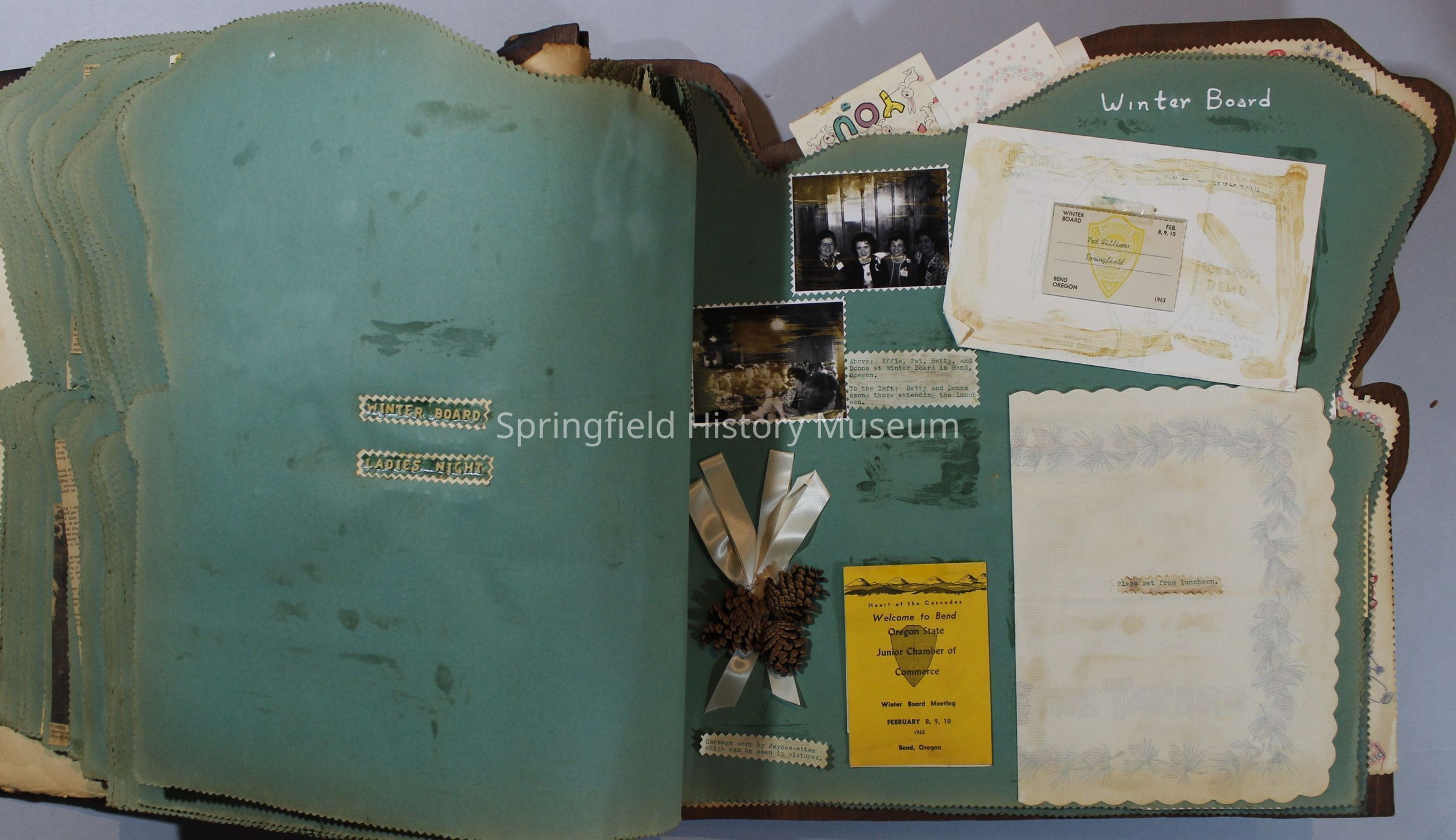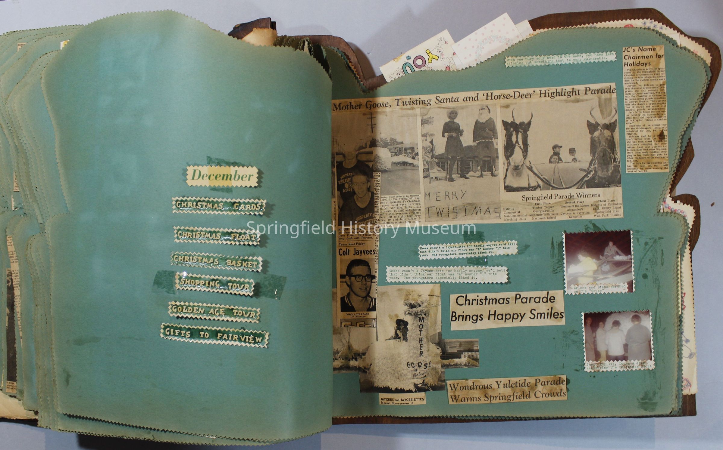 Scrapbook of Springfield, Oregon Jaycee-ettes, Joan Harman Possion, was President at the time of events.1962-1963, scrapbook cover is of wood with brass color hinges. The scrapbook contains newspaper articles, photo's, and cards.