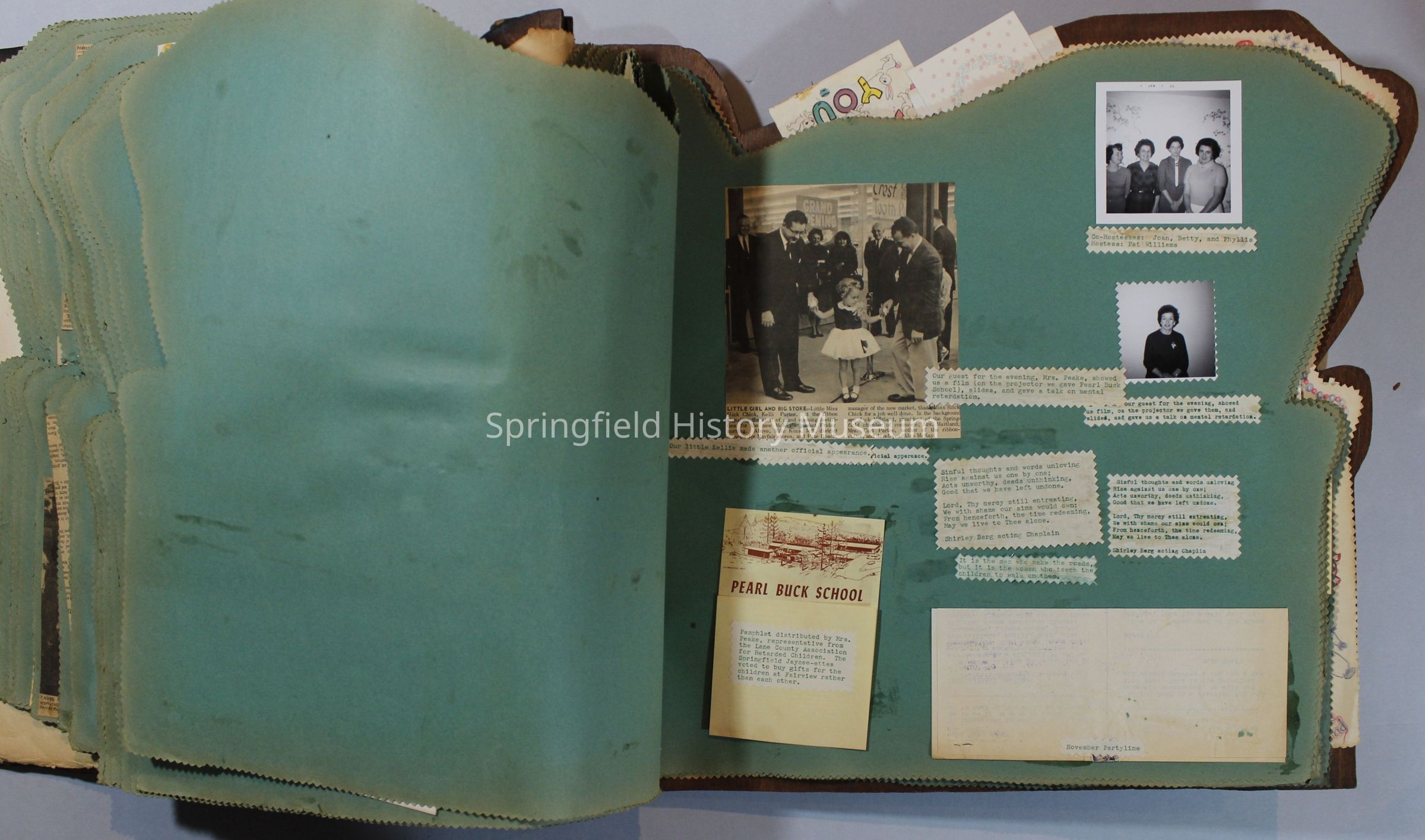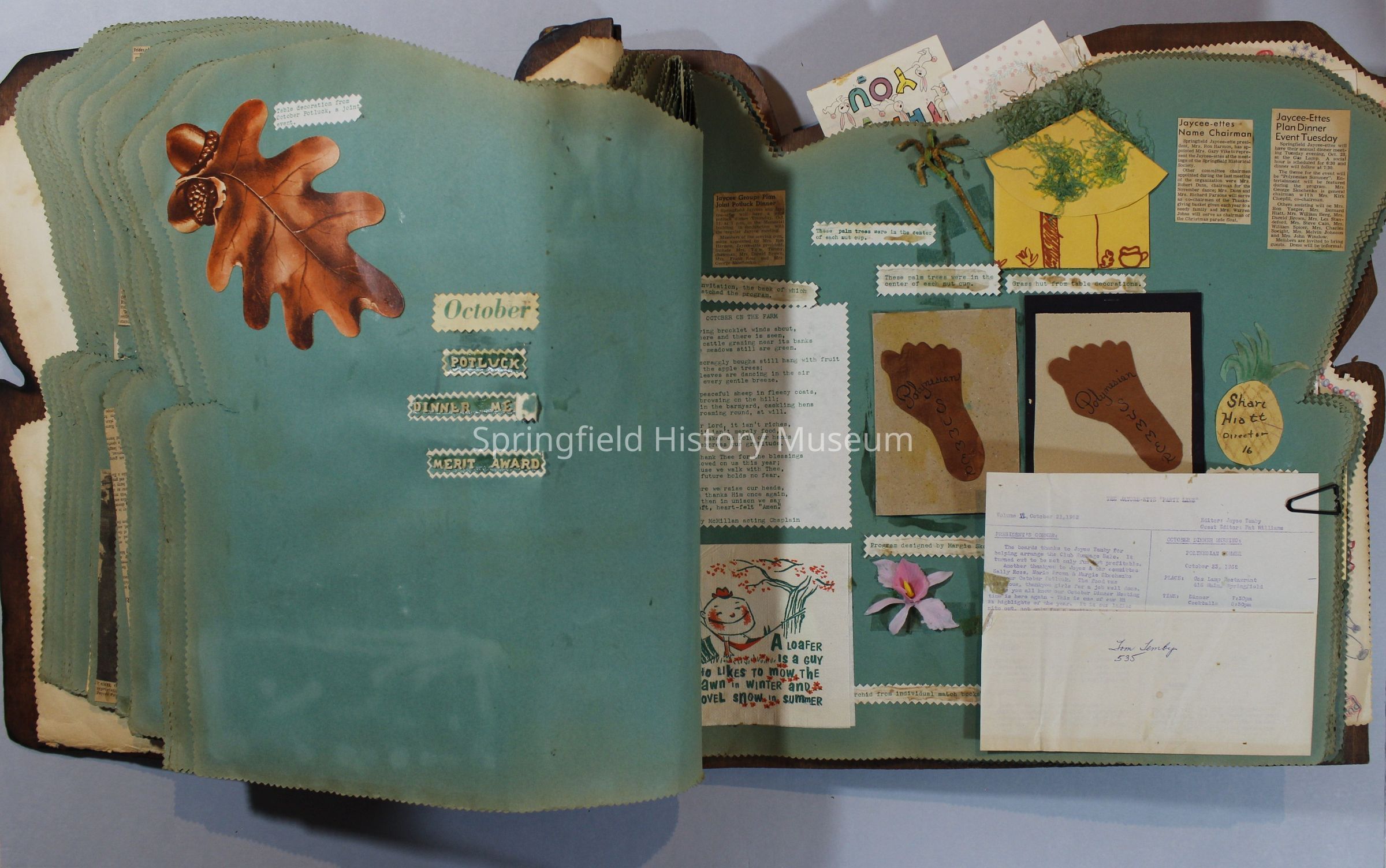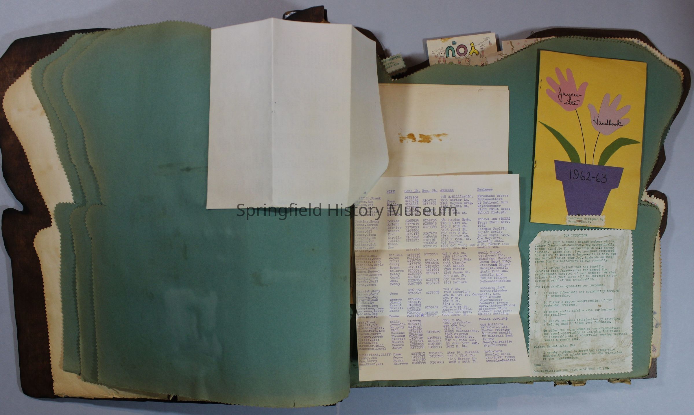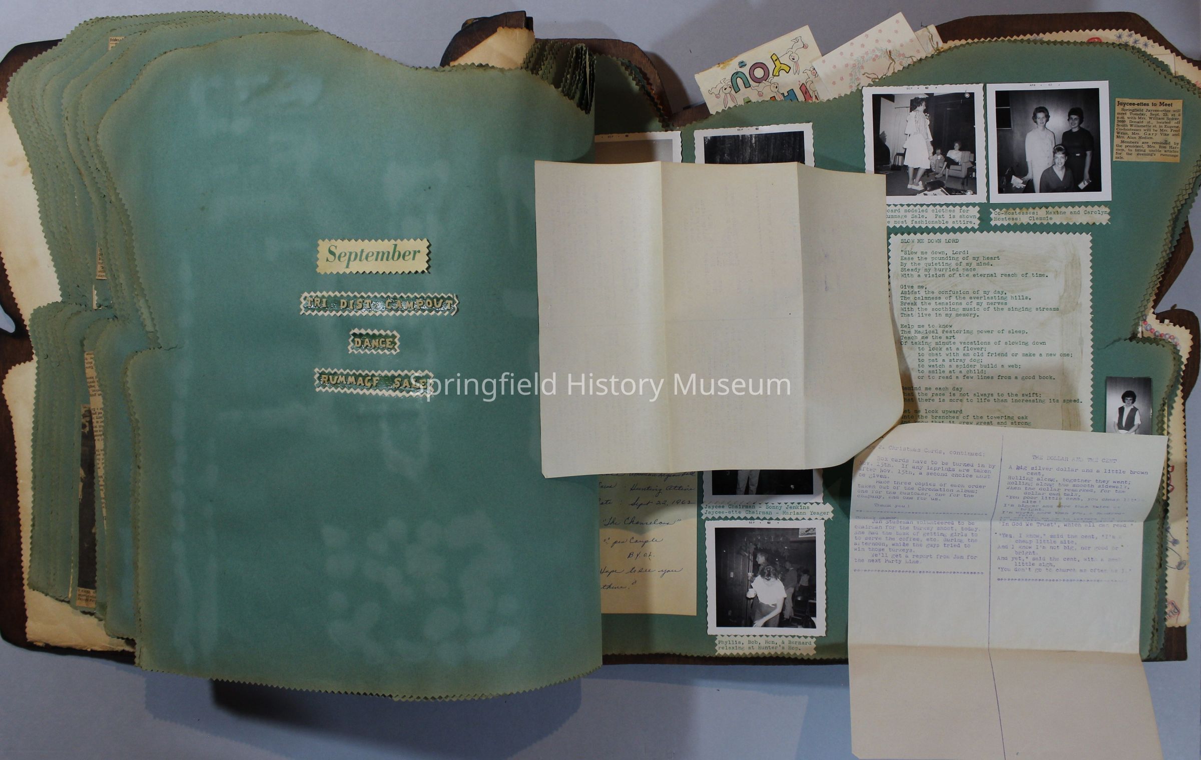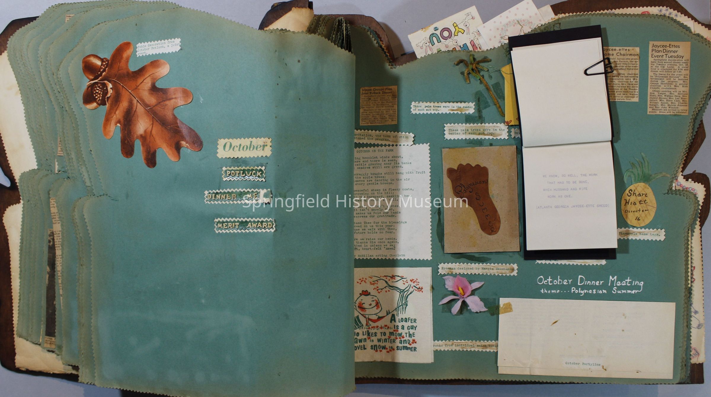 Scrapbook of Springfield, Oregon Jaycee-ettes, Joan Harman Possion, was President at the time of events.1962-1963, scrapbook cover is of wood with brass color hinges. The scrapbook contains newspaper articles, photo's, and cards.