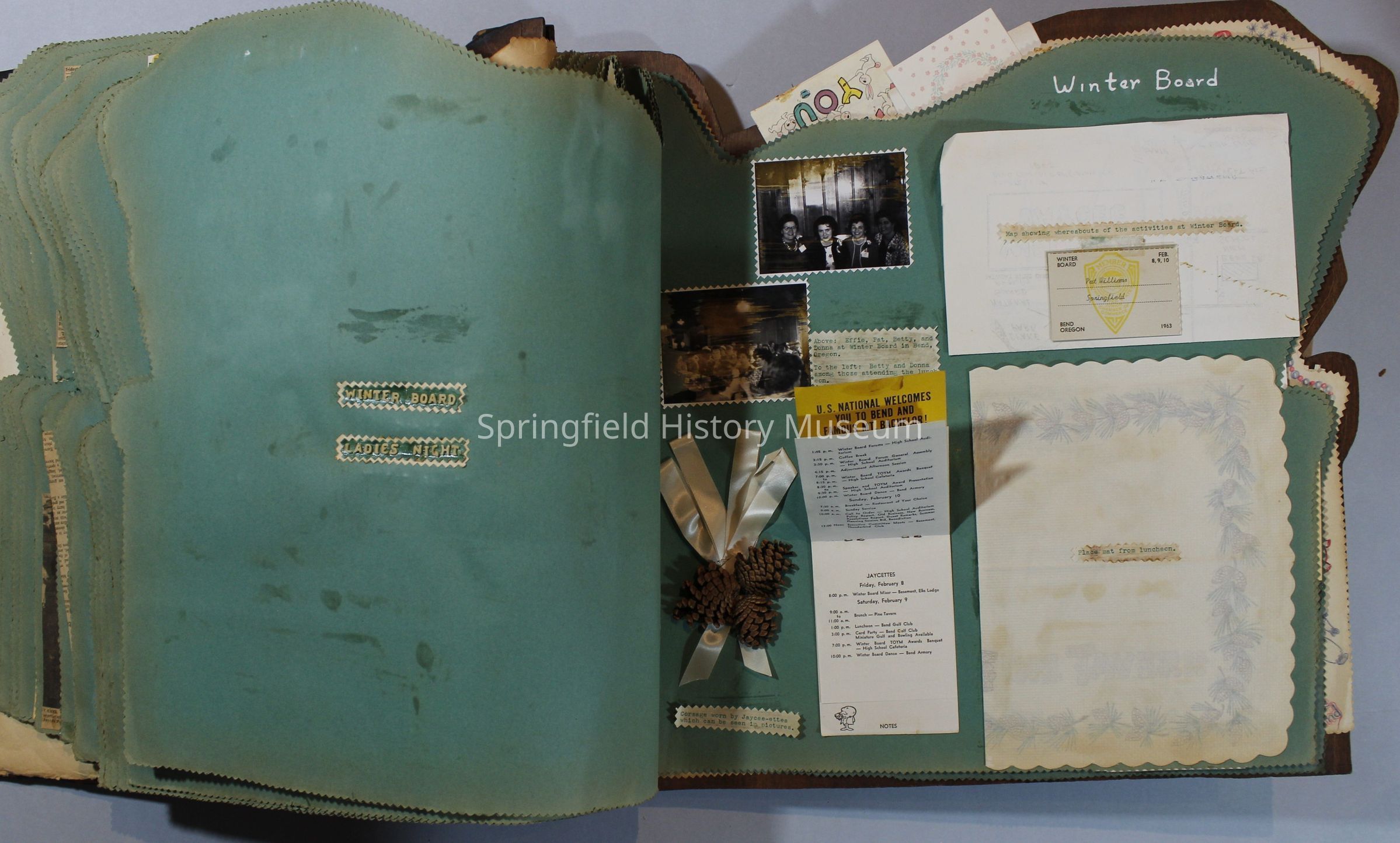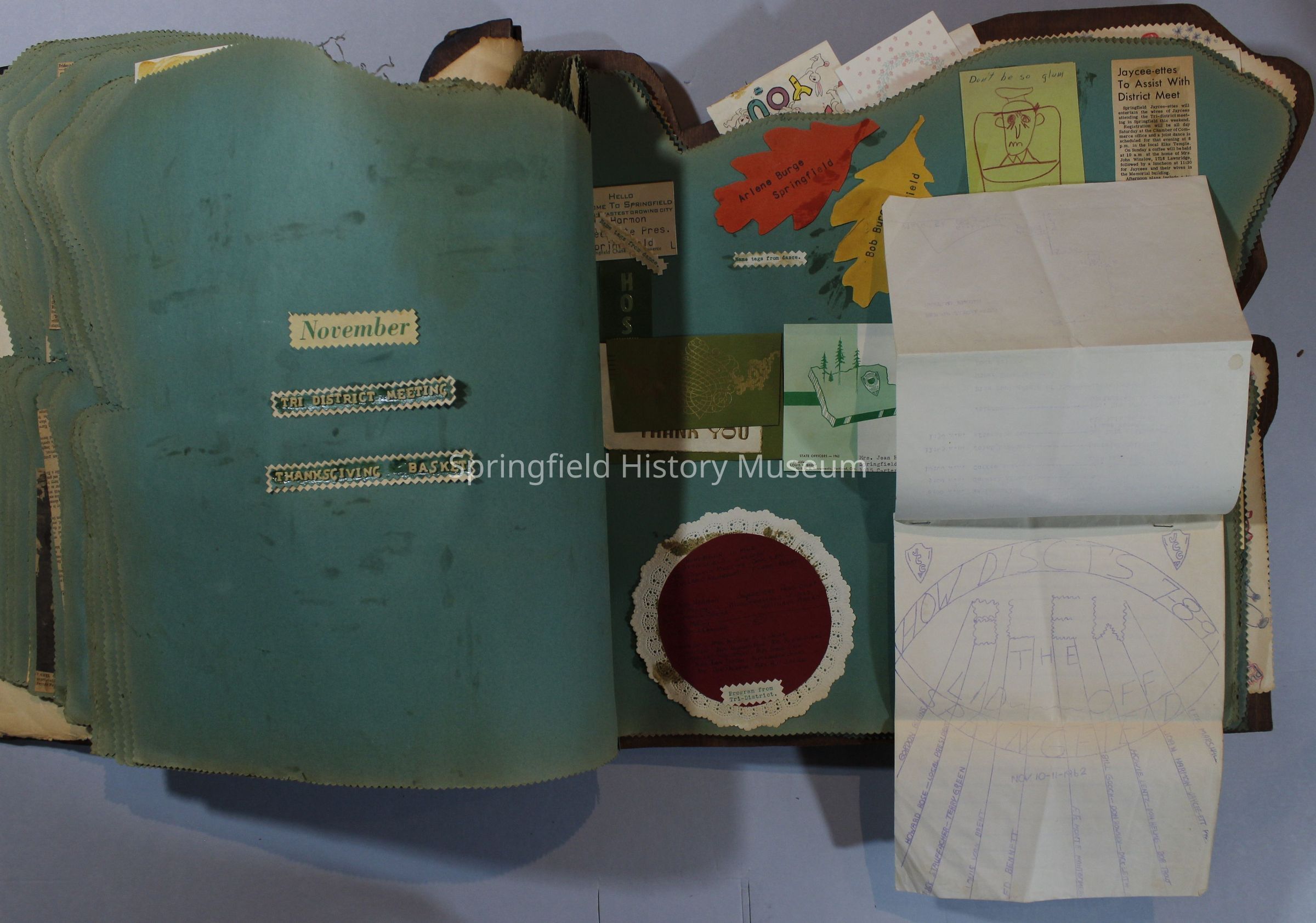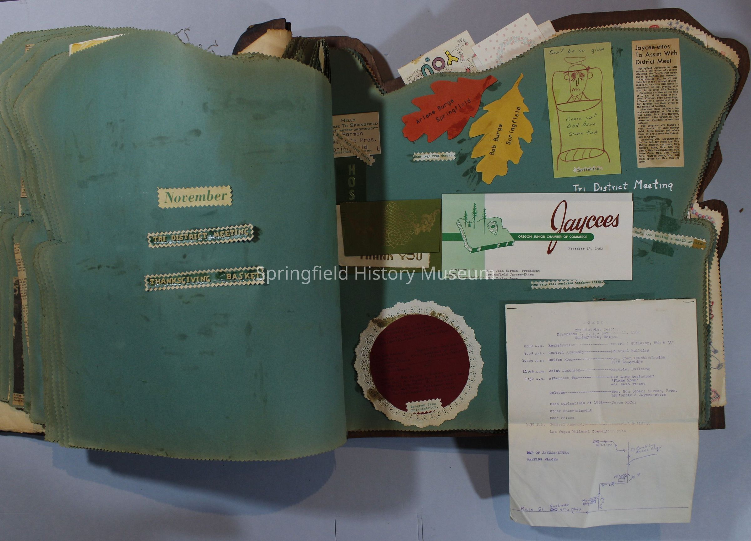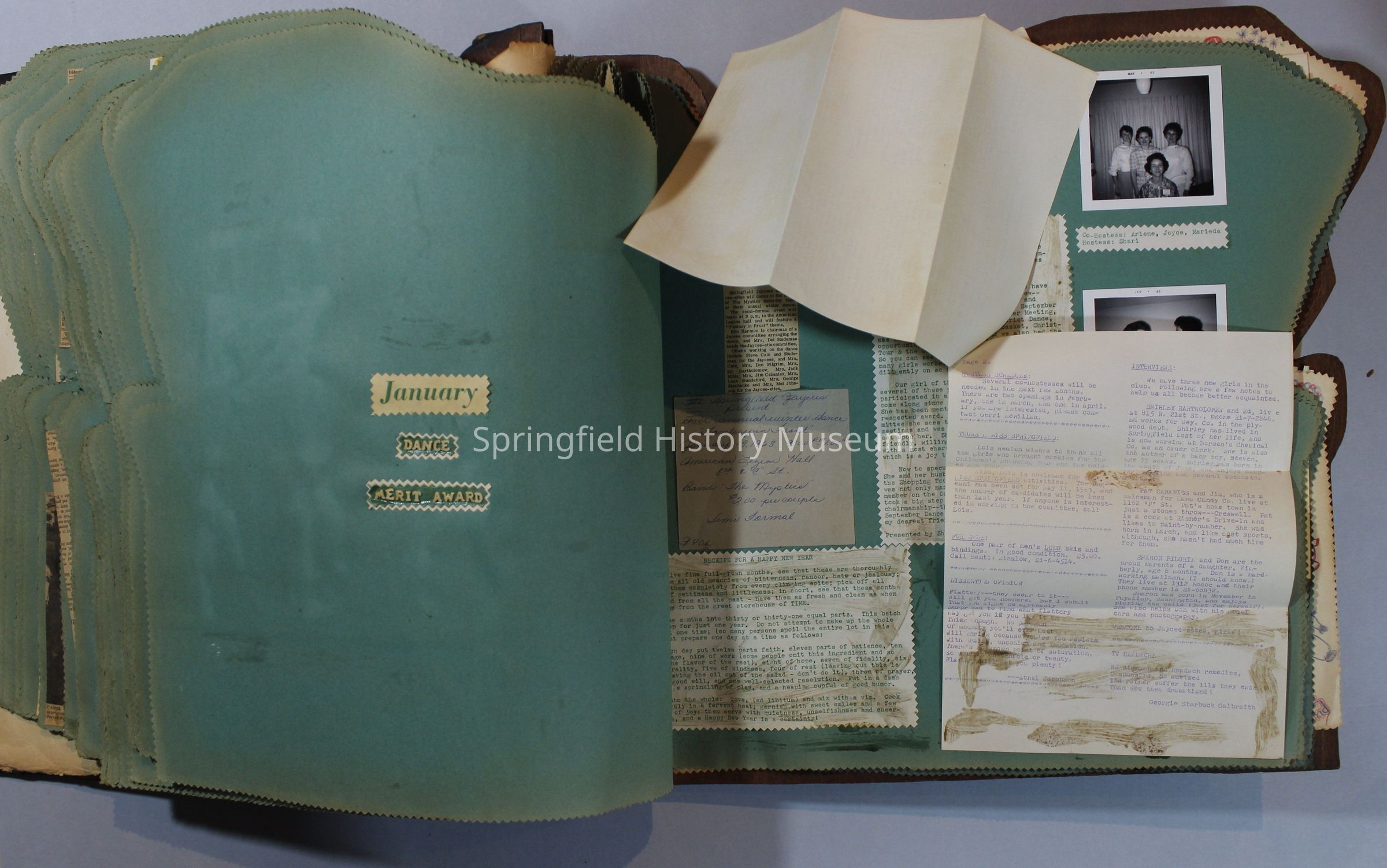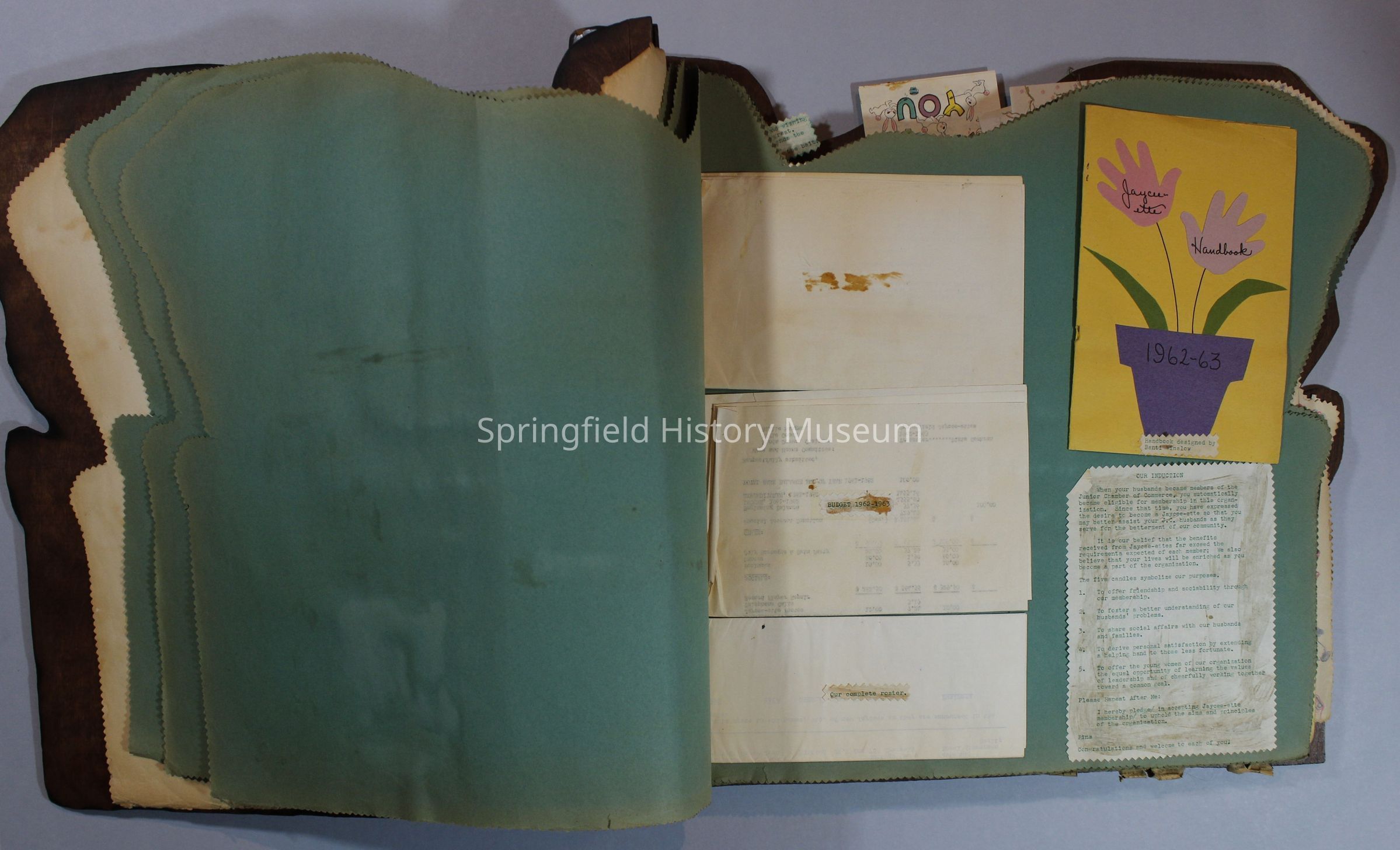 Scrapbook of Springfield, Oregon Jaycee-ettes, Joan Harman Possion, was President at the time of events.1962-1963, scrapbook cover is of wood with brass color hinges. The scrapbook contains newspaper articles, photo's, and cards.