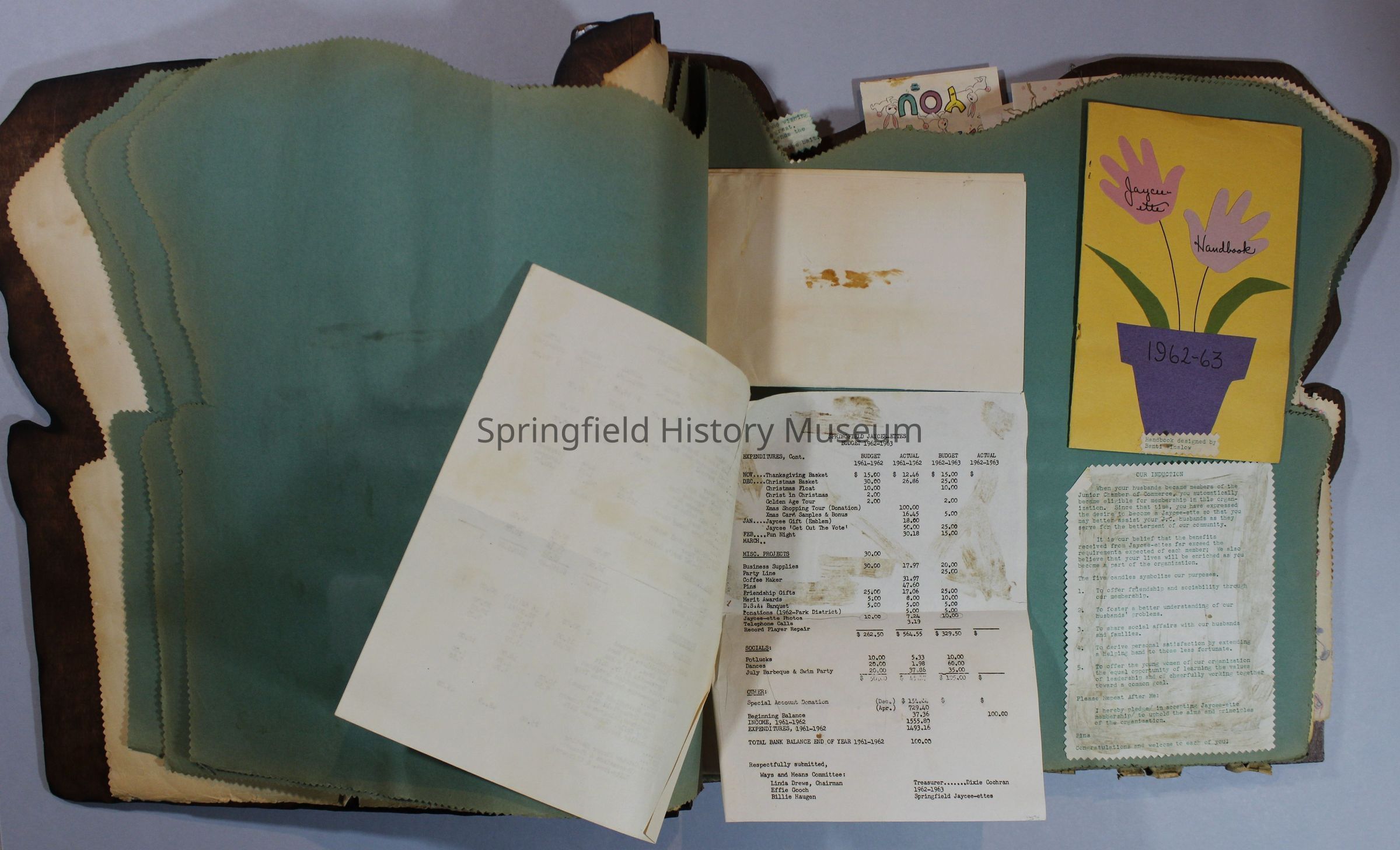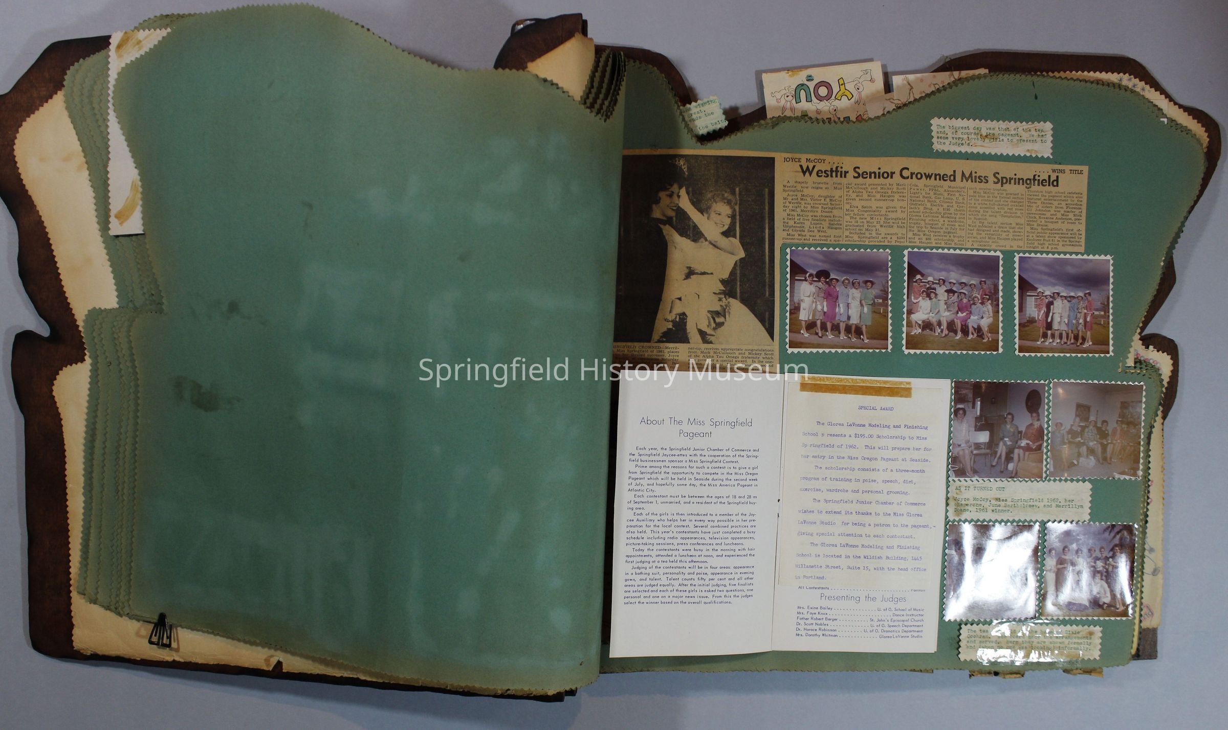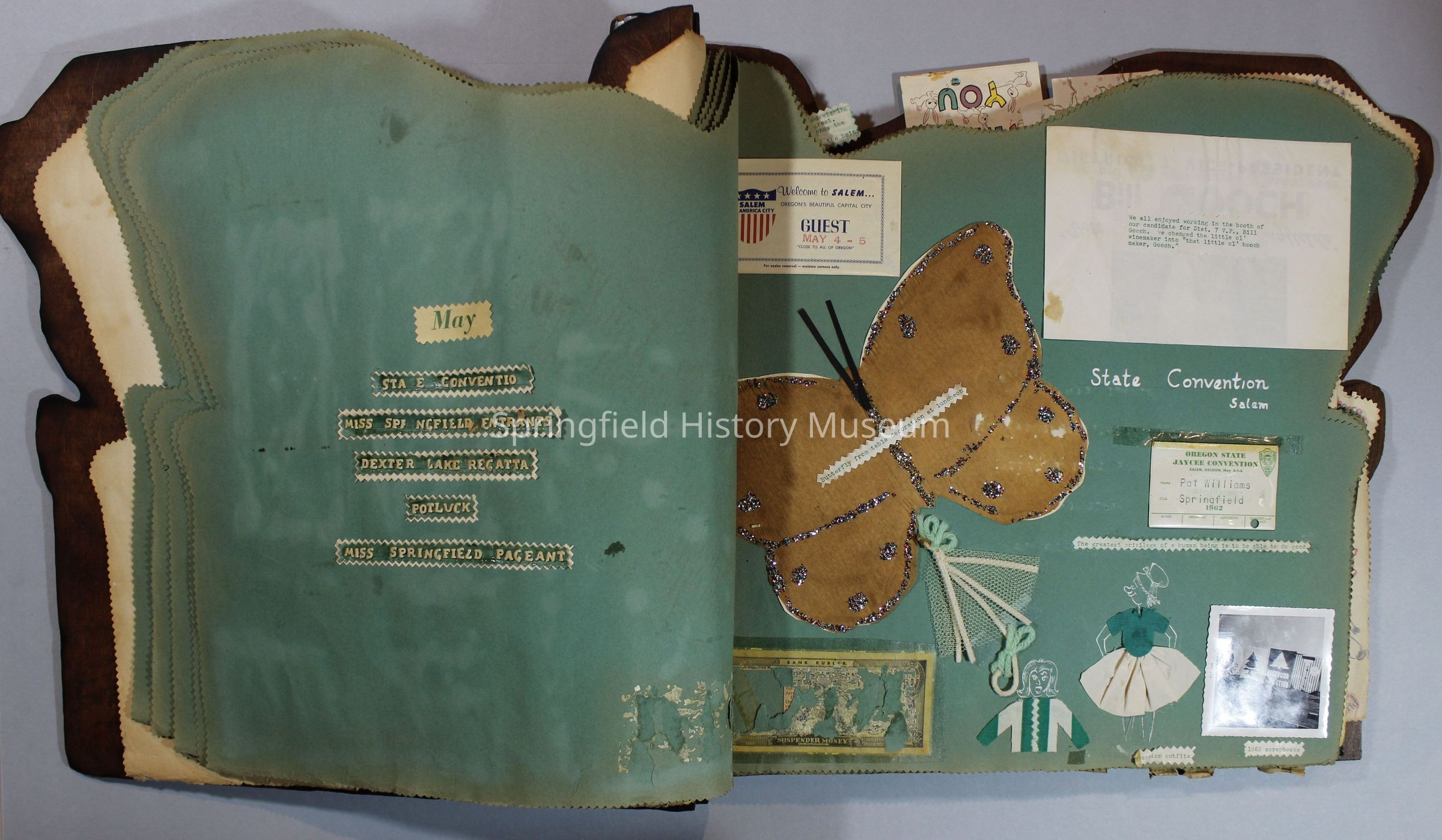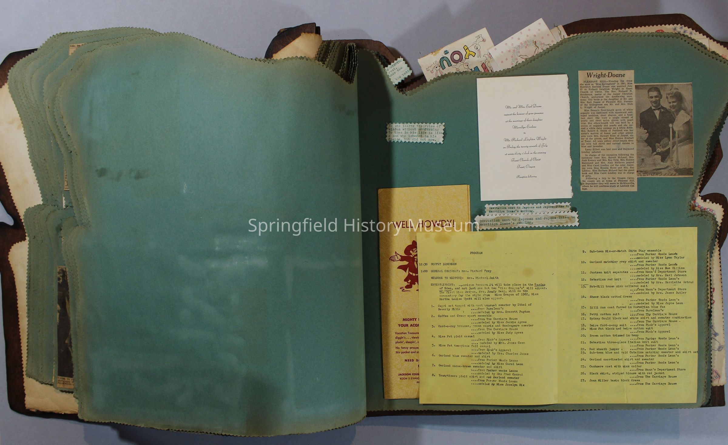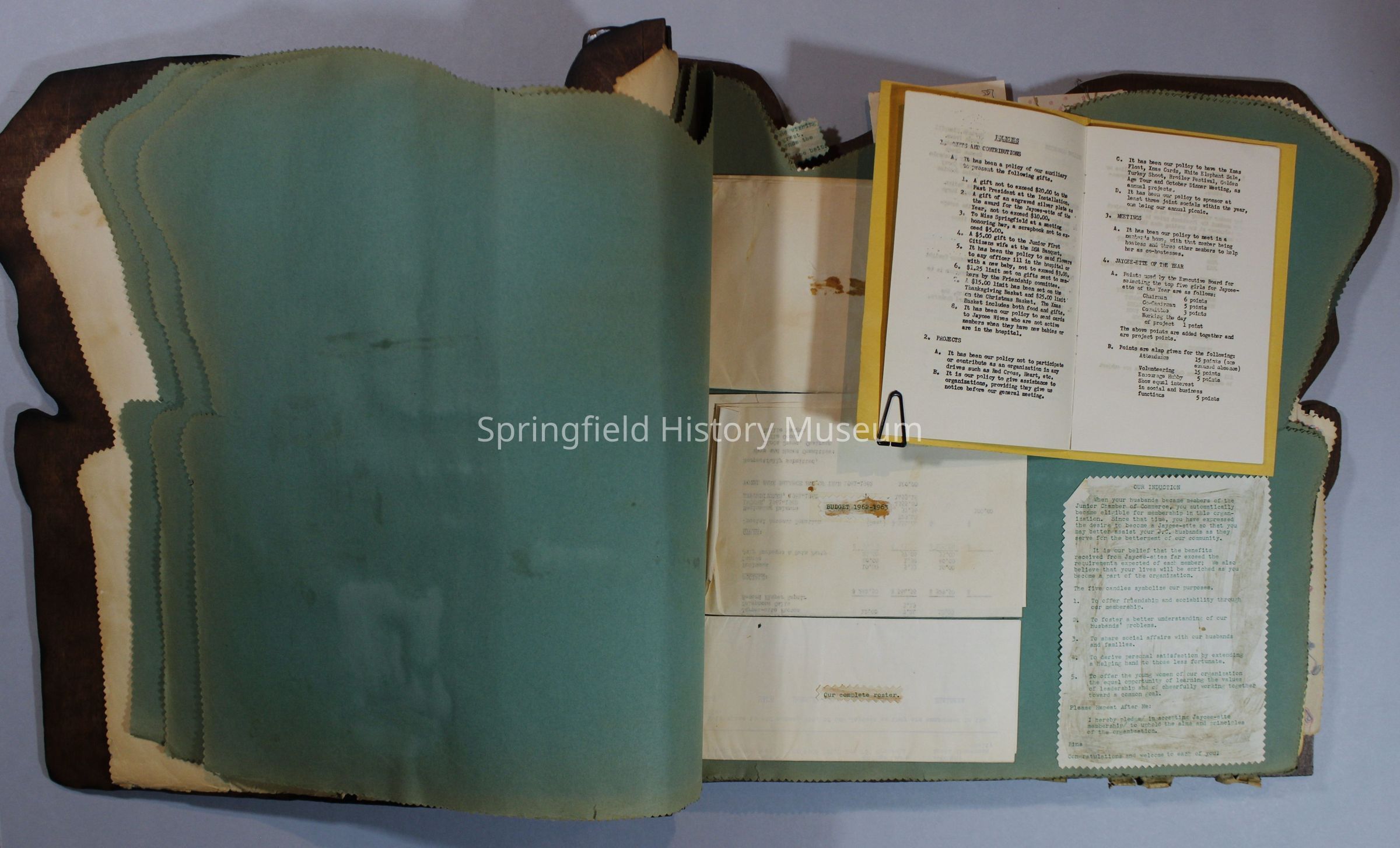 Scrapbook of Springfield, Oregon Jaycee-ettes, Joan Harman Possion, was President at the time of events.1962-1963, scrapbook cover is of wood with brass color hinges. The scrapbook contains newspaper articles, photo's, and cards.
