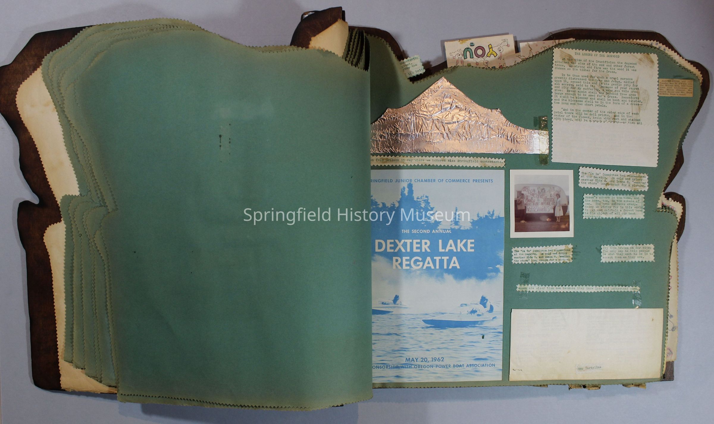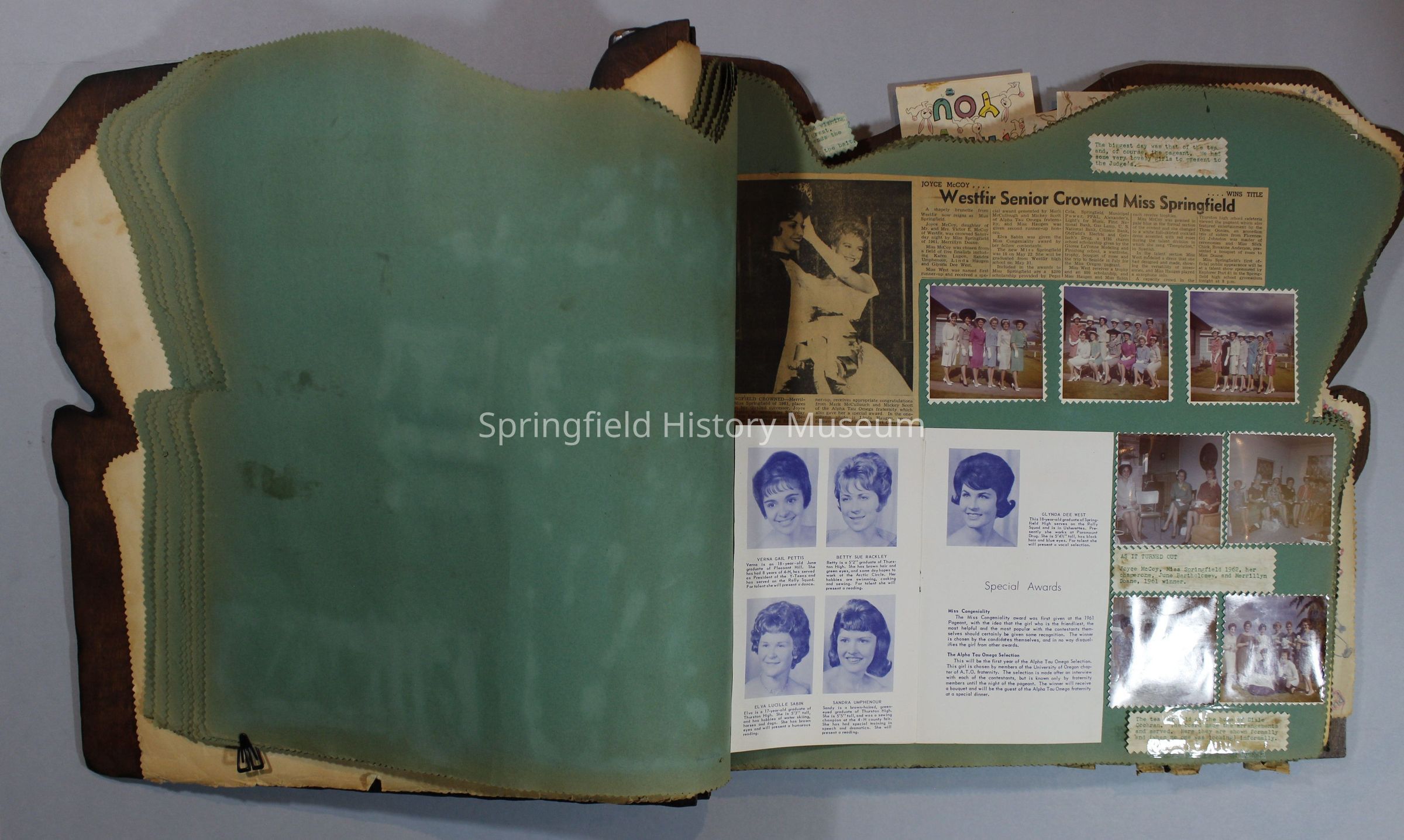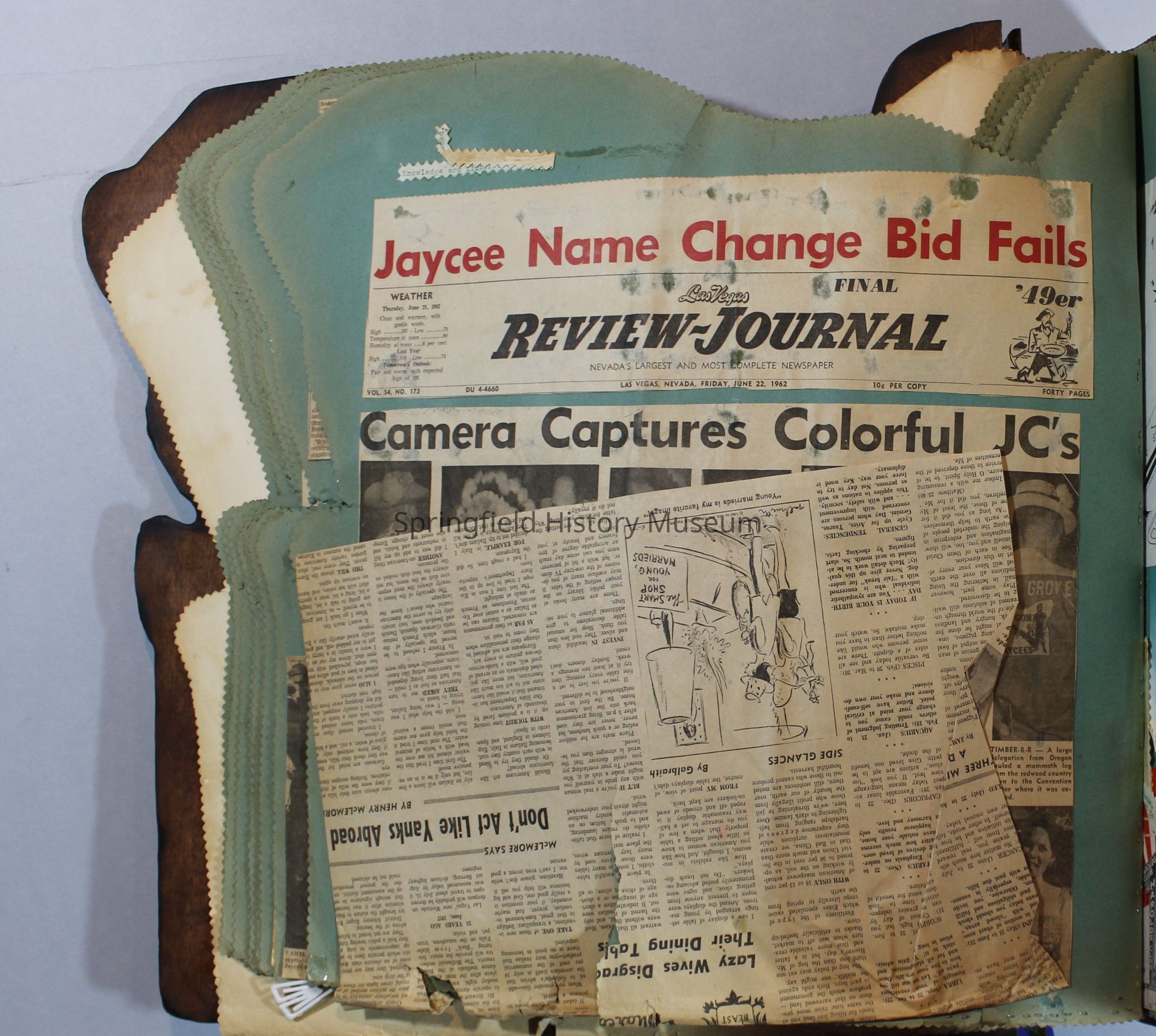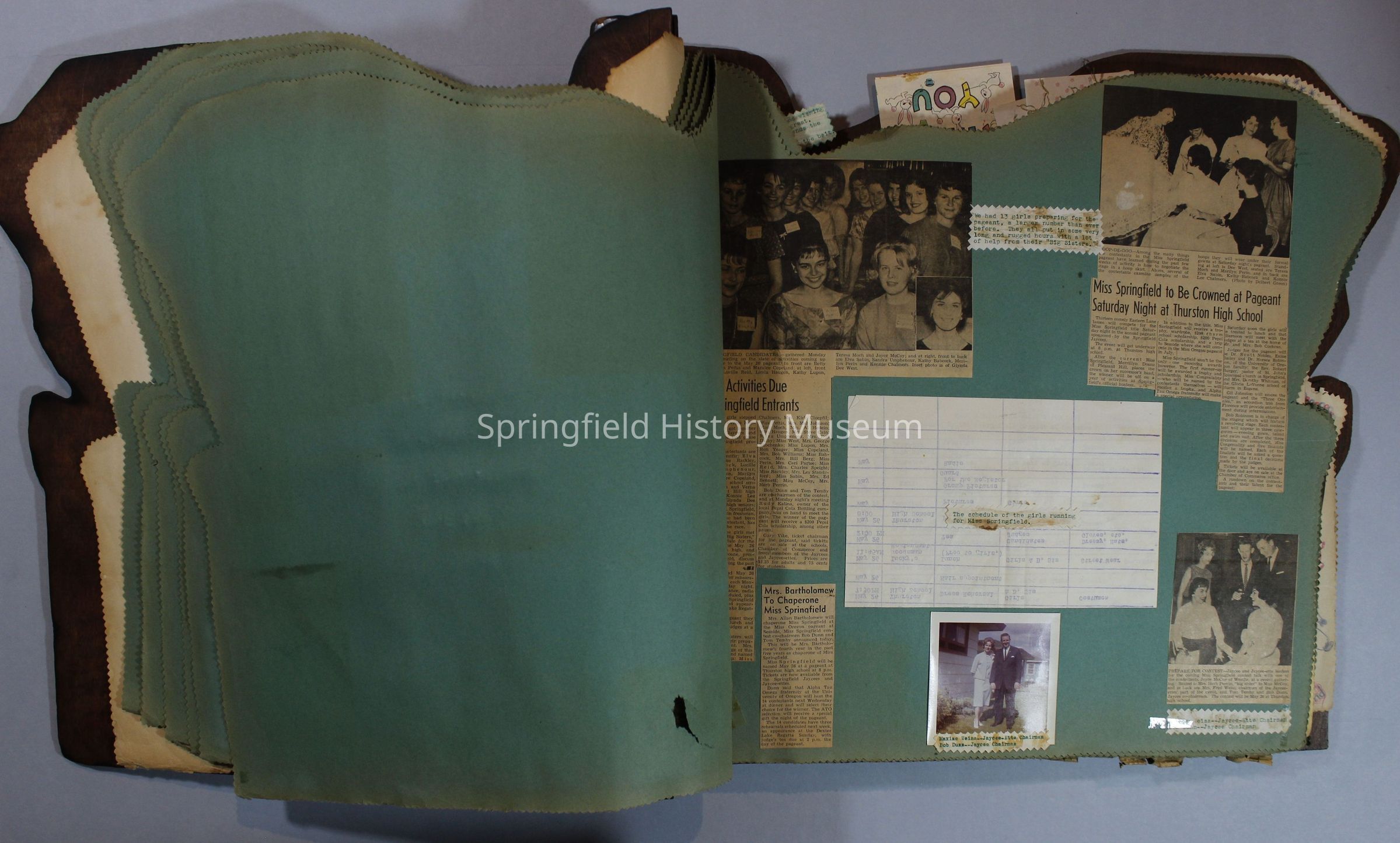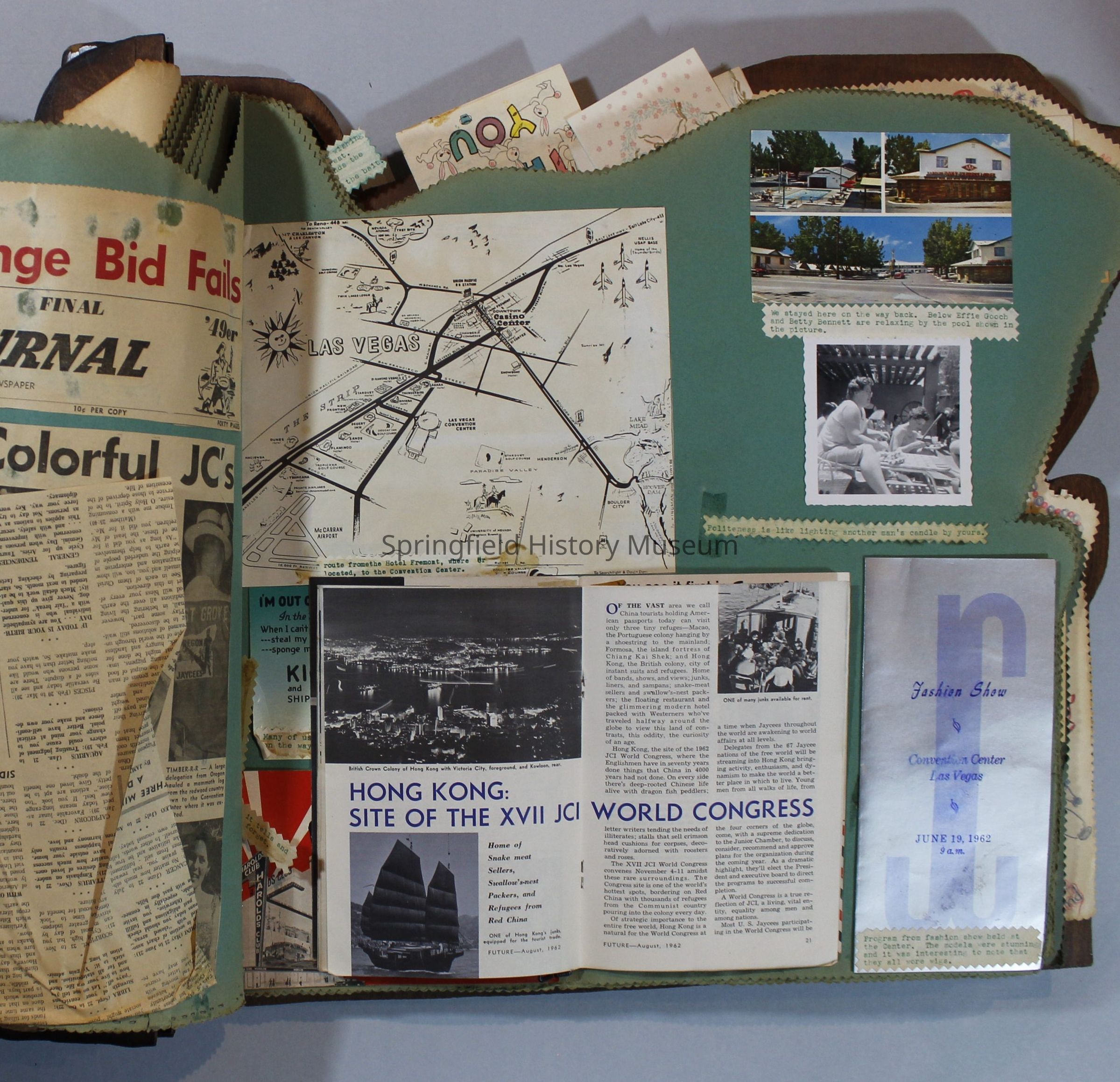Scrapbook of Springfield, Oregon Jaycee-ettes, Joan Harman Possion, was President at the time of events.1962-1963, scrapbook cover is of wood with brass color hinges. The scrapbook contains newspaper articles, photo's, and cards.