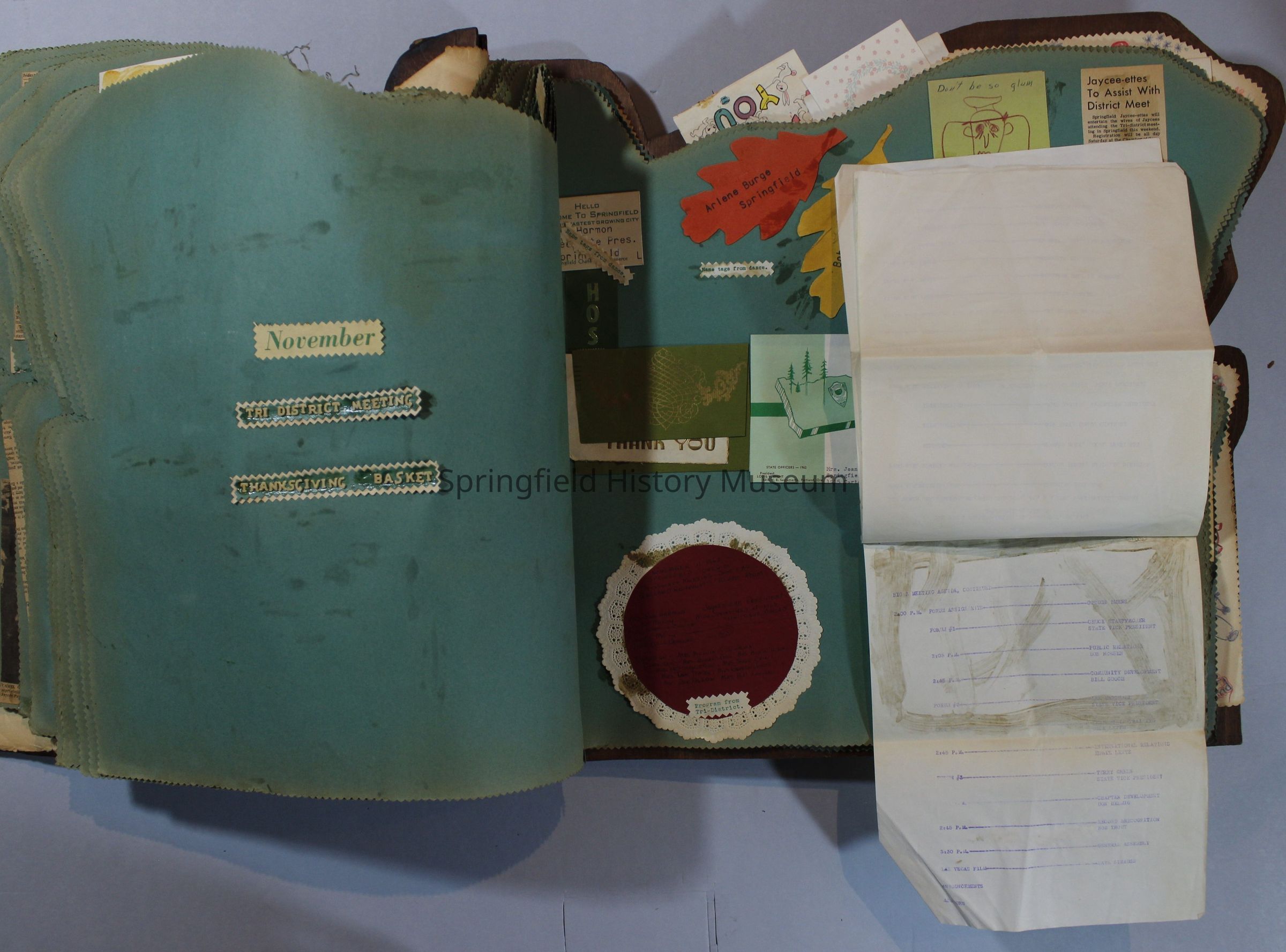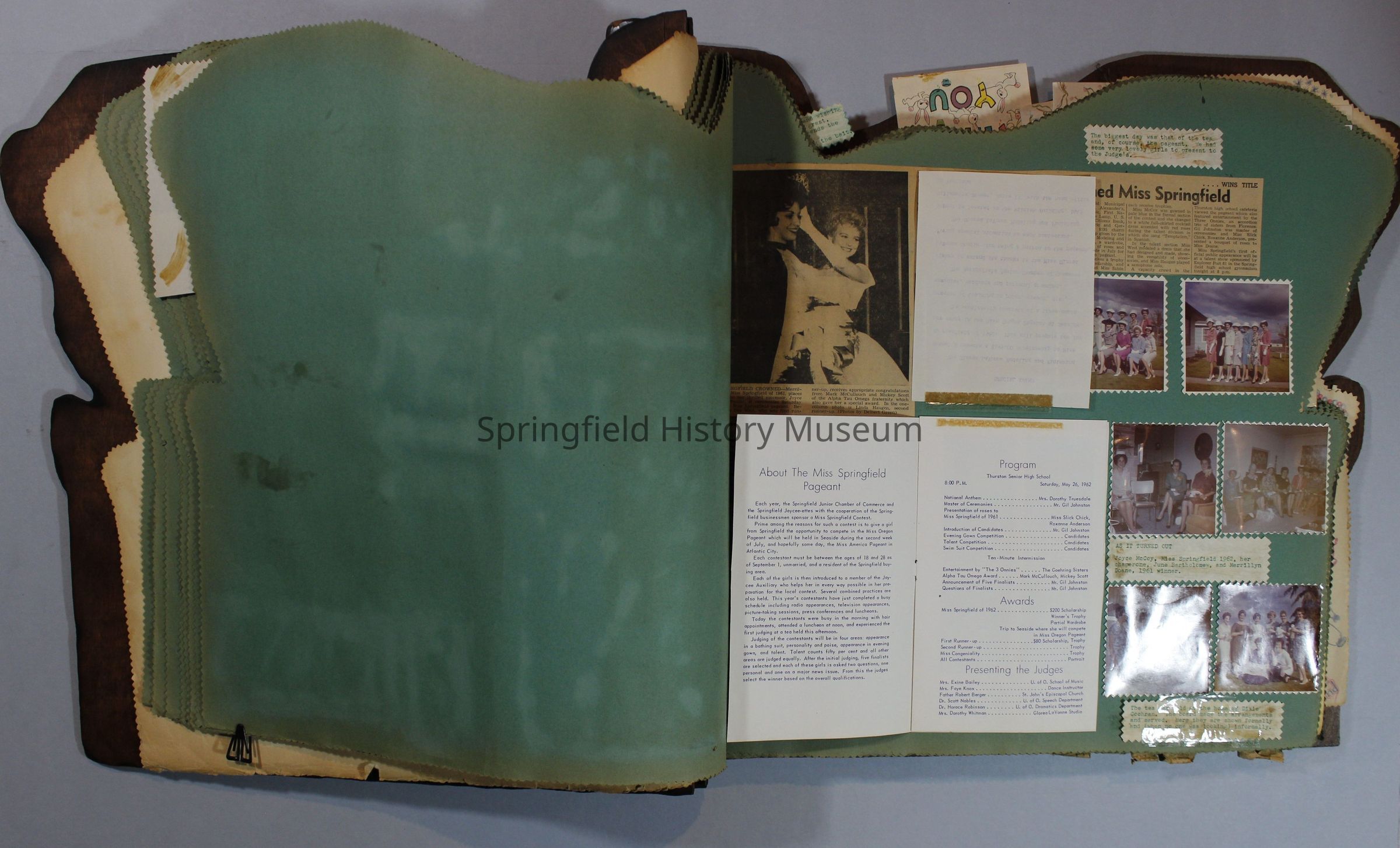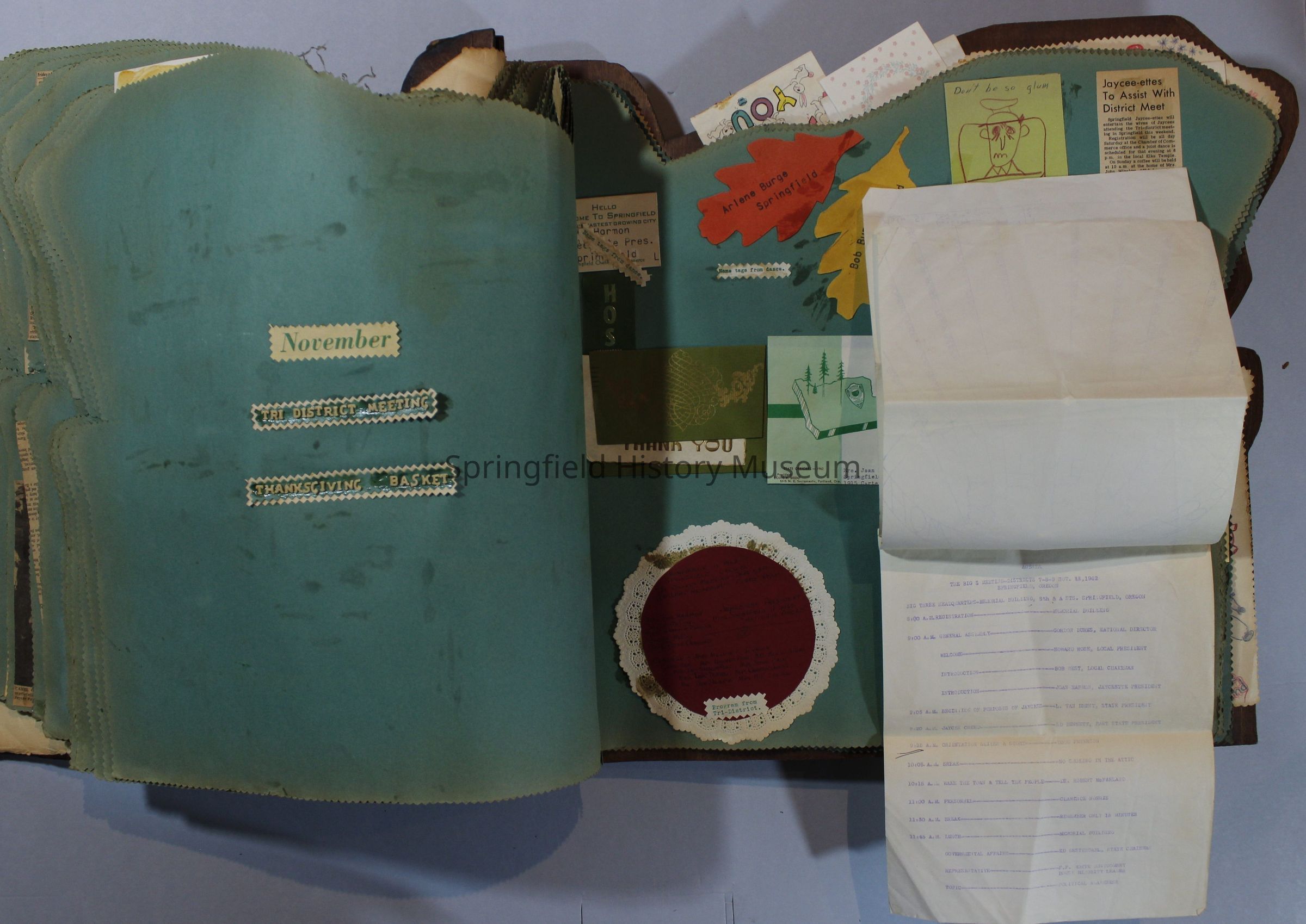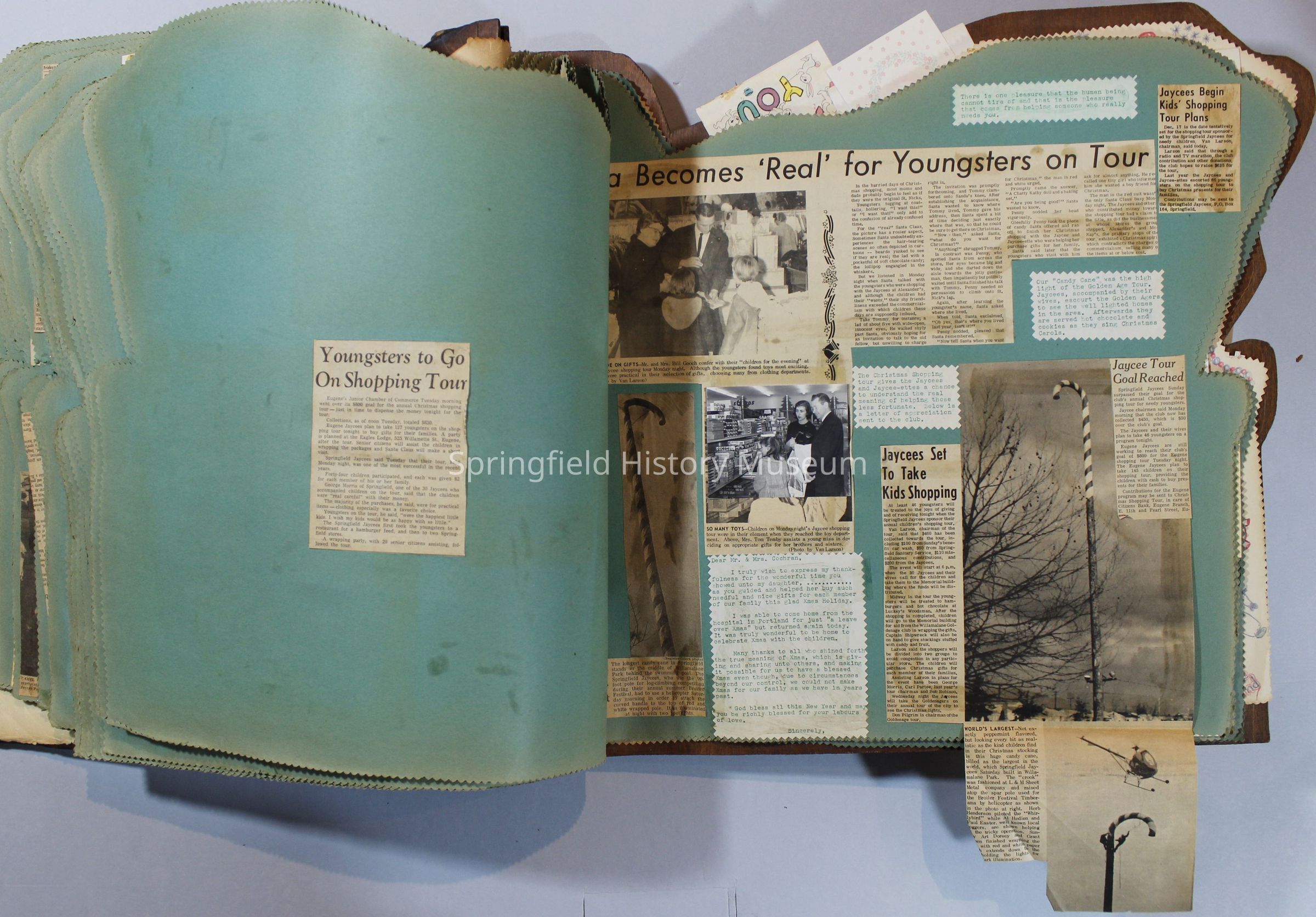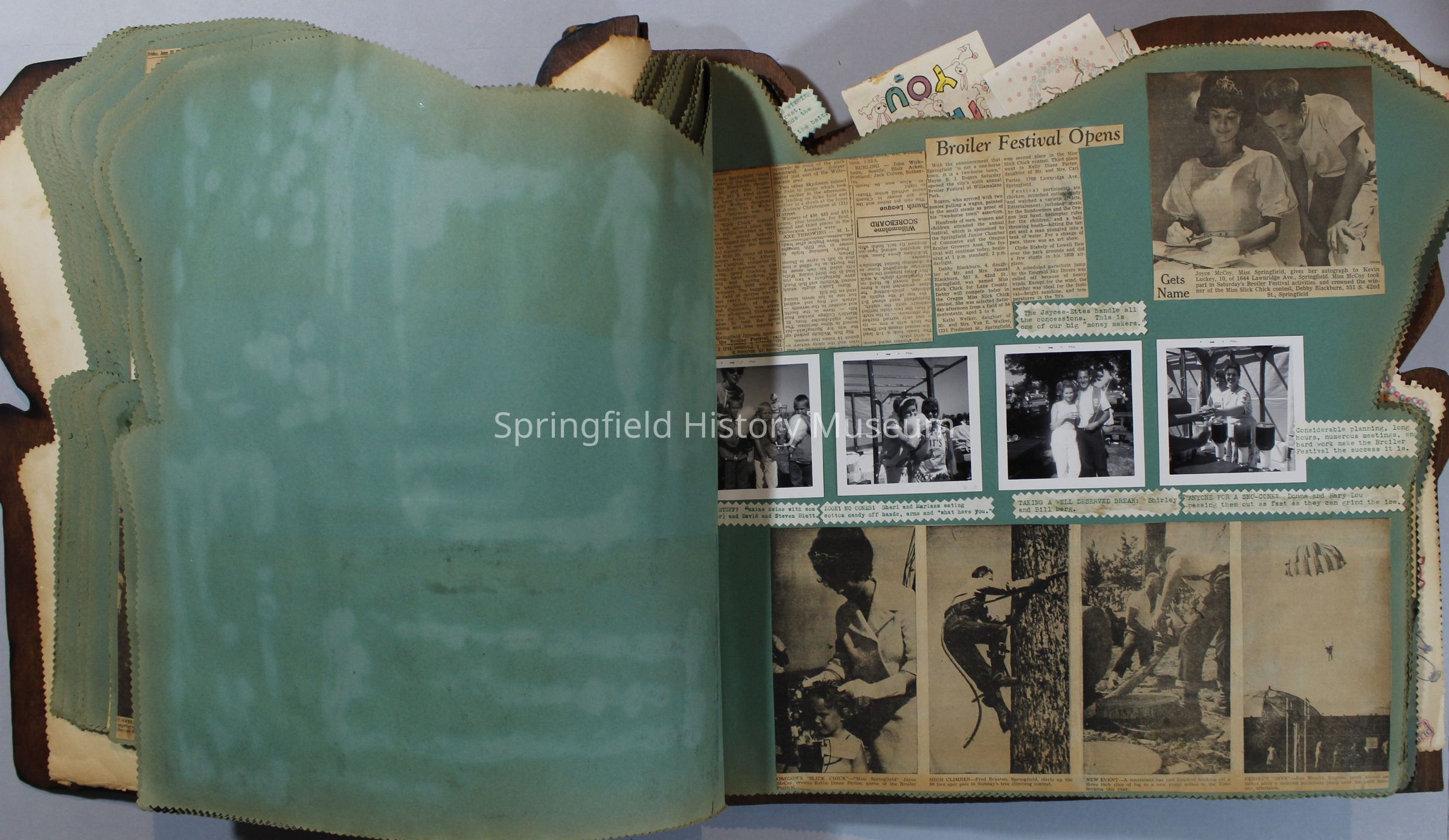 Scrapbook of Springfield, Oregon Jaycee-ettes, Joan Harman Possion, was President at the time of events.1962-1963, scrapbook cover is of wood with brass color hinges. The scrapbook contains newspaper articles, photo's, and cards.