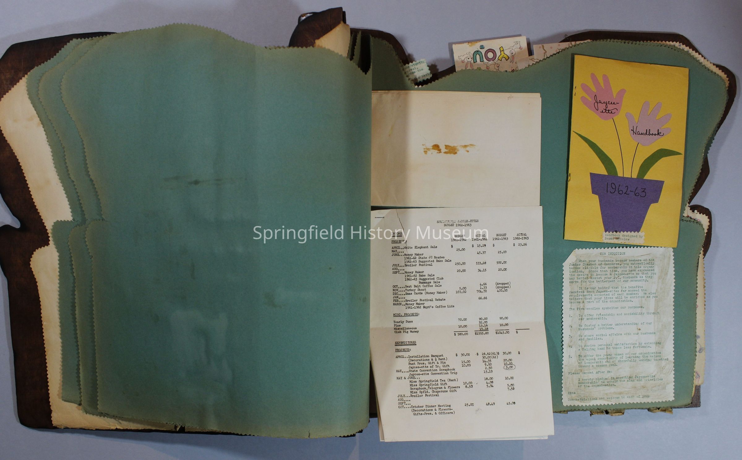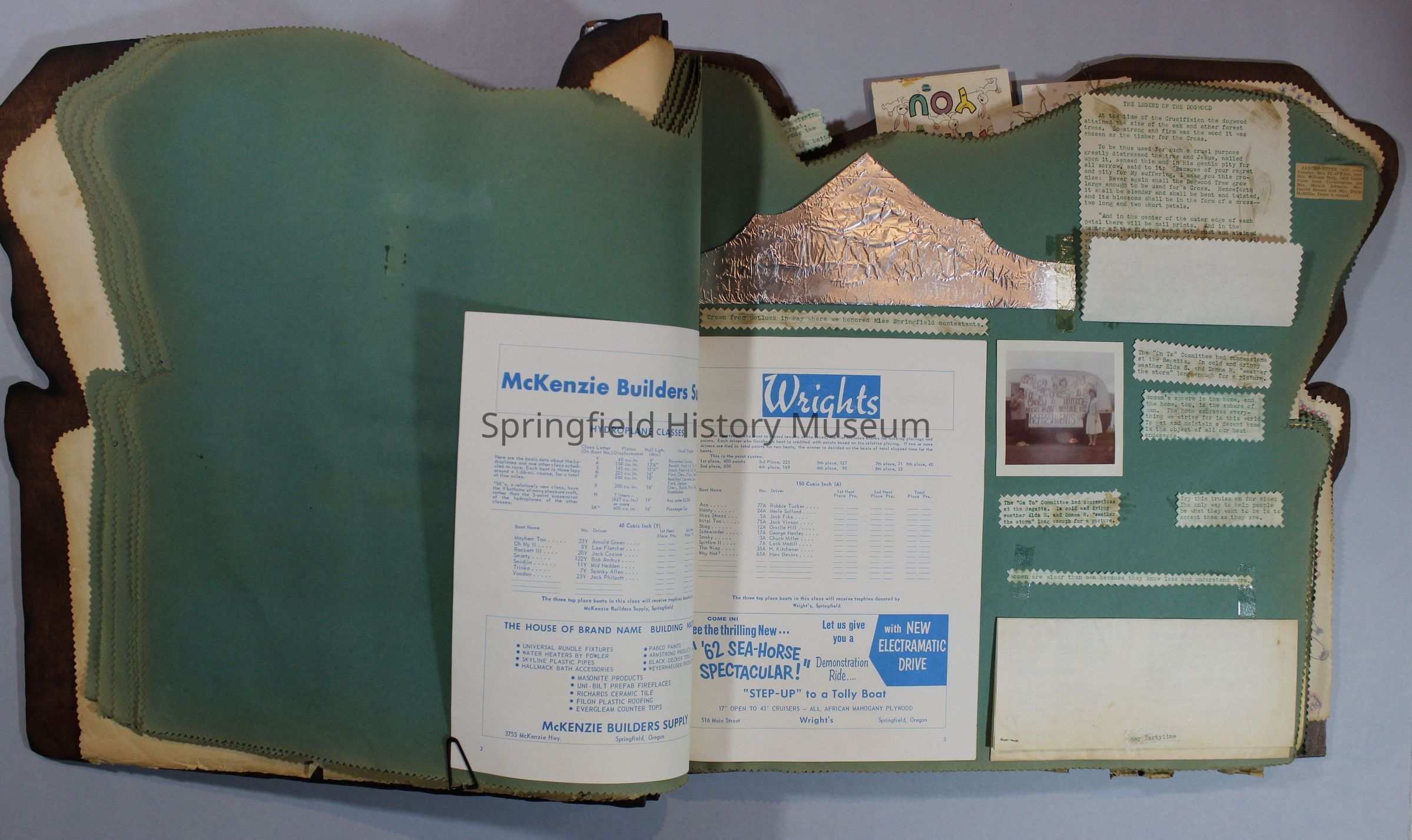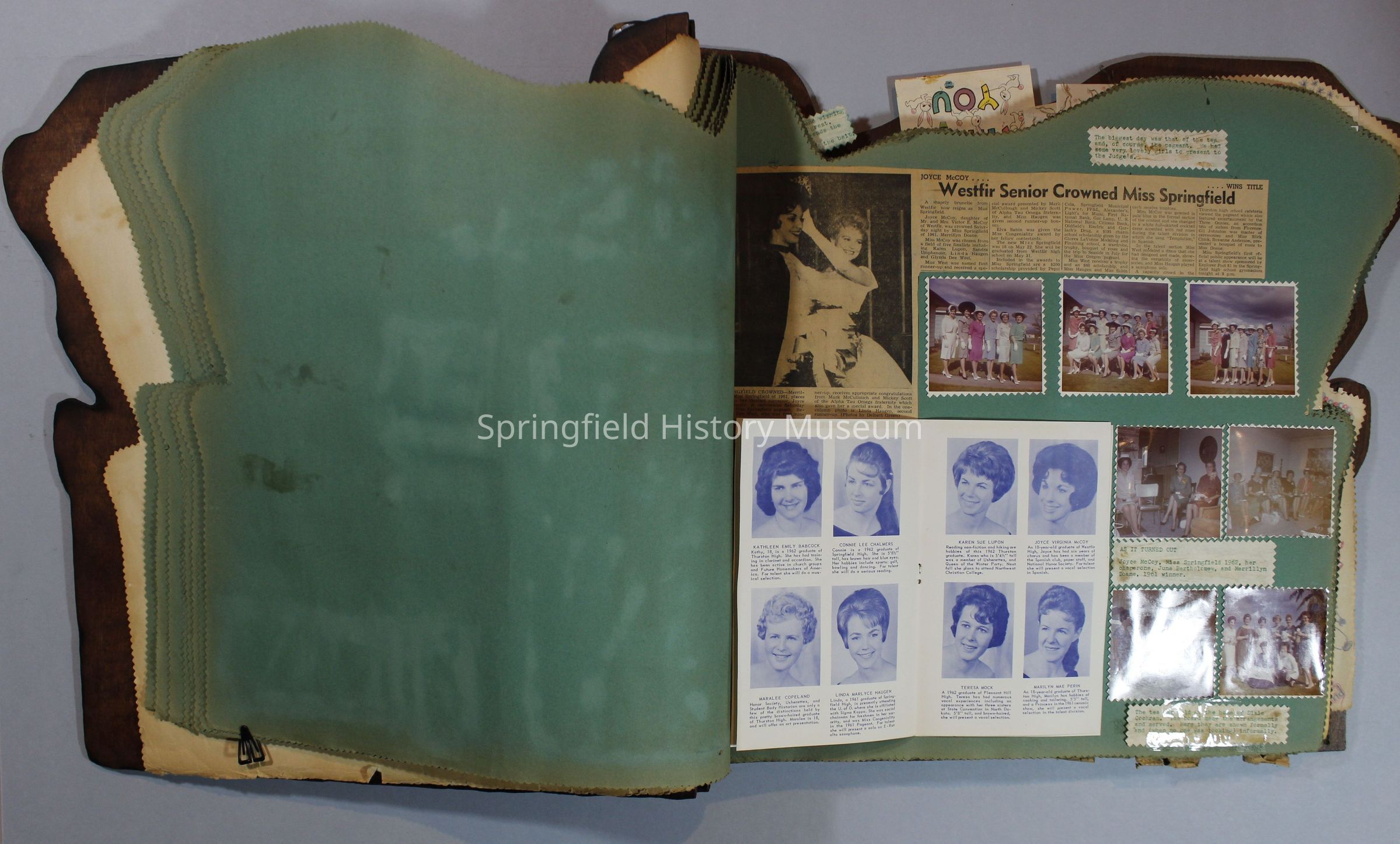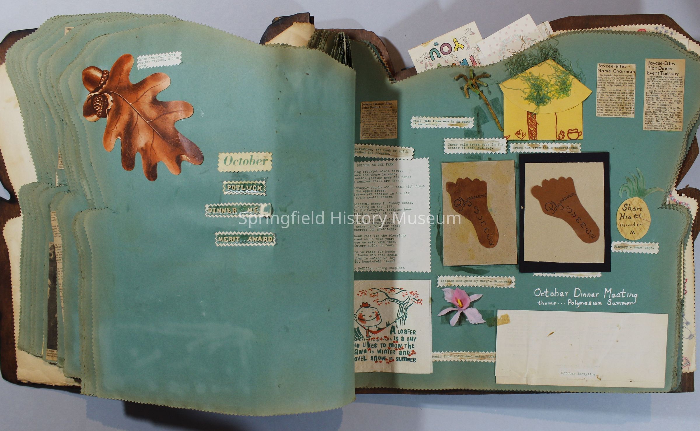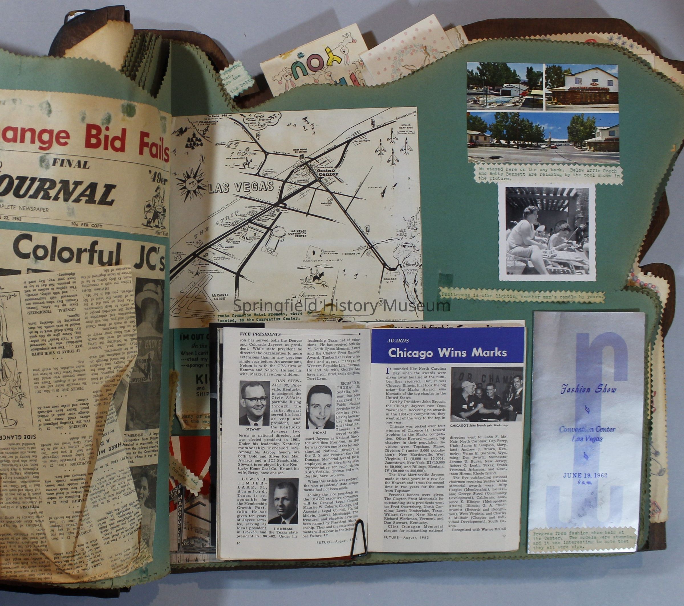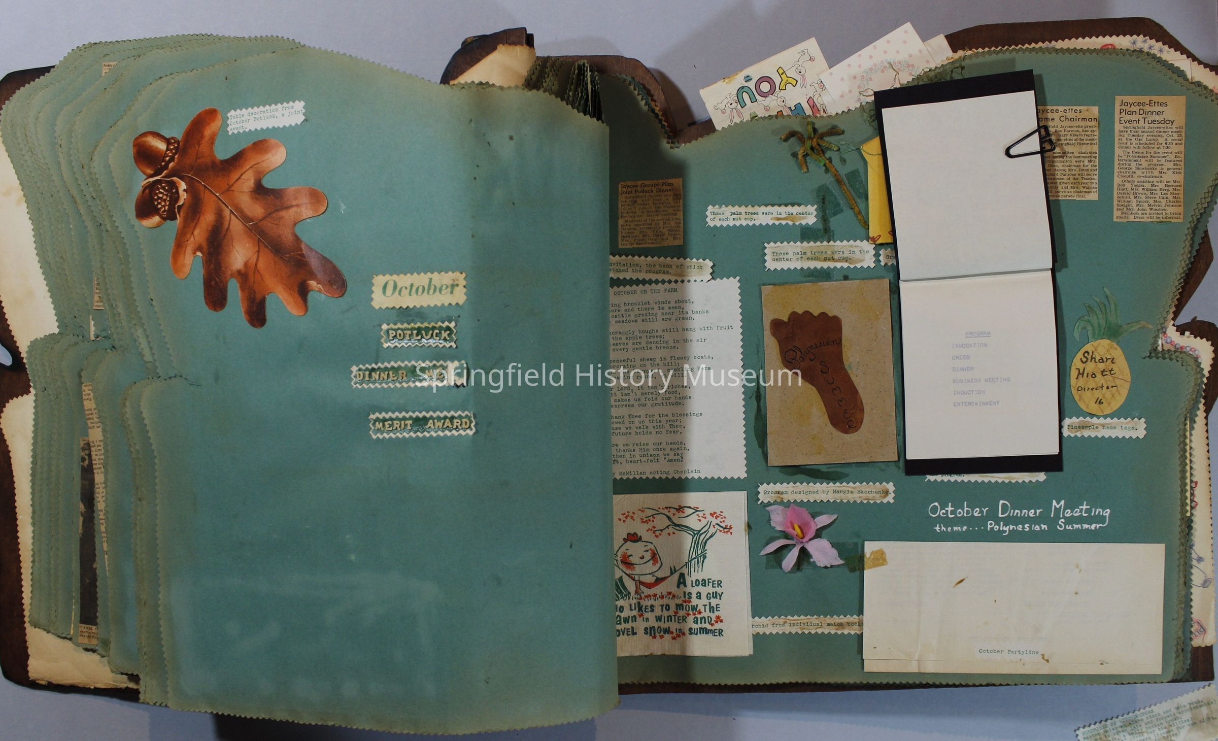 Scrapbook of Springfield, Oregon Jaycee-ettes, Joan Harman Possion, was President at the time of events.1962-1963, scrapbook cover is of wood with brass color hinges. The scrapbook contains newspaper articles, photo's, and cards.