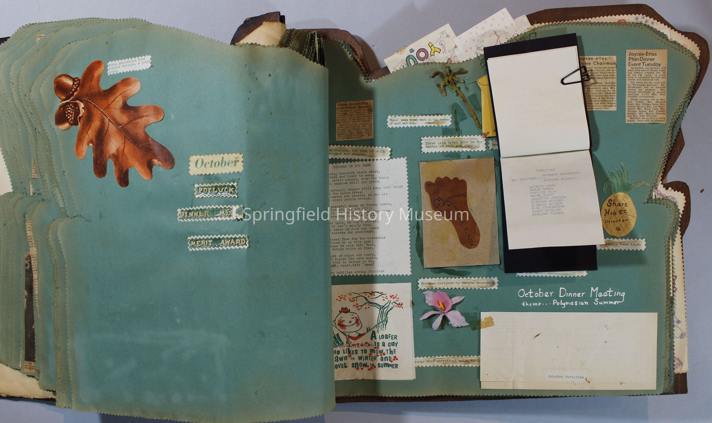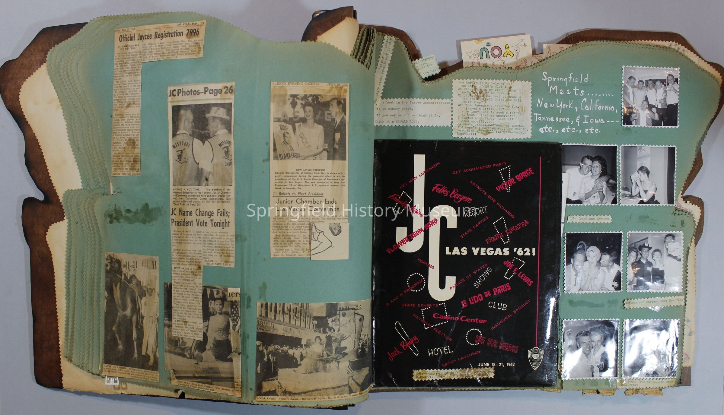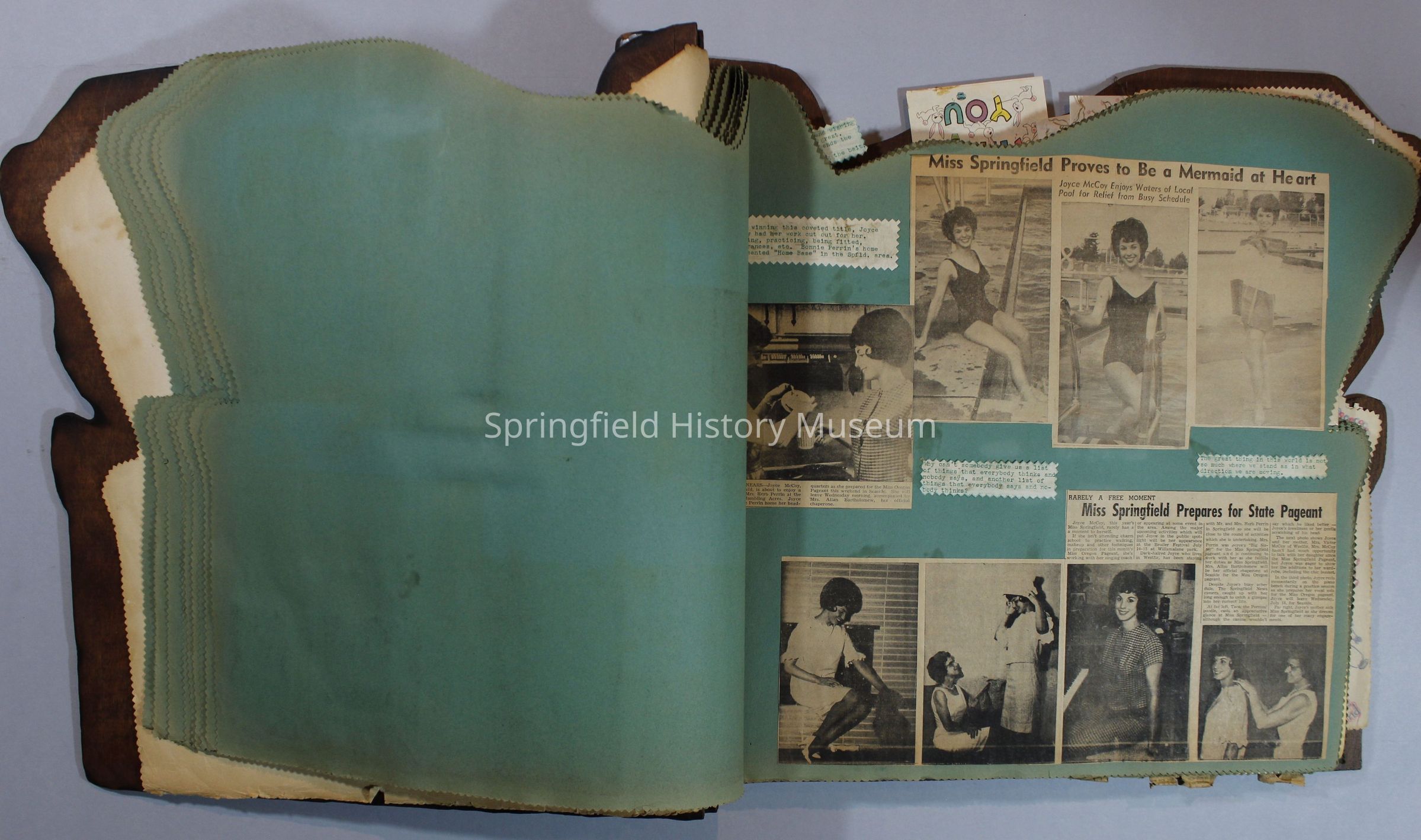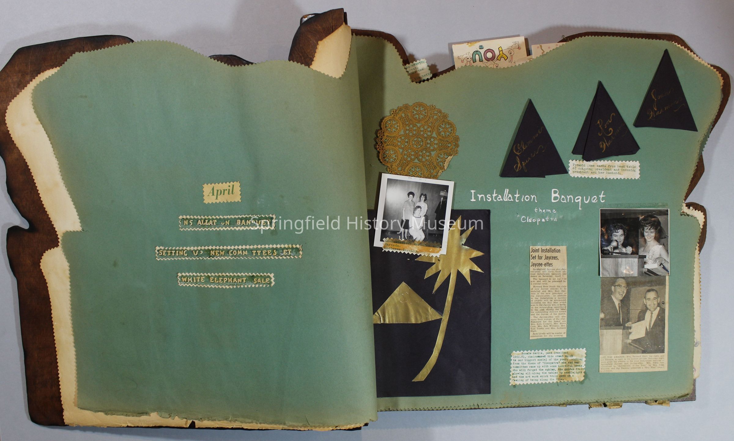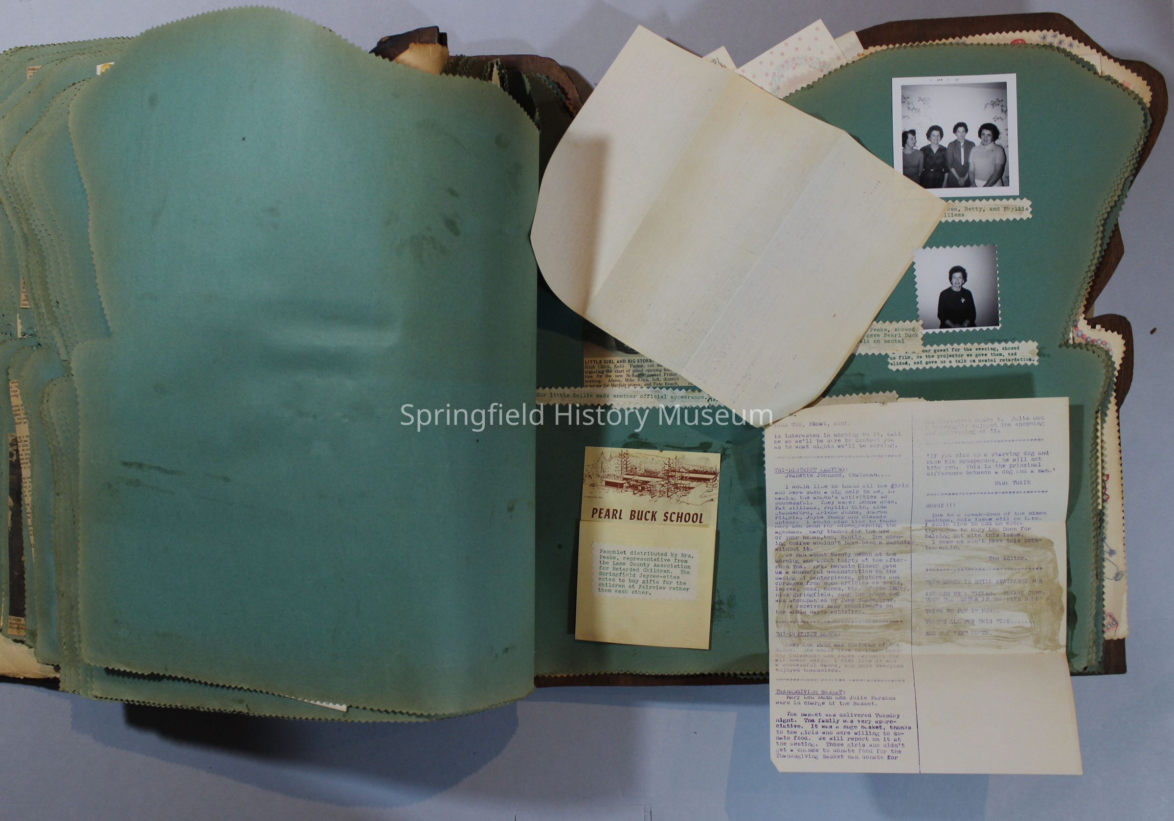 Scrapbook of Springfield, Oregon Jaycee-ettes, Joan Harman Possion, was President at the time of events.1962-1963, scrapbook cover is of wood with brass color hinges. The scrapbook contains newspaper articles, photo's, and cards.
