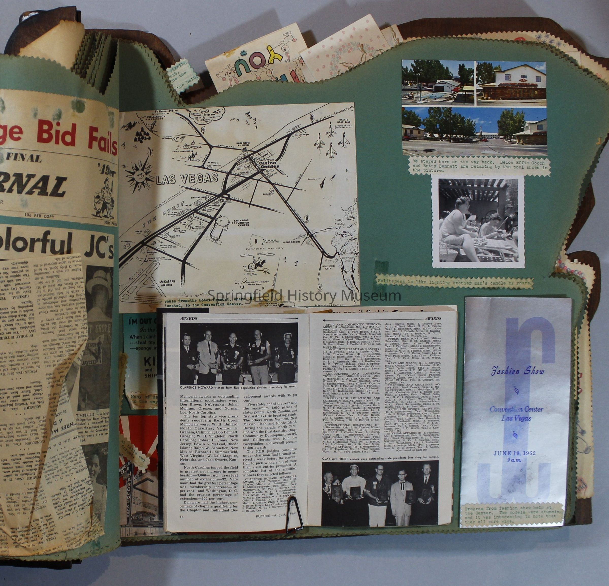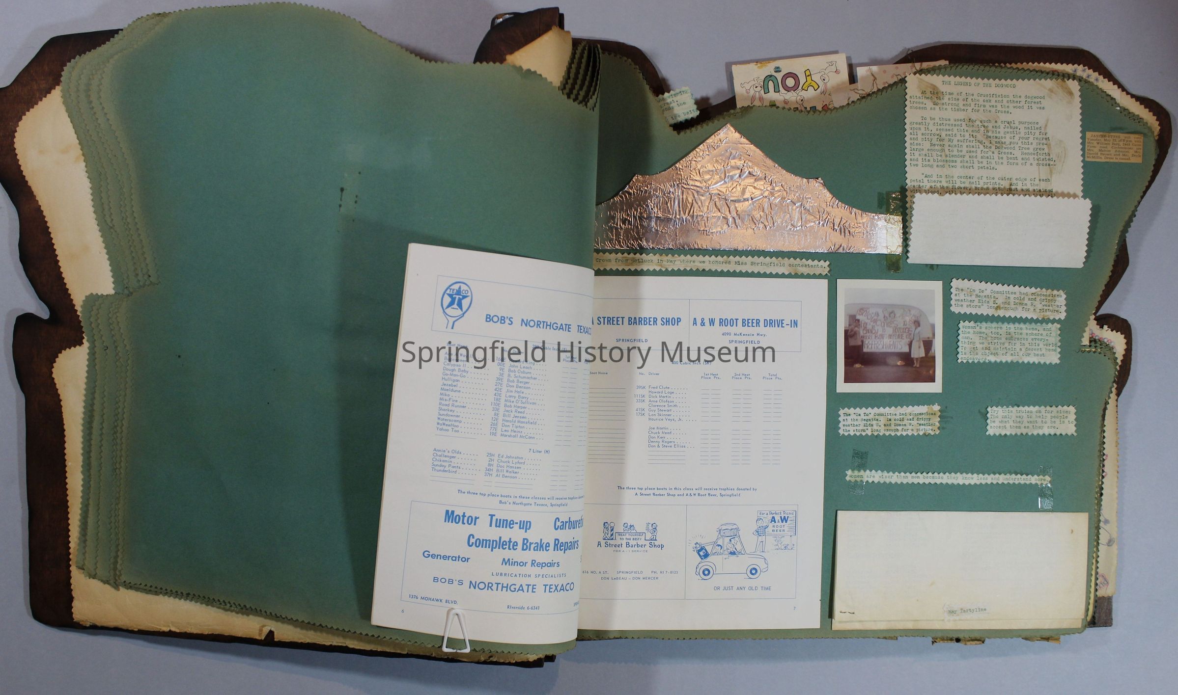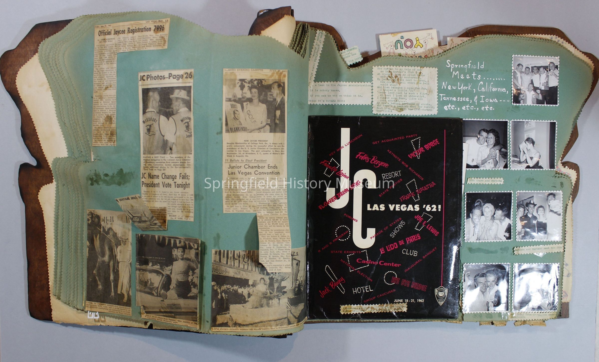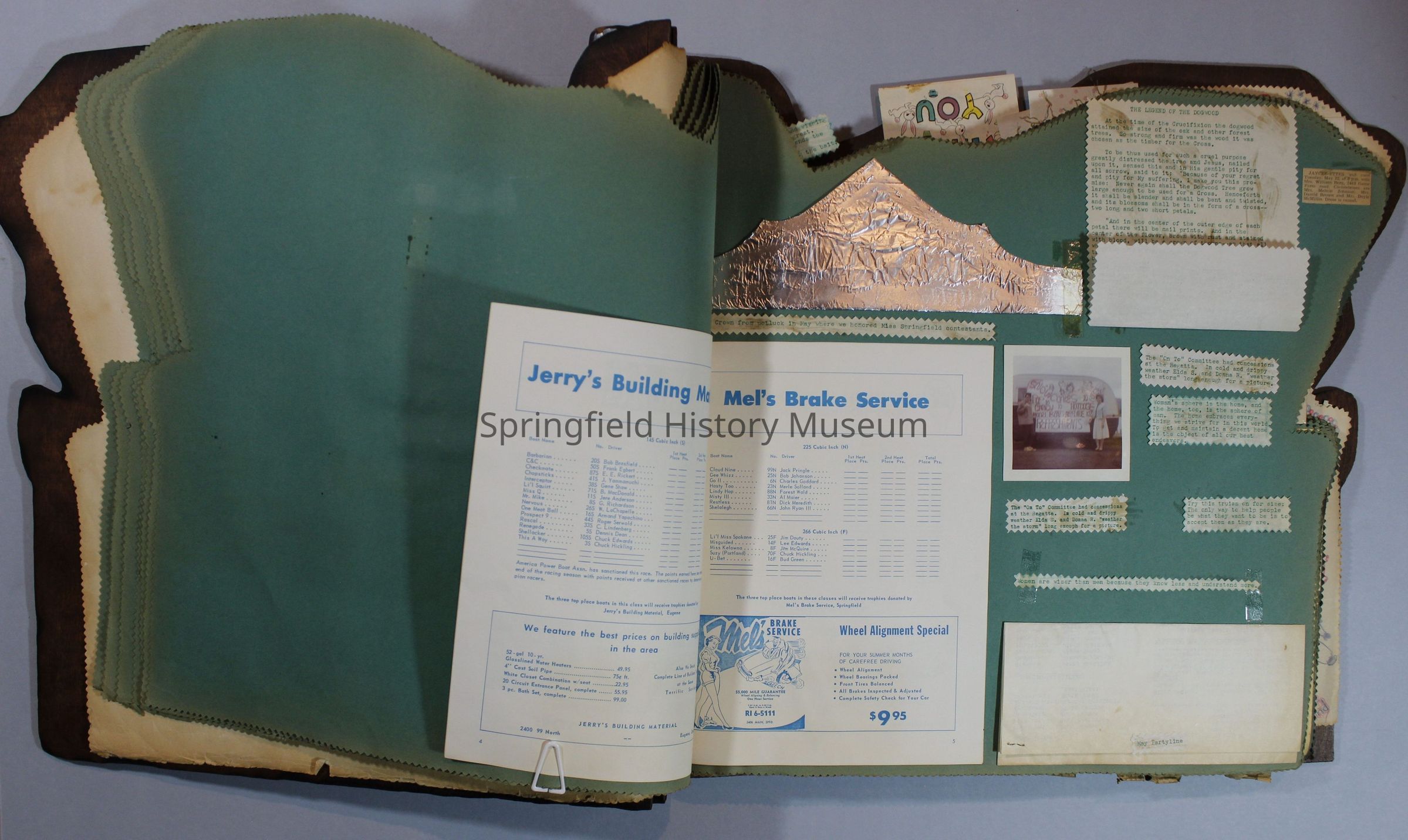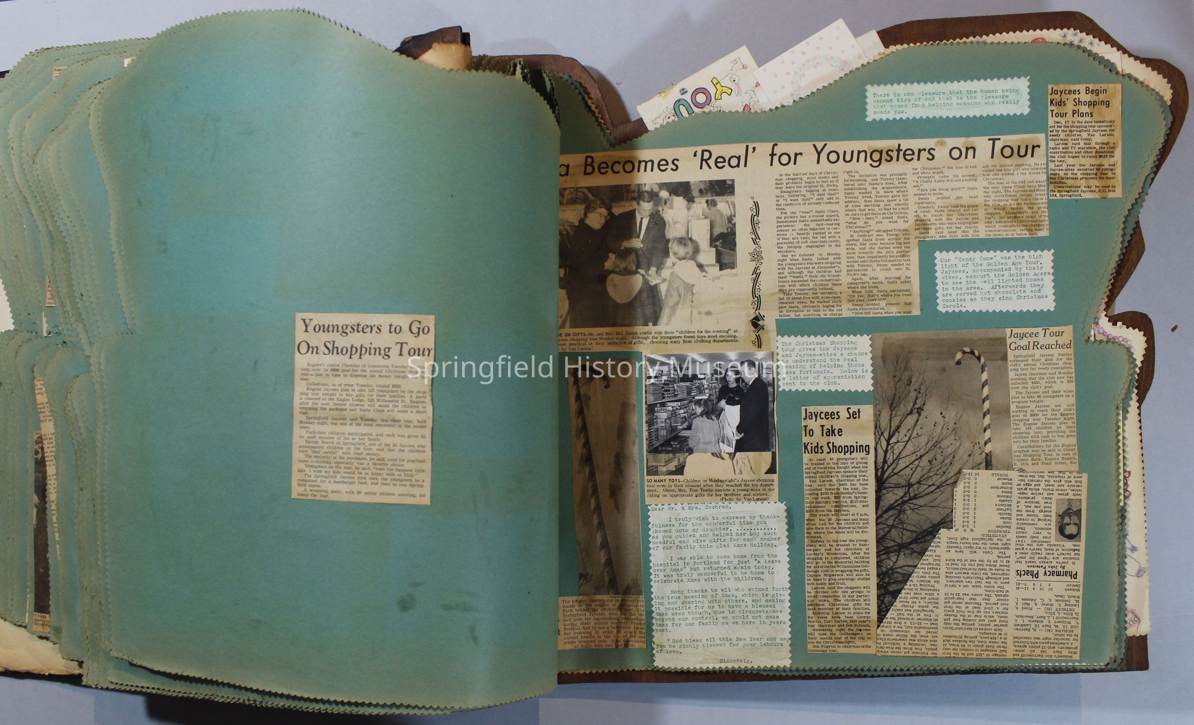 Scrapbook of Springfield, Oregon Jaycee-ettes, Joan Harman Possion, was President at the time of events.1962-1963, scrapbook cover is of wood with brass color hinges. The scrapbook contains newspaper articles, photo's, and cards.