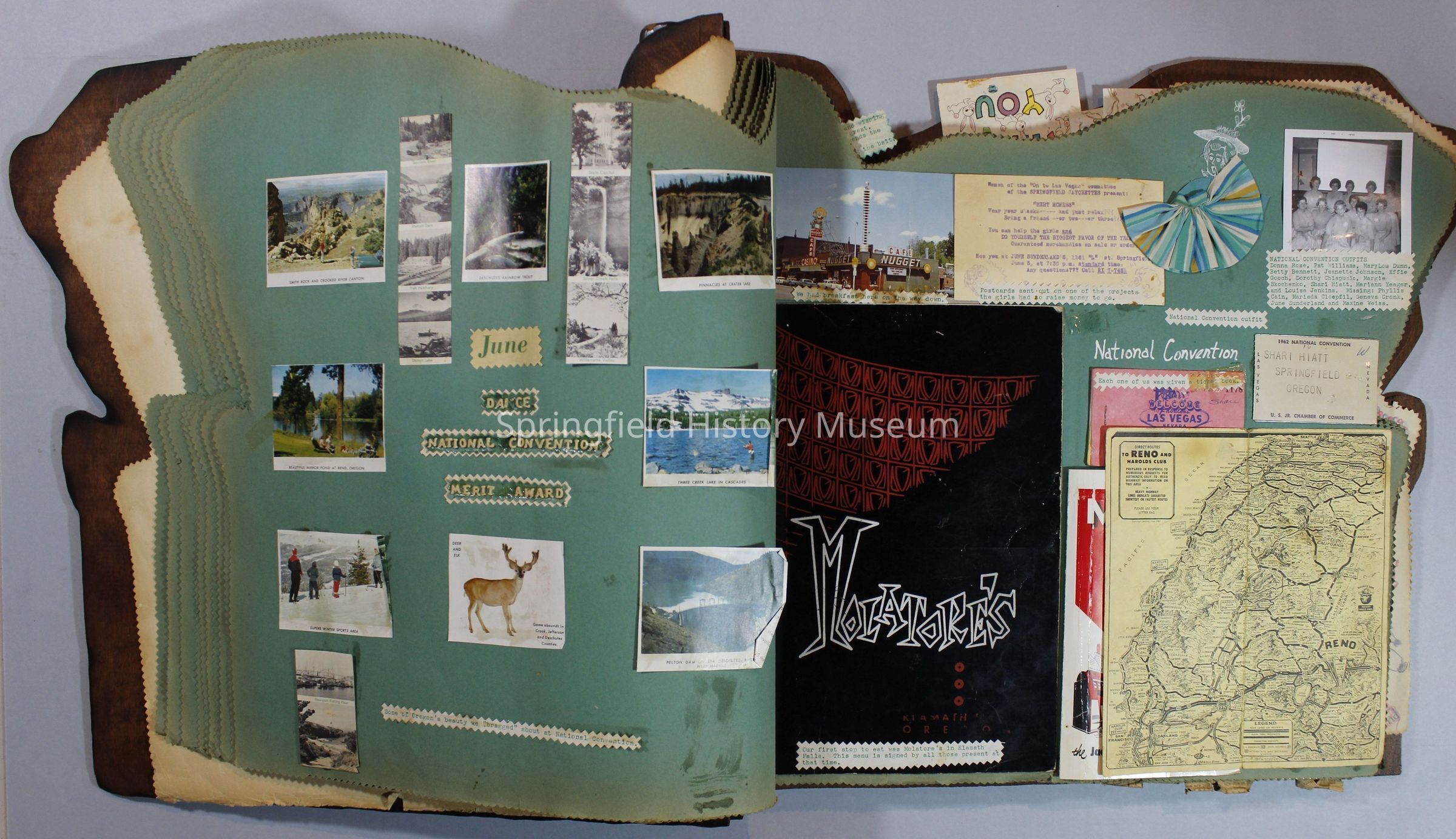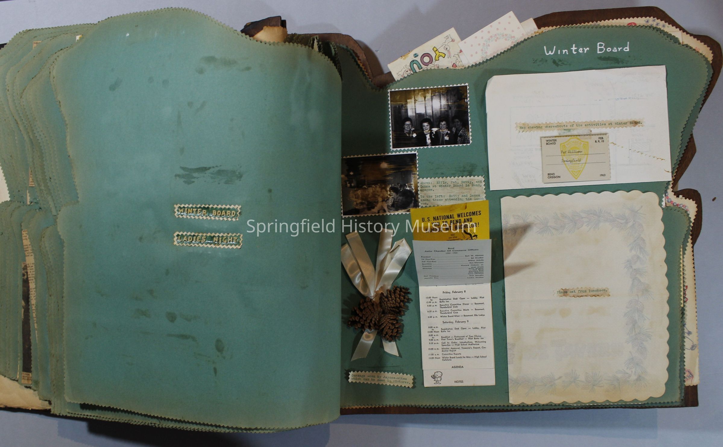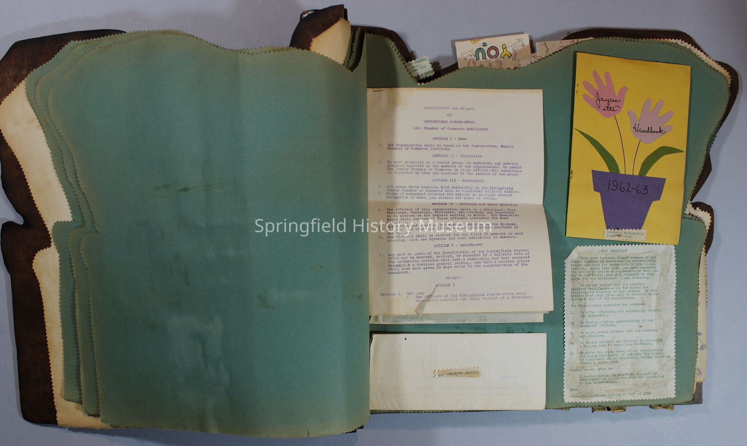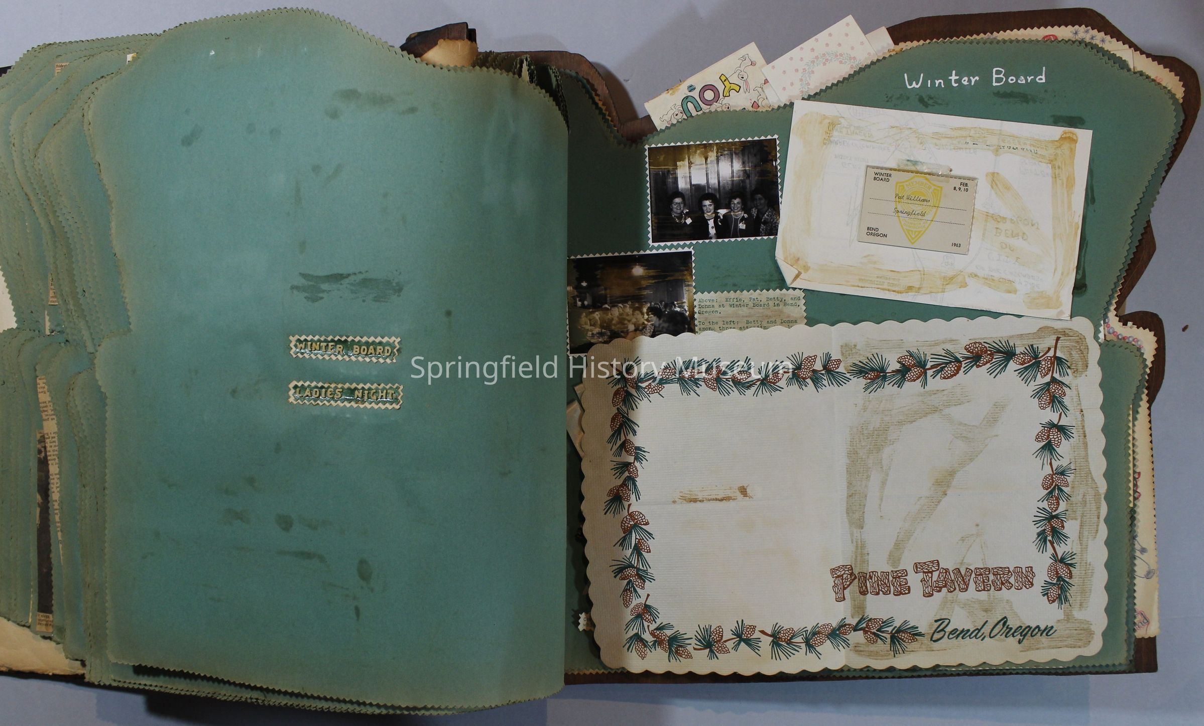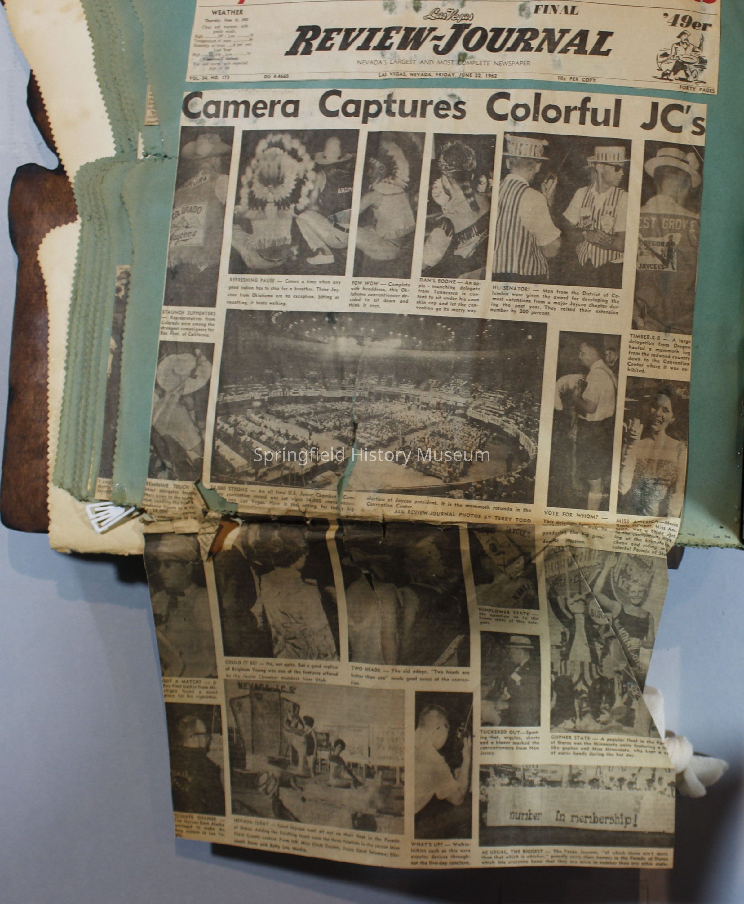 Scrapbook of Springfield, Oregon Jaycee-ettes, Joan Harman Possion, was President at the time of events.1962-1963, scrapbook cover is of wood with brass color hinges. The scrapbook contains newspaper articles, photo's, and cards.