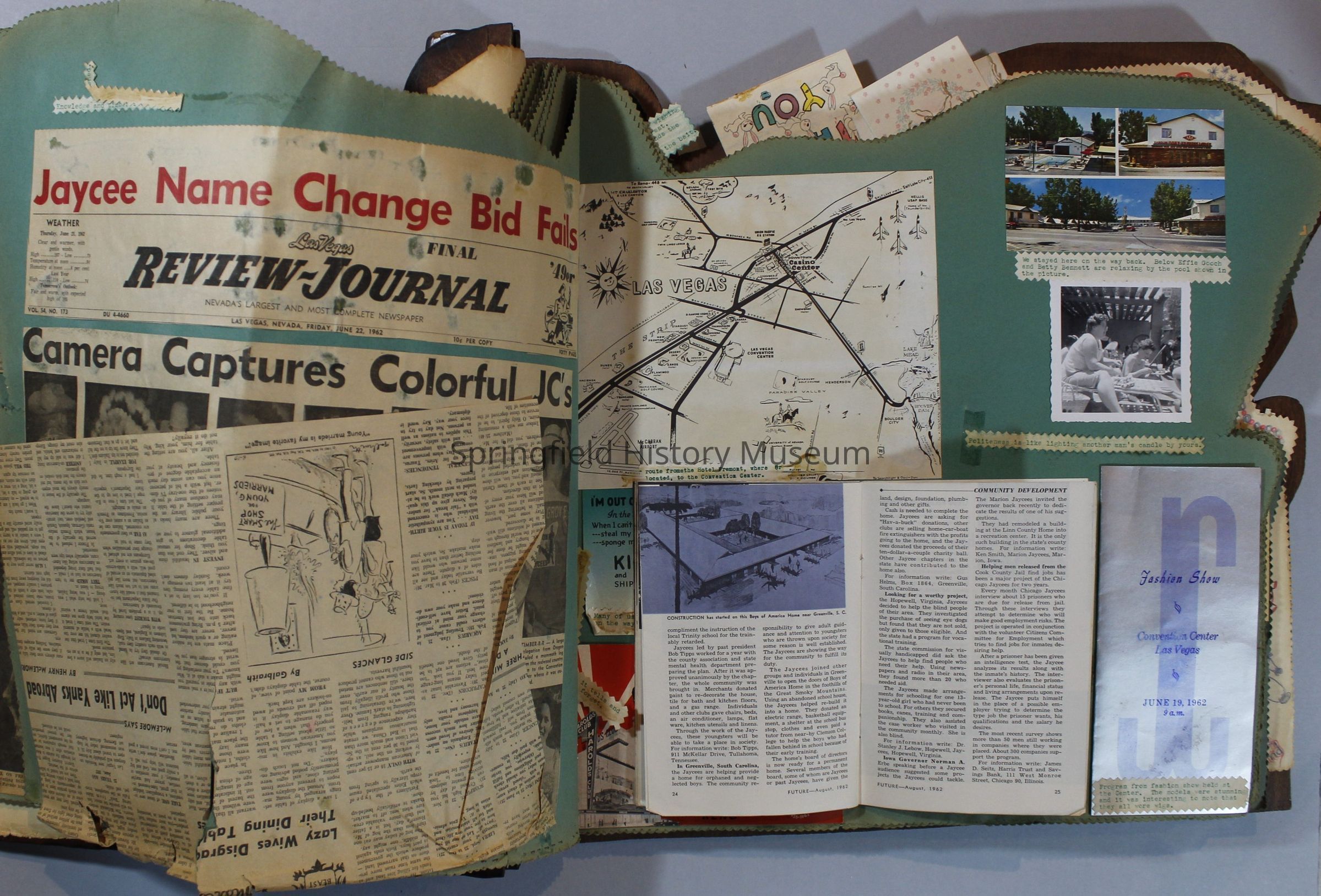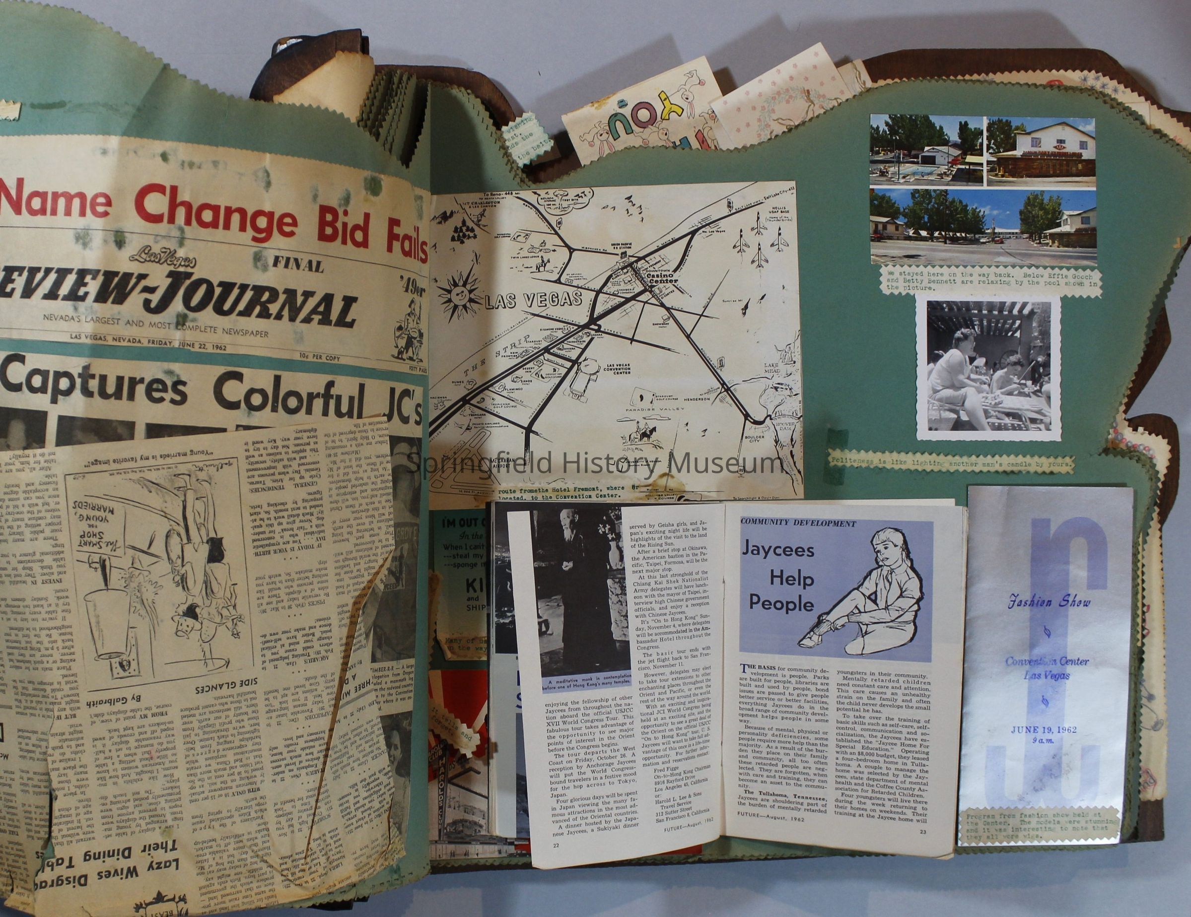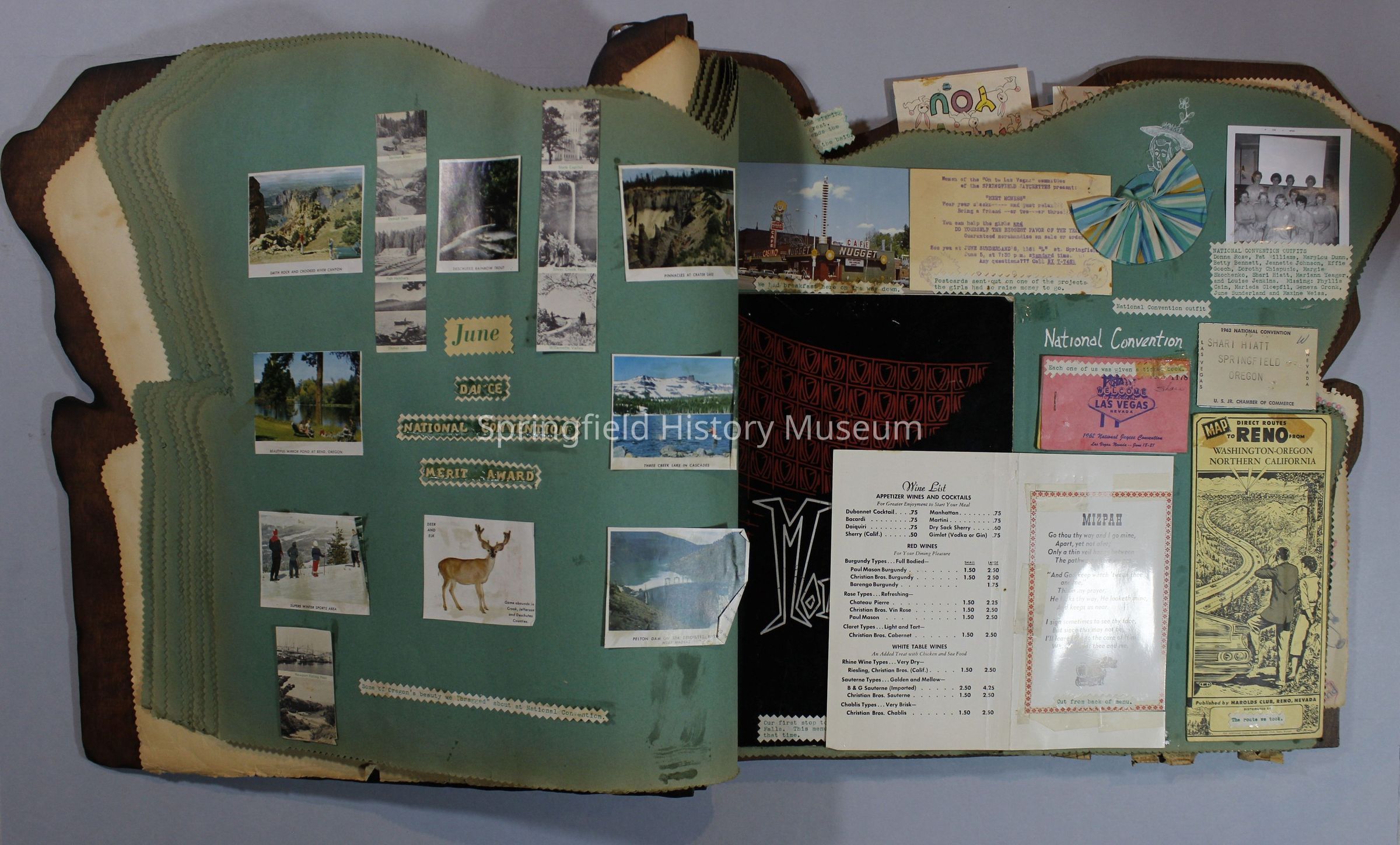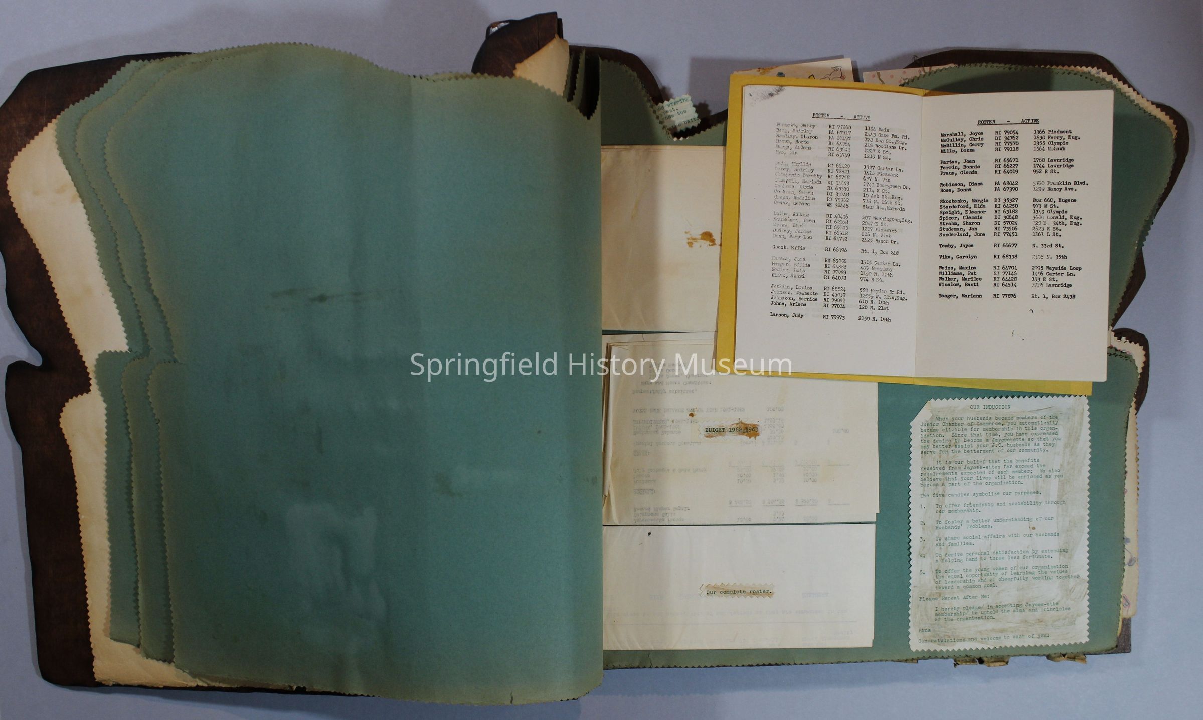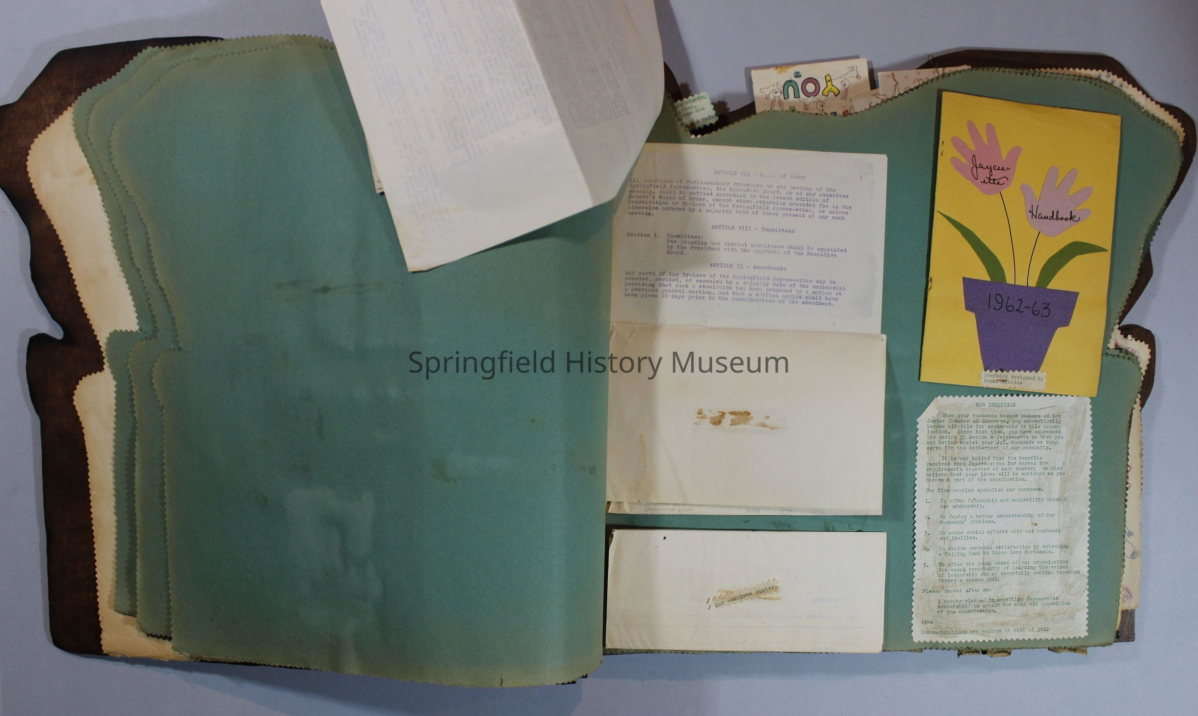 Scrapbook of Springfield, Oregon Jaycee-ettes, Joan Harman Possion, was President at the time of events.1962-1963, scrapbook cover is of wood with brass color hinges. The scrapbook contains newspaper articles, photo's, and cards.