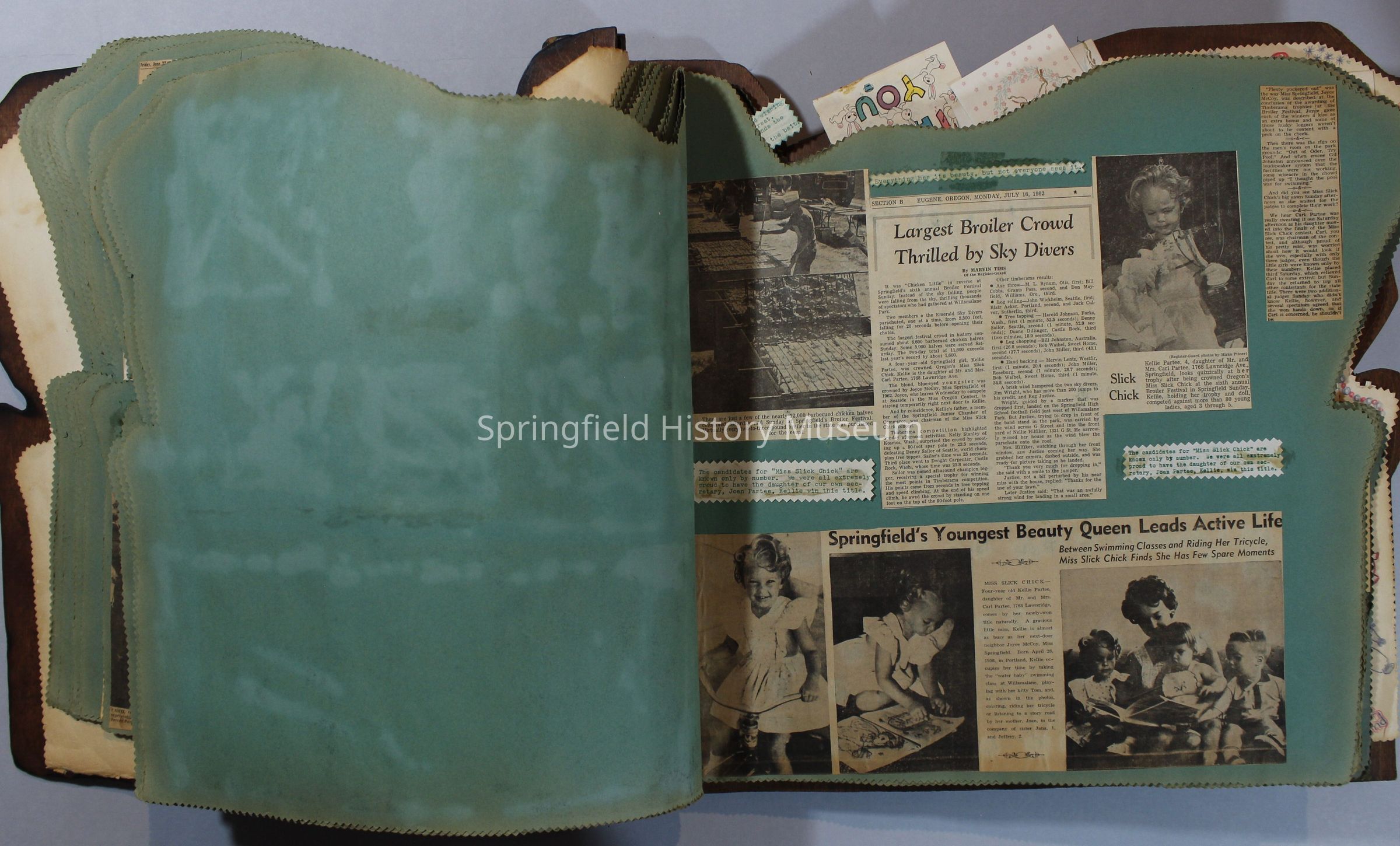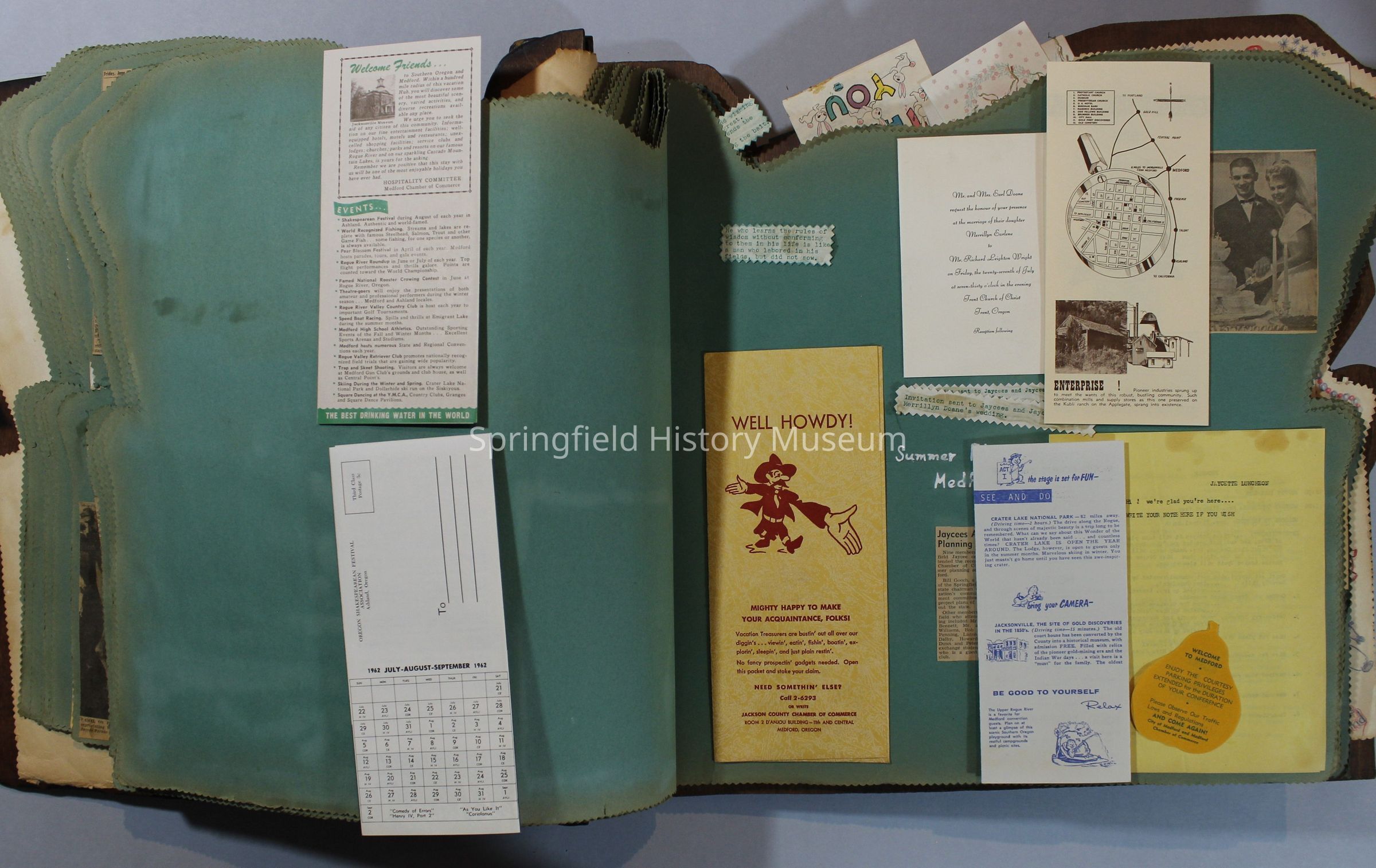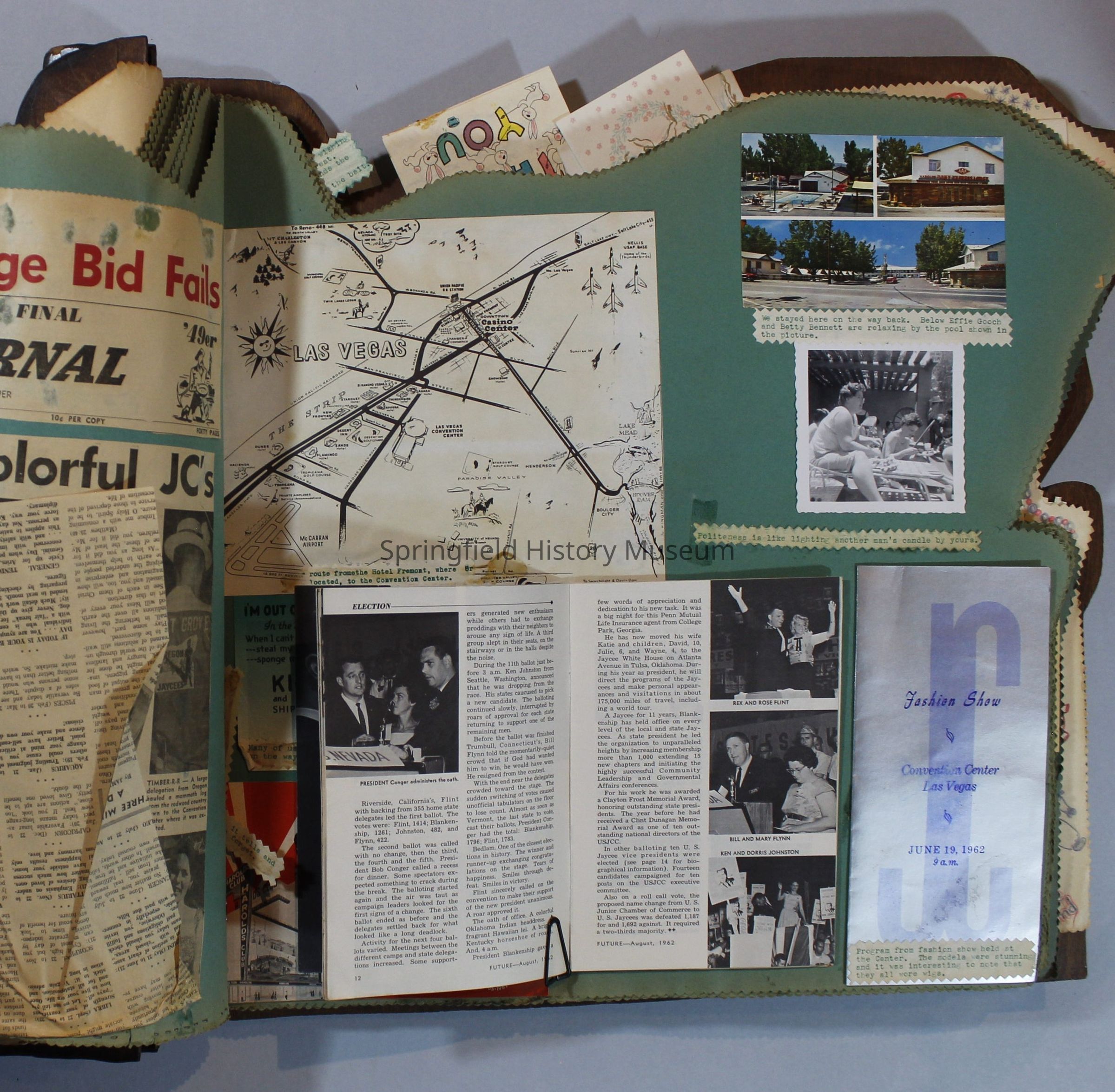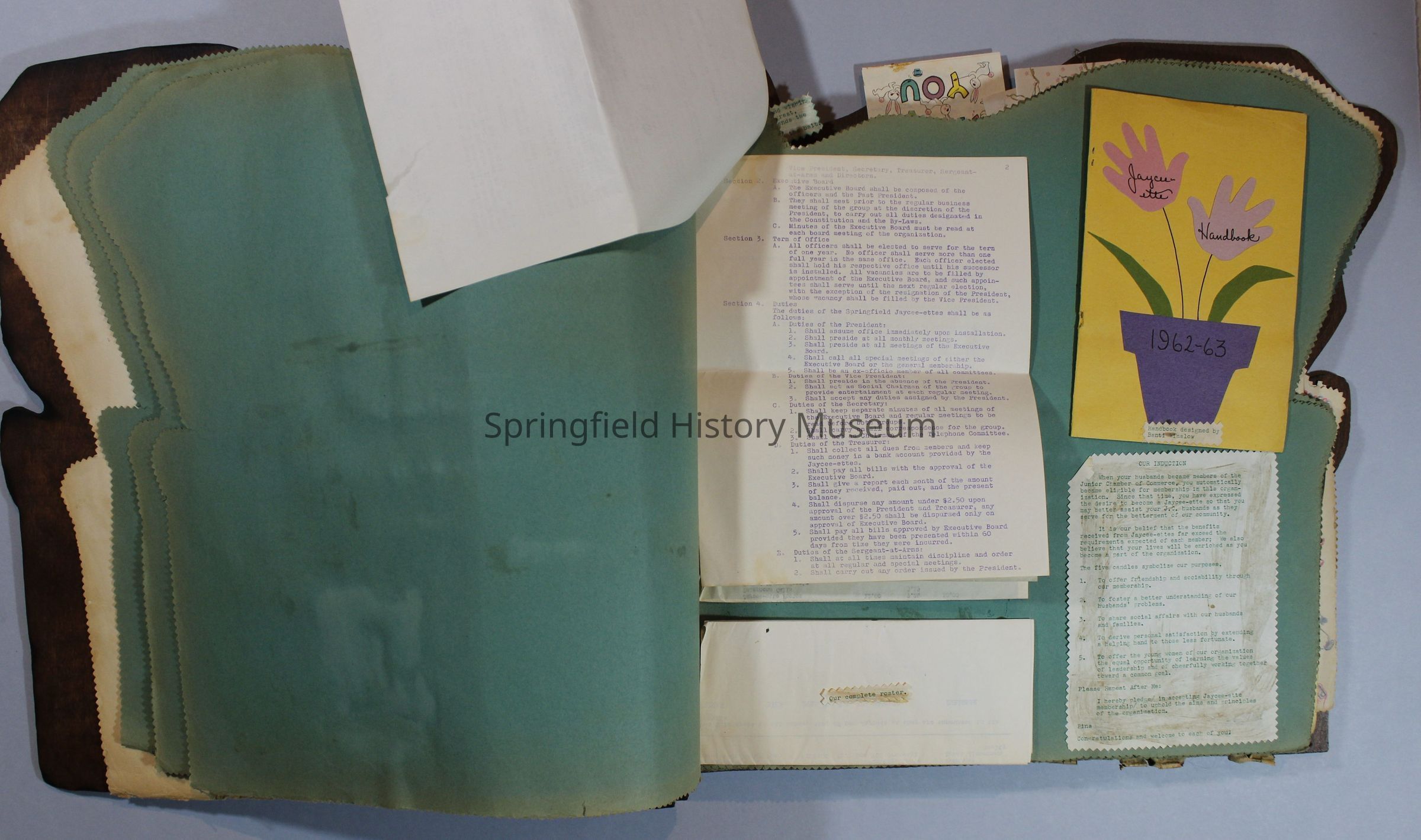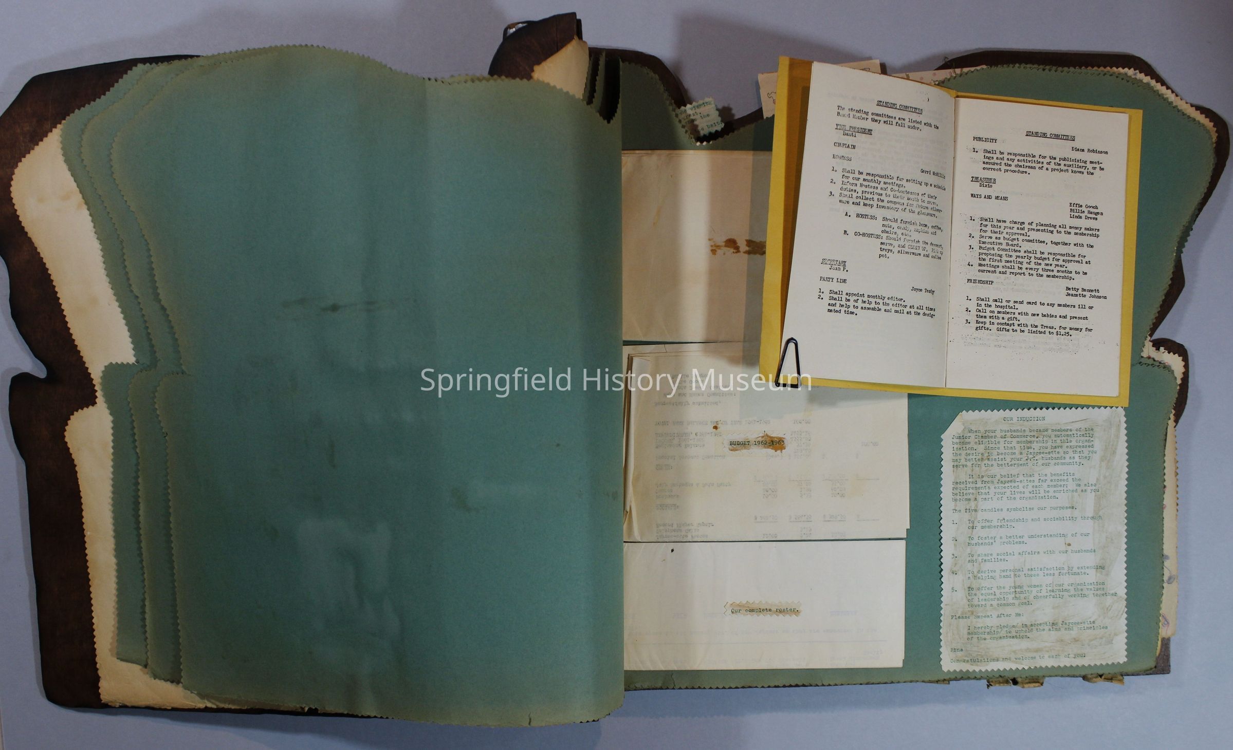 Scrapbook of Springfield, Oregon Jaycee-ettes, Joan Harman Possion, was President at the time of events.1962-1963, scrapbook cover is of wood with brass color hinges. The scrapbook contains newspaper articles, photo's, and cards.
