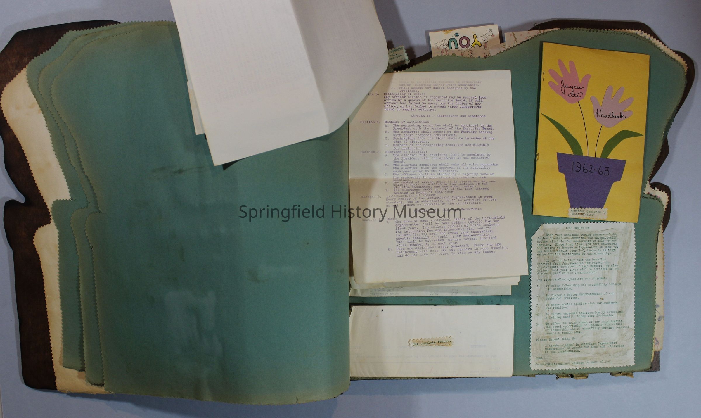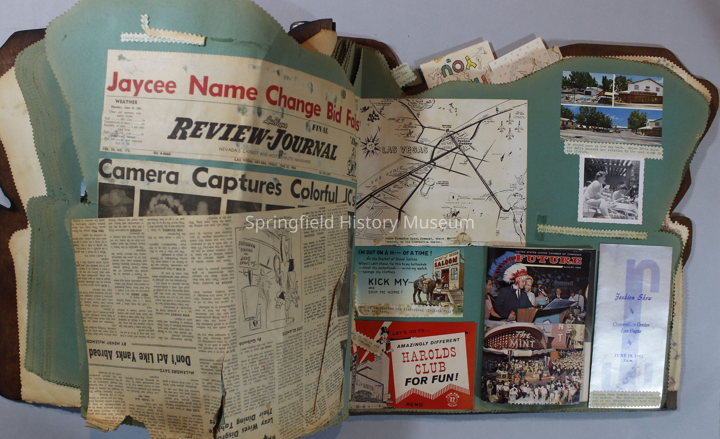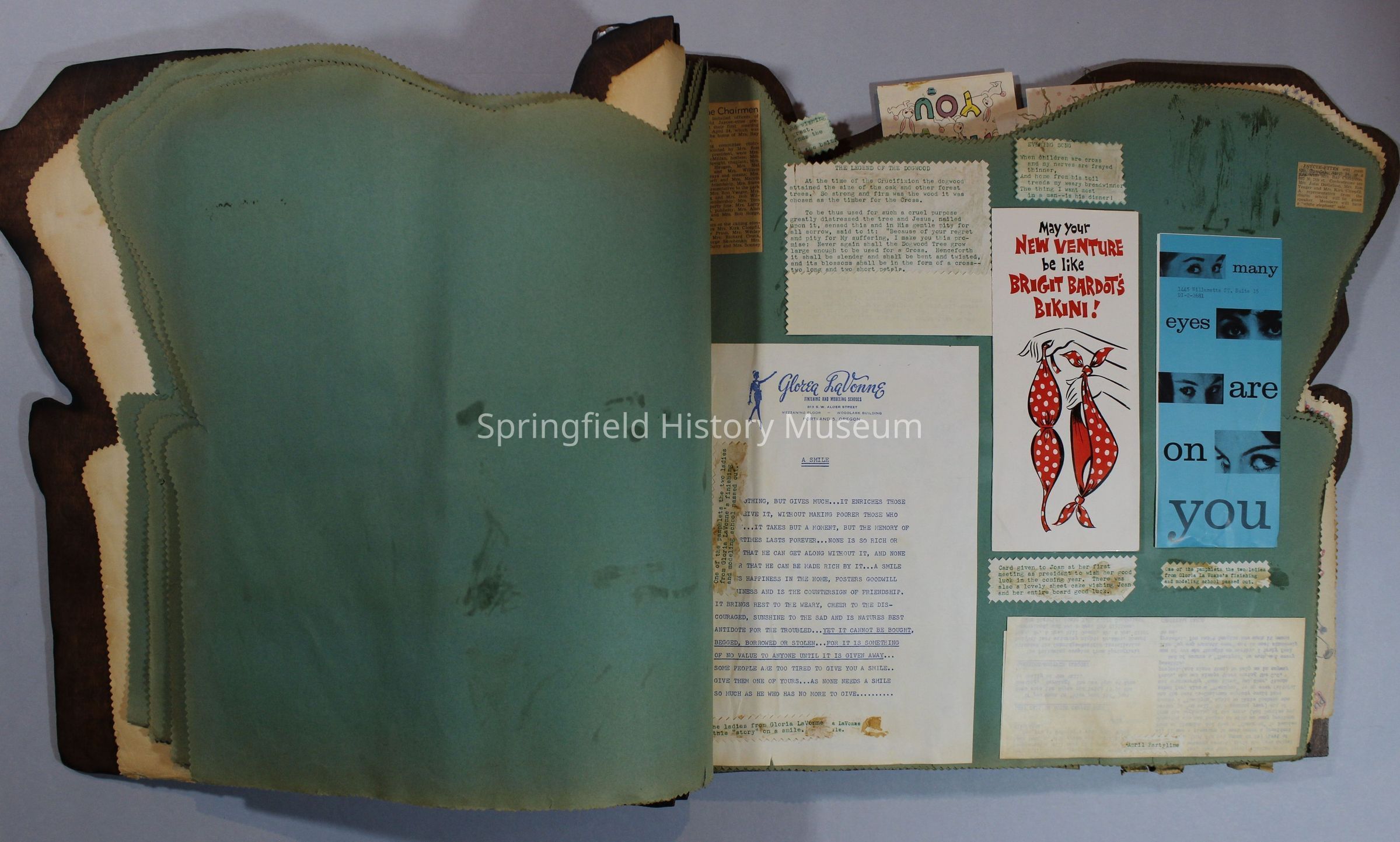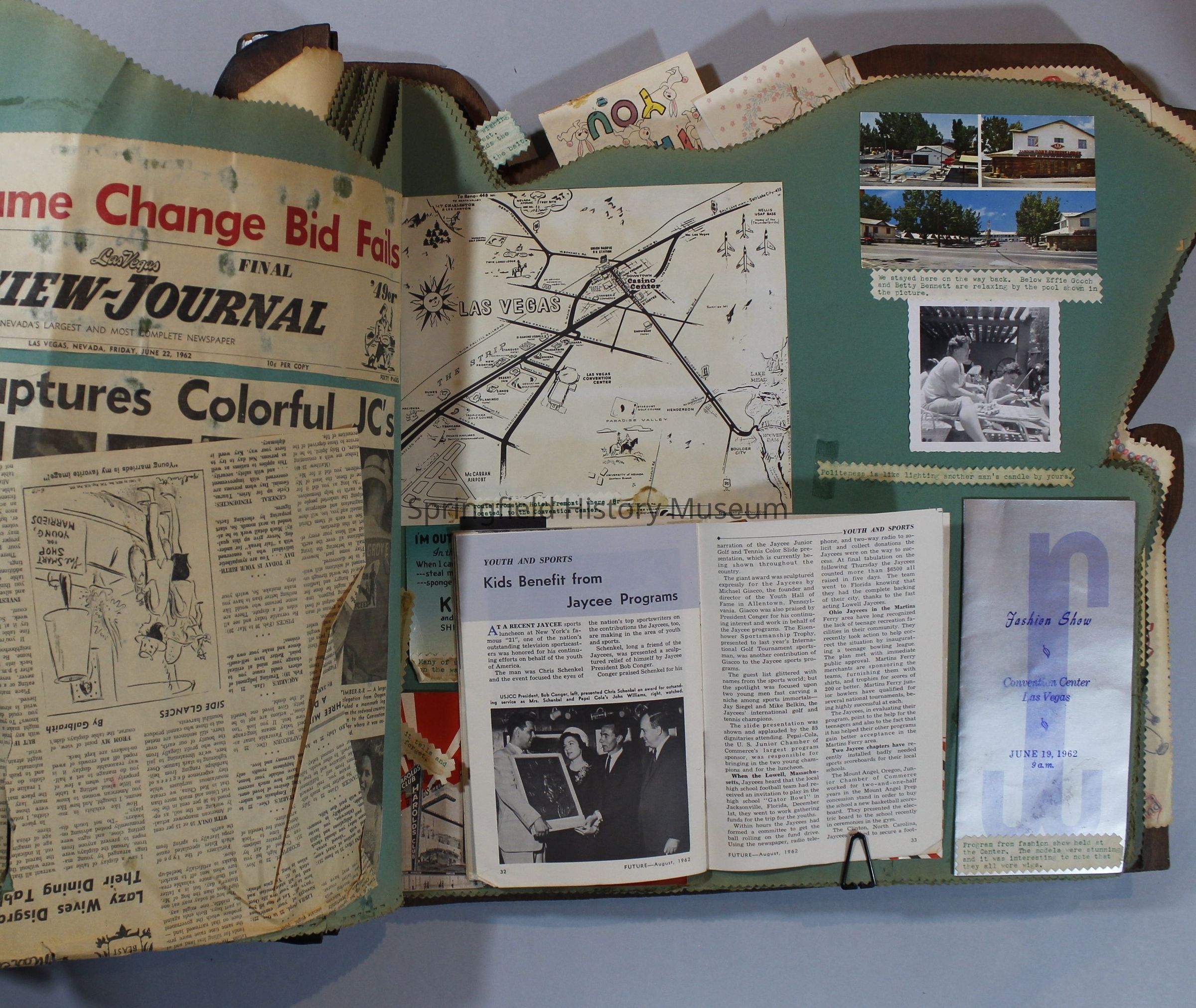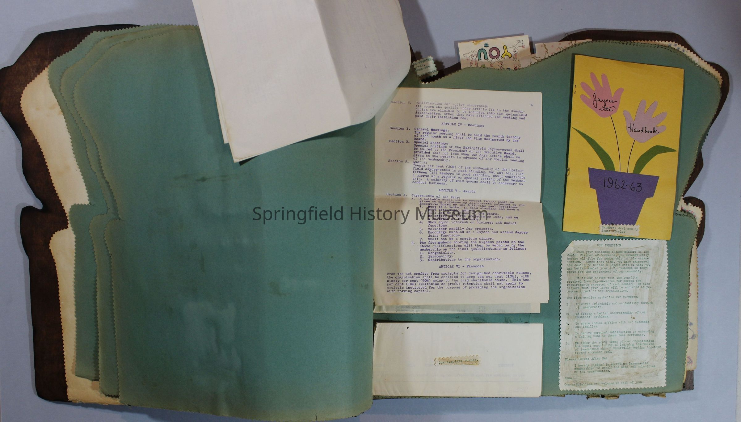 Scrapbook of Springfield, Oregon Jaycee-ettes, Joan Harman Possion, was President at the time of events.1962-1963, scrapbook cover is of wood with brass color hinges. The scrapbook contains newspaper articles, photo's, and cards.