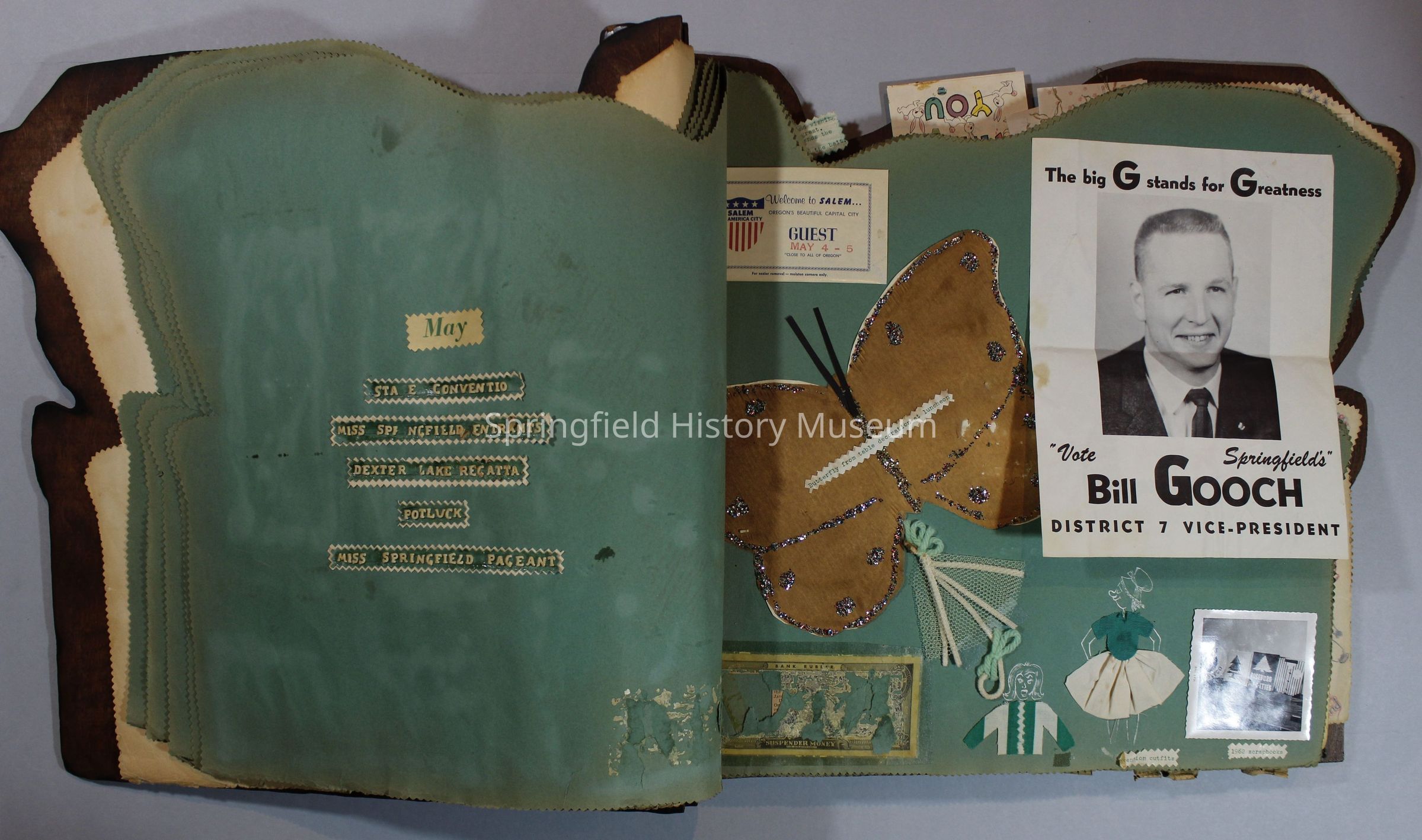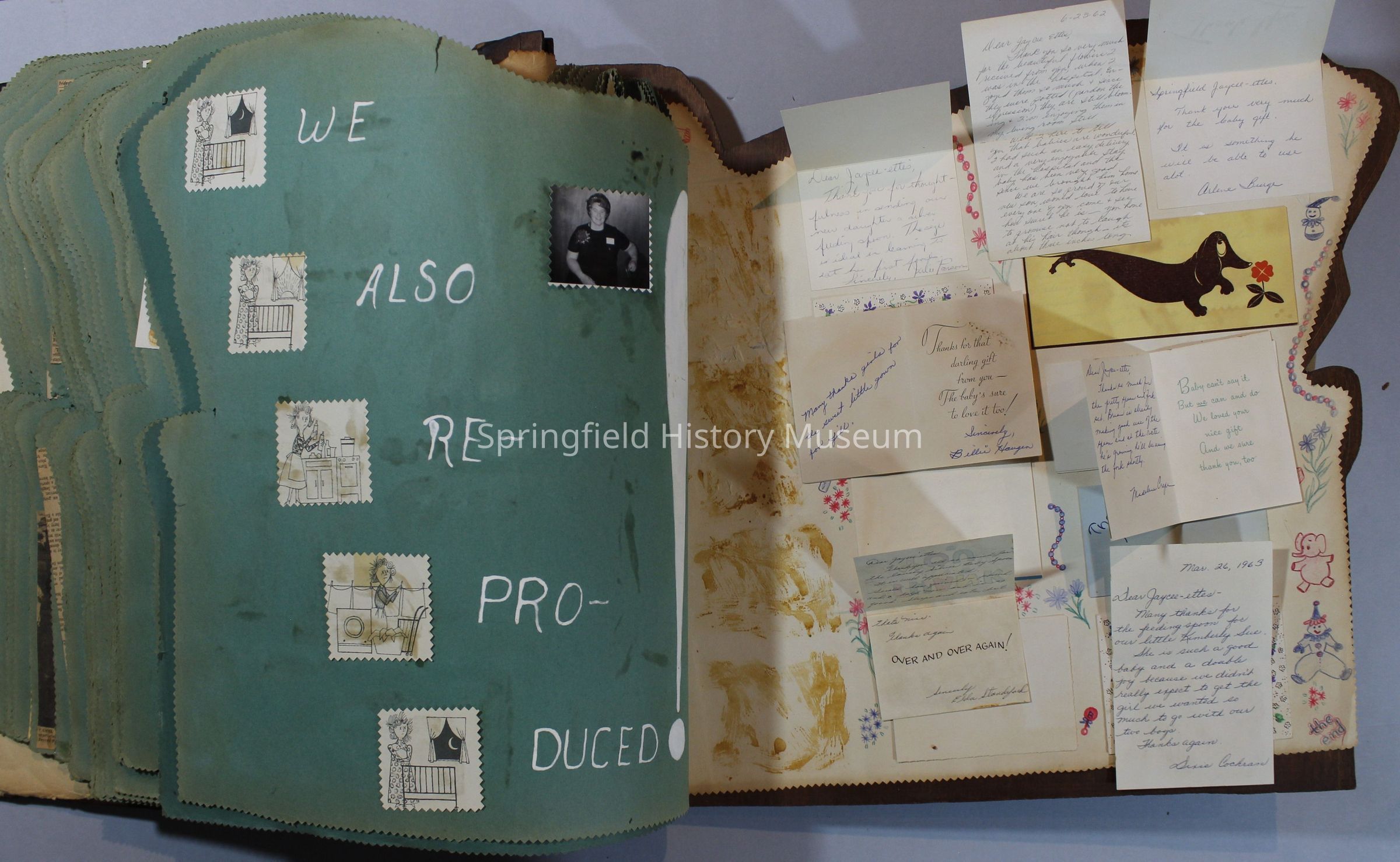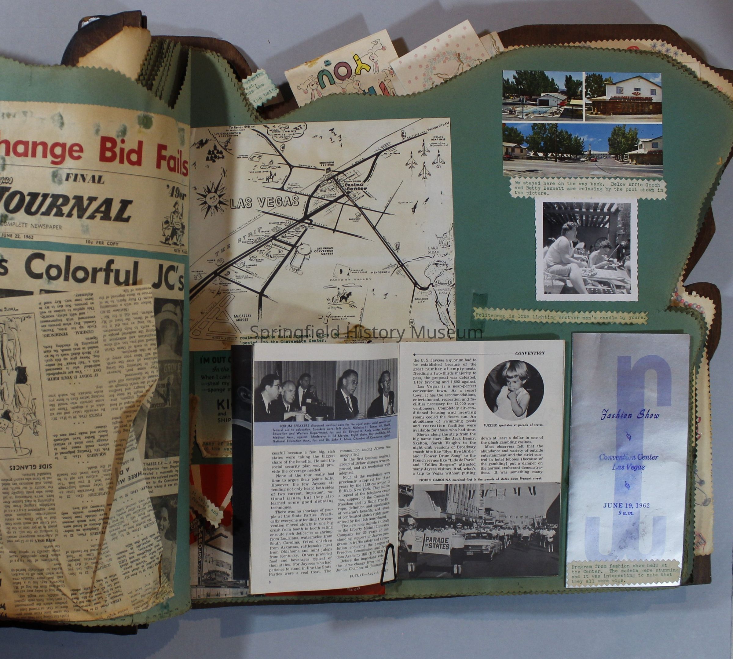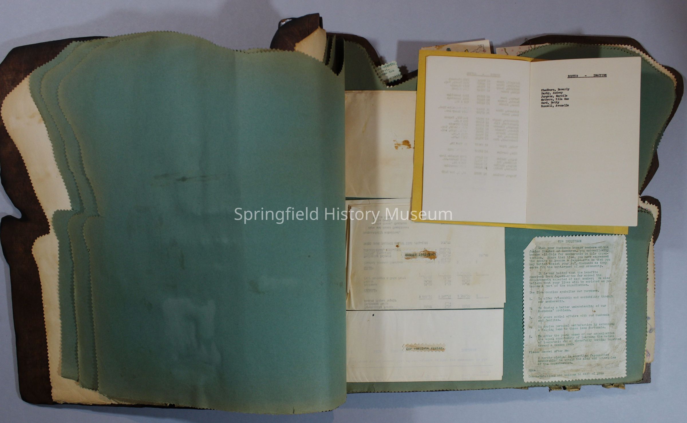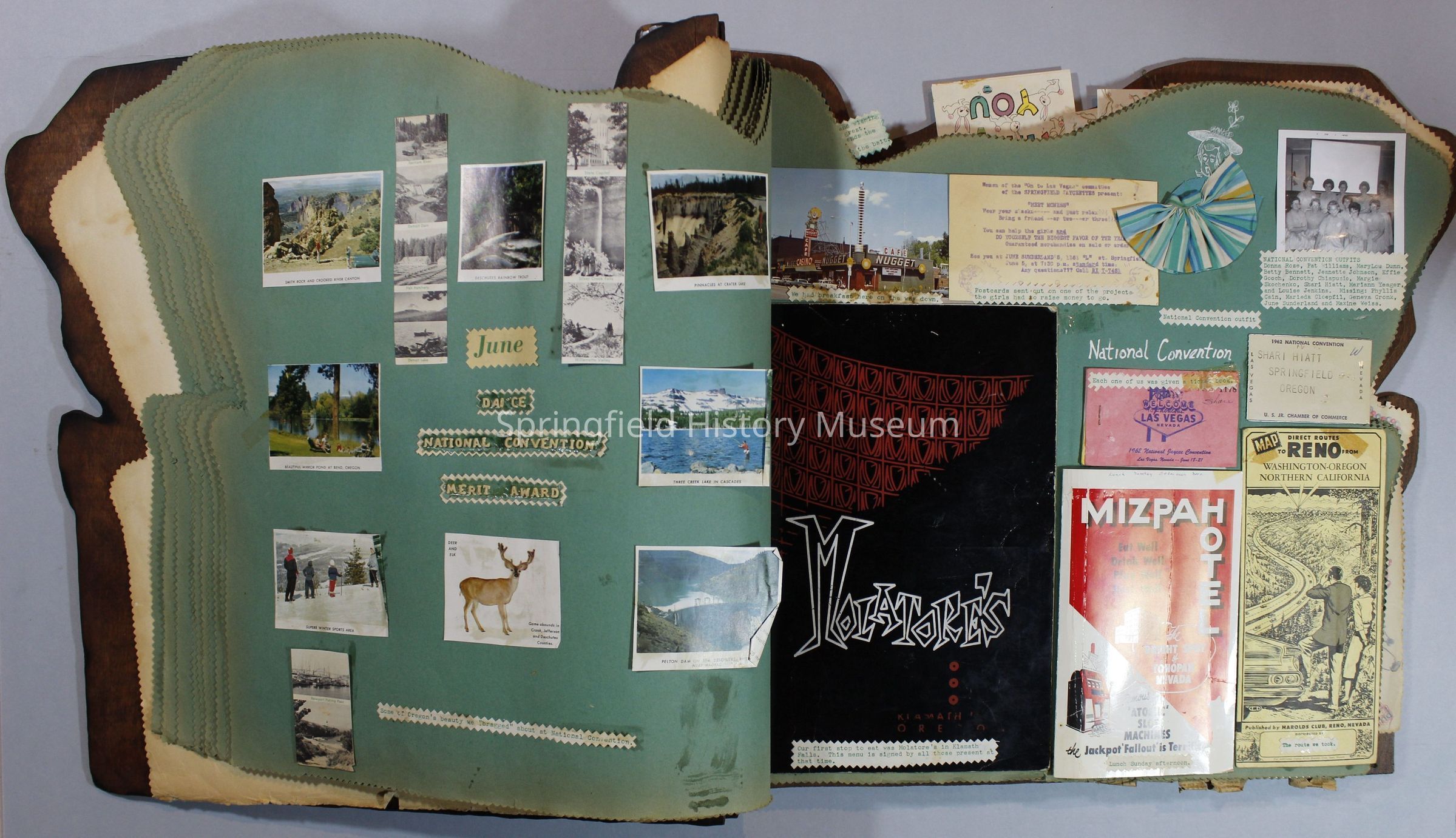 Scrapbook of Springfield, Oregon Jaycee-ettes, Joan Harman Possion, was President at the time of events.1962-1963, scrapbook cover is of wood with brass color hinges. The scrapbook contains newspaper articles, photo's, and cards.