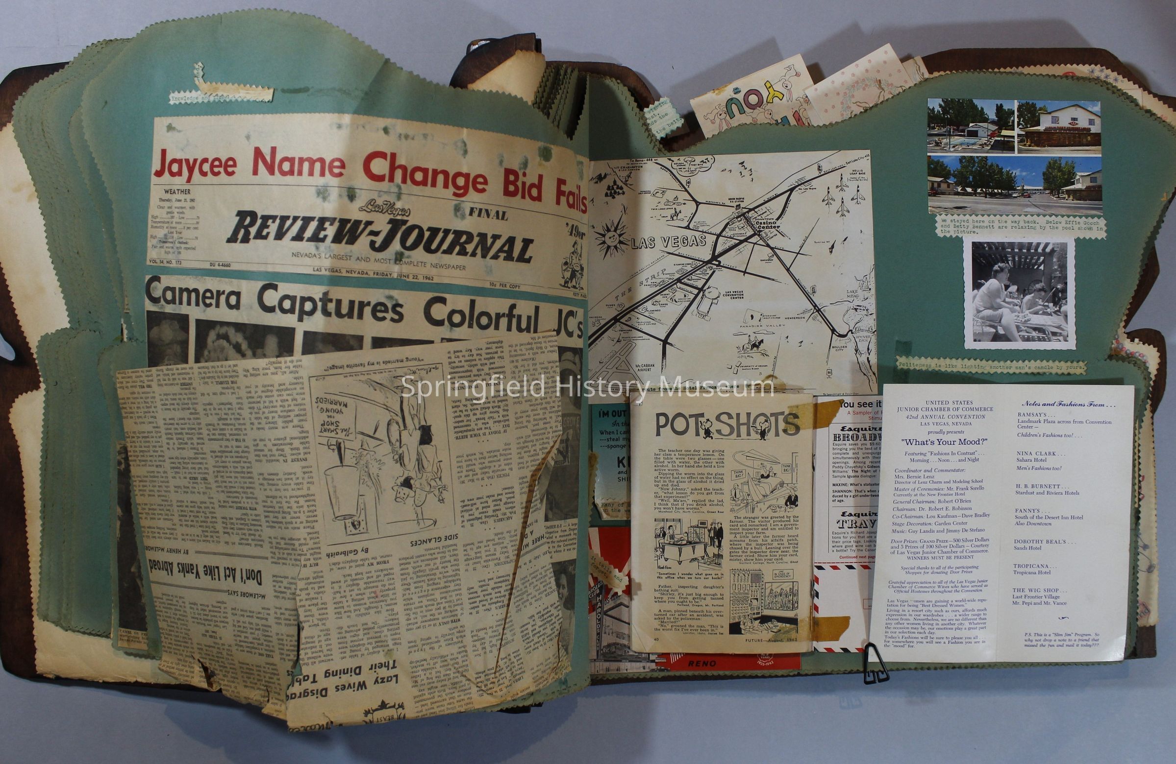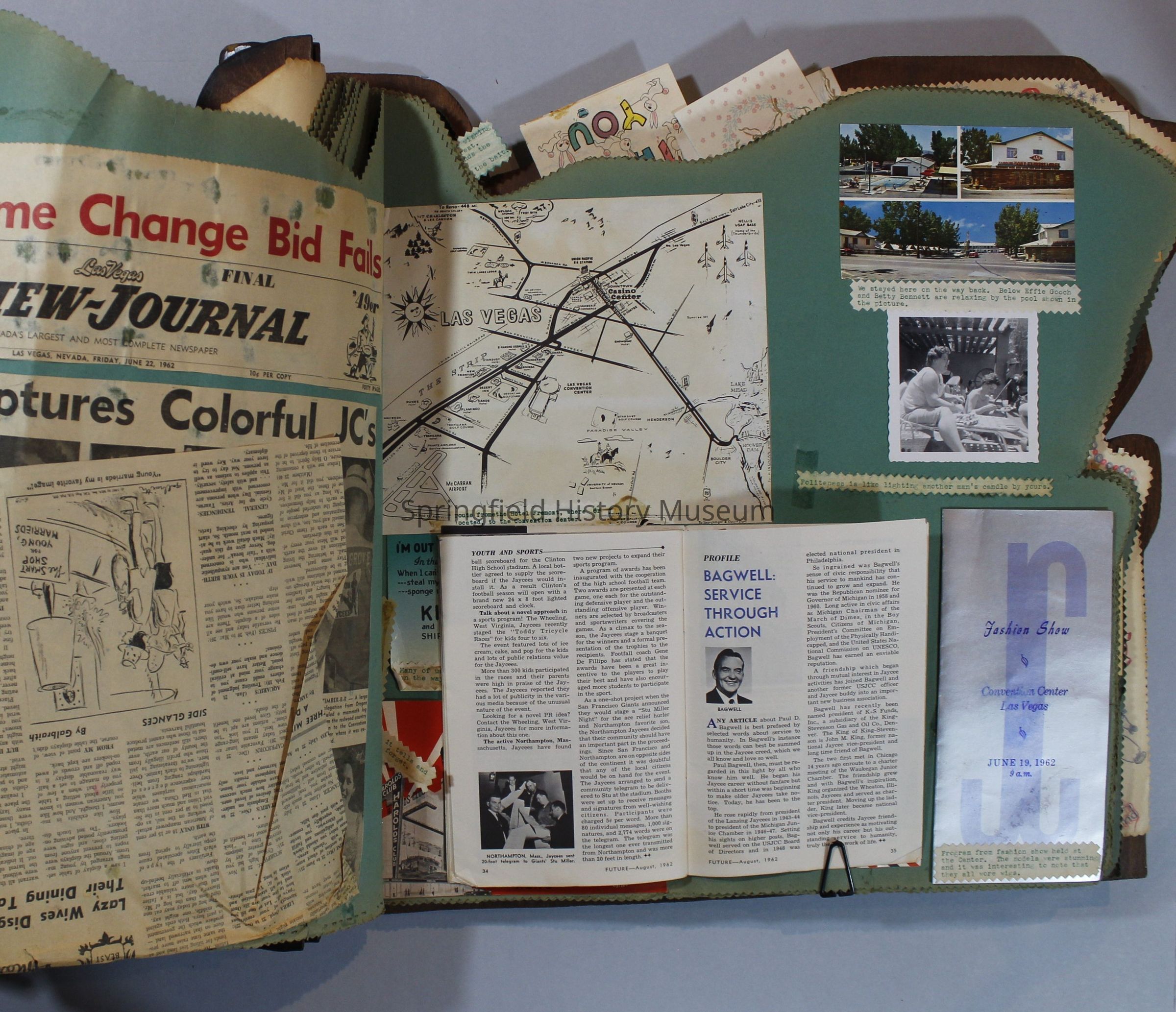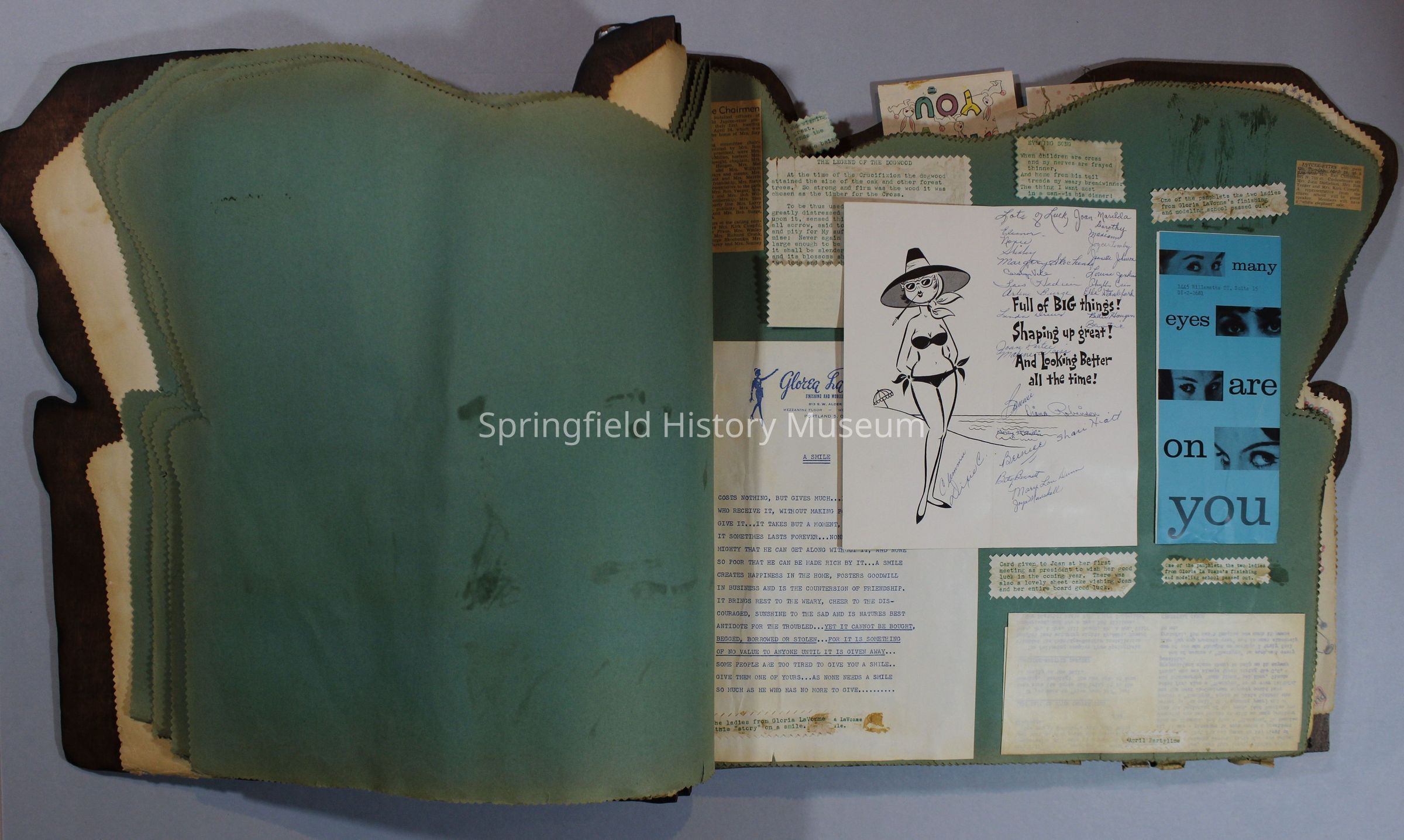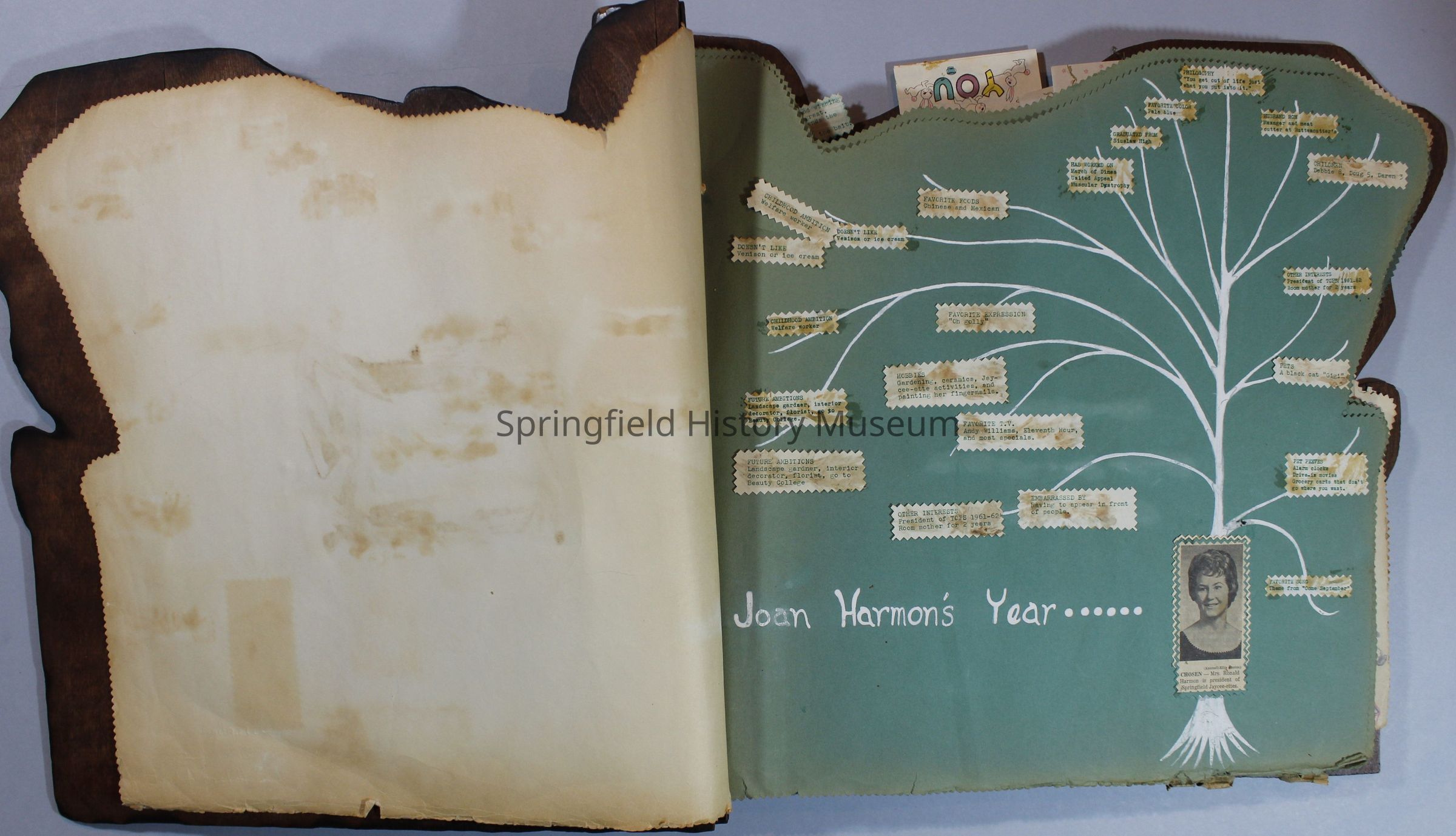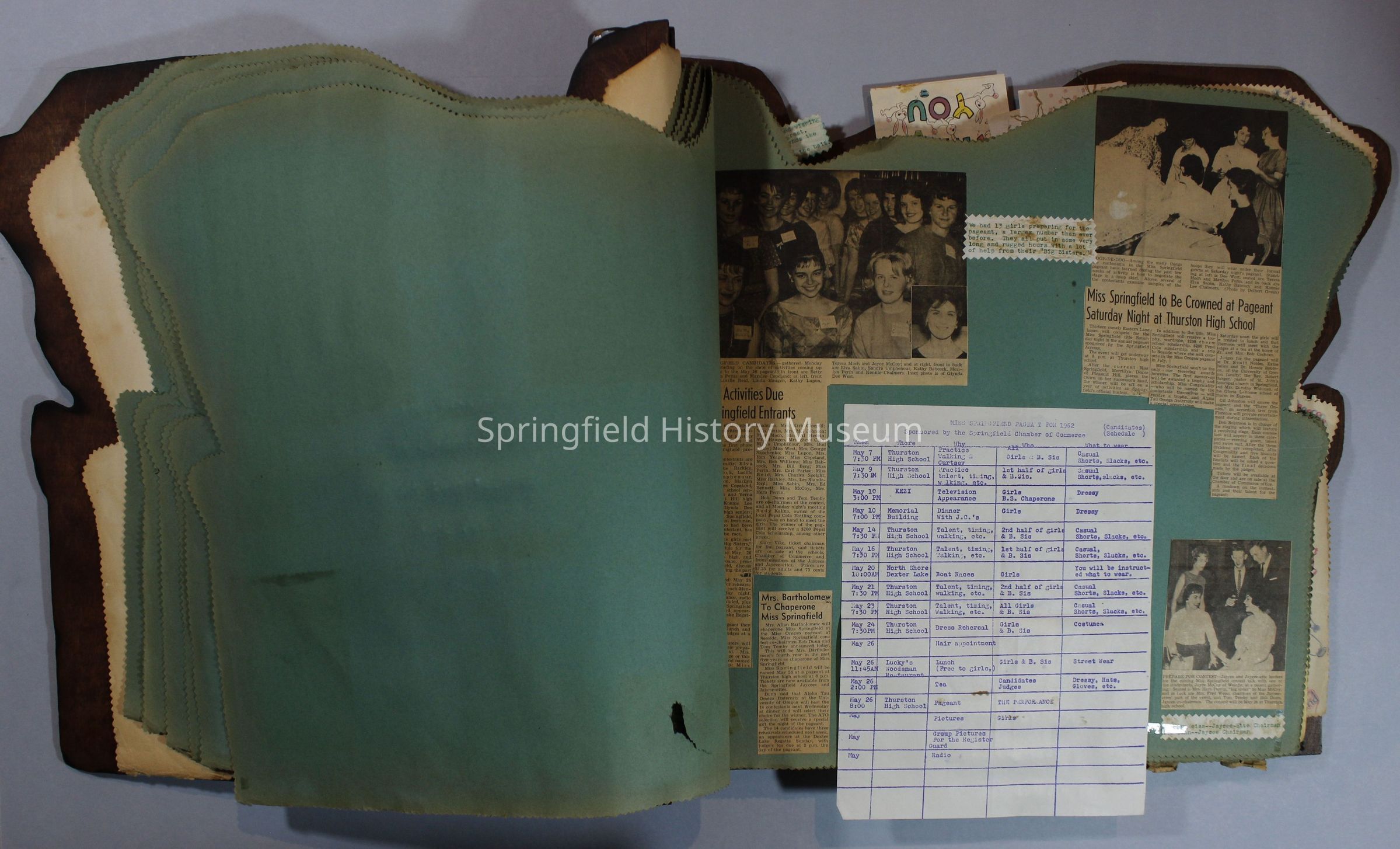 Scrapbook of Springfield, Oregon Jaycee-ettes, Joan Harman Possion, was President at the time of events.1962-1963, scrapbook cover is of wood with brass color hinges. The scrapbook contains newspaper articles, photo's, and cards.