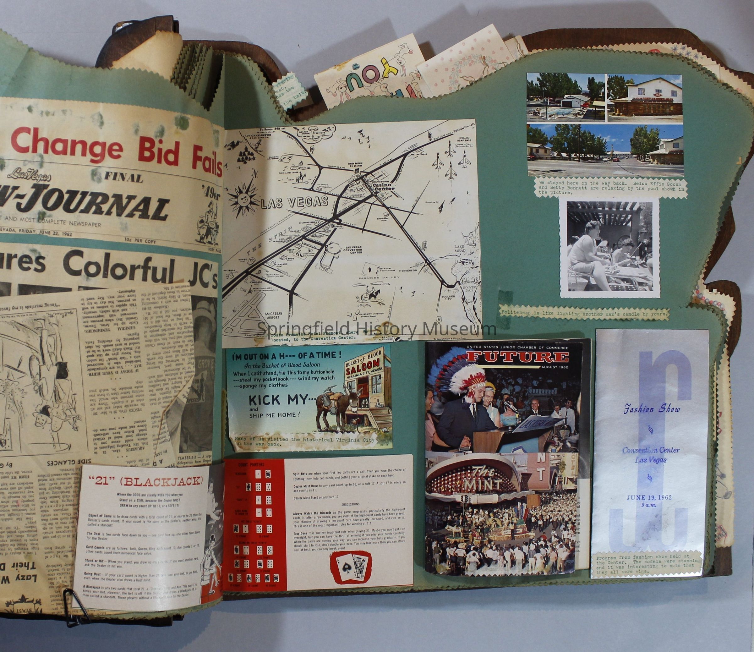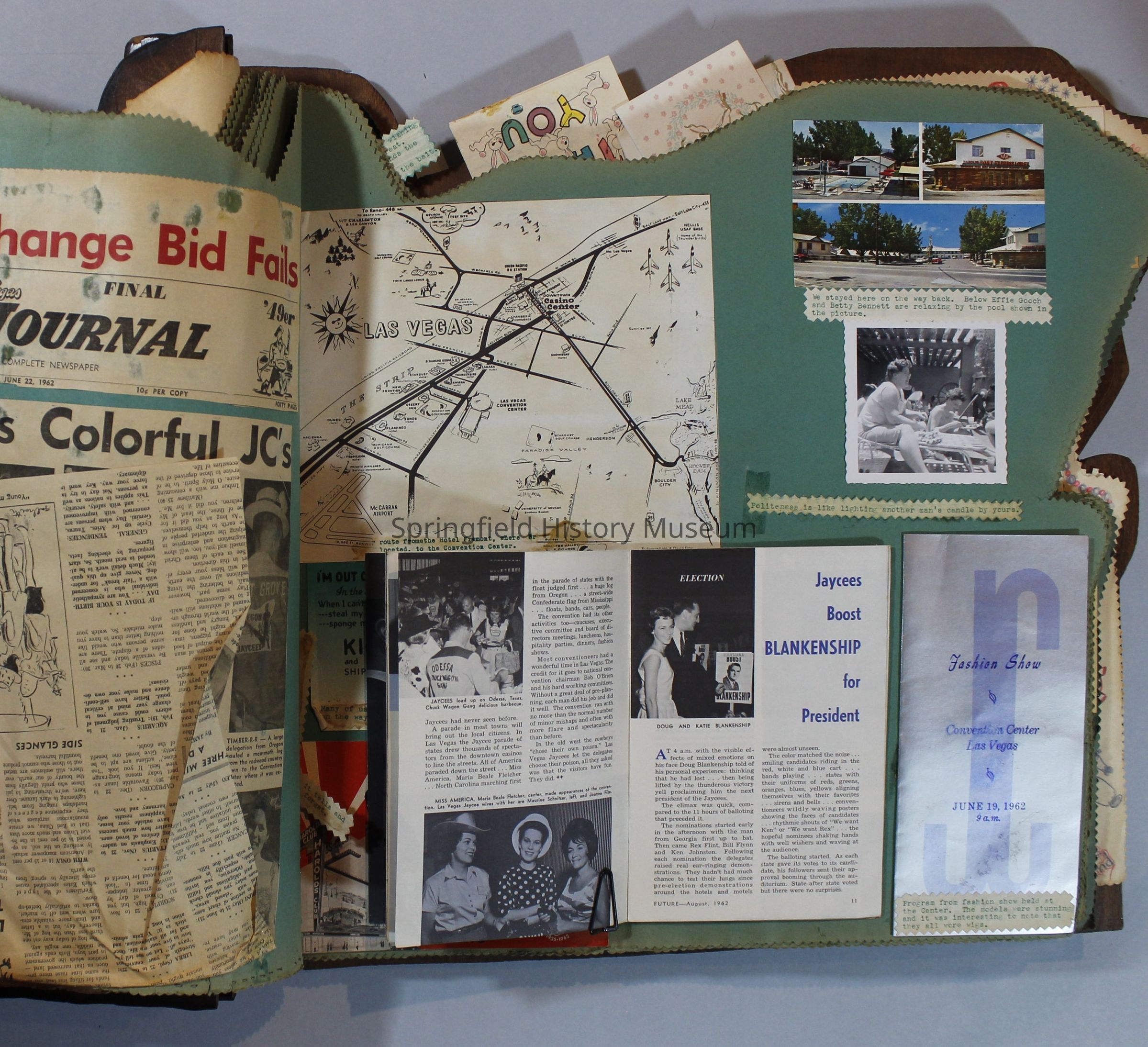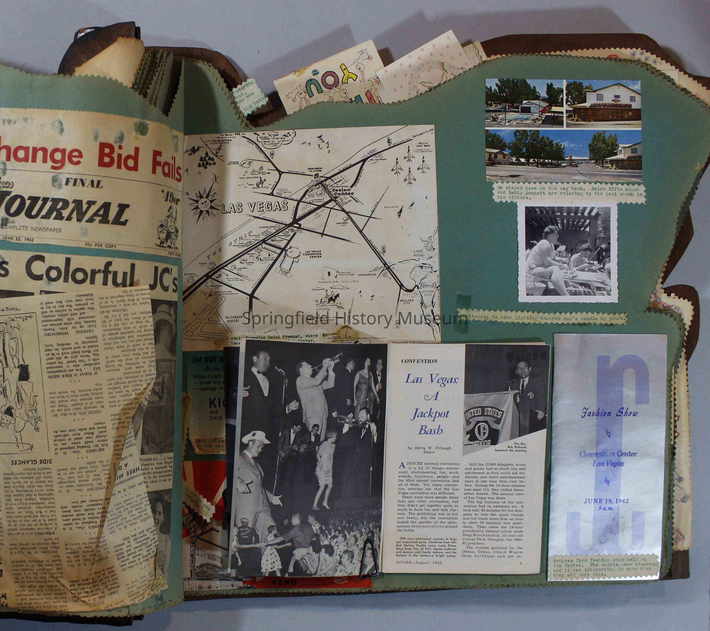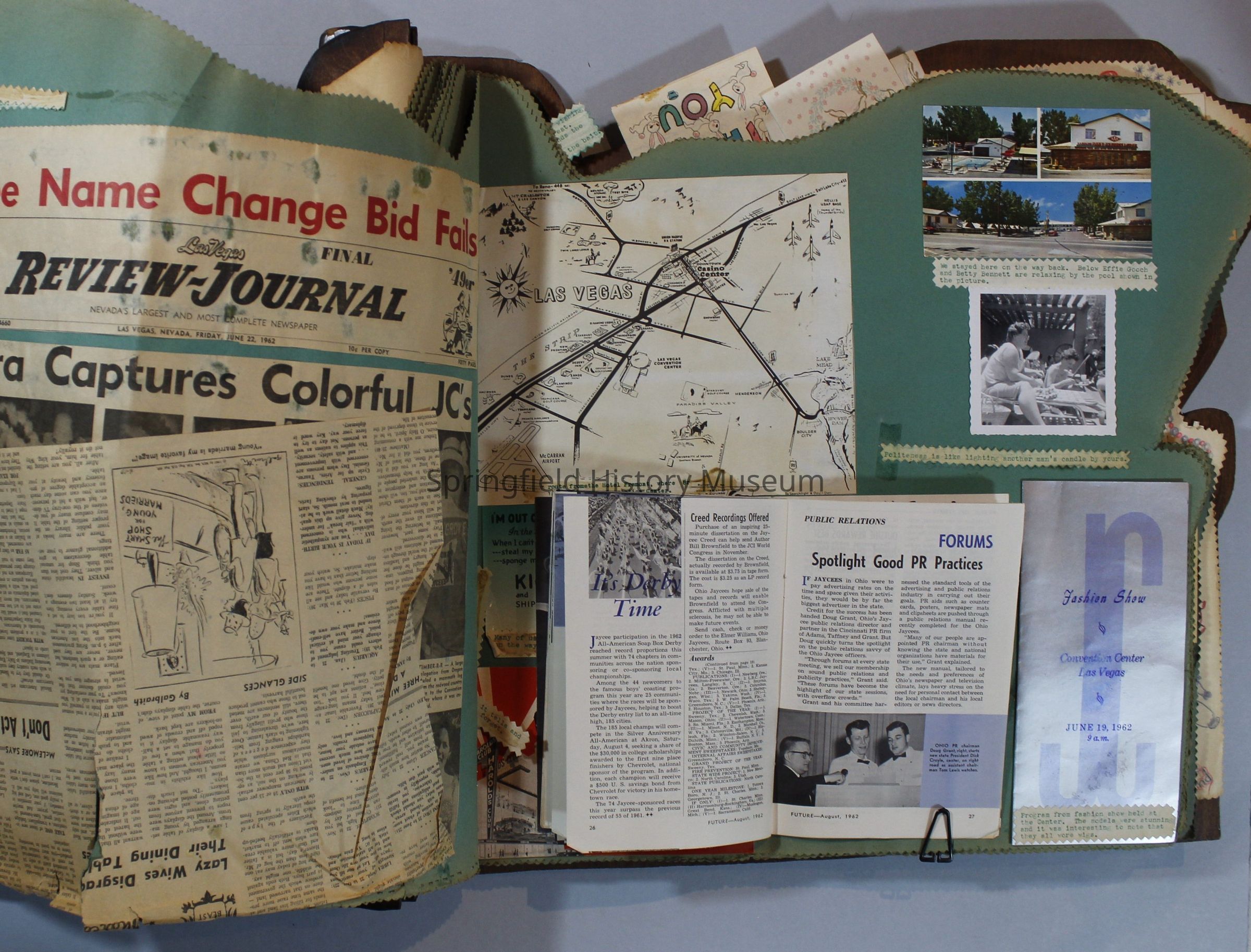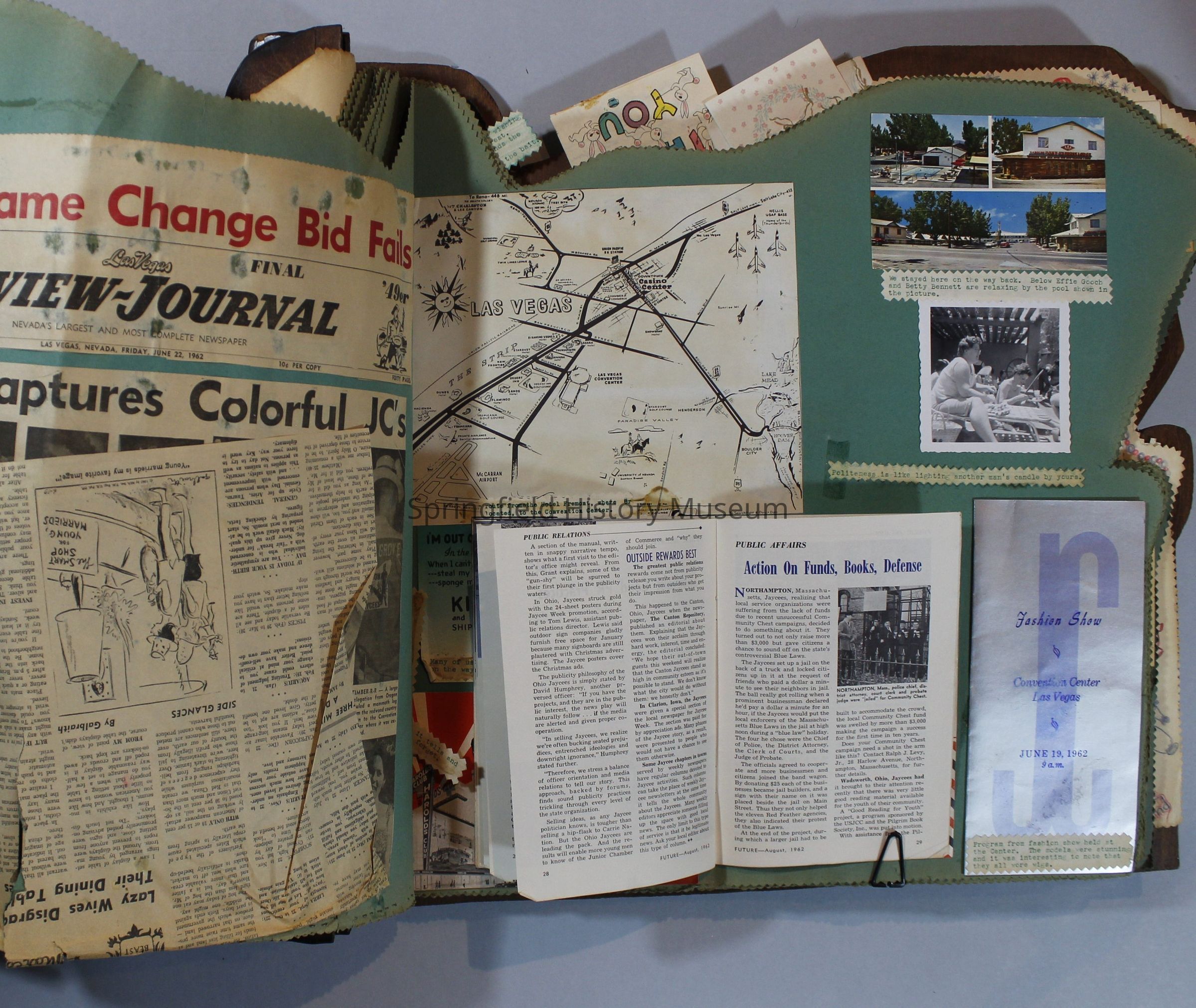Scrapbook of Springfield, Oregon Jaycee-ettes, Joan Harman Possion, was President at the time of events.1962-1963, scrapbook cover is of wood with brass color hinges. The scrapbook contains newspaper articles, photo's, and cards.