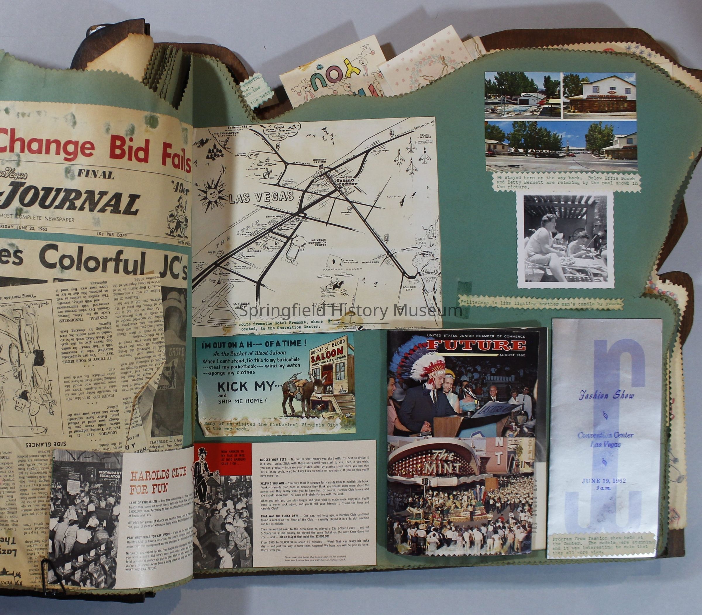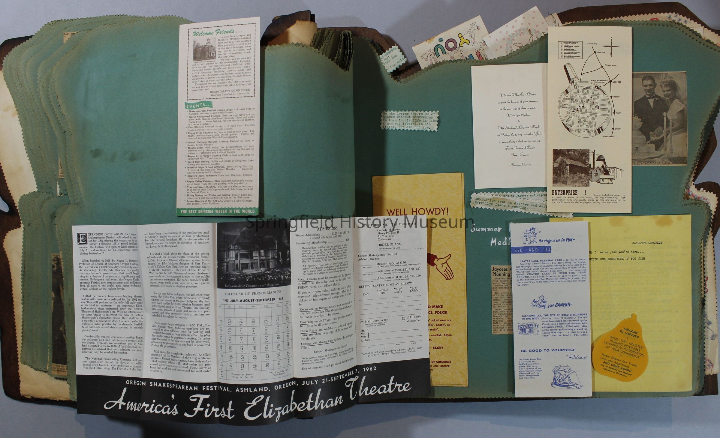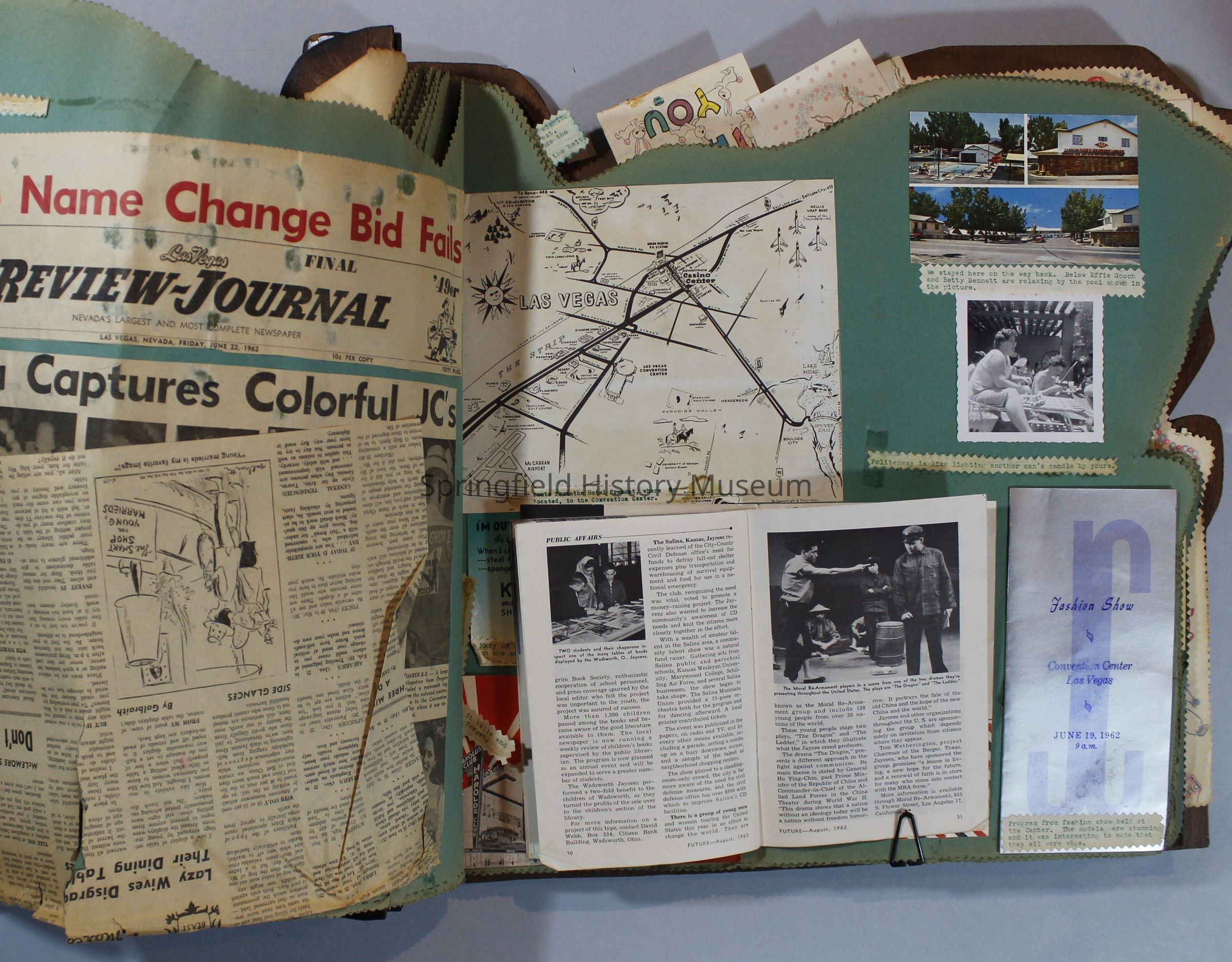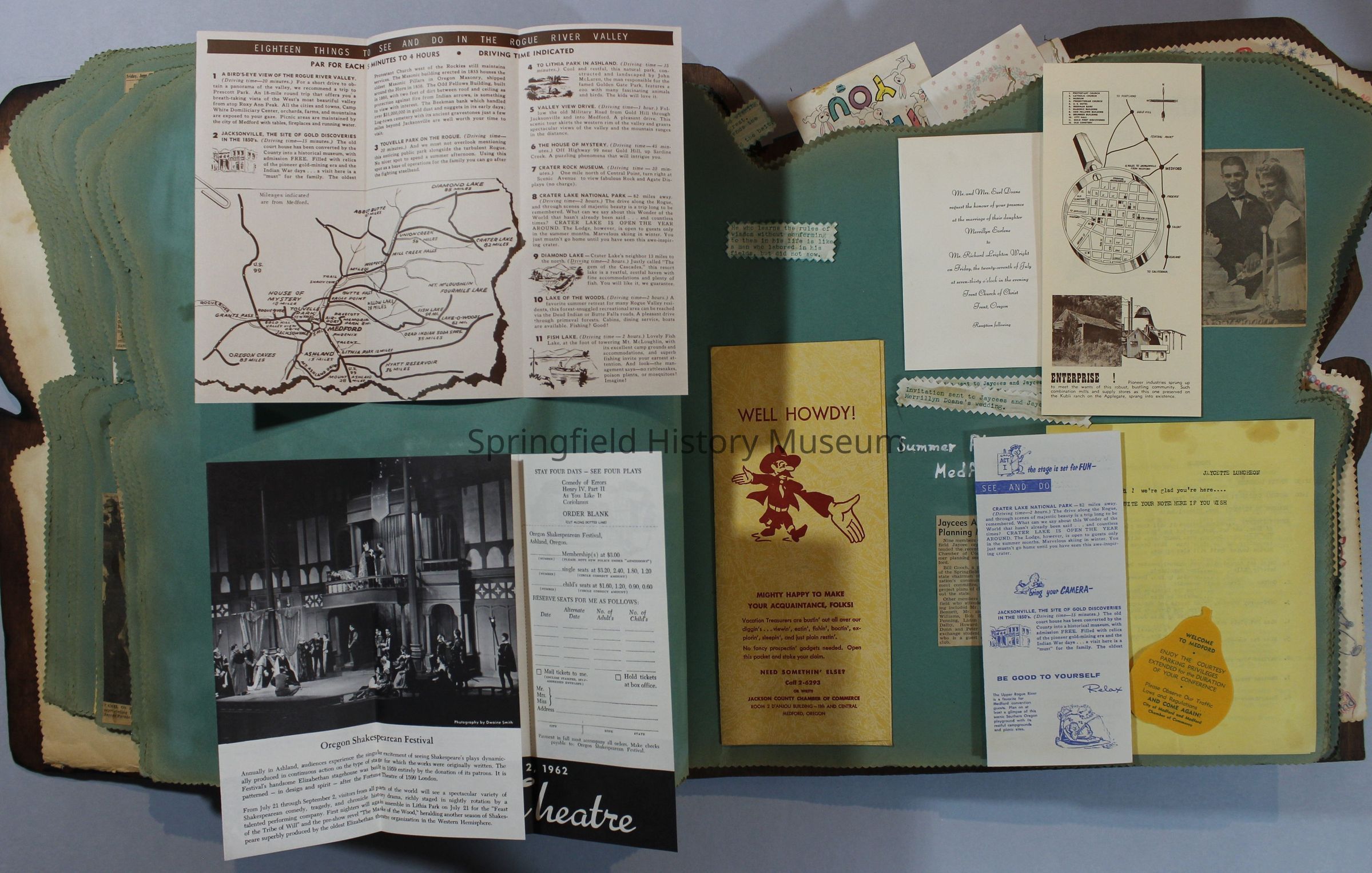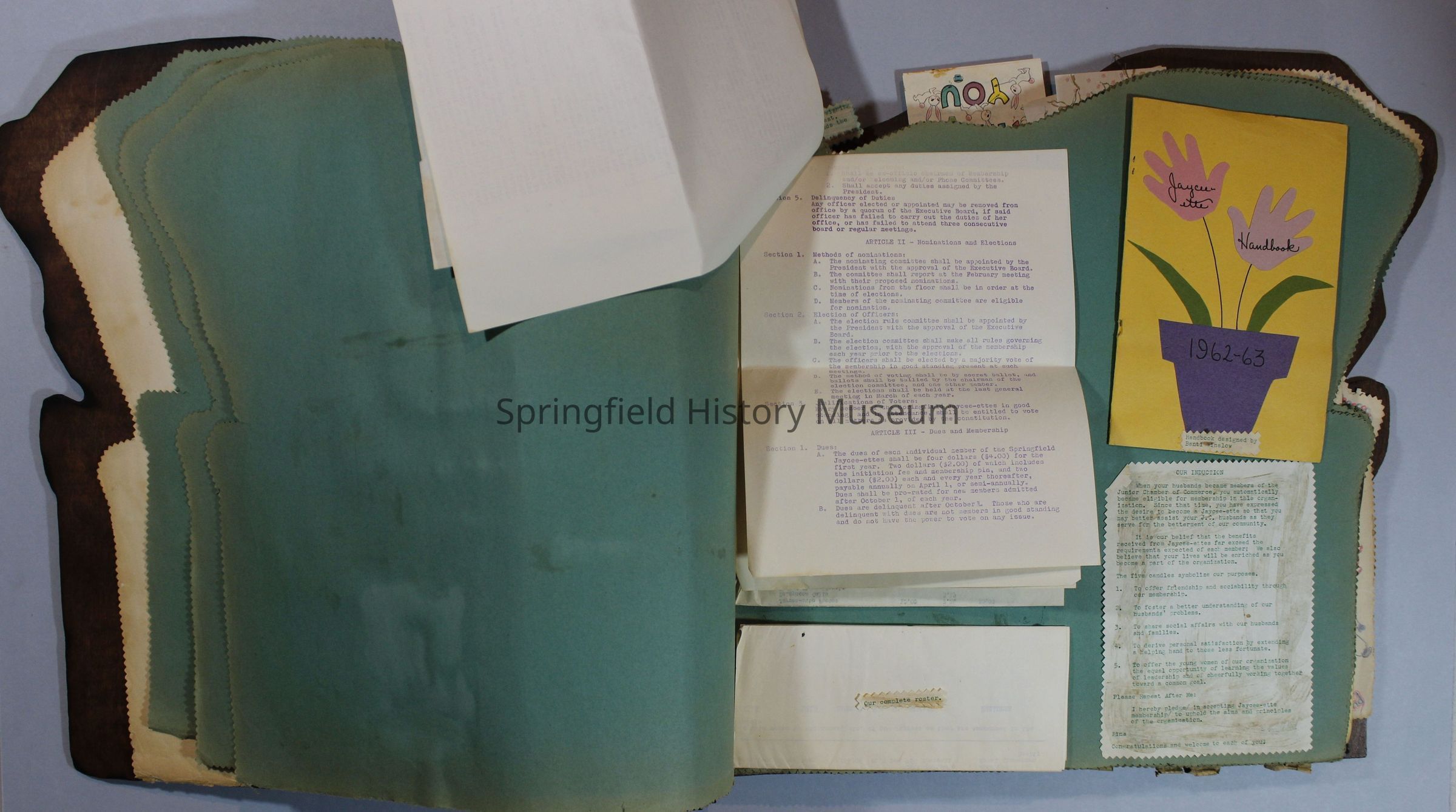Scrapbook of Springfield, Oregon Jaycee-ettes, Joan Harman Possion, was President at the time of events.1962-1963, scrapbook cover is of wood with brass color hinges. The scrapbook contains newspaper articles, photo's, and cards.