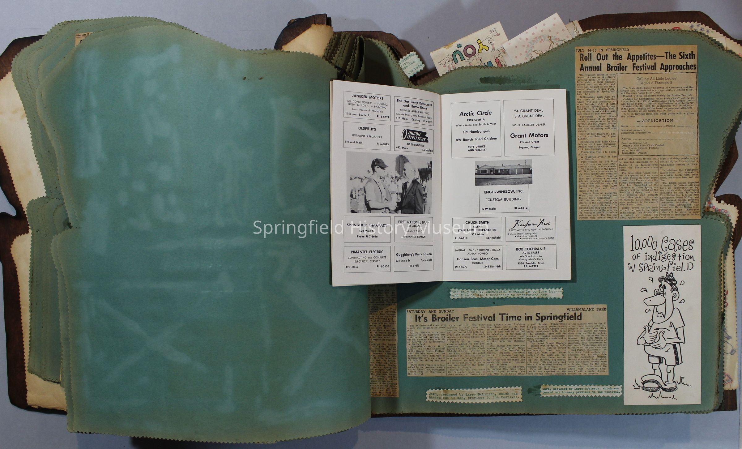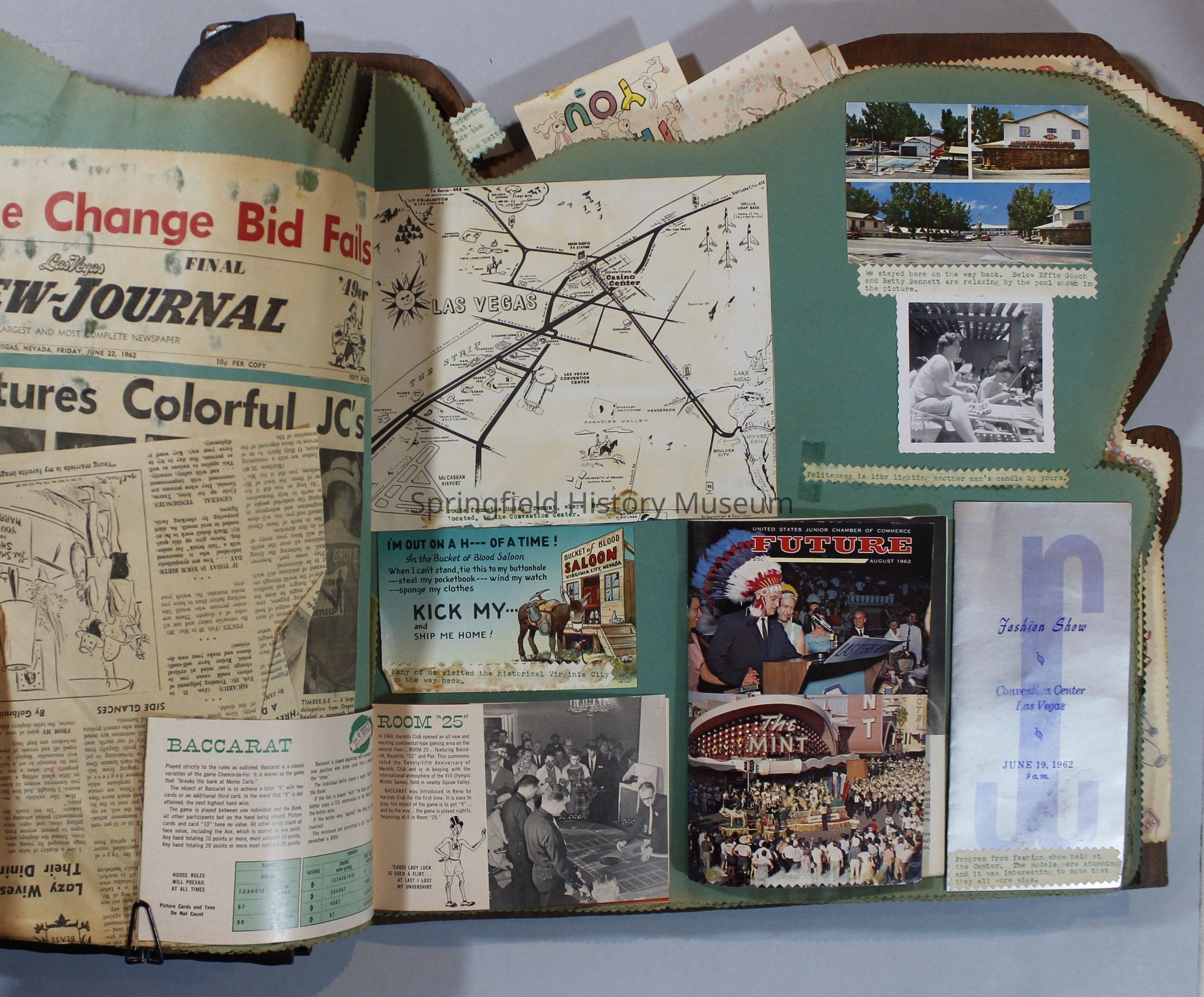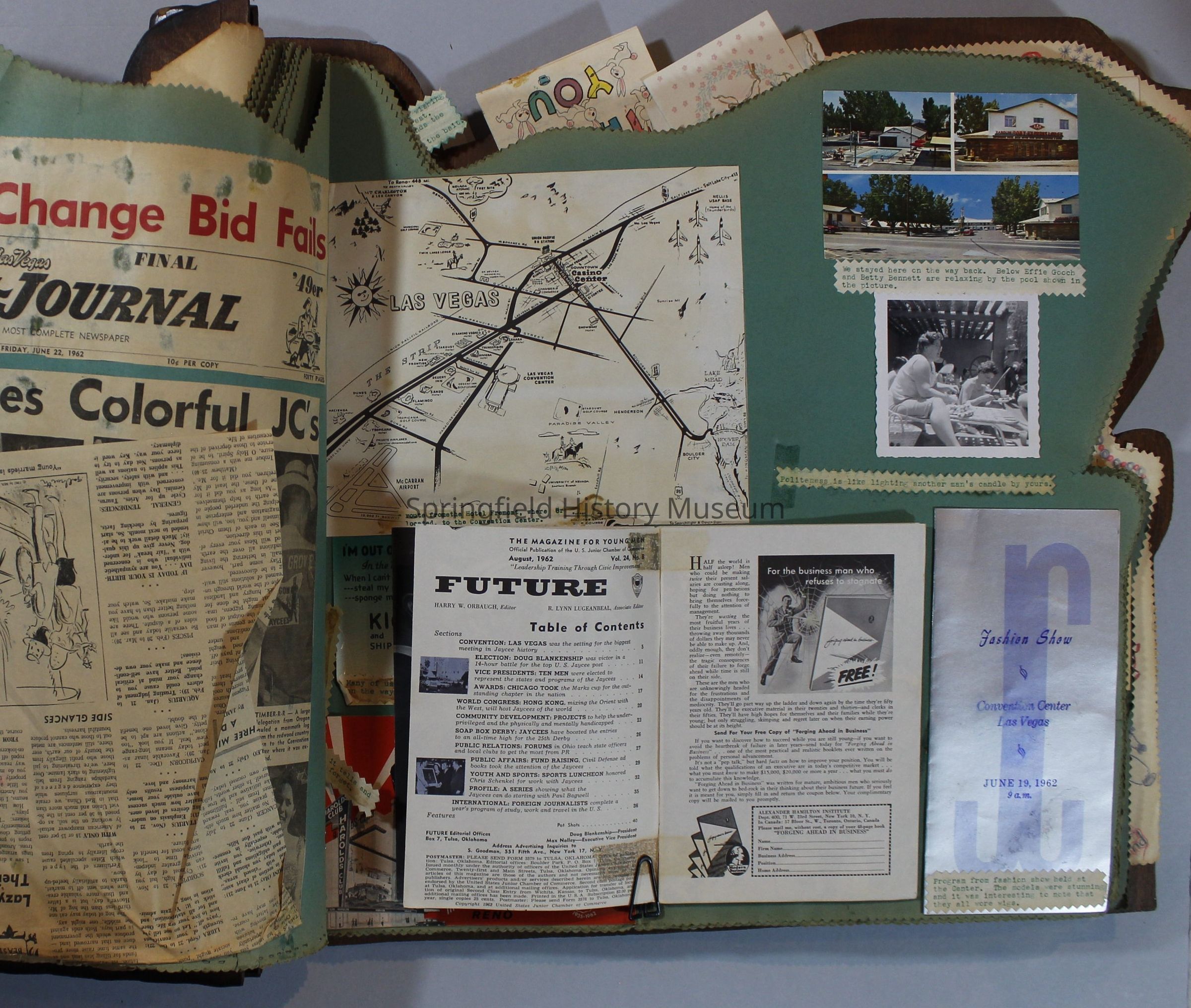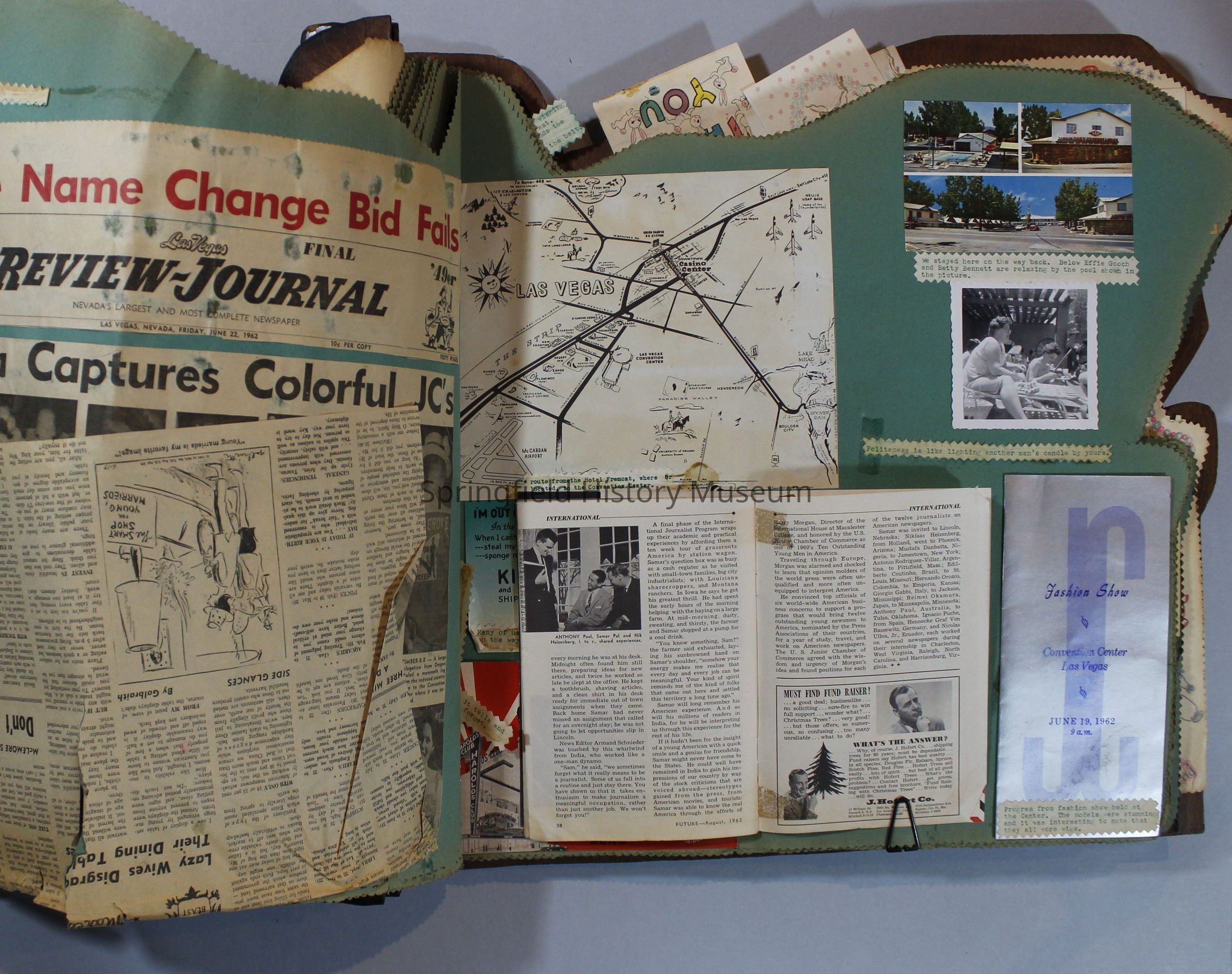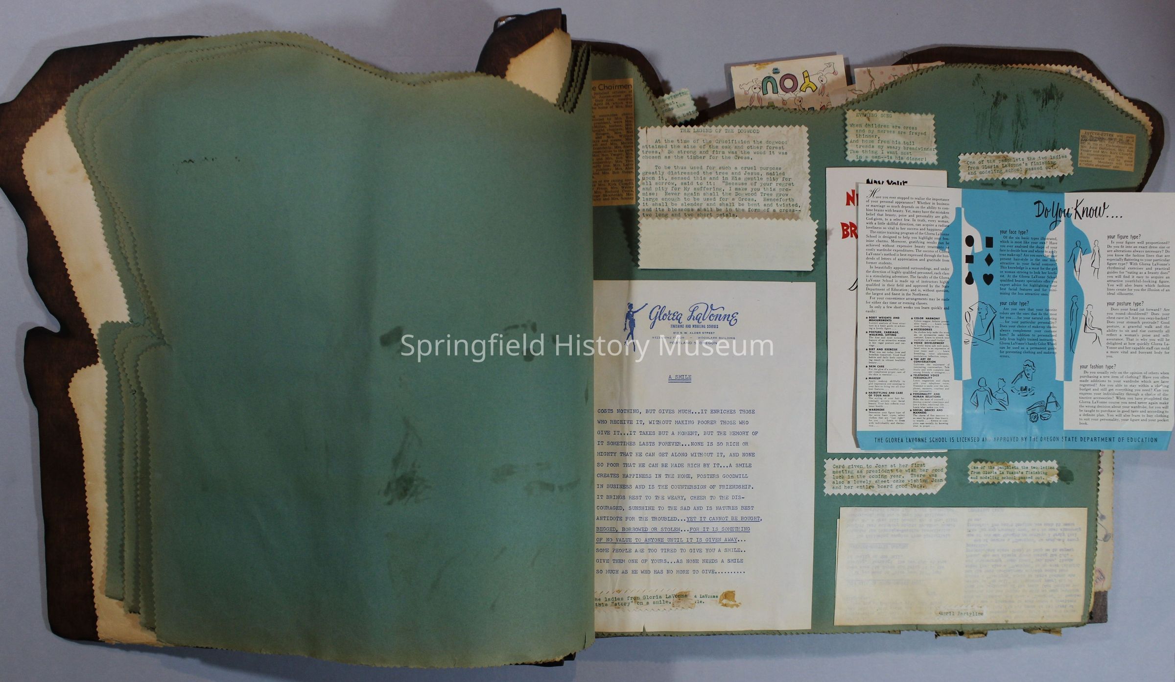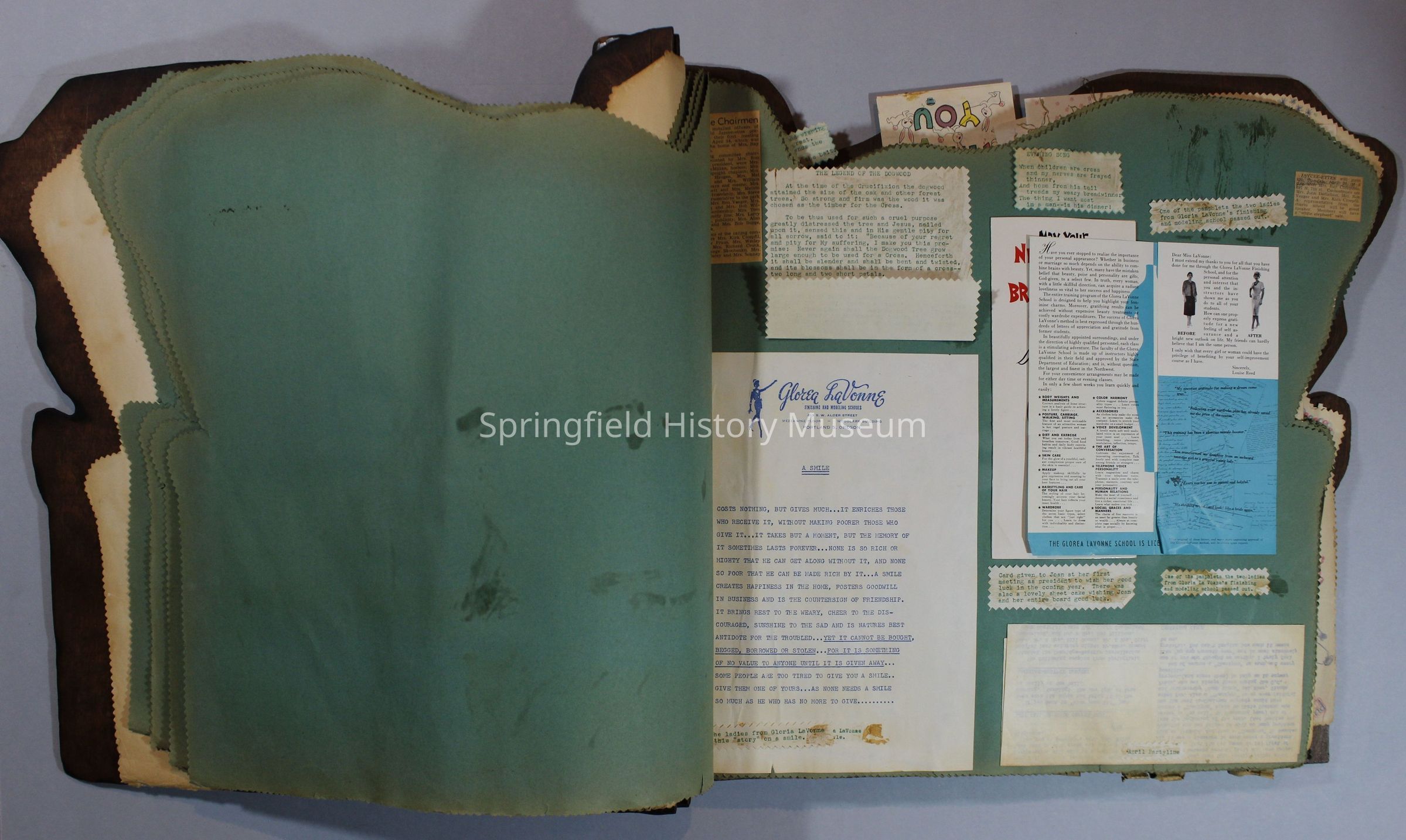 Scrapbook of Springfield, Oregon Jaycee-ettes, Joan Harman Possion, was President at the time of events.1962-1963, scrapbook cover is of wood with brass color hinges. The scrapbook contains newspaper articles, photo's, and cards.