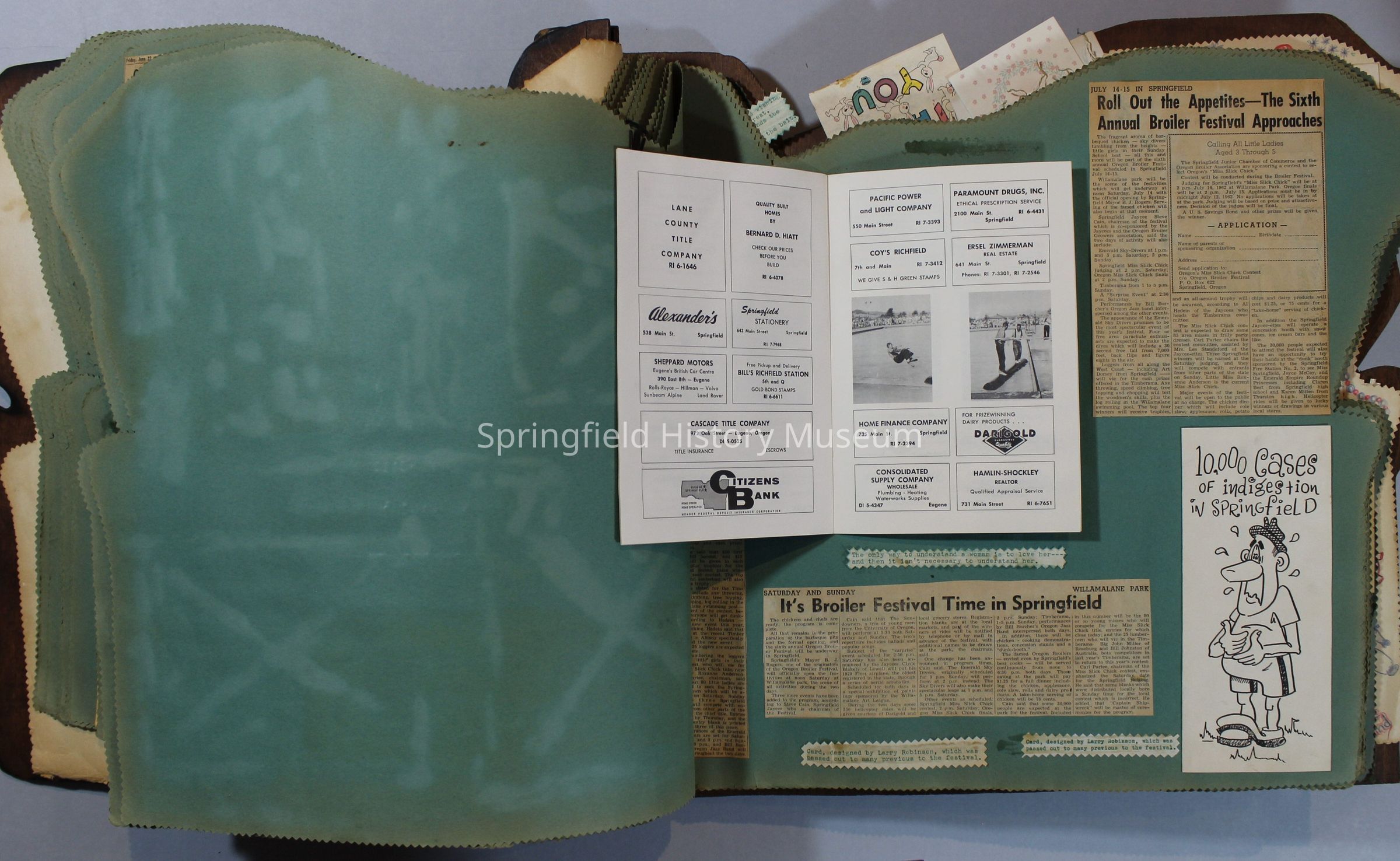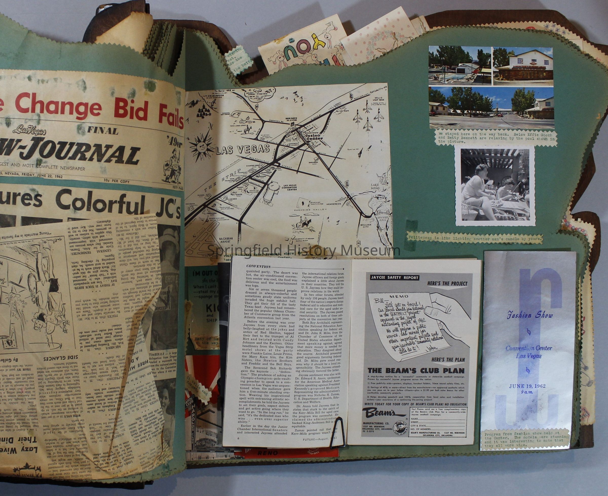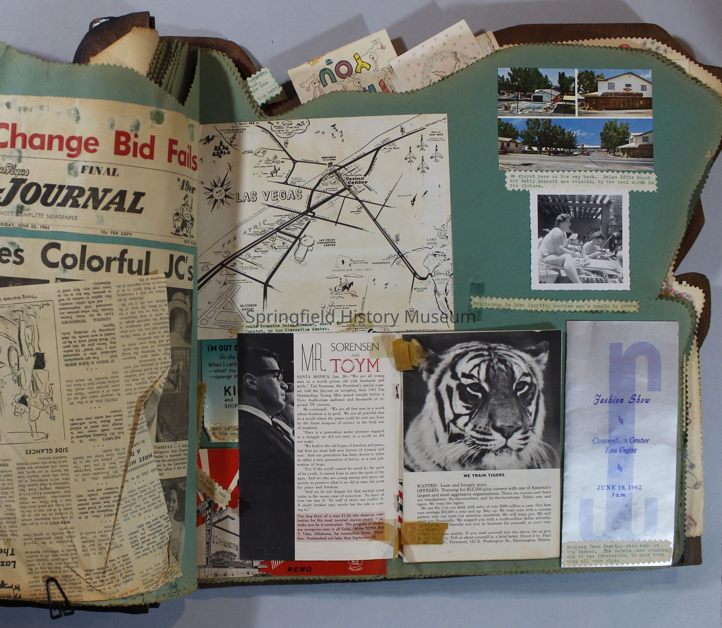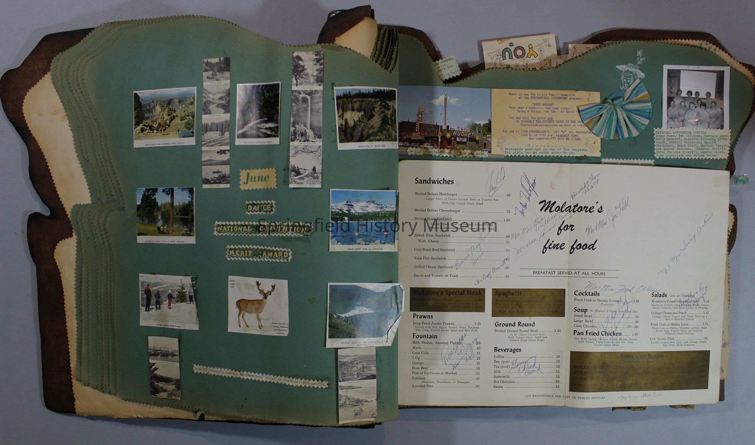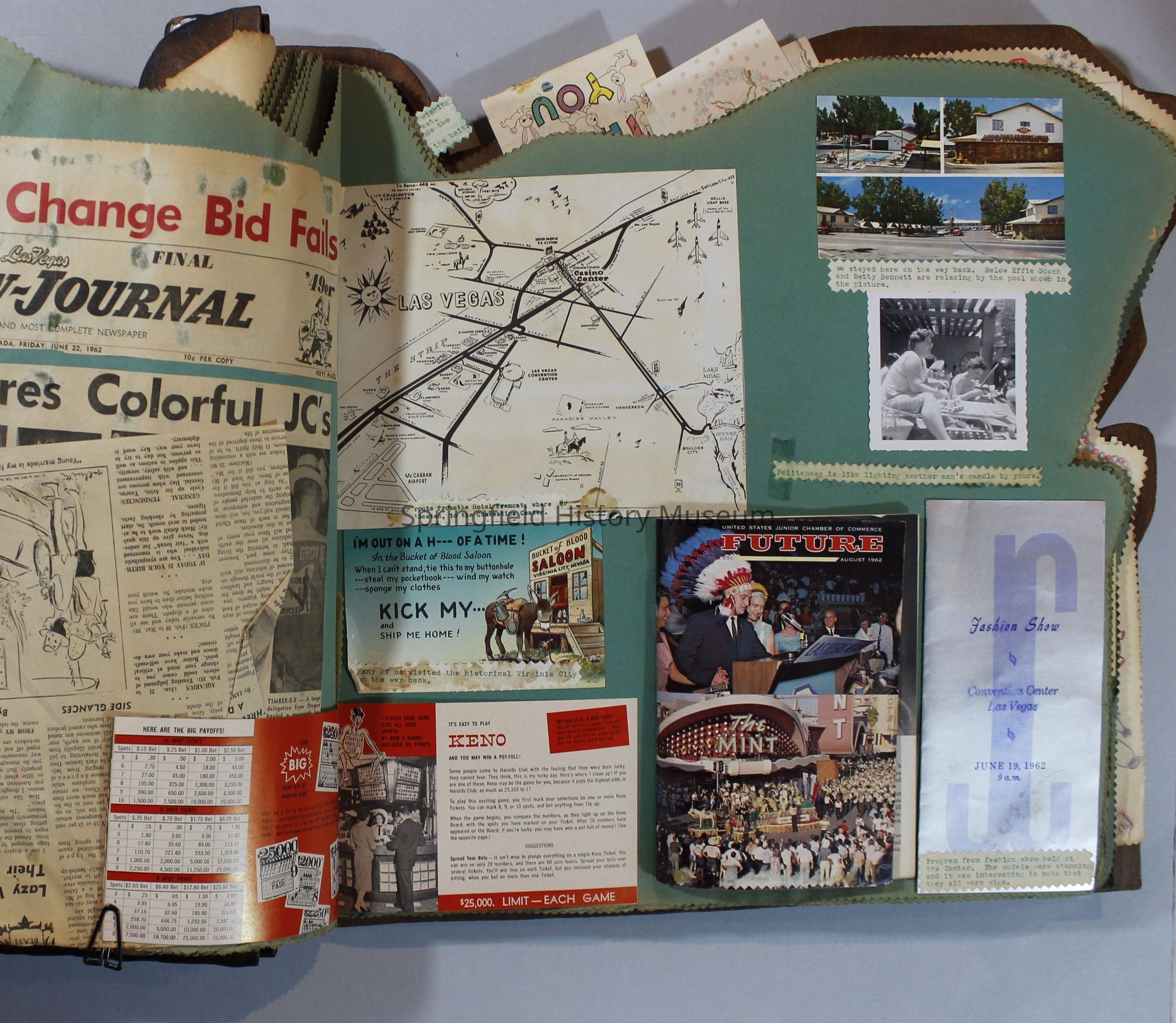 Scrapbook of Springfield, Oregon Jaycee-ettes, Joan Harman Possion, was President at the time of events.1962-1963, scrapbook cover is of wood with brass color hinges. The scrapbook contains newspaper articles, photo's, and cards.