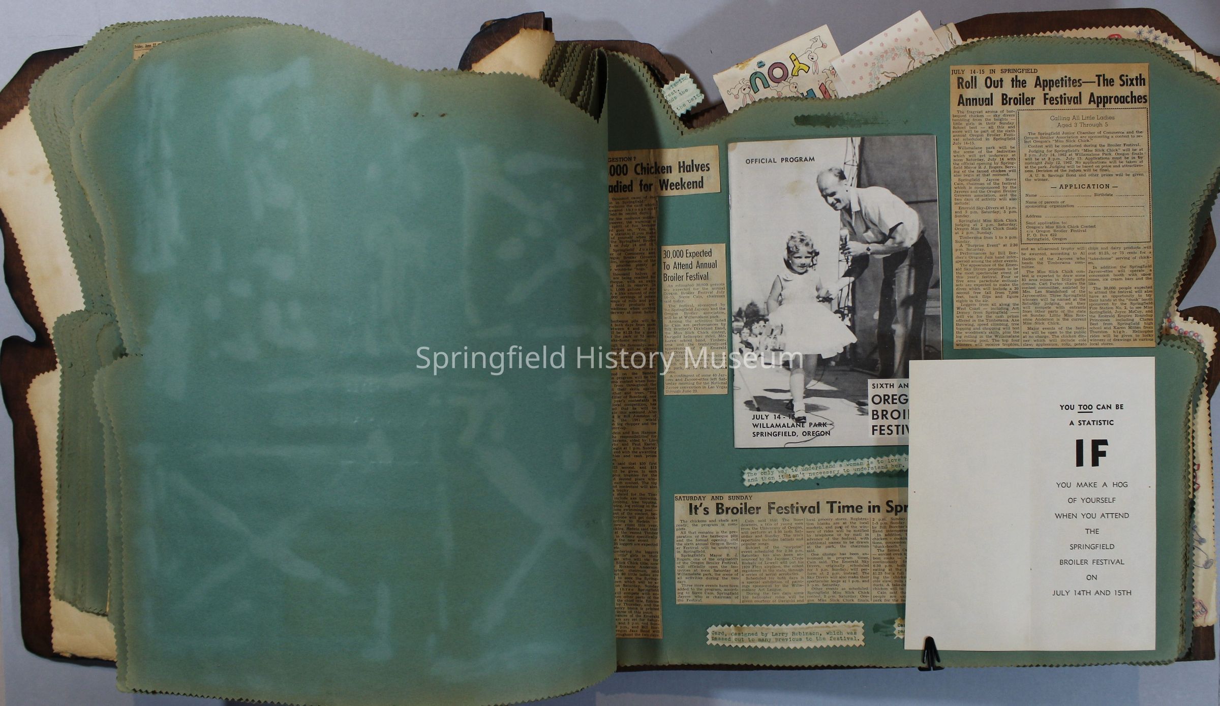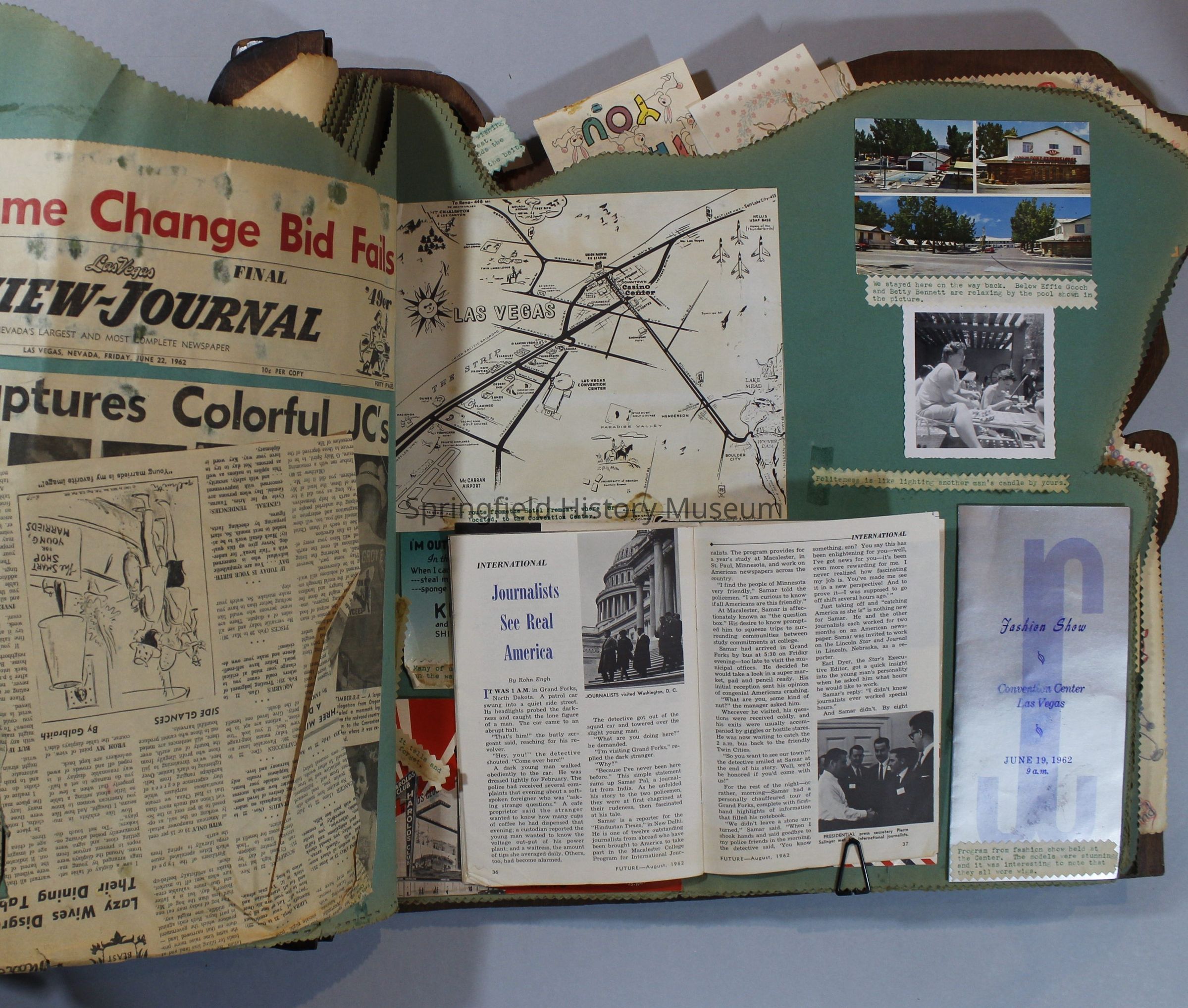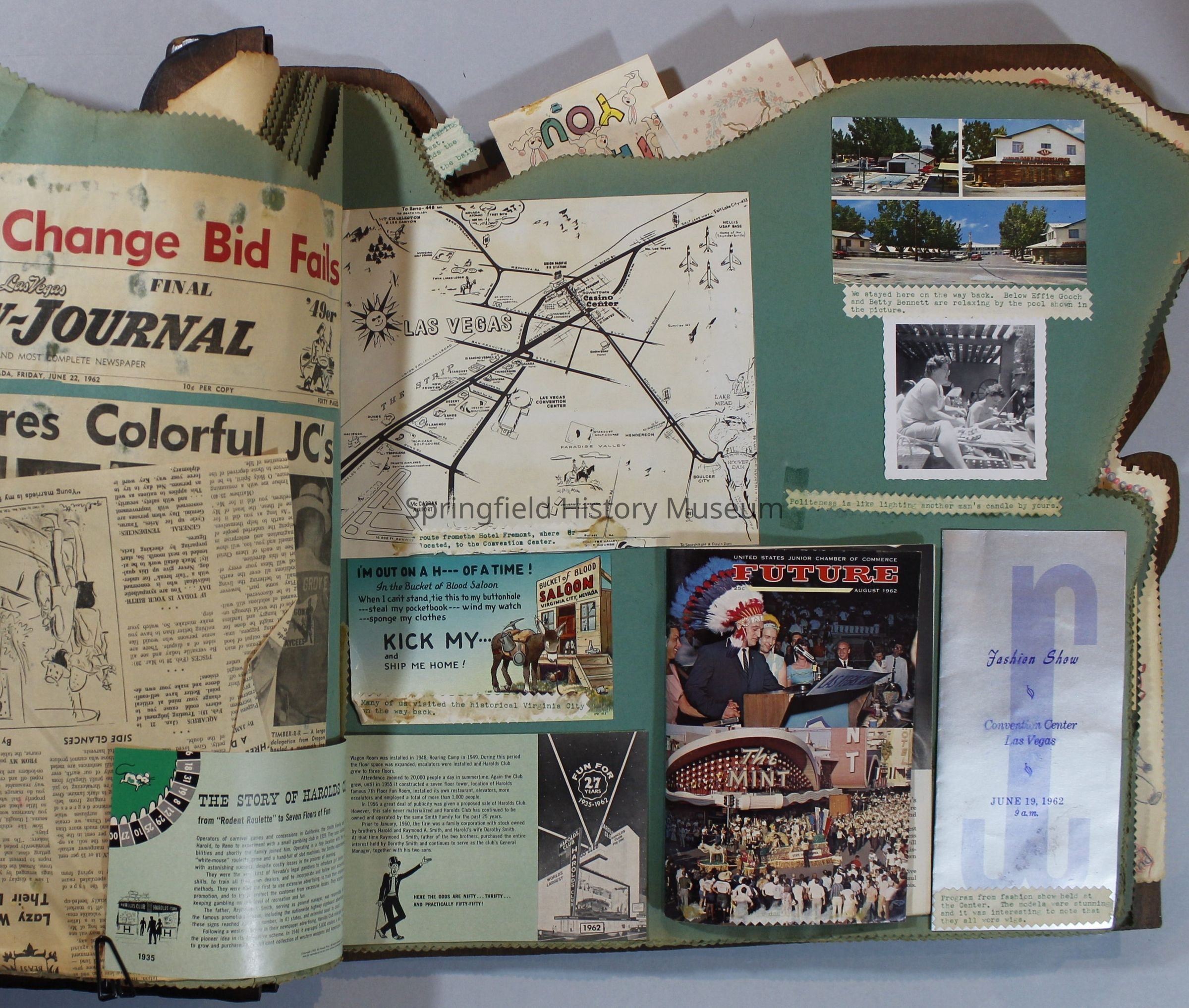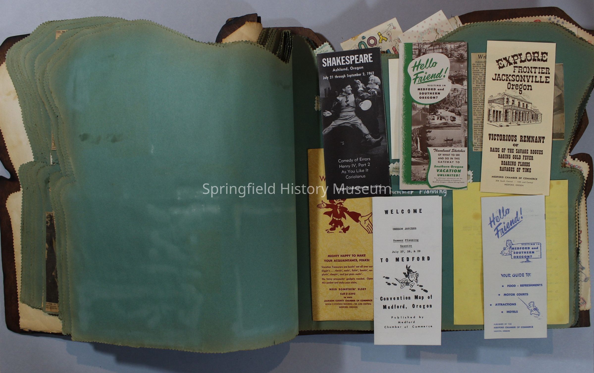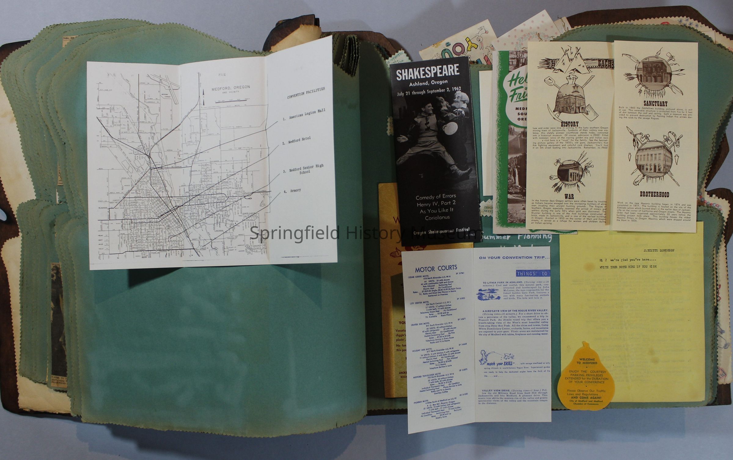 Scrapbook of Springfield, Oregon Jaycee-ettes, Joan Harman Possion, was President at the time of events.1962-1963, scrapbook cover is of wood with brass color hinges. The scrapbook contains newspaper articles, photo's, and cards.