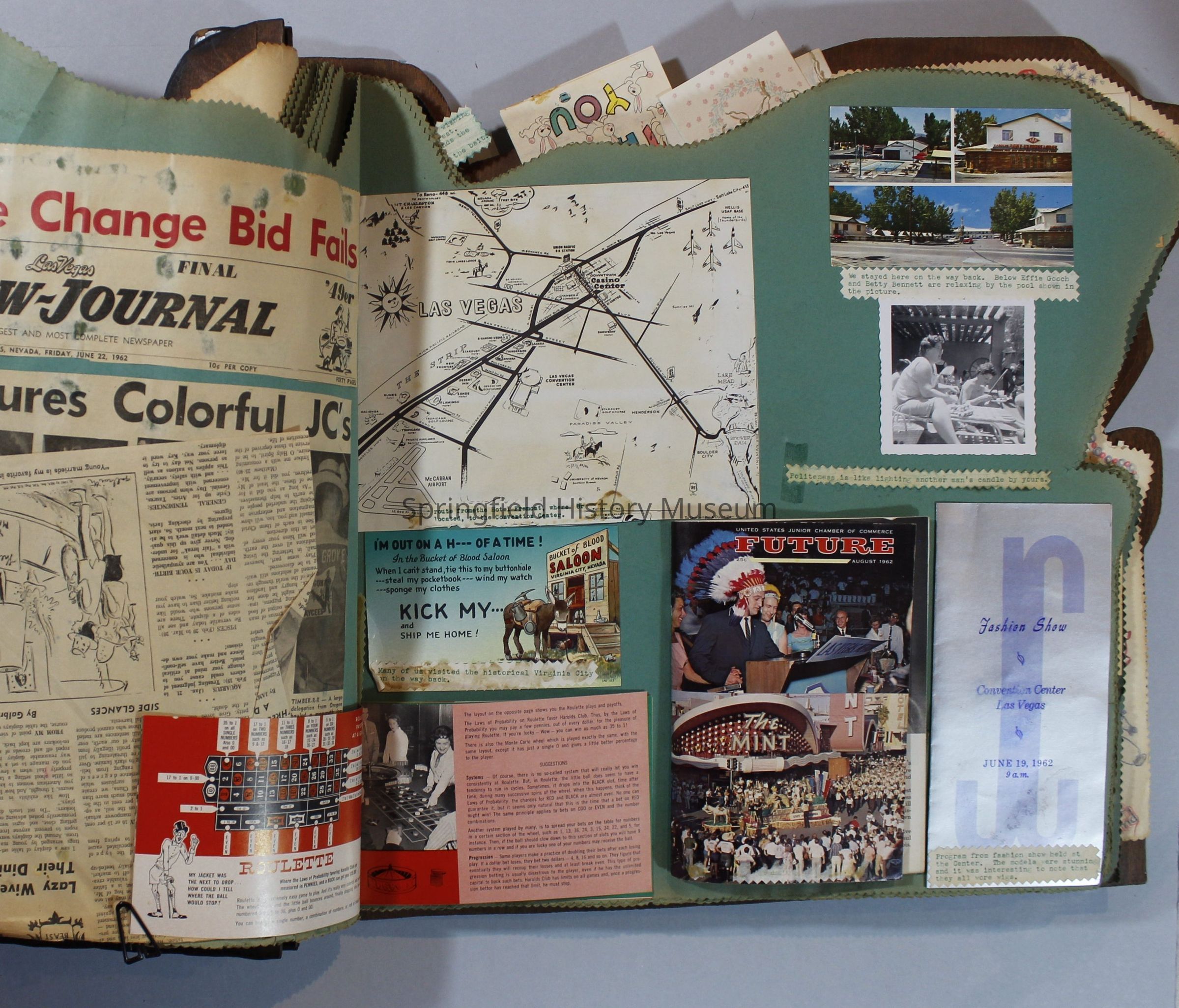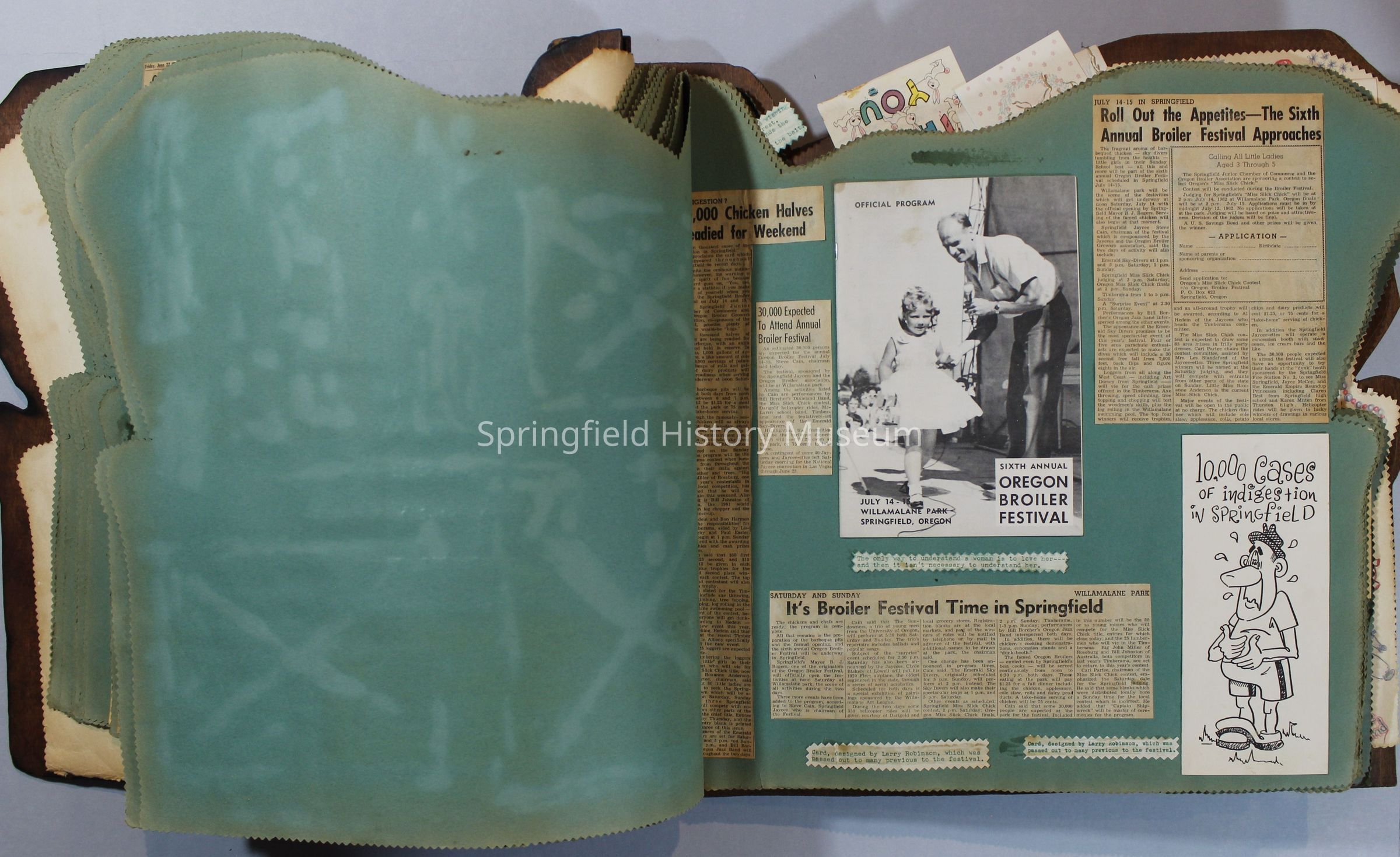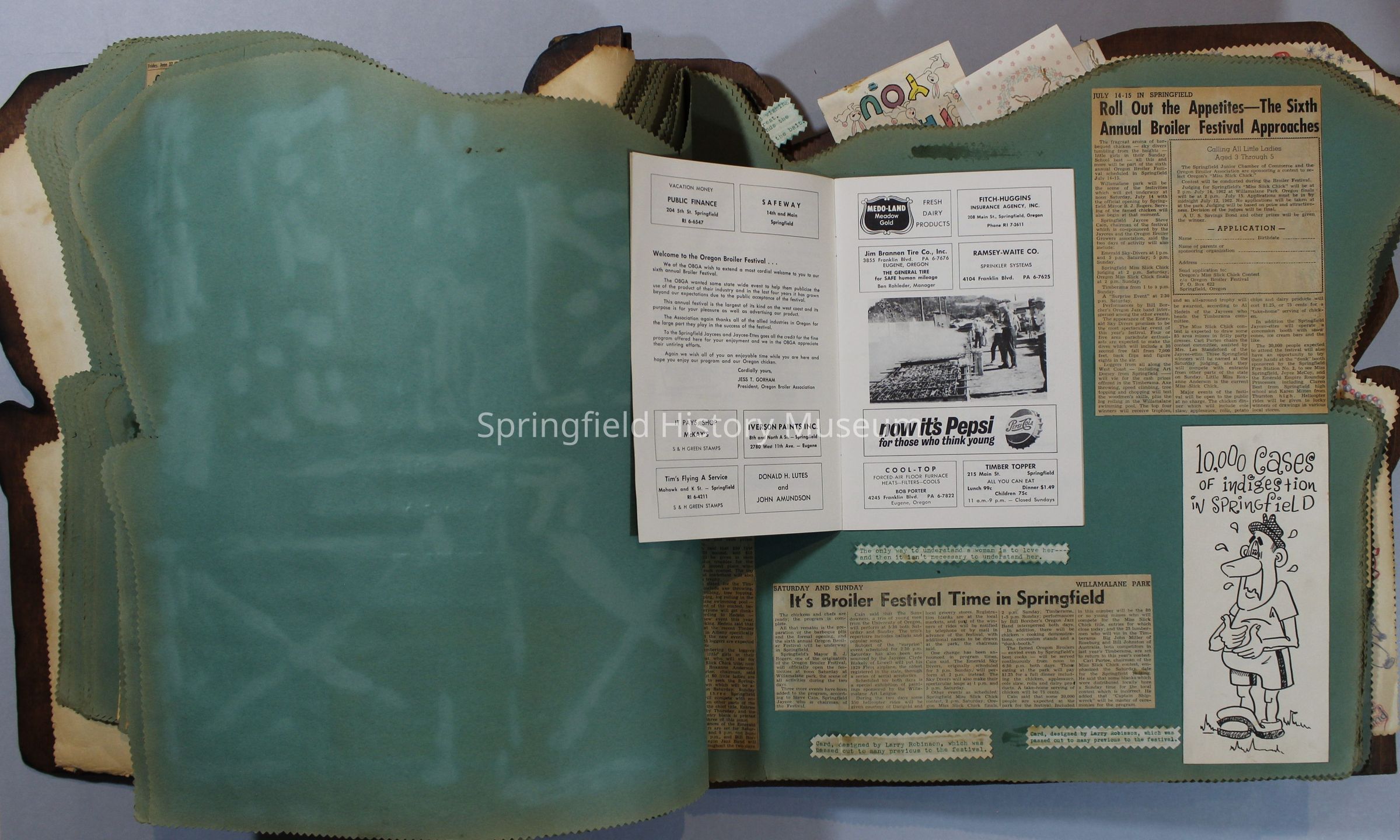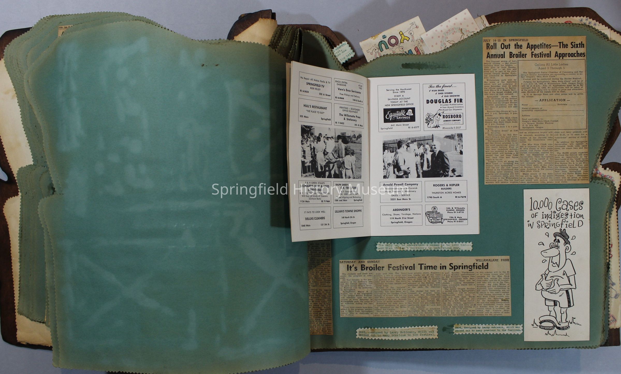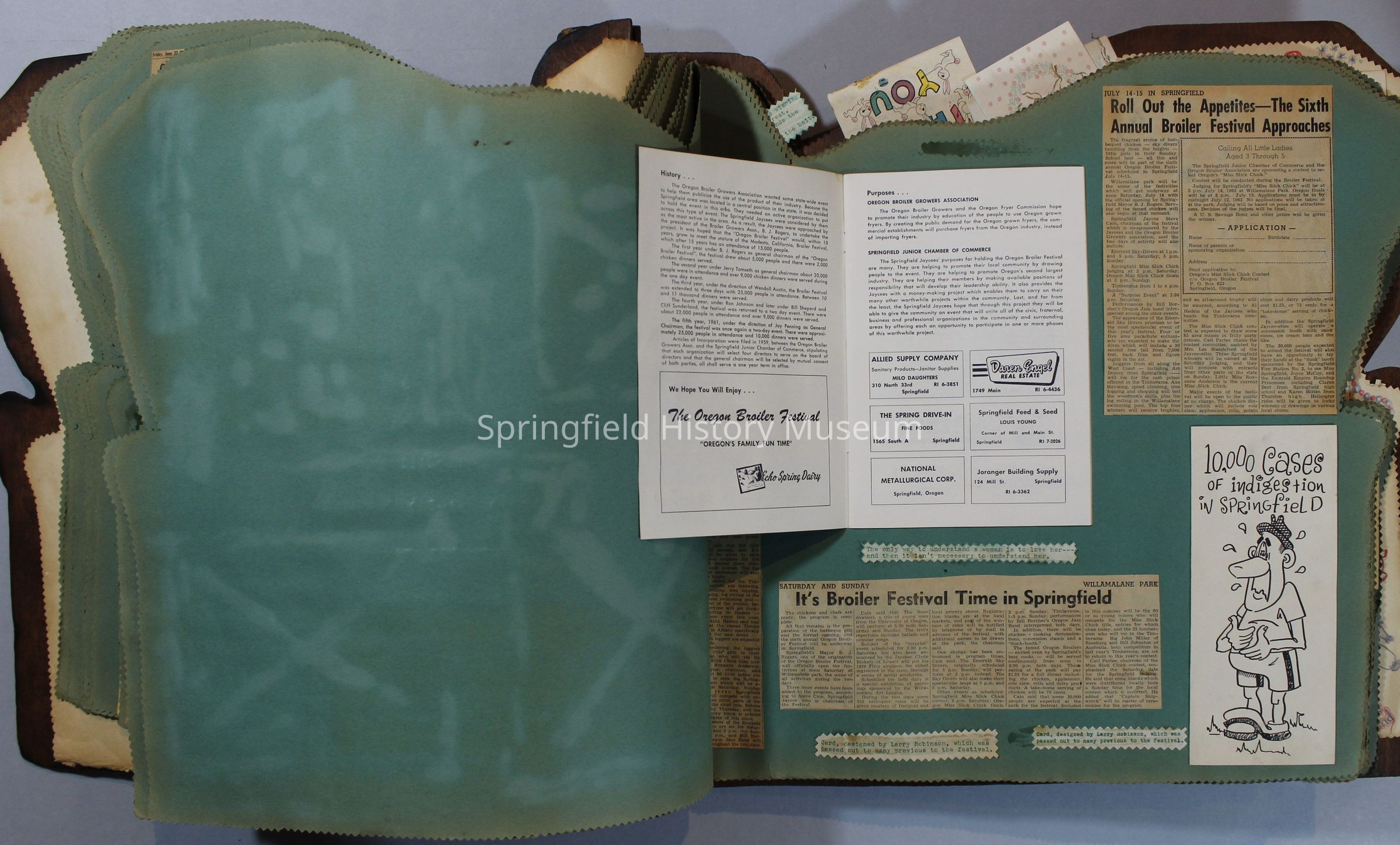 Scrapbook of Springfield, Oregon Jaycee-ettes, Joan Harman Possion, was President at the time of events.1962-1963, scrapbook cover is of wood with brass color hinges. The scrapbook contains newspaper articles, photo's, and cards.