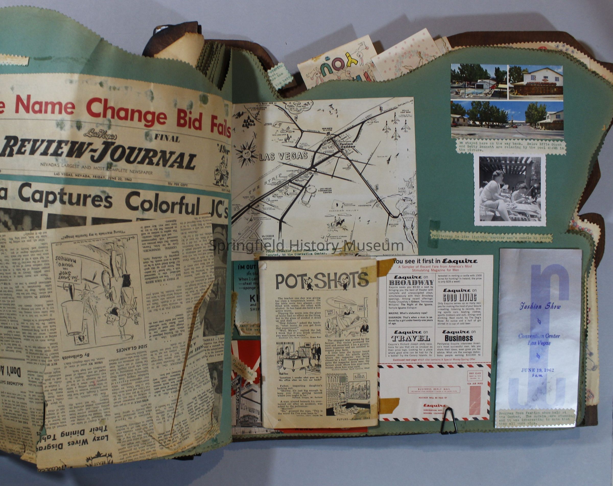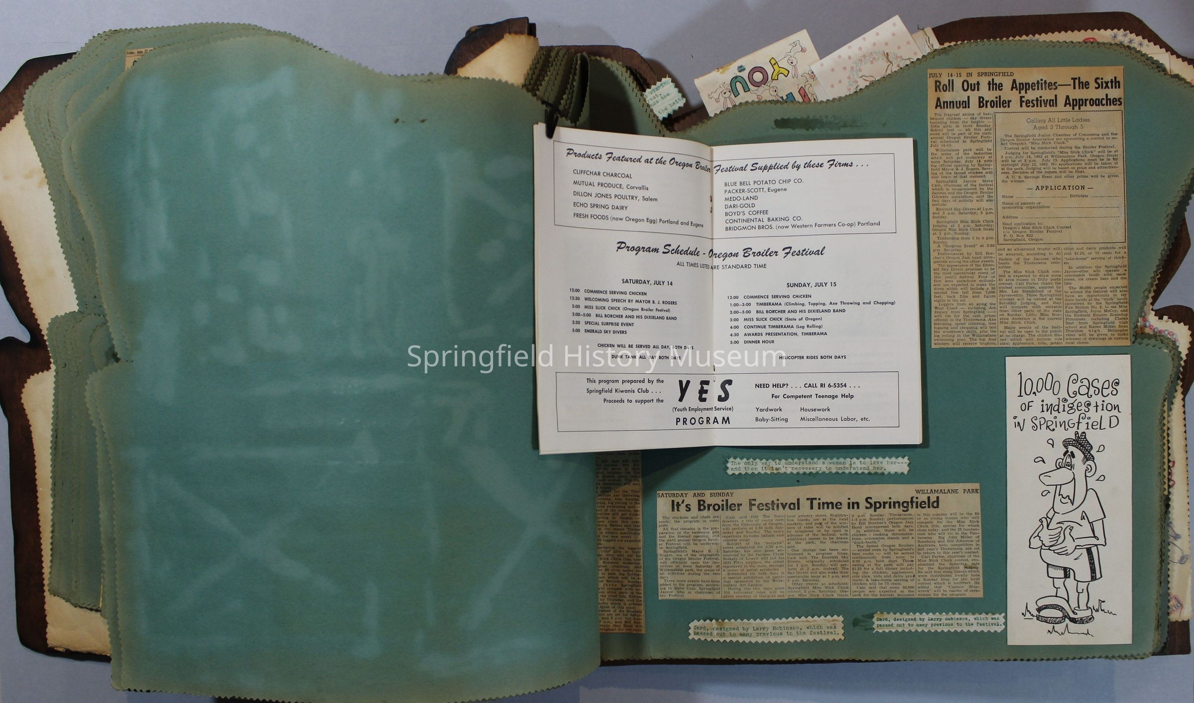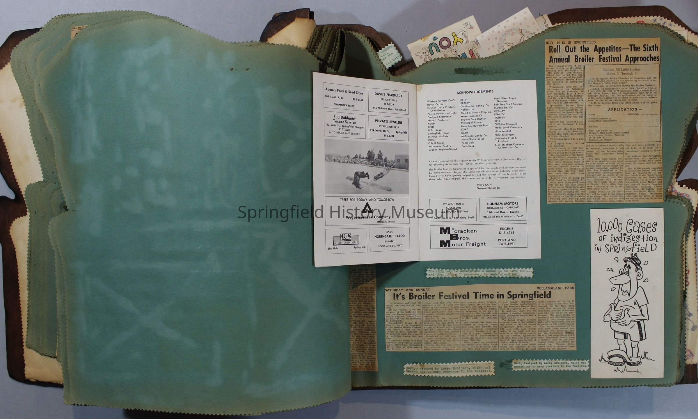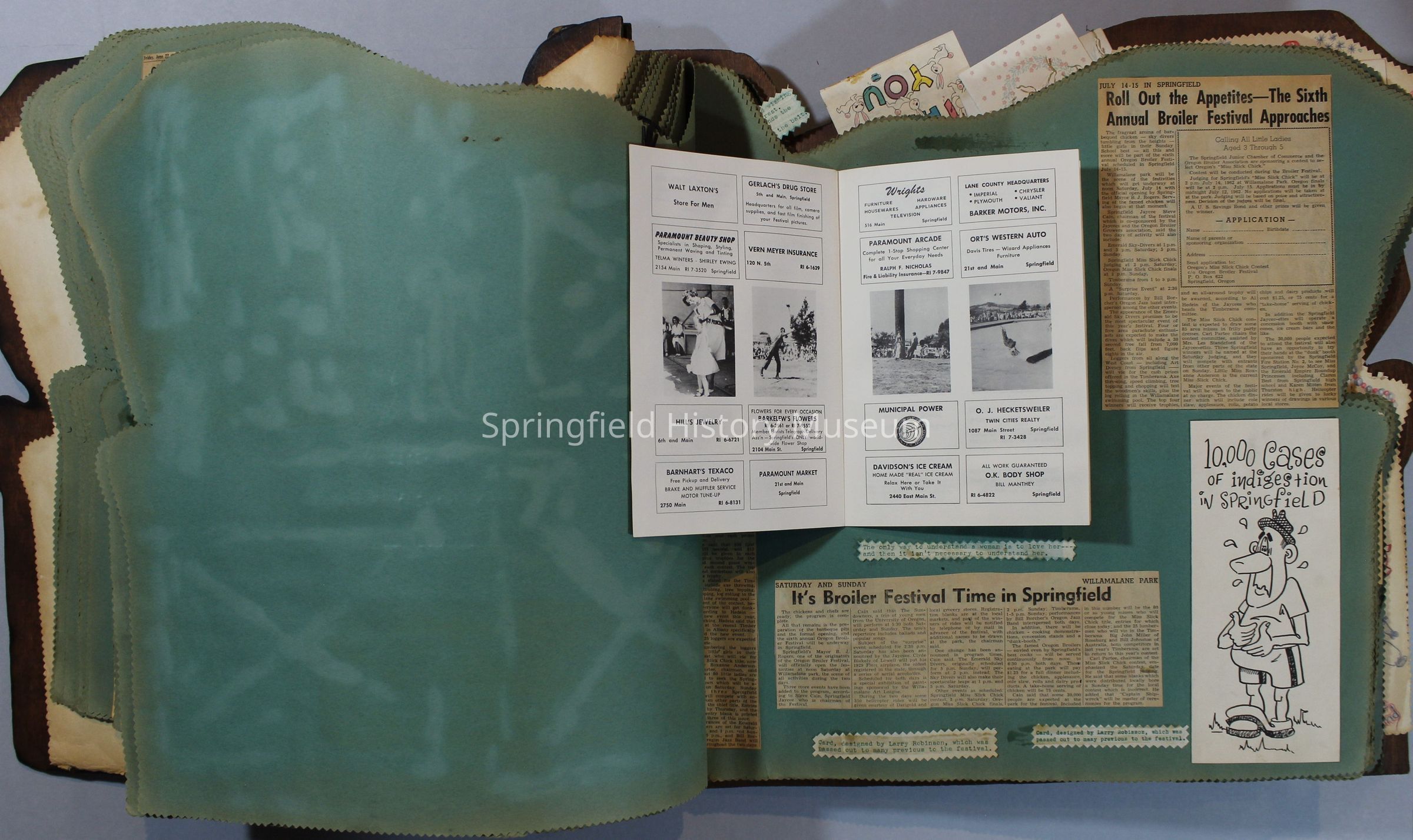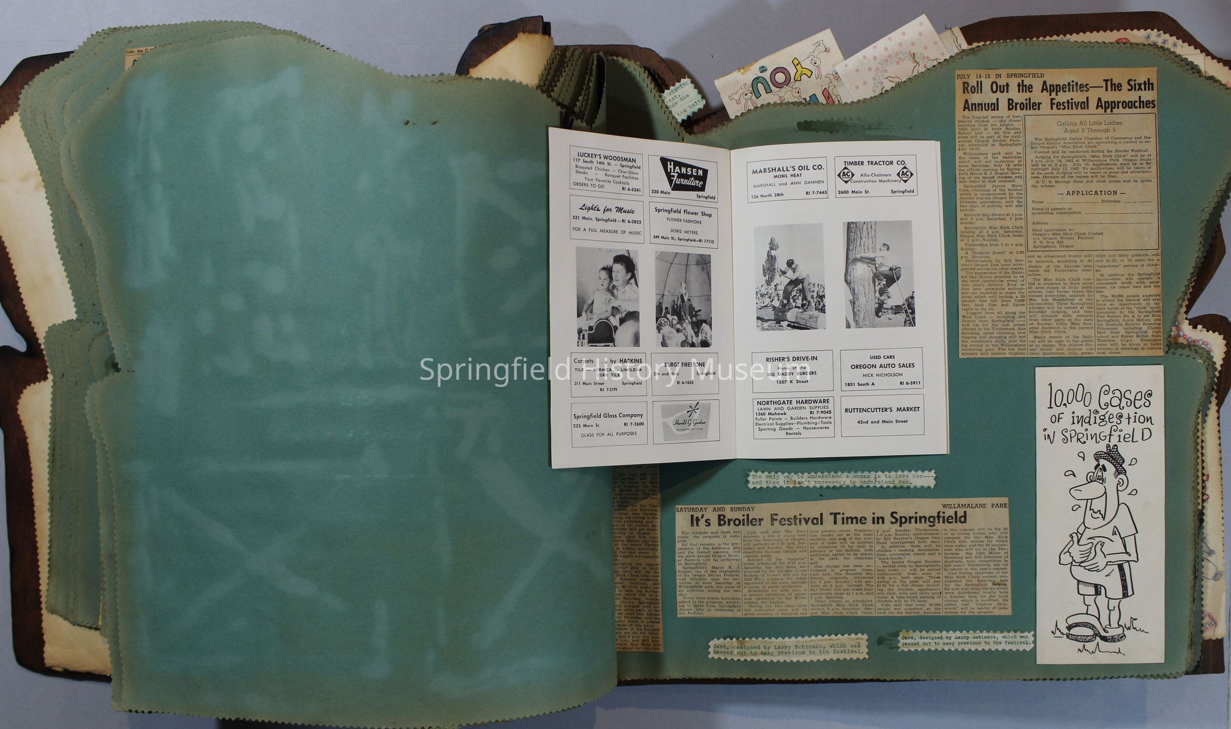 Scrapbook of Springfield, Oregon Jaycee-ettes, Joan Harman Possion, was President at the time of events.1962-1963, scrapbook cover is of wood with brass color hinges. The scrapbook contains newspaper articles, photo's, and cards.