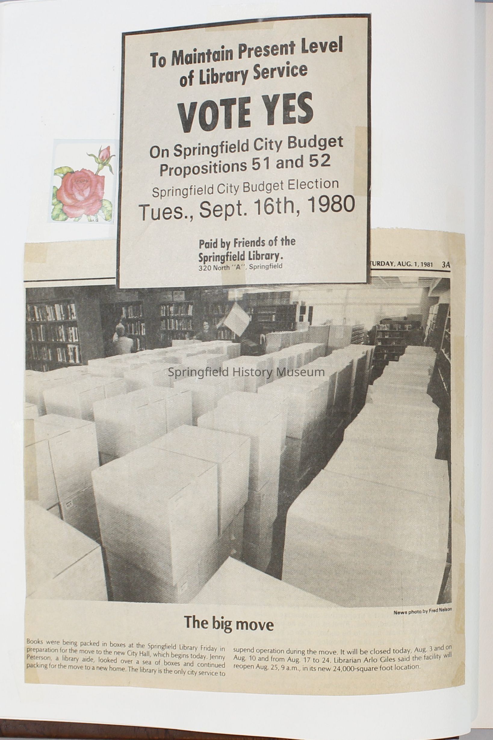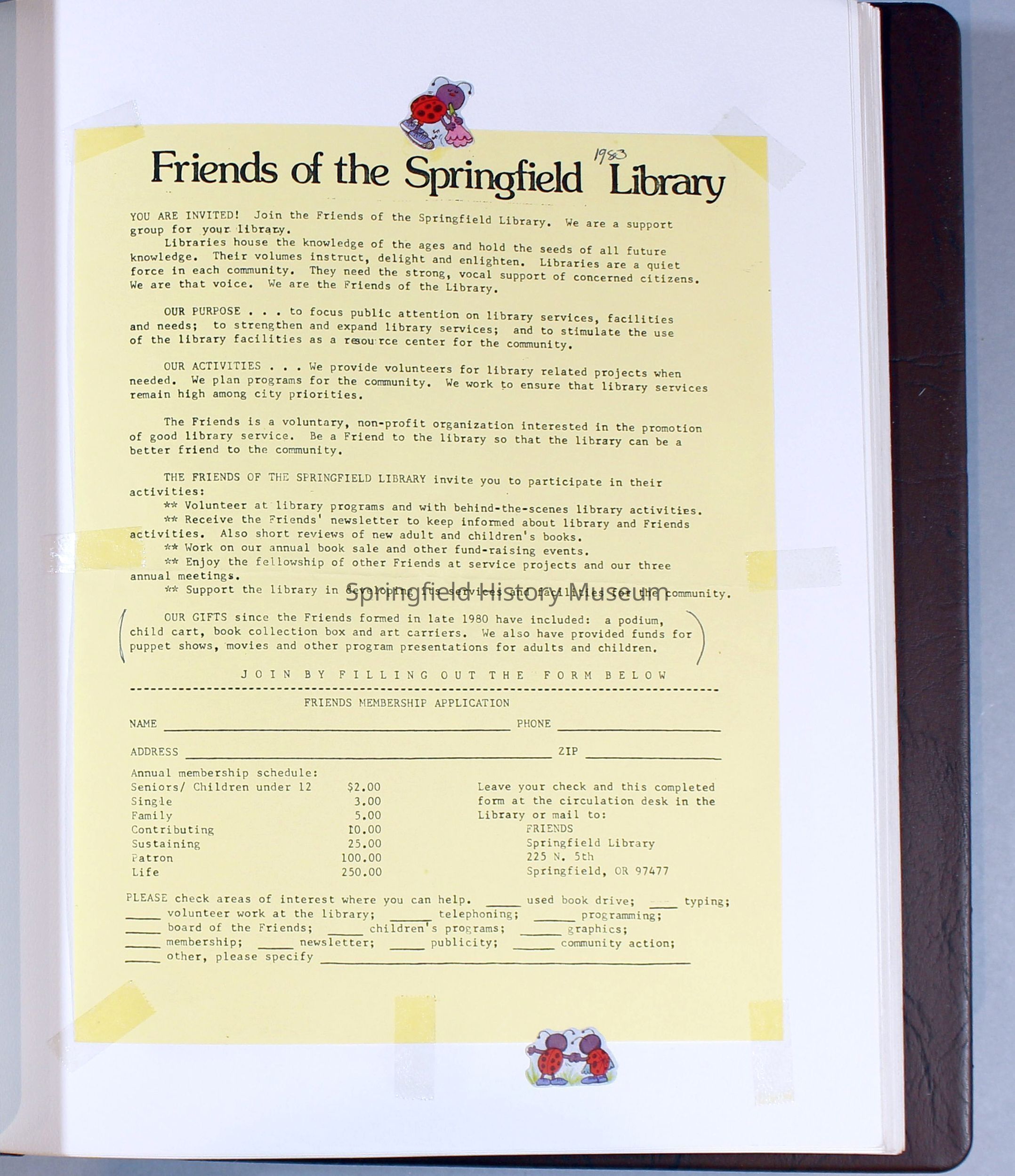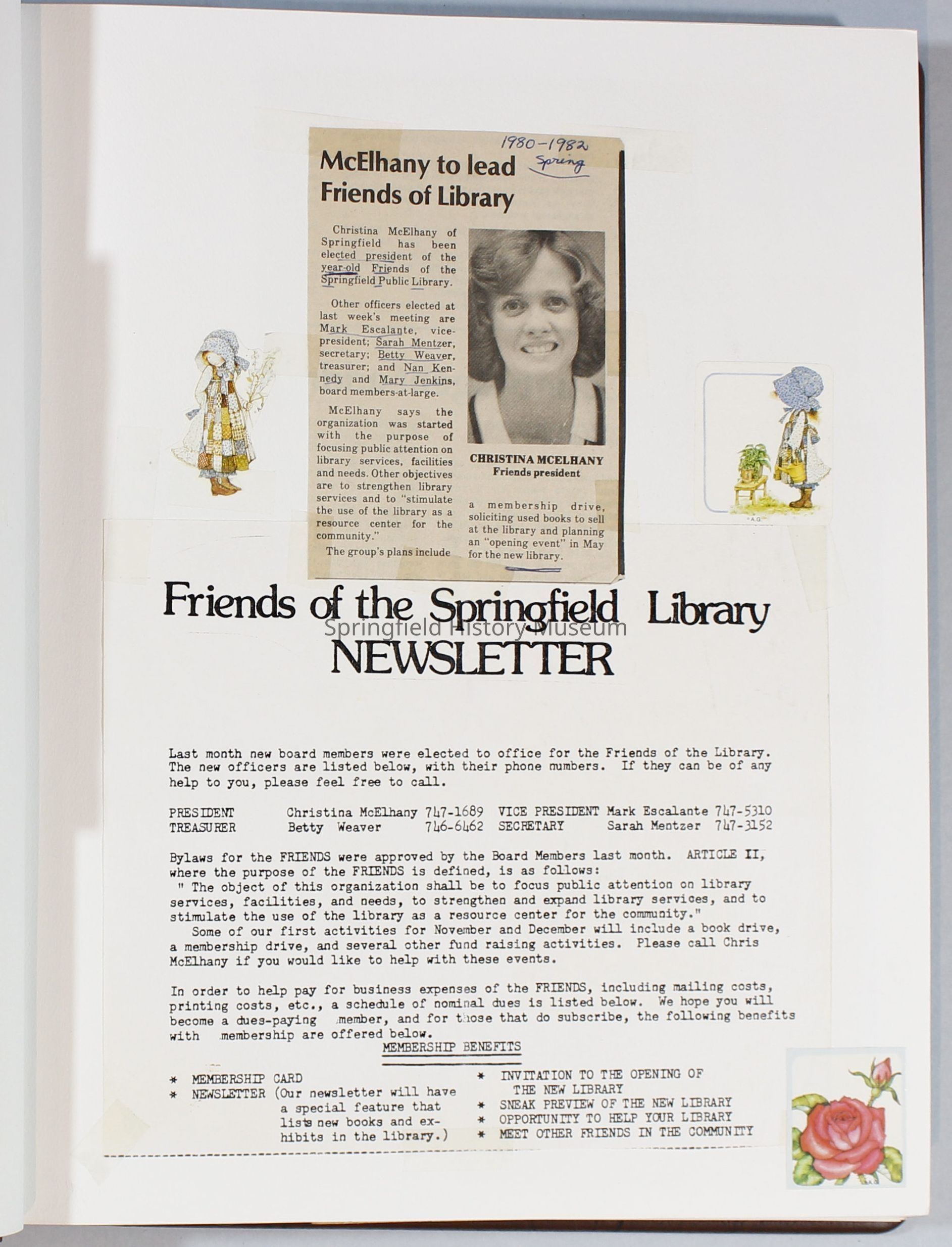 1980-1981 Friends of Springfield Public Library scrapbook album. Donated along with 4 folders of Friends of the Springfield Public Library archives. Folders are titled "Friends 1981", Friends 1982", "Friends 1983", and "Friends 1984-85".Collection
