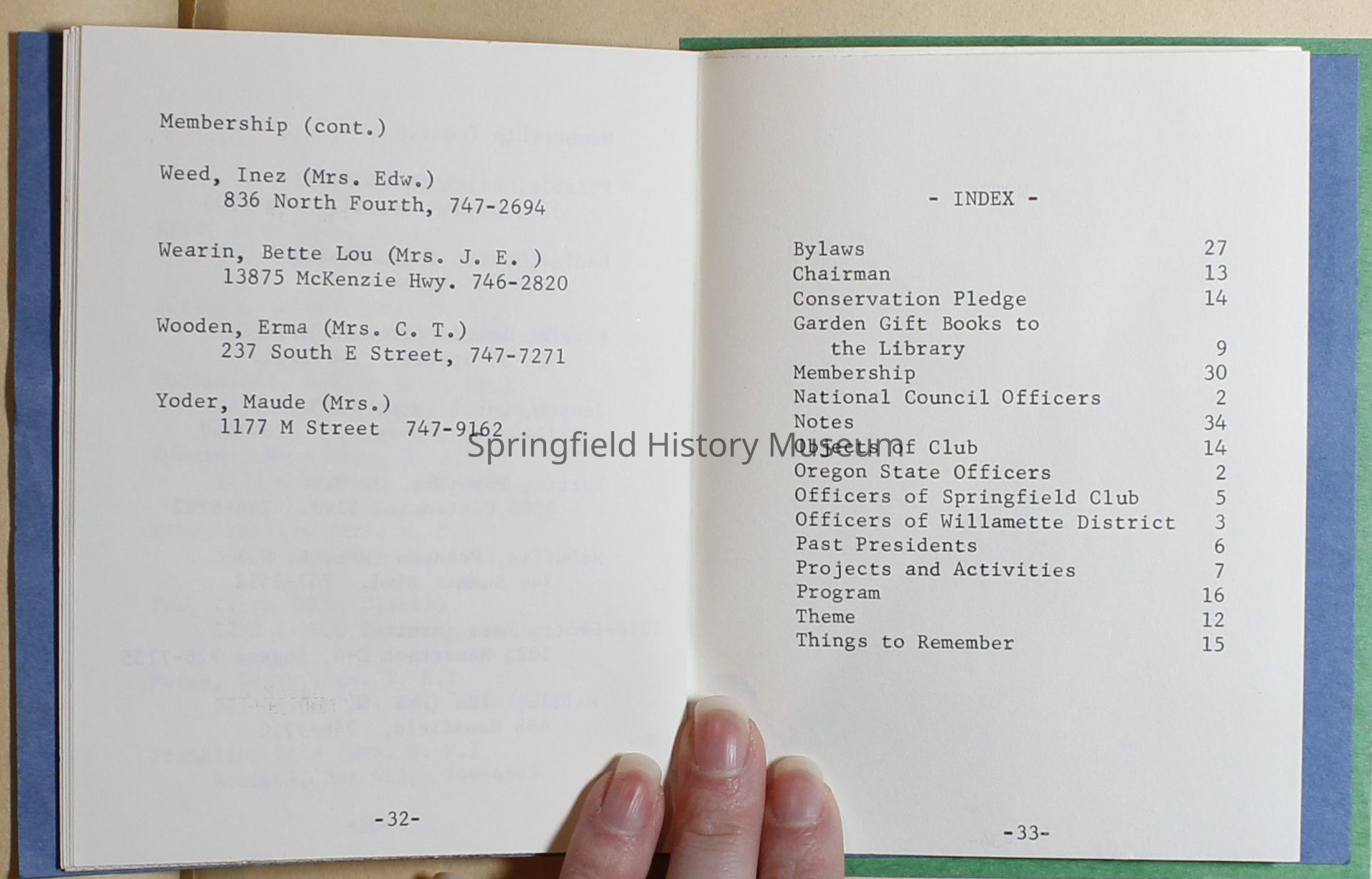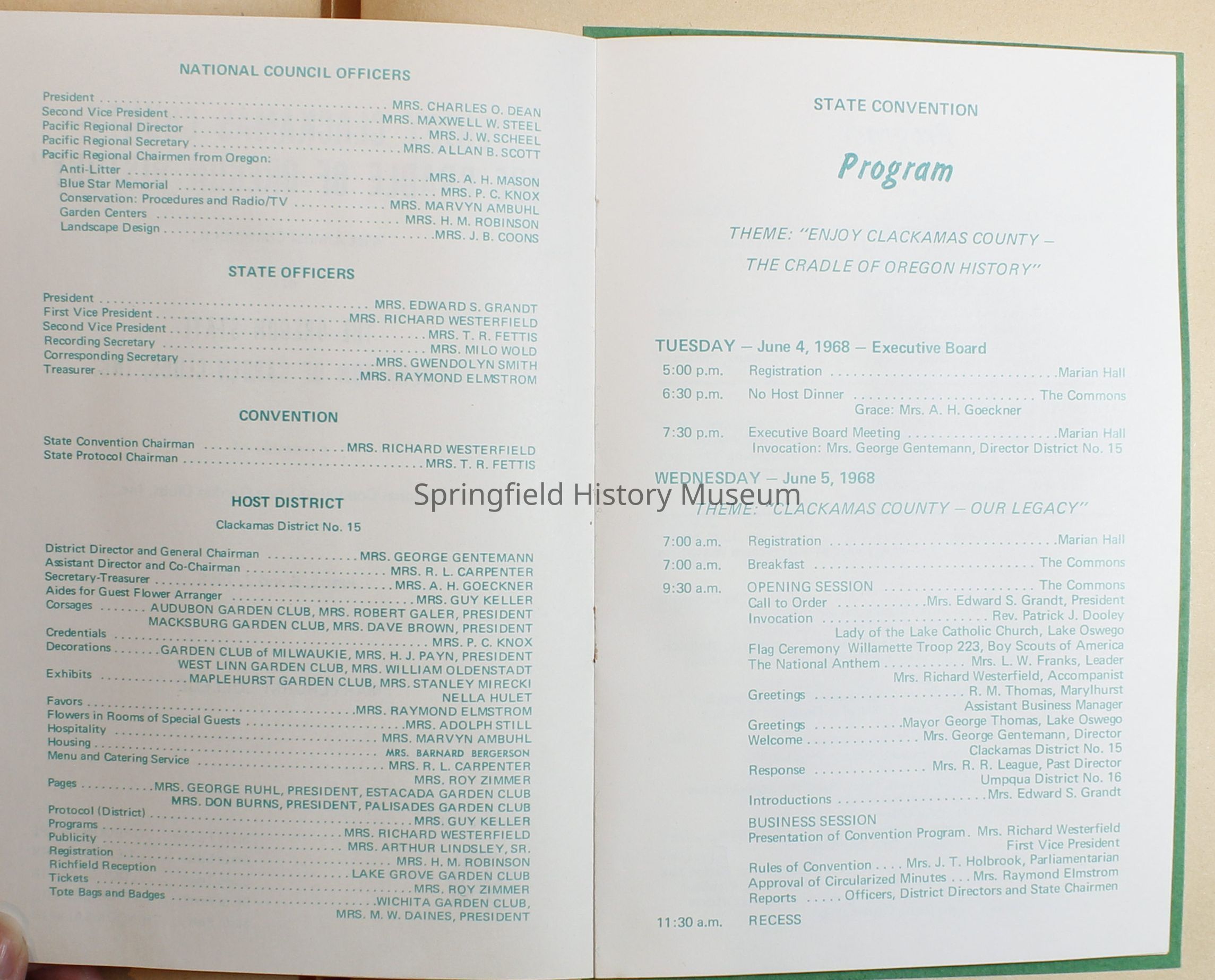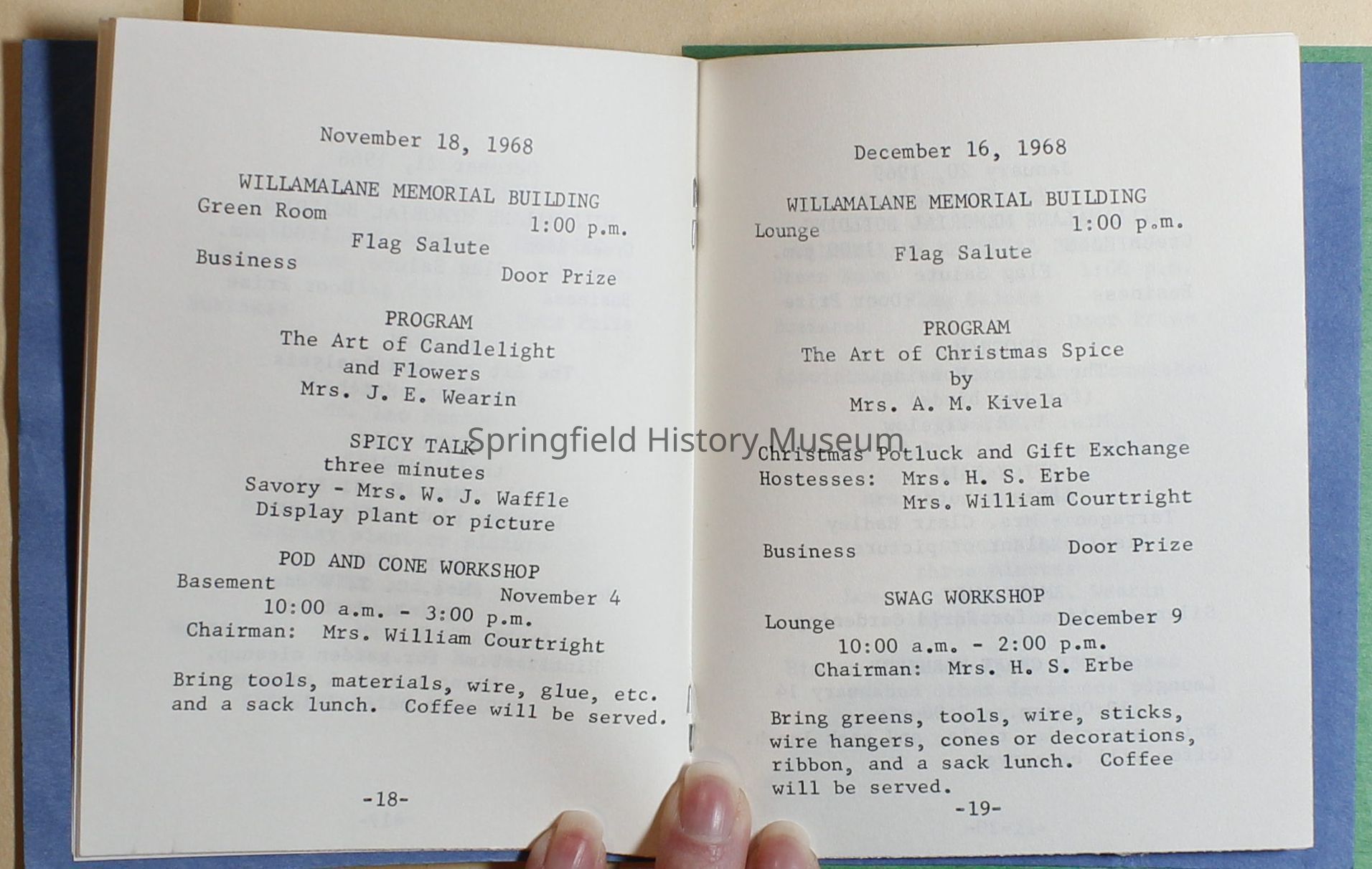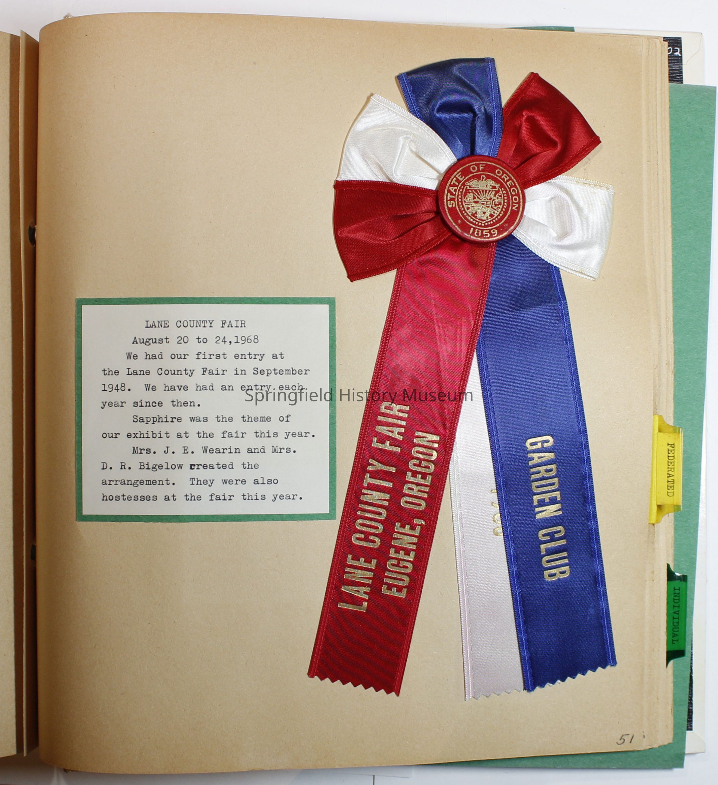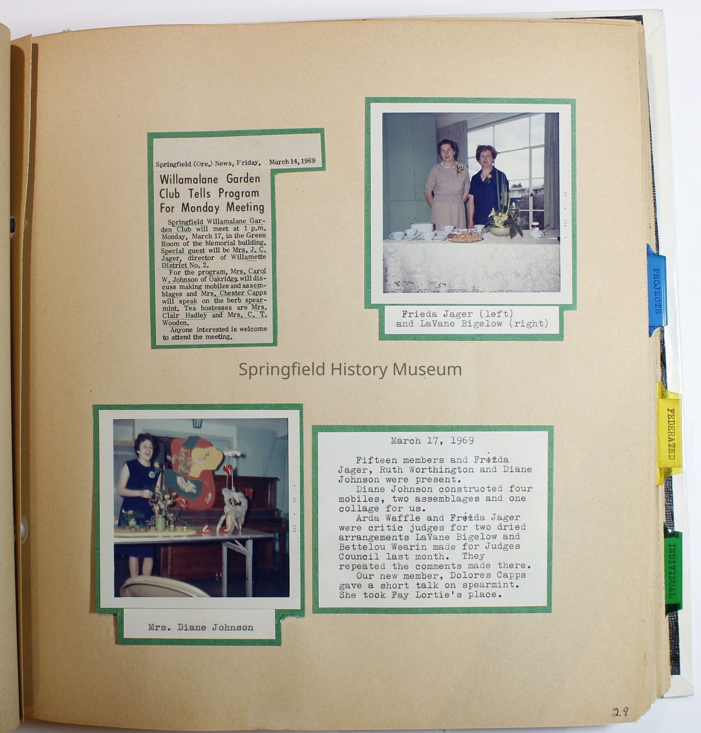 Springfield Willamalane Garden Club scrapbook 1968 to 1969. Book covers history of group; programs, ribbons, and some personal histories. Cover is white with gold designAcquisition