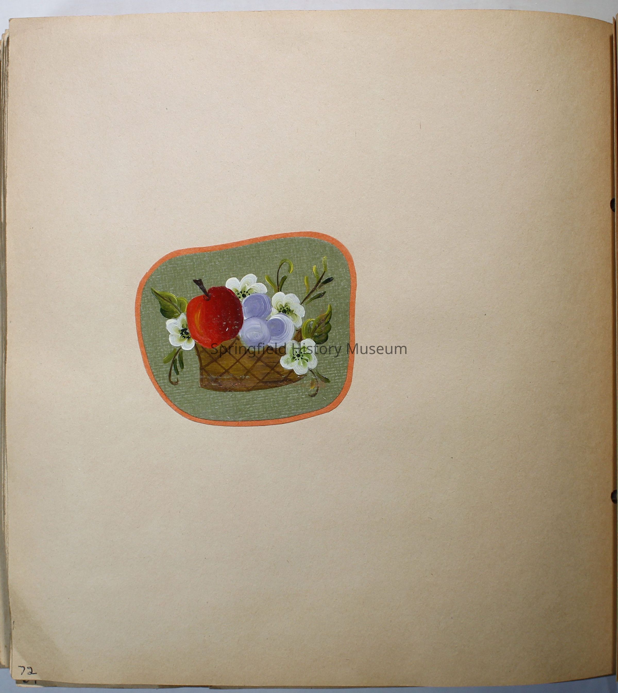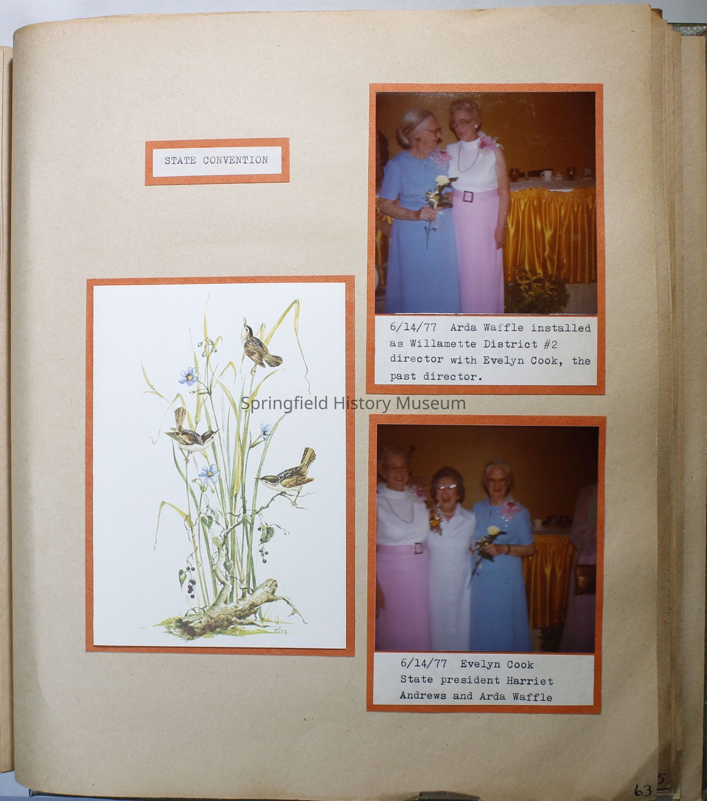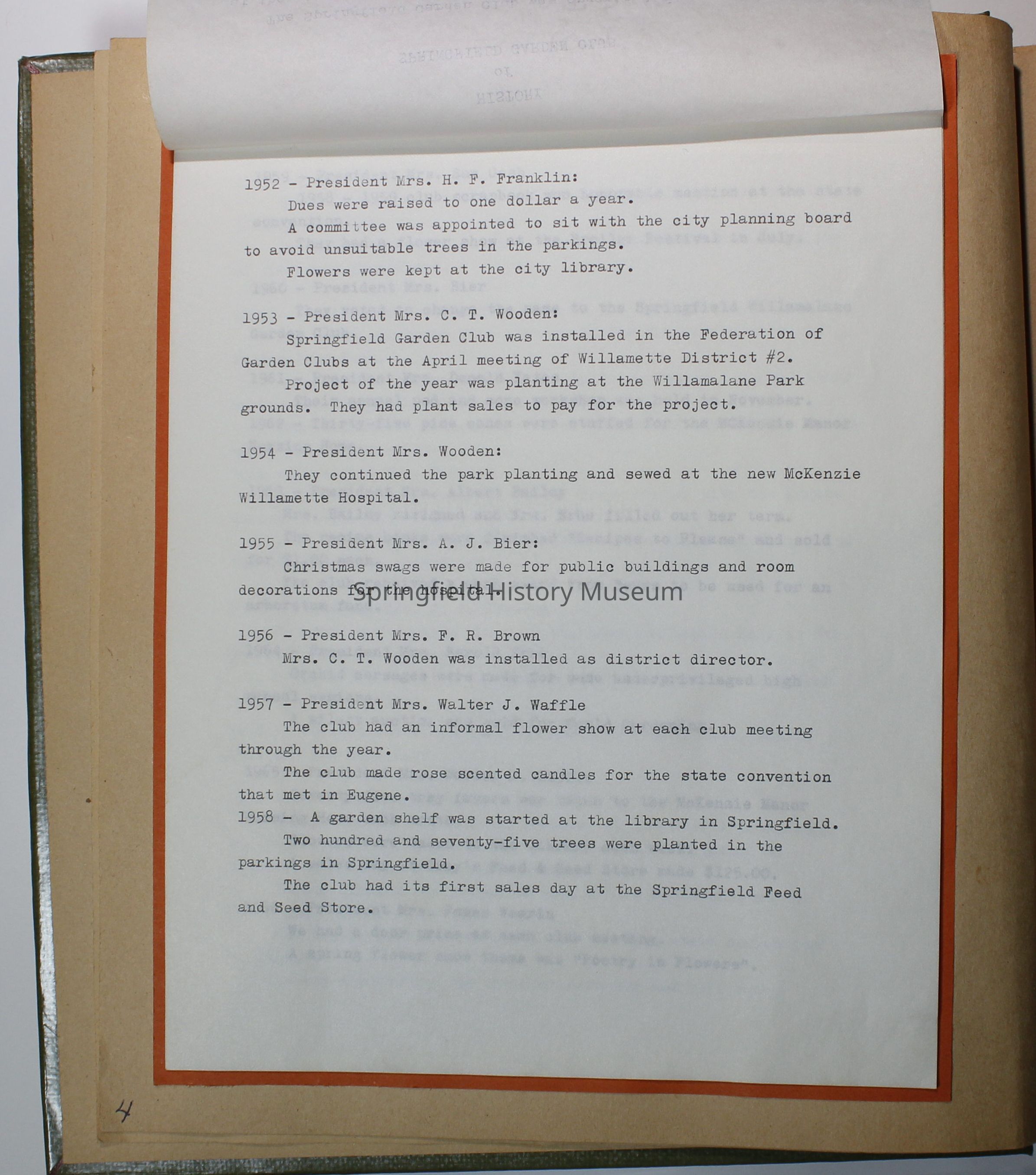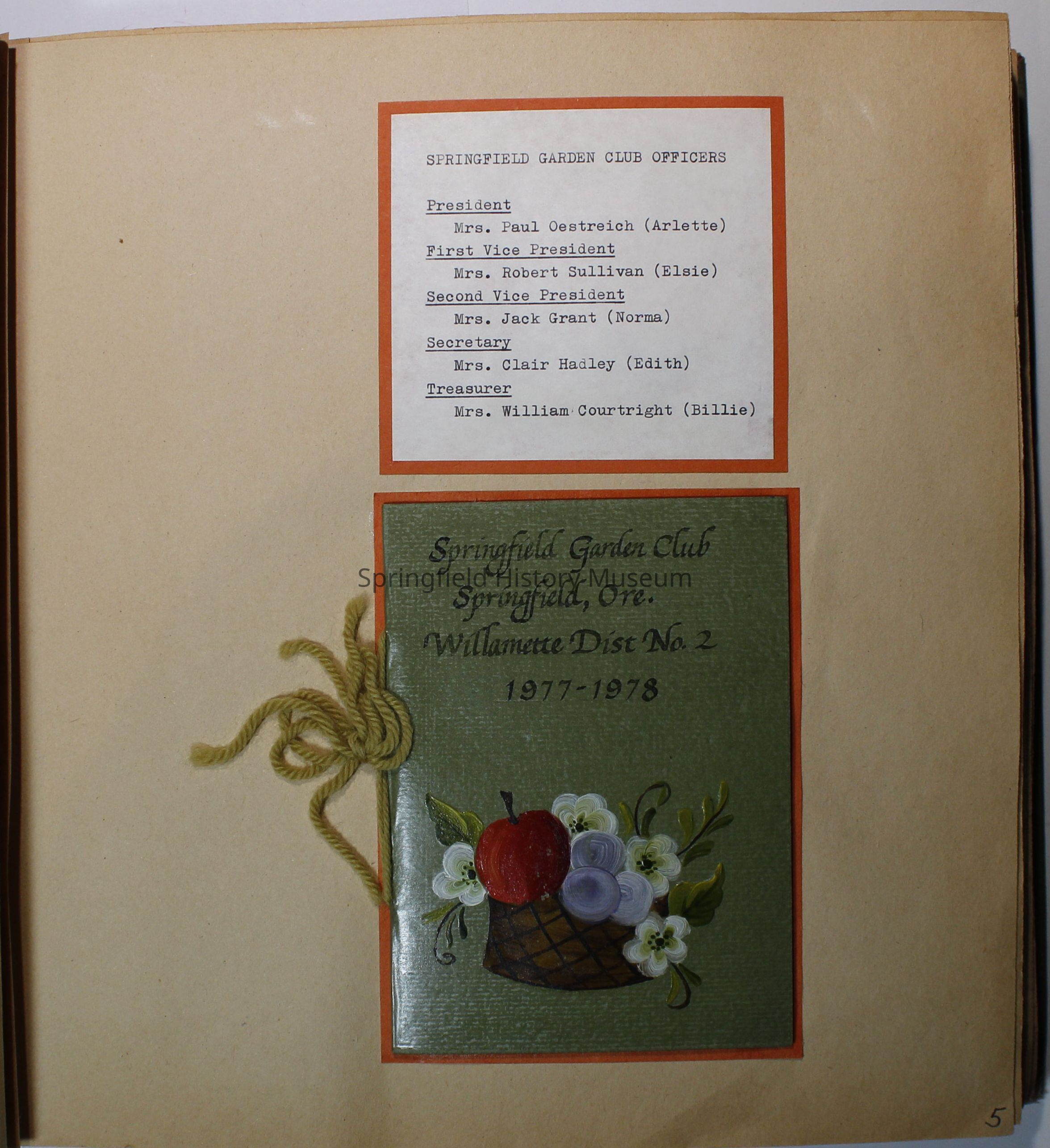 Garden Club scrapbook 1977-1978. Quite a few color photos of members. Basket of fruit painted on olive green front cover; 82 pages