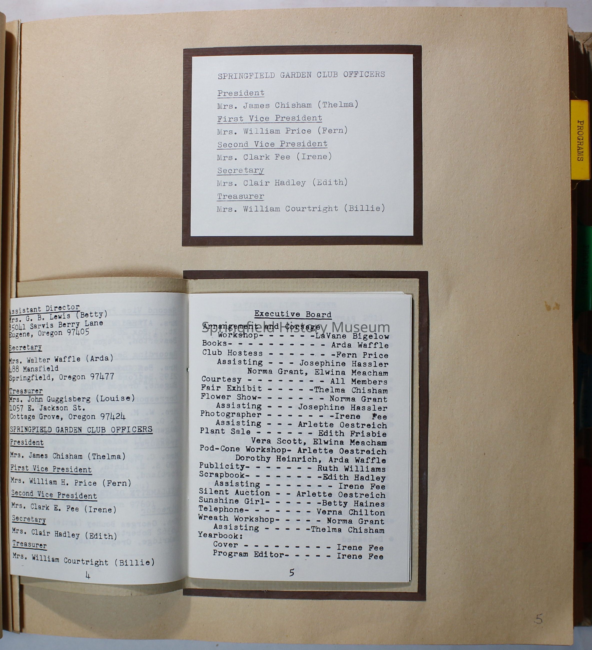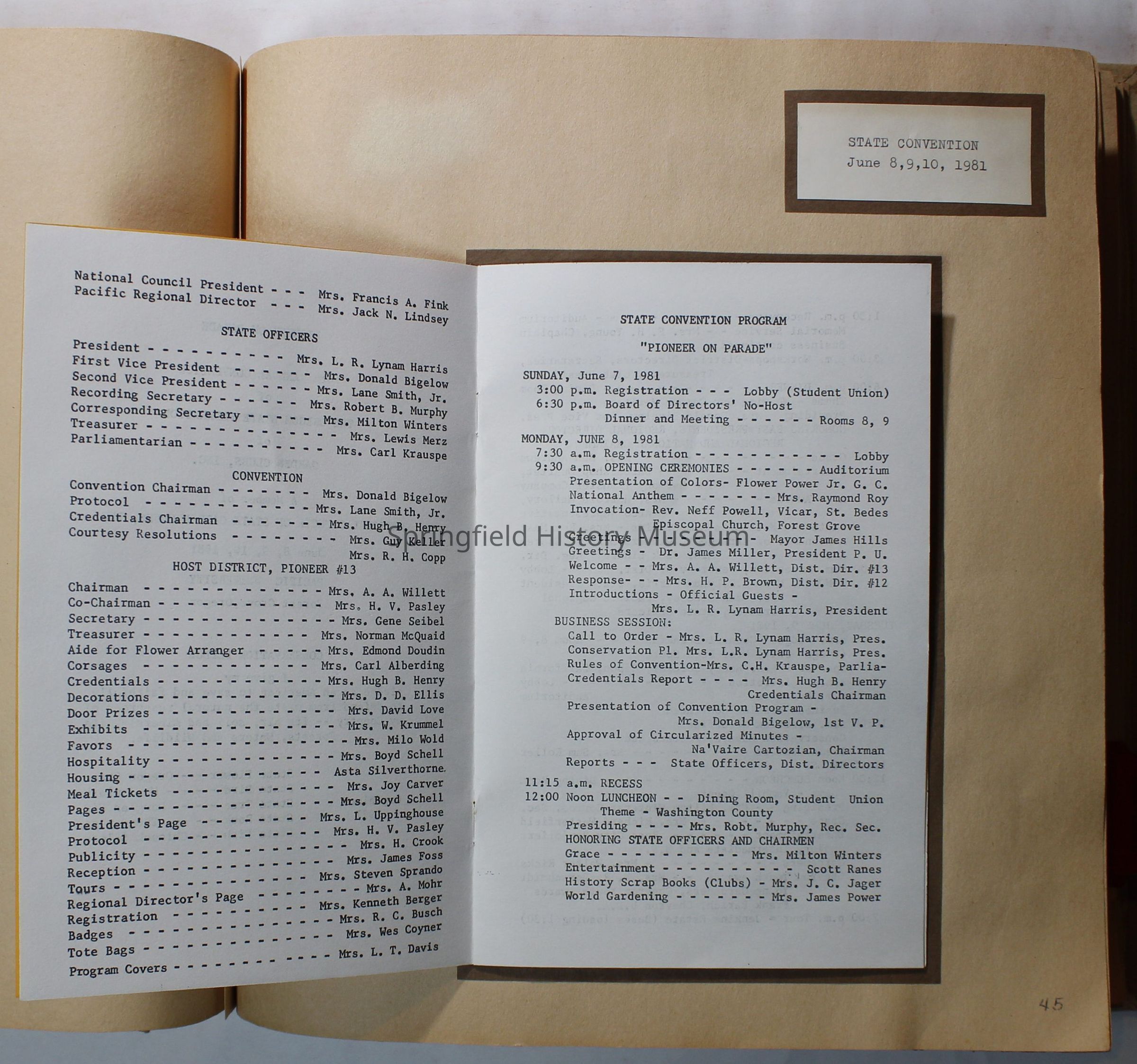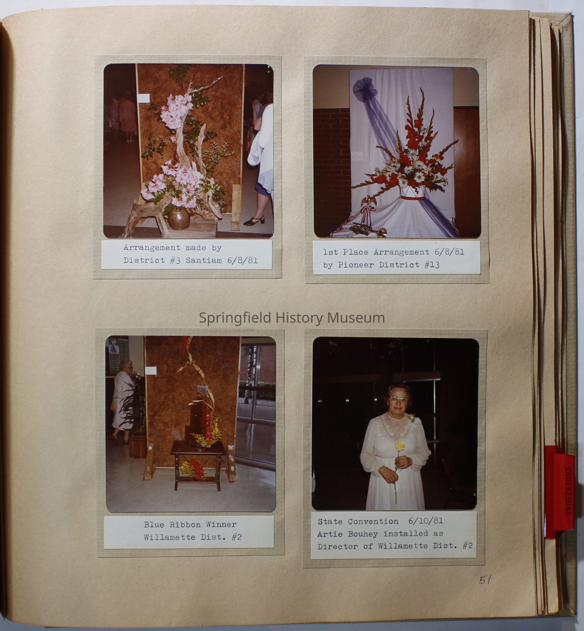 Garden Club Scrapbook 1981-1982. Contains photographs, lists, brochures, mementos and other information about club history, members, and activities (shows, plantings, gathering, 54th Annual Convention Oregon State Federation of Garden Clubs, Jenkins Estate etc.).Collection