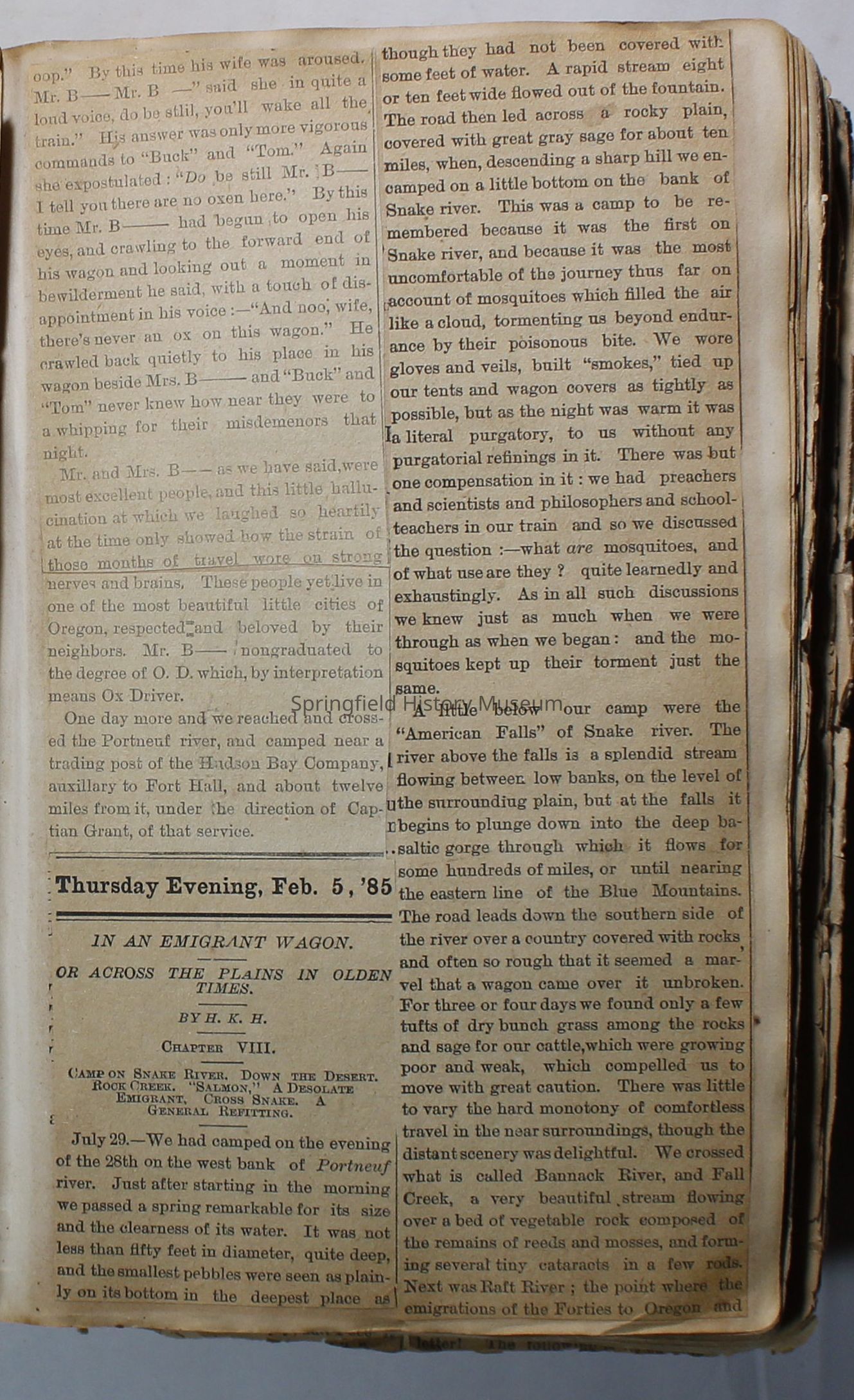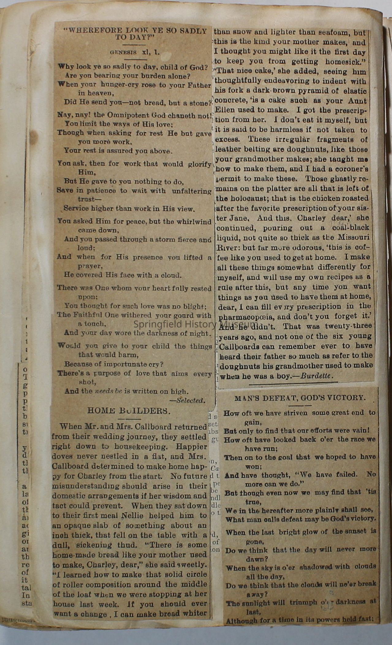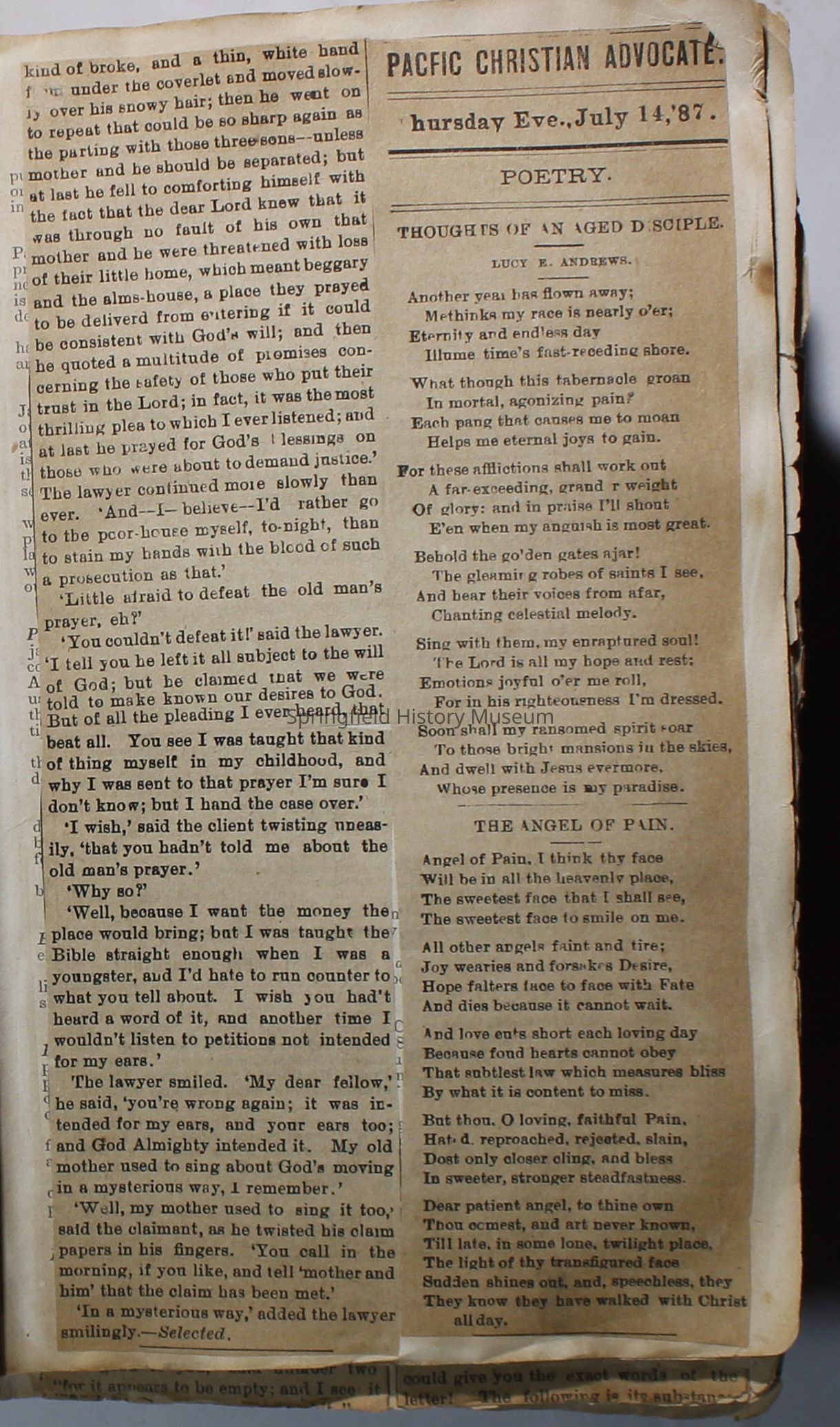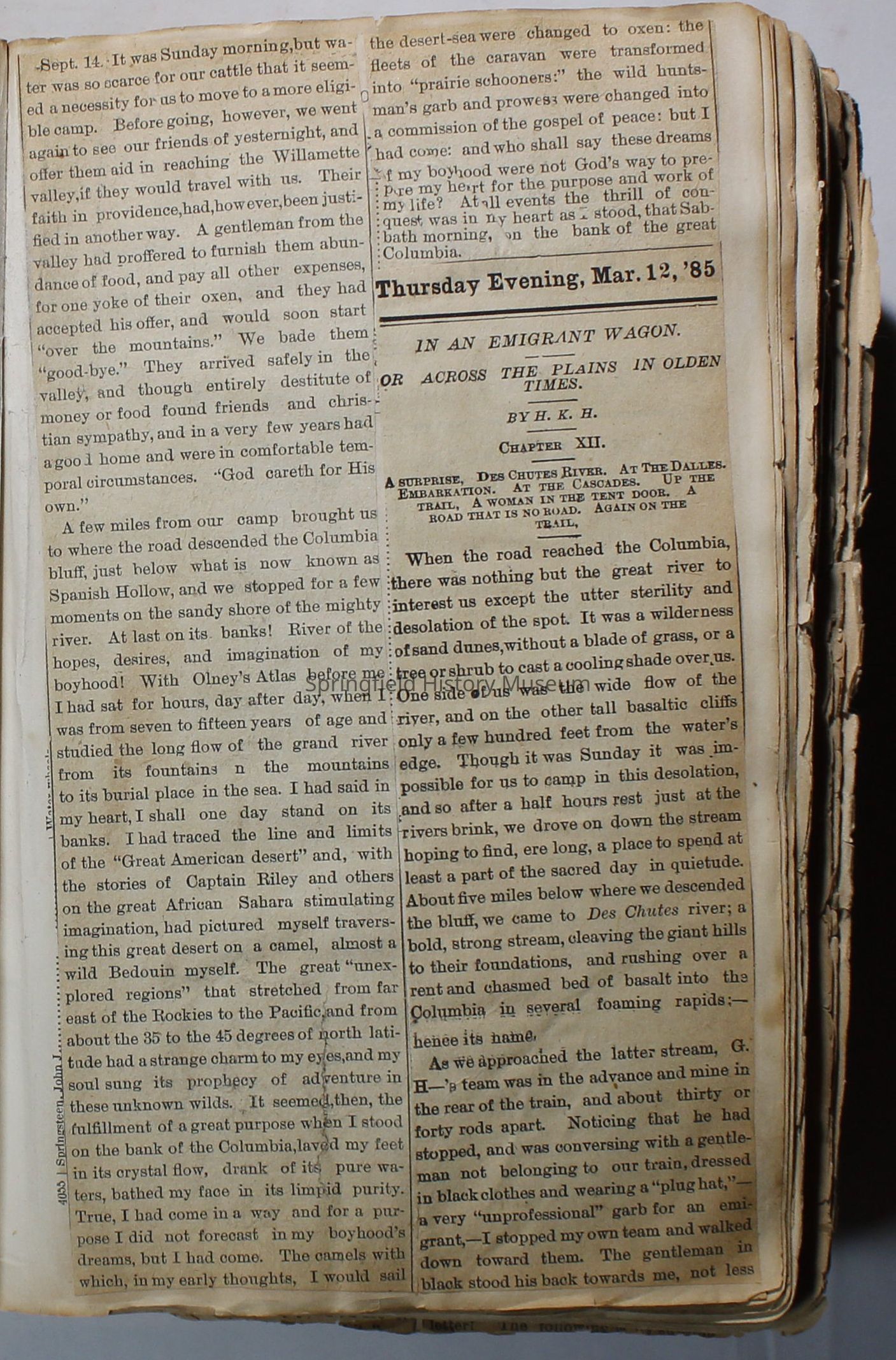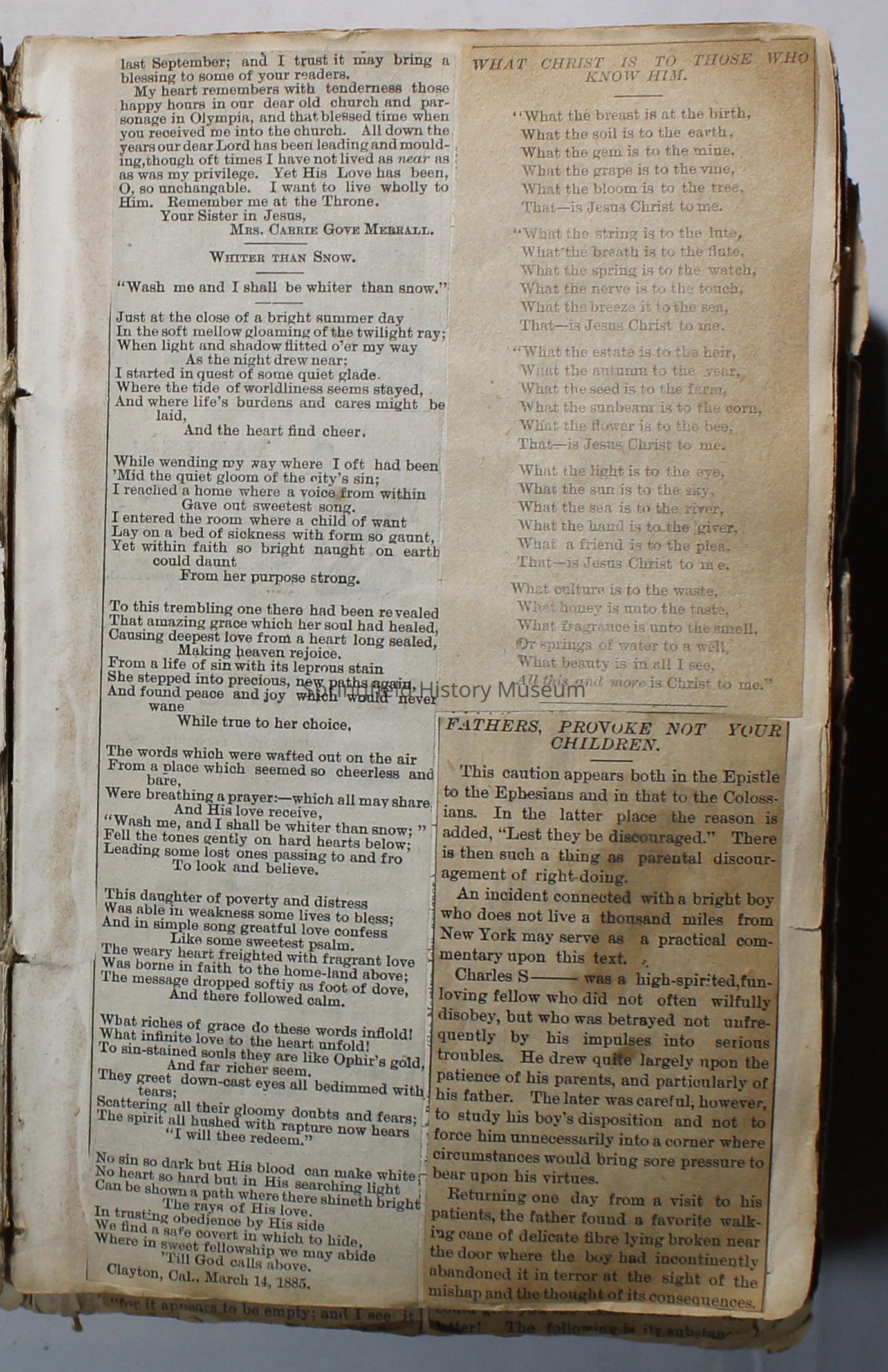 Scrapbook handmade by Agnes Stewart Warner for her son, Clyde. Original hardbound book with newspaper clippings. Book starts with clippings from the Pacific Christian Advocate dated December 4, 1884 on traveling across the Oregon trail. Included are poems, songs, religious articles, and other stories.