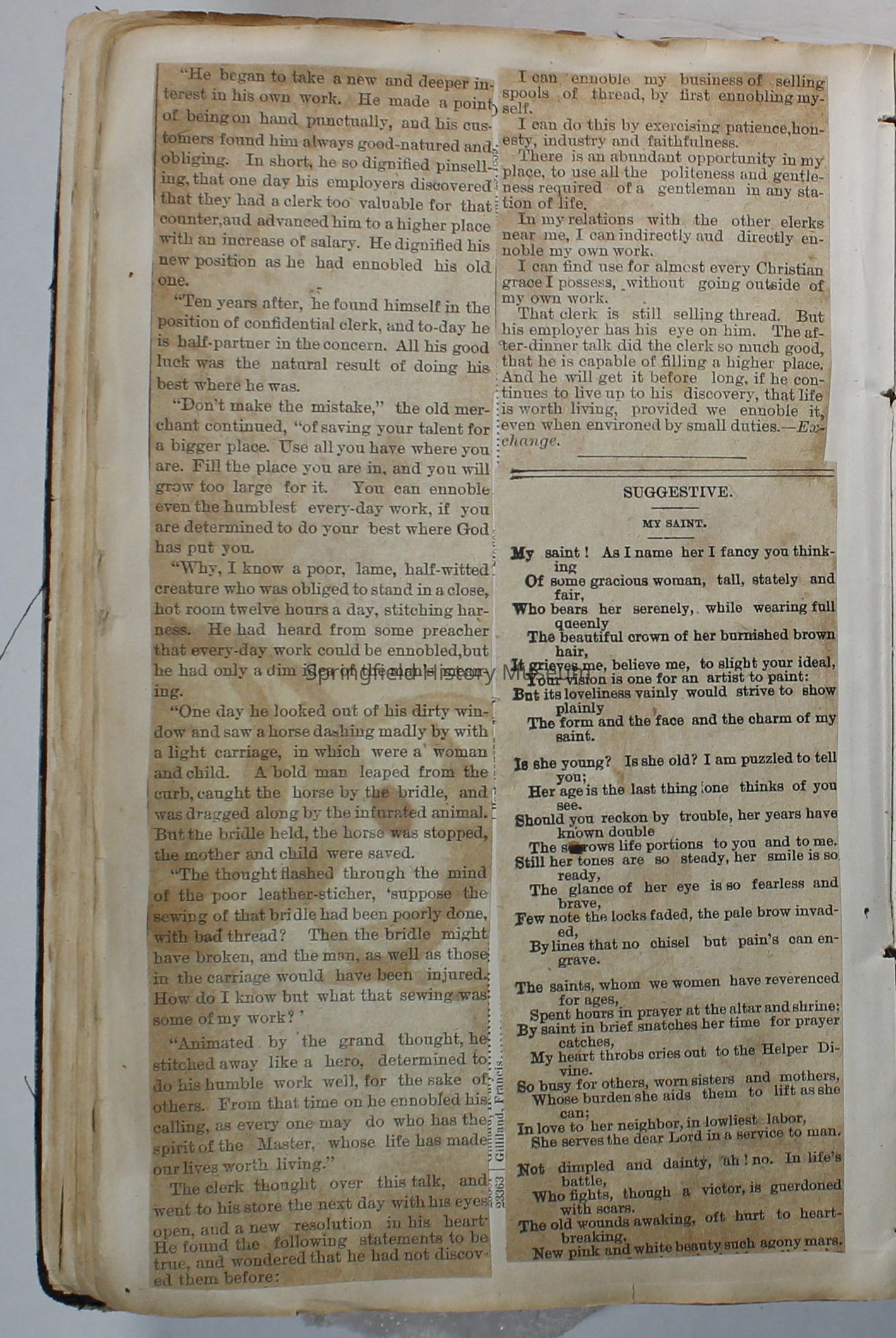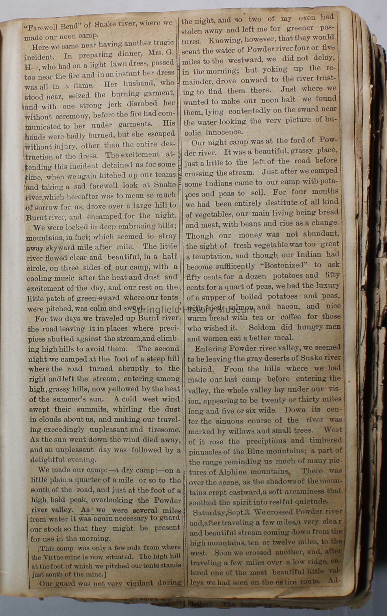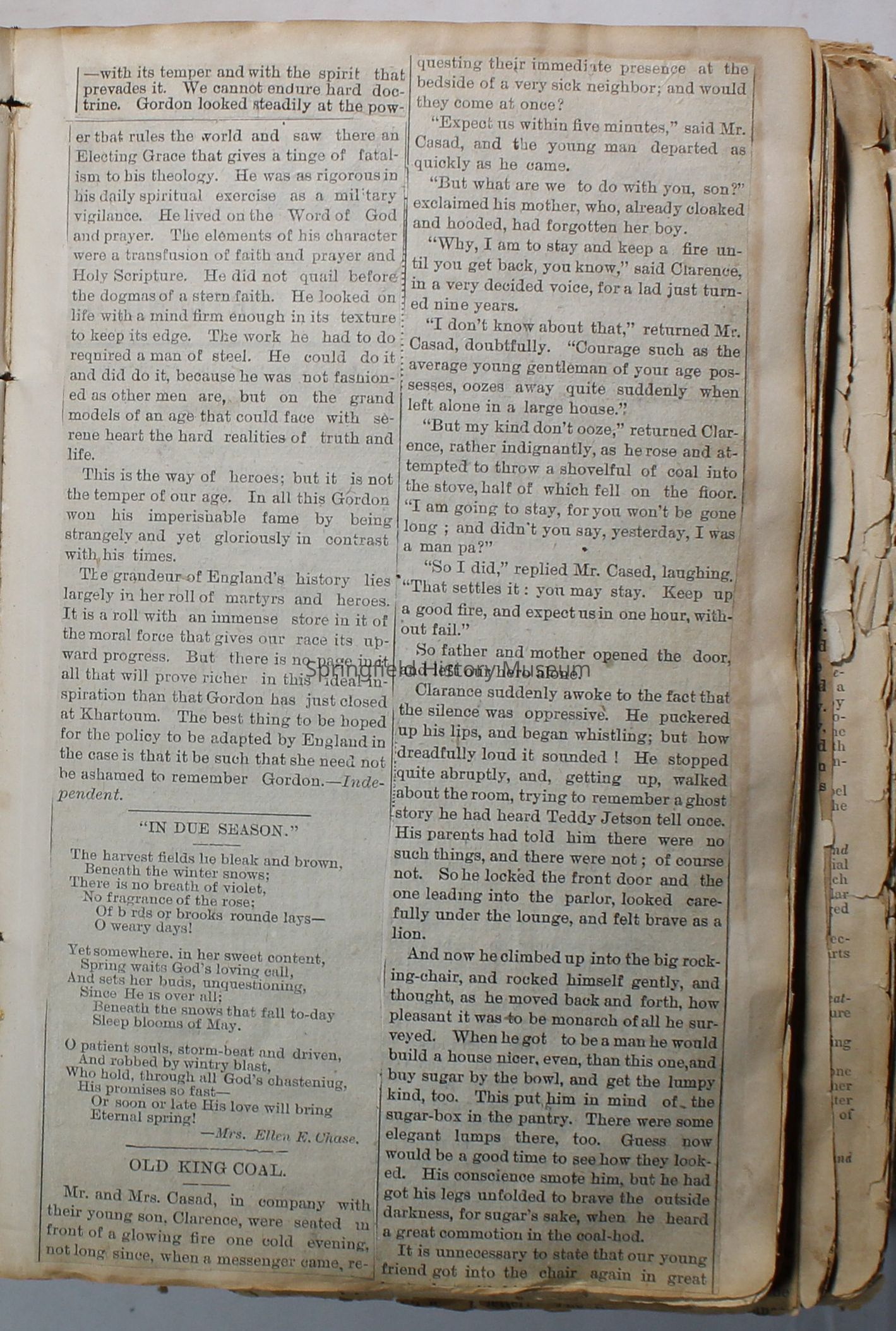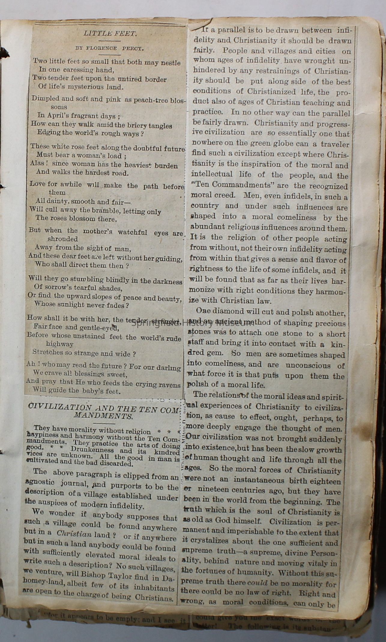 Scrapbook handmade by Agnes Stewart Warner for her son, Clyde. Original hardbound book with newspaper clippings. Book starts with clippings from the Pacific Christian Advocate dated December 4, 1884 on traveling across the Oregon trail. Included are poems, songs, religious articles, and other stories.