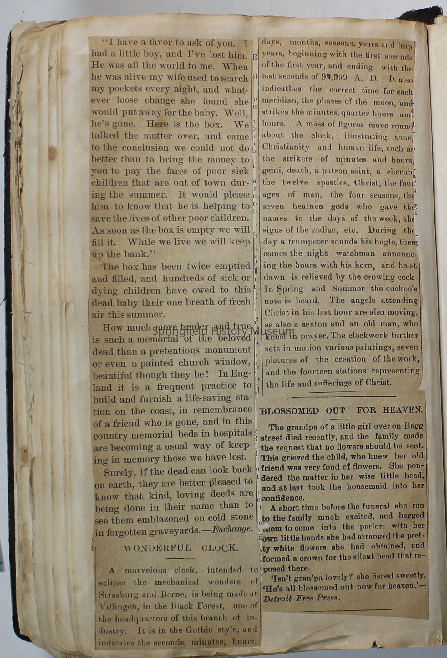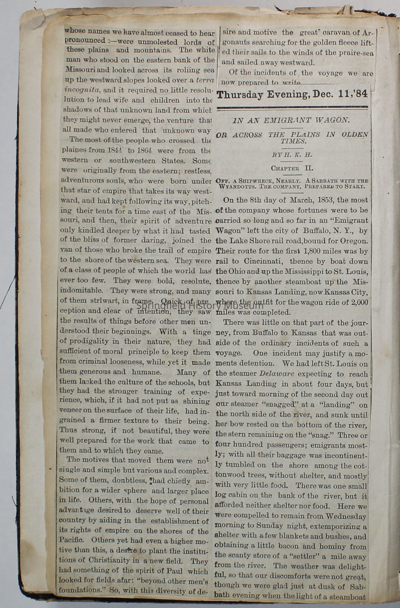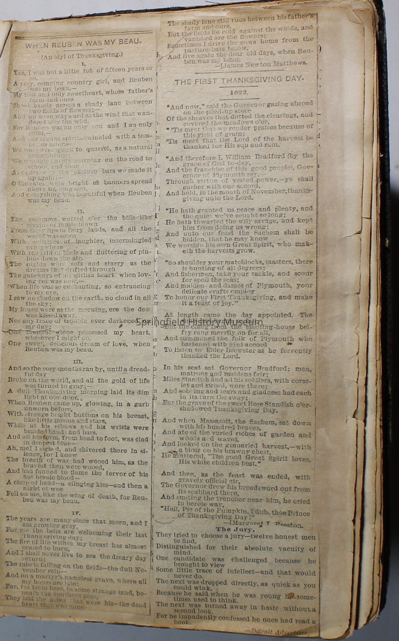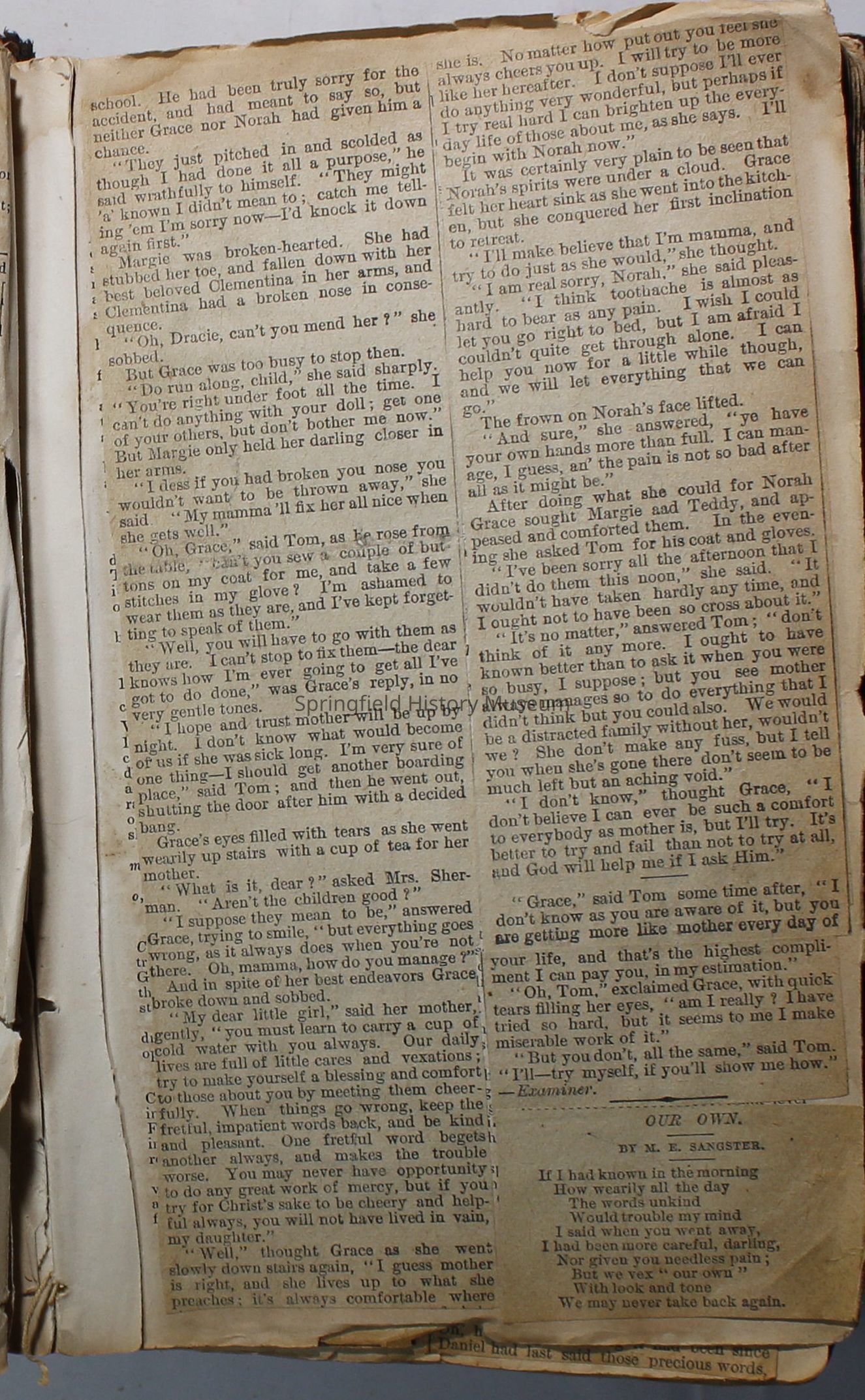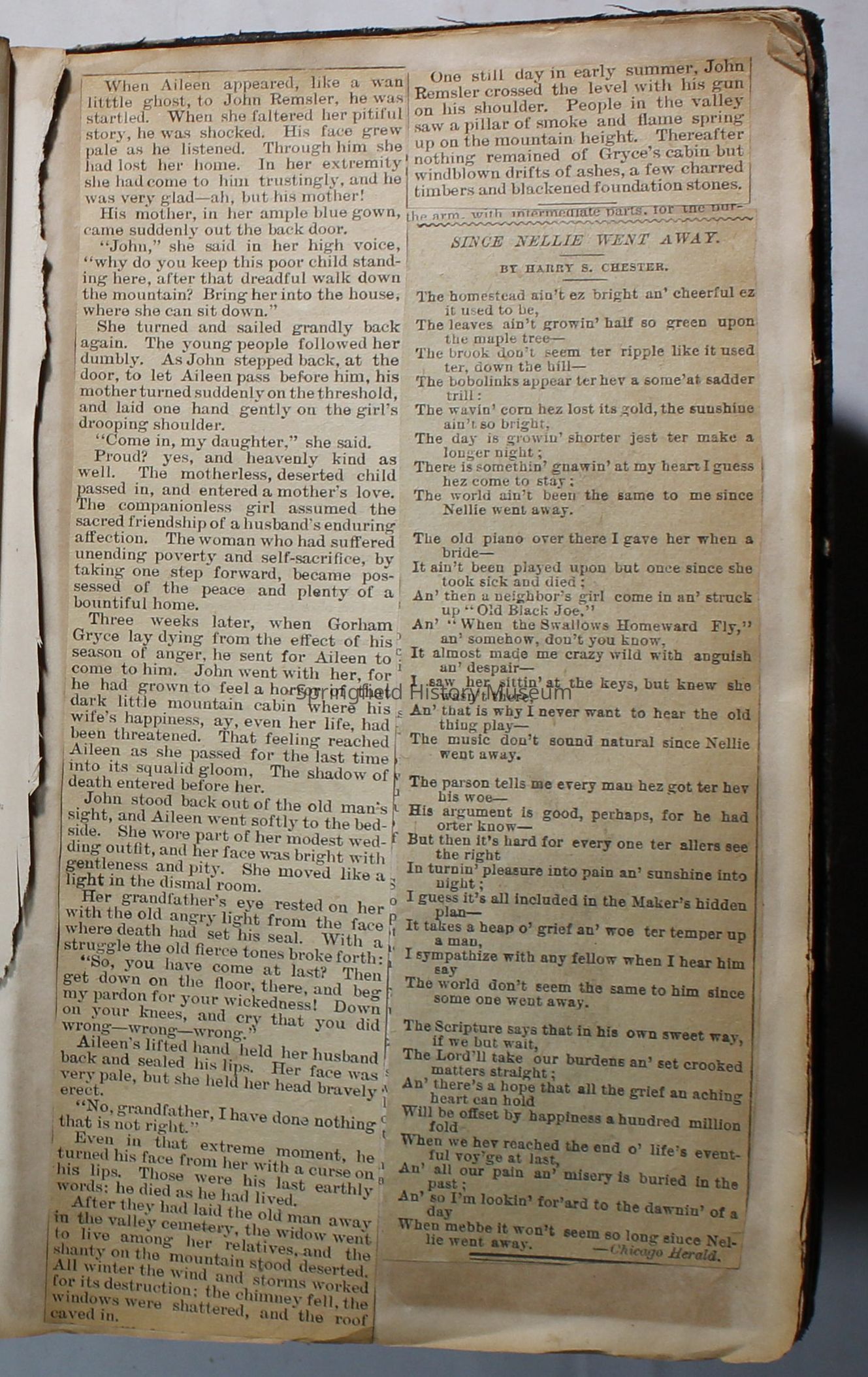 Scrapbook handmade by Agnes Stewart Warner for her son, Clyde. Original hardbound book with newspaper clippings. Book starts with clippings from the Pacific Christian Advocate dated December 4, 1884 on traveling across the Oregon trail. Included are poems, songs, religious articles, and other stories.