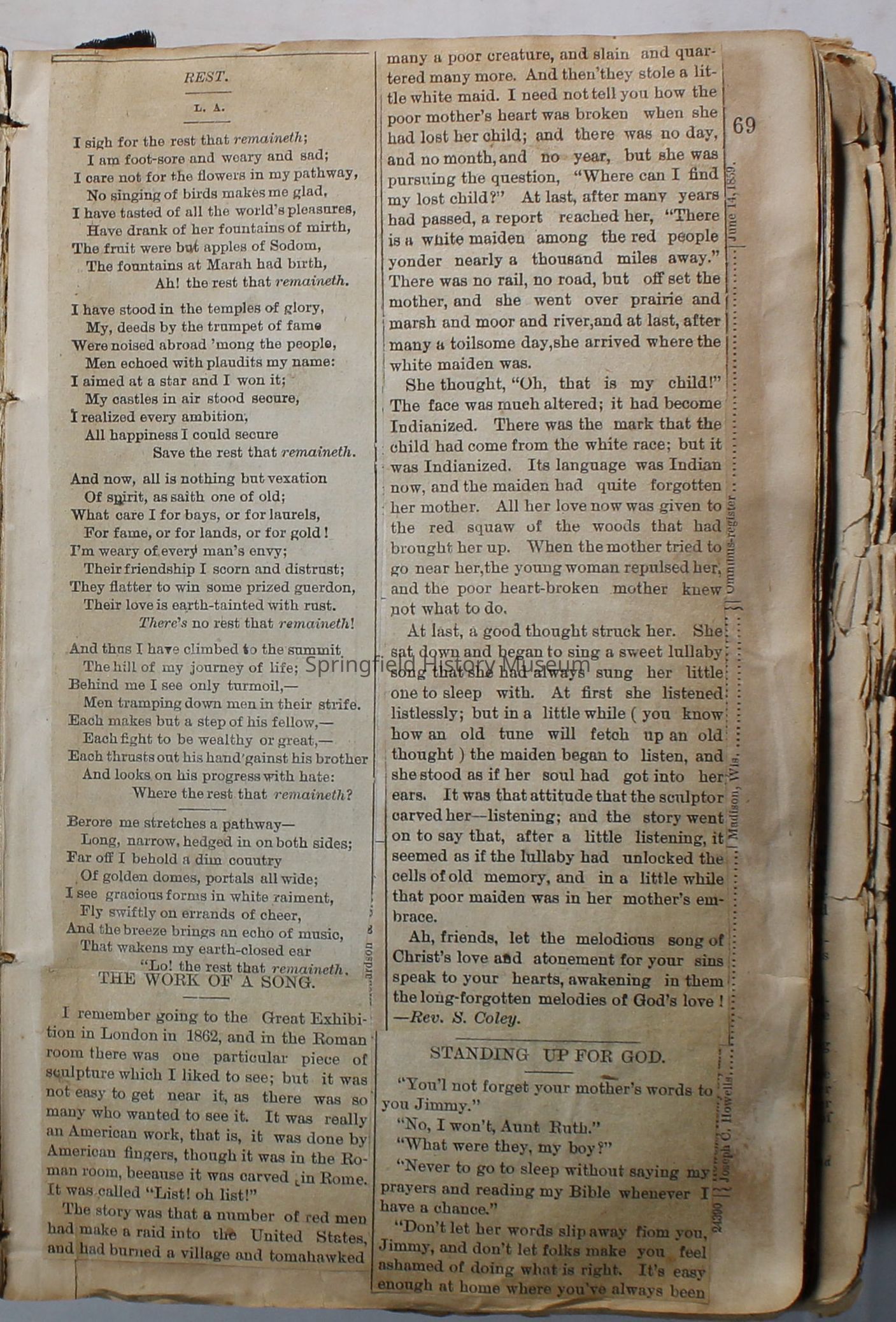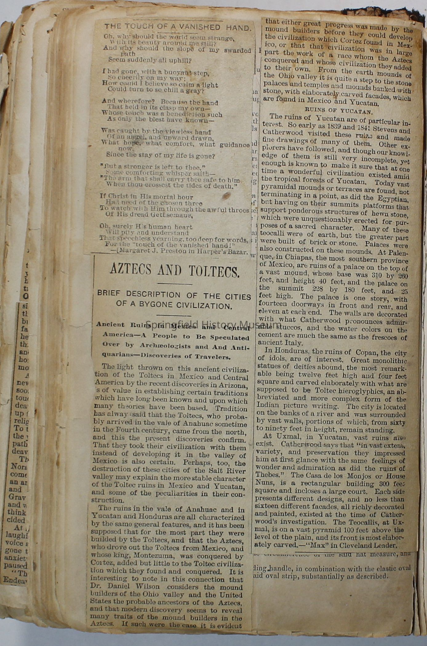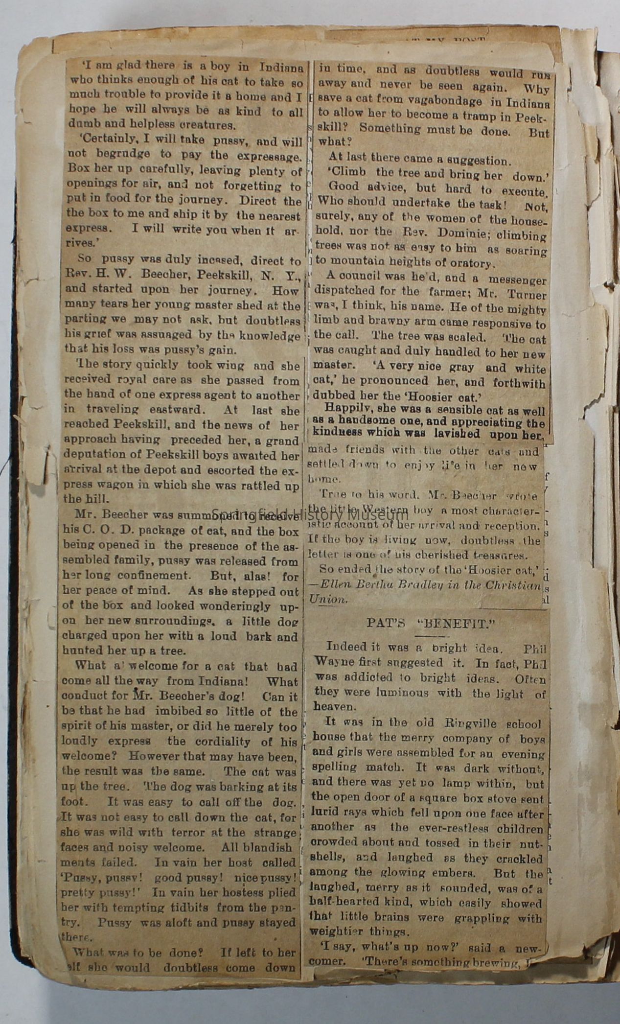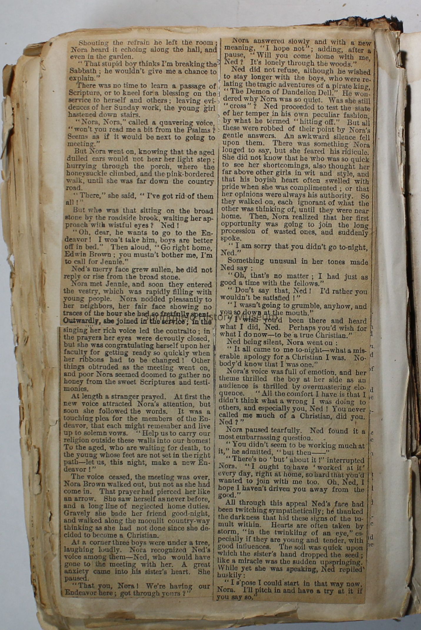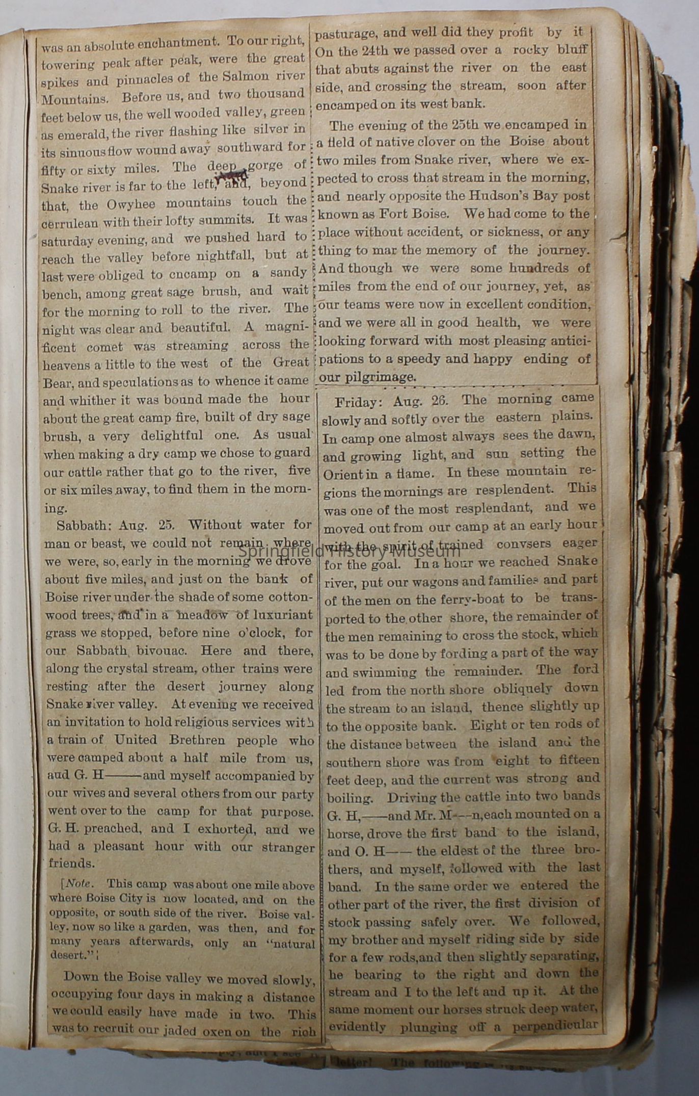 Scrapbook handmade by Agnes Stewart Warner for her son, Clyde. Original hardbound book with newspaper clippings. Book starts with clippings from the Pacific Christian Advocate dated December 4, 1884 on traveling across the Oregon trail. Included are poems, songs, religious articles, and other stories.