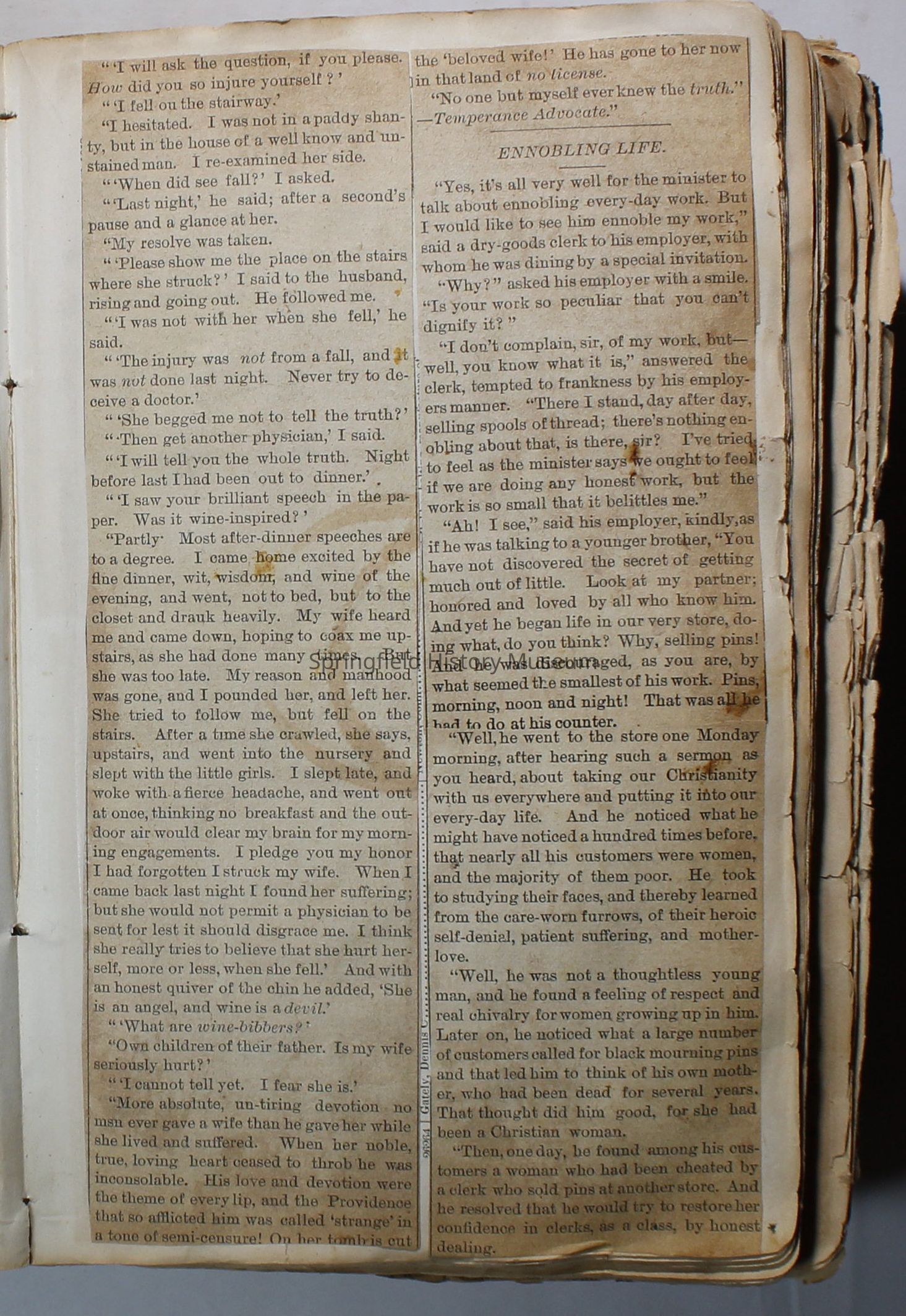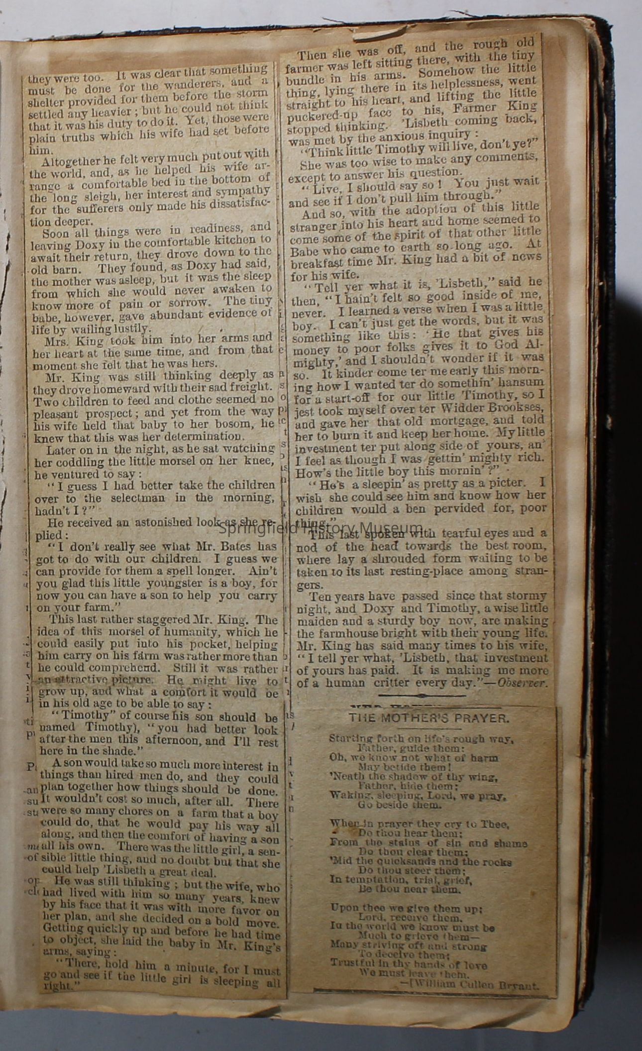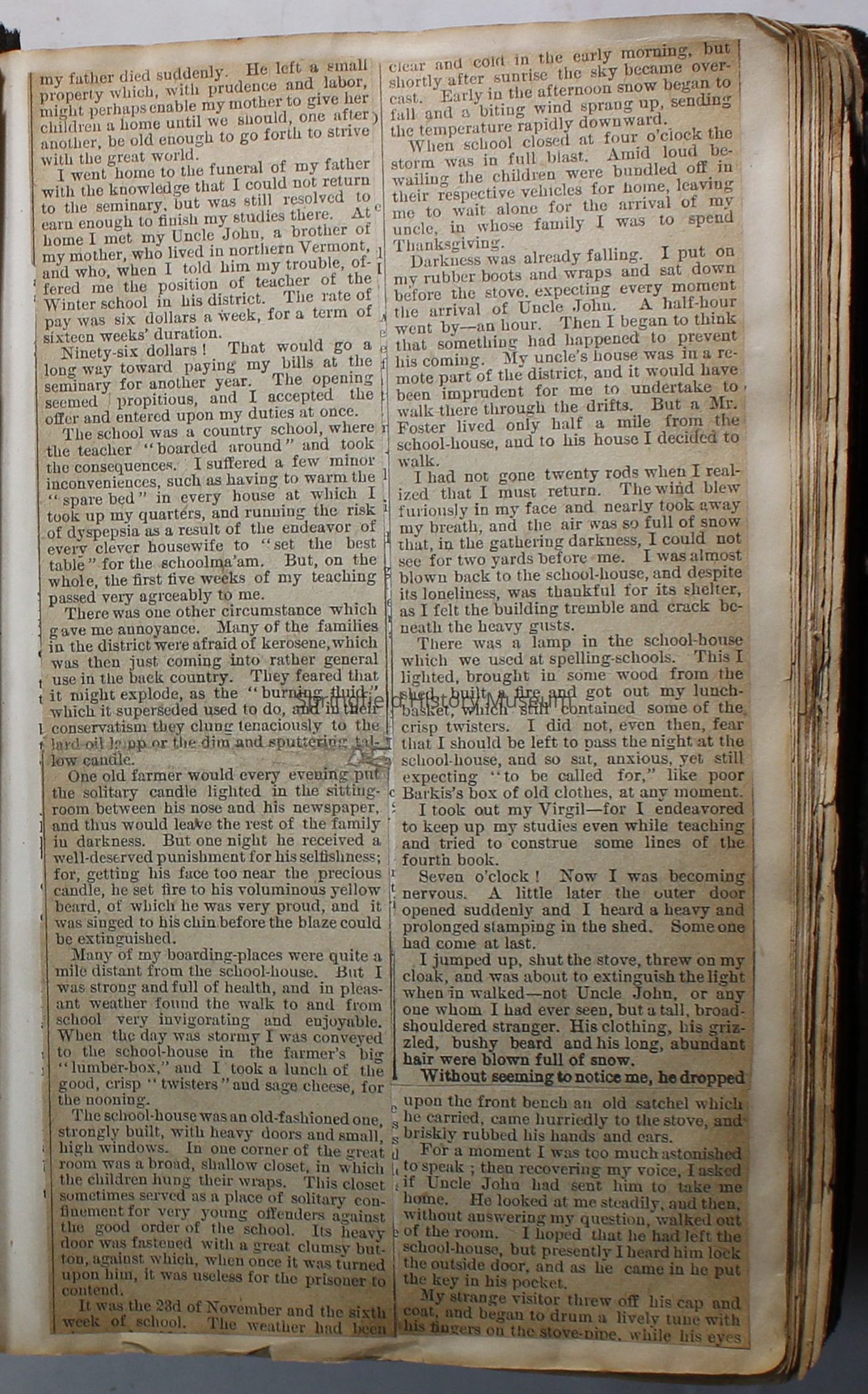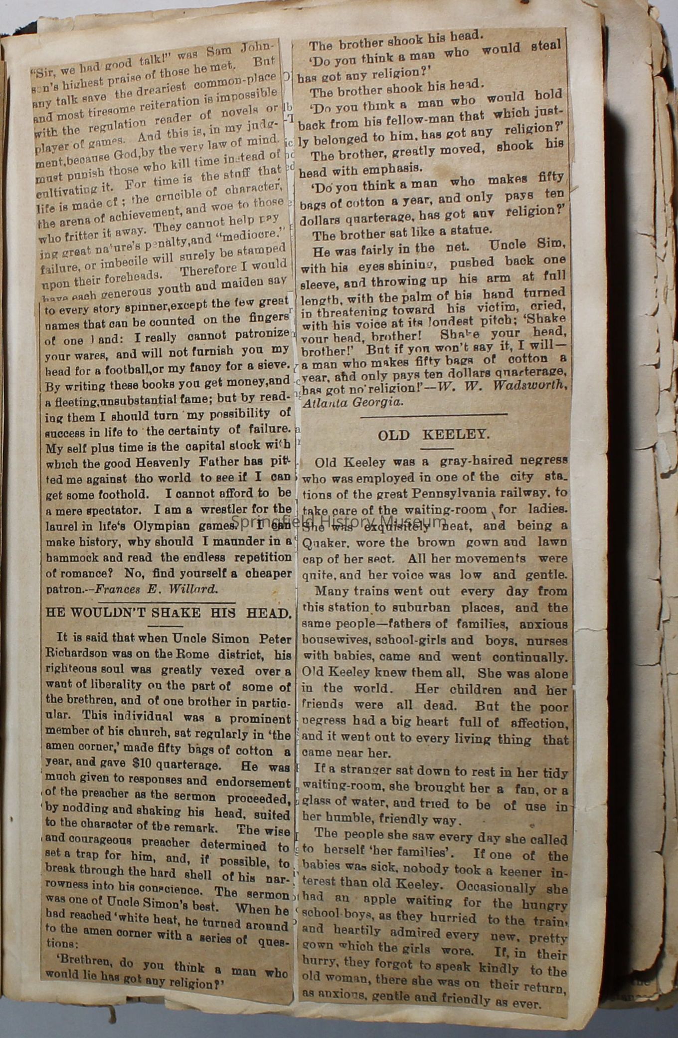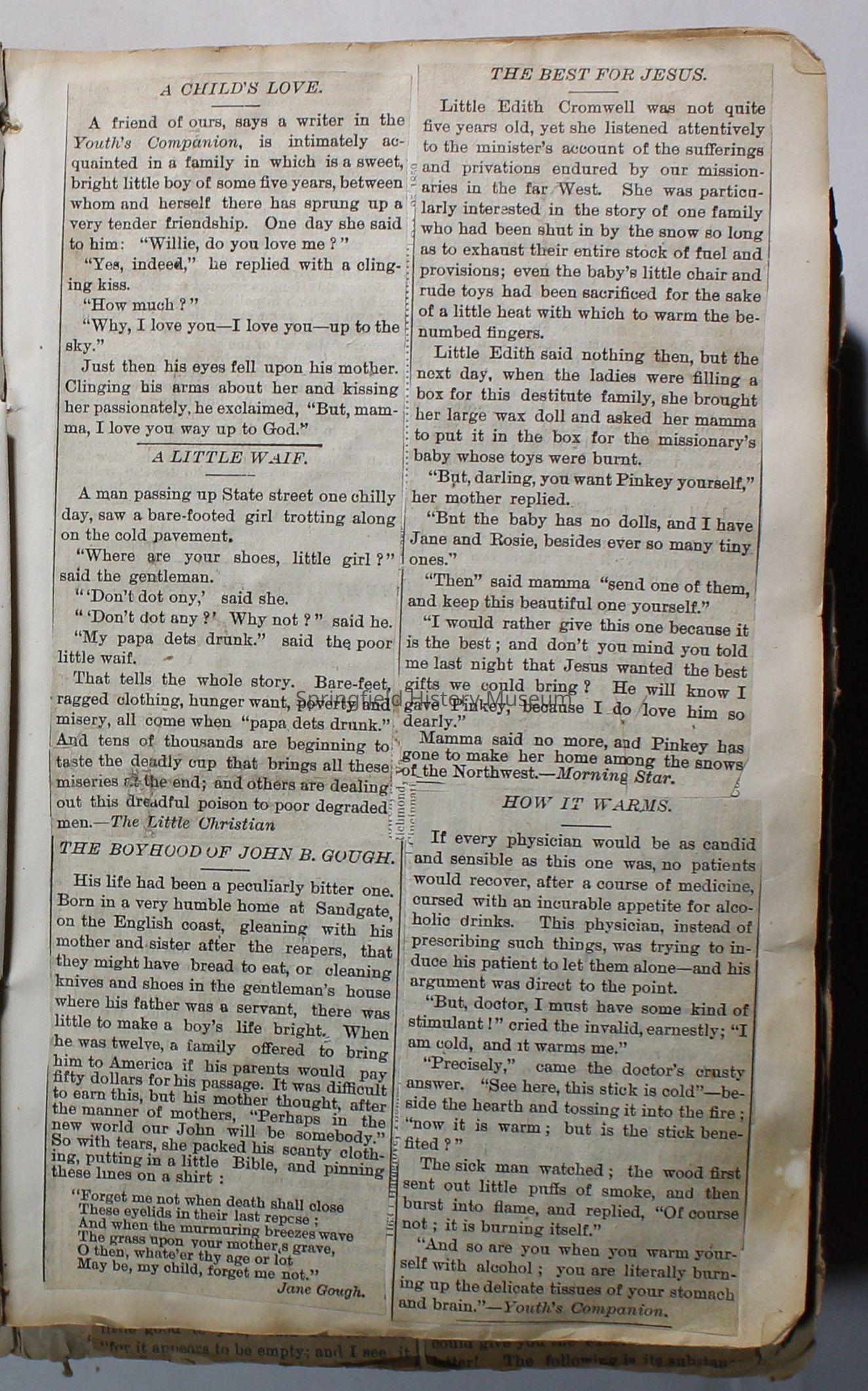 Scrapbook handmade by Agnes Stewart Warner for her son, Clyde. Original hardbound book with newspaper clippings. Book starts with clippings from the Pacific Christian Advocate dated December 4, 1884 on traveling across the Oregon trail. Included are poems, songs, religious articles, and other stories.