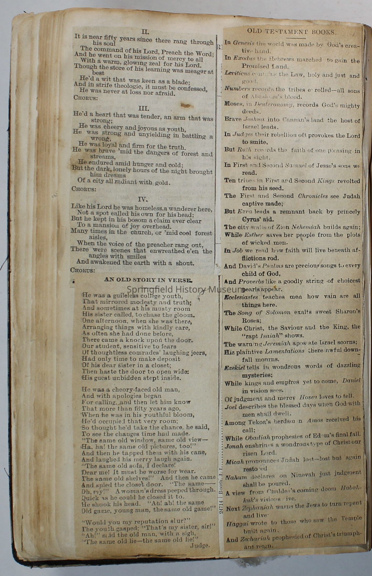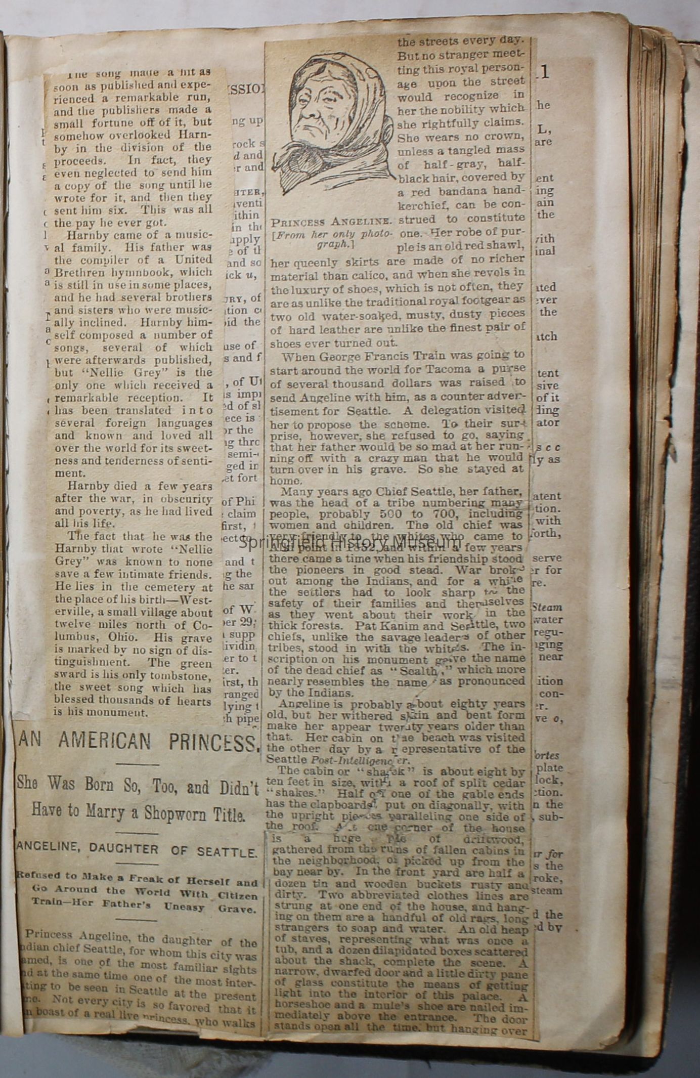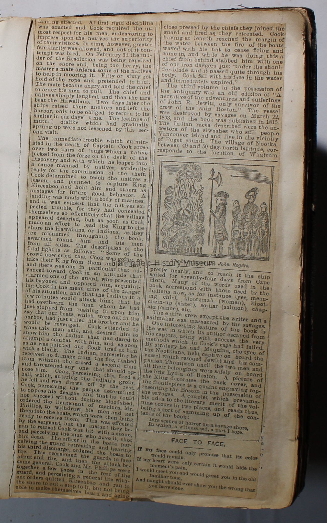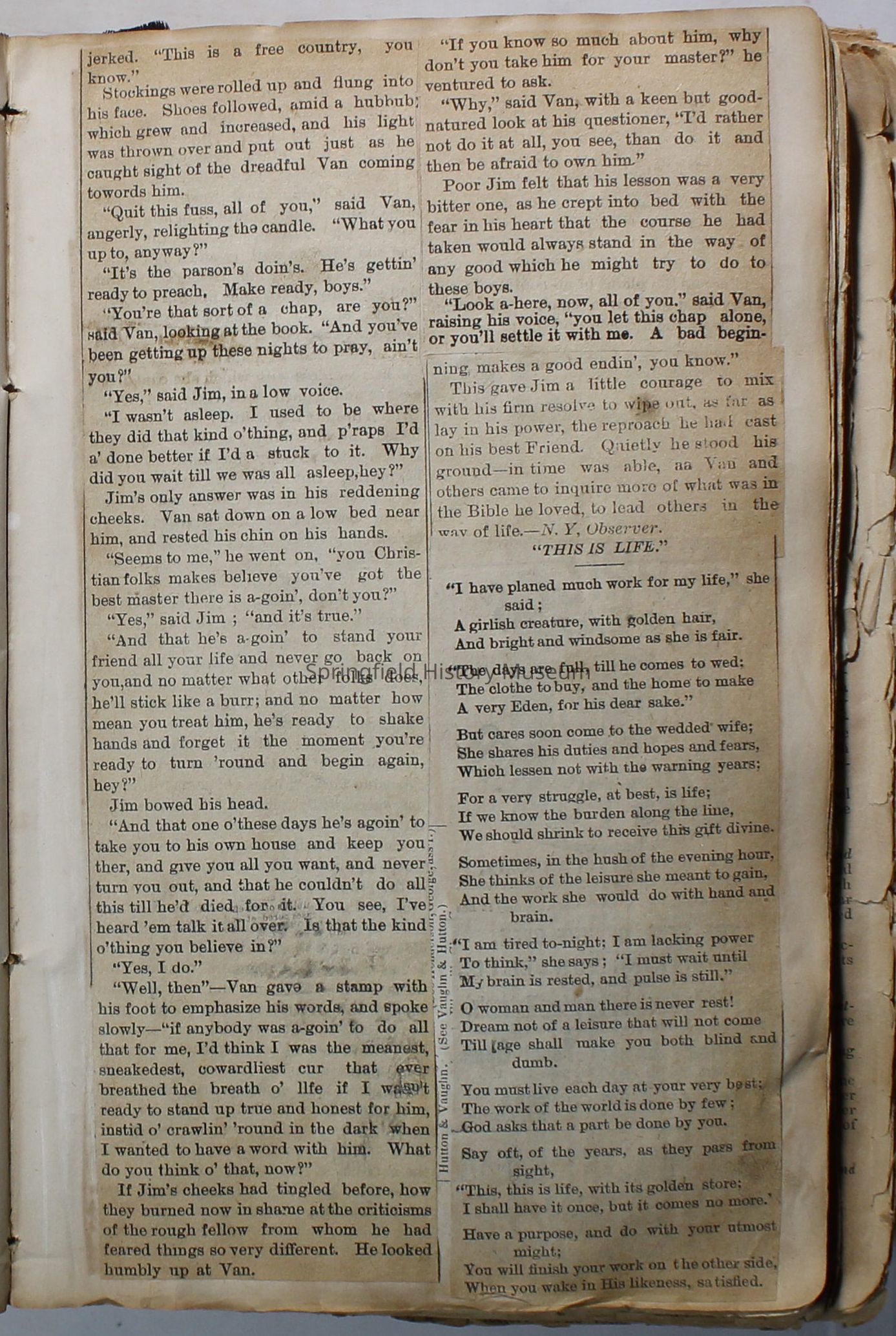 Scrapbook handmade by Agnes Stewart Warner for her son, Clyde. Original hardbound book with newspaper clippings. Book starts with clippings from the Pacific Christian Advocate dated December 4, 1884 on traveling across the Oregon trail. Included are poems, songs, religious articles, and other stories.