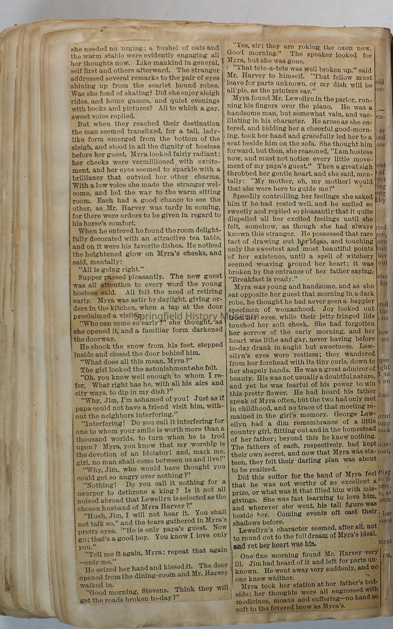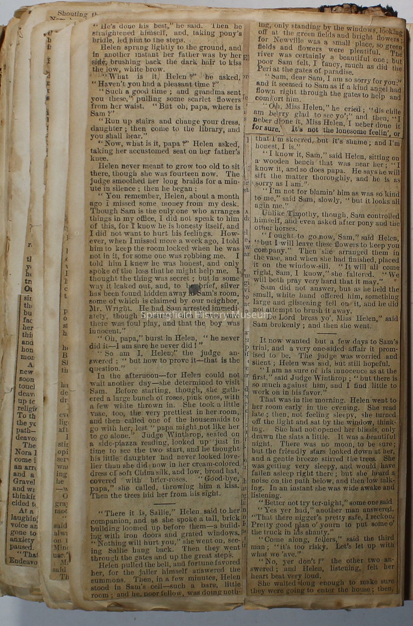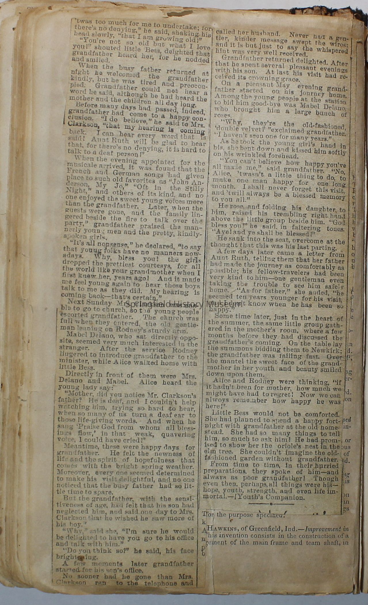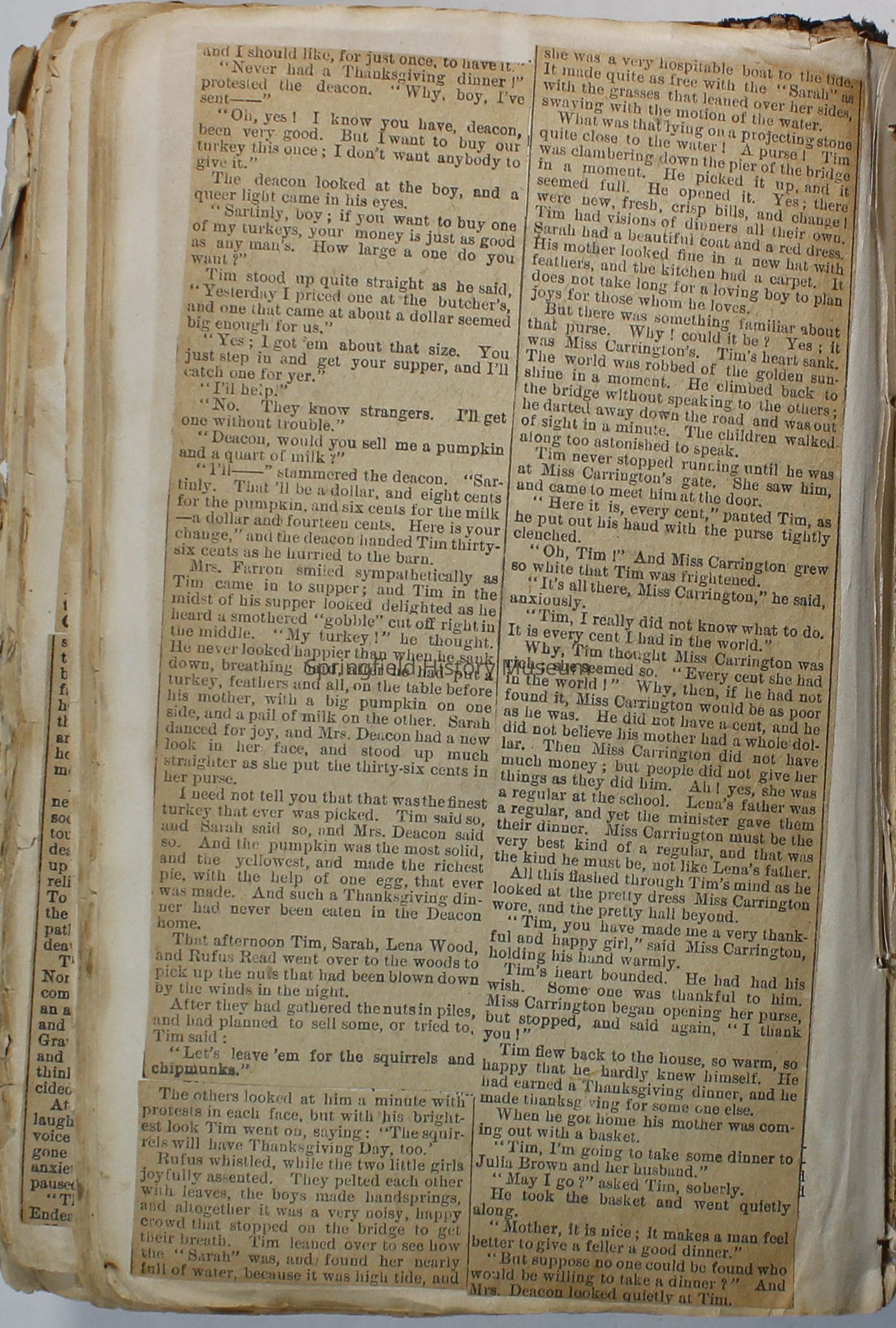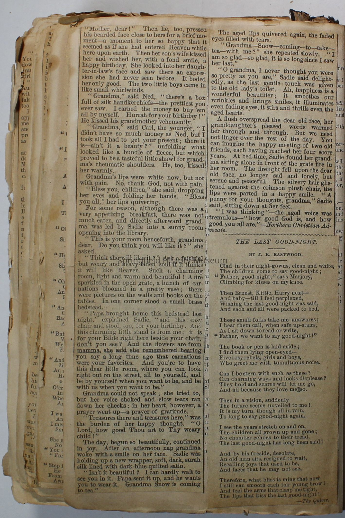 Scrapbook handmade by Agnes Stewart Warner for her son, Clyde. Original hardbound book with newspaper clippings. Book starts with clippings from the Pacific Christian Advocate dated December 4, 1884 on traveling across the Oregon trail. Included are poems, songs, religious articles, and other stories.