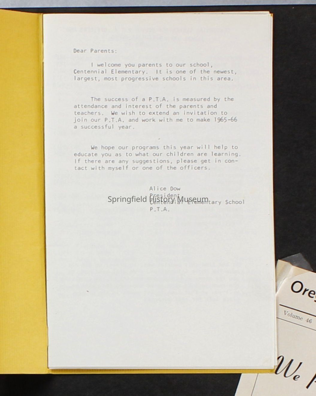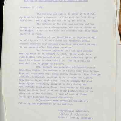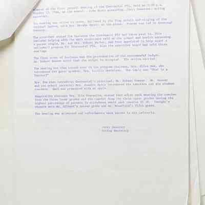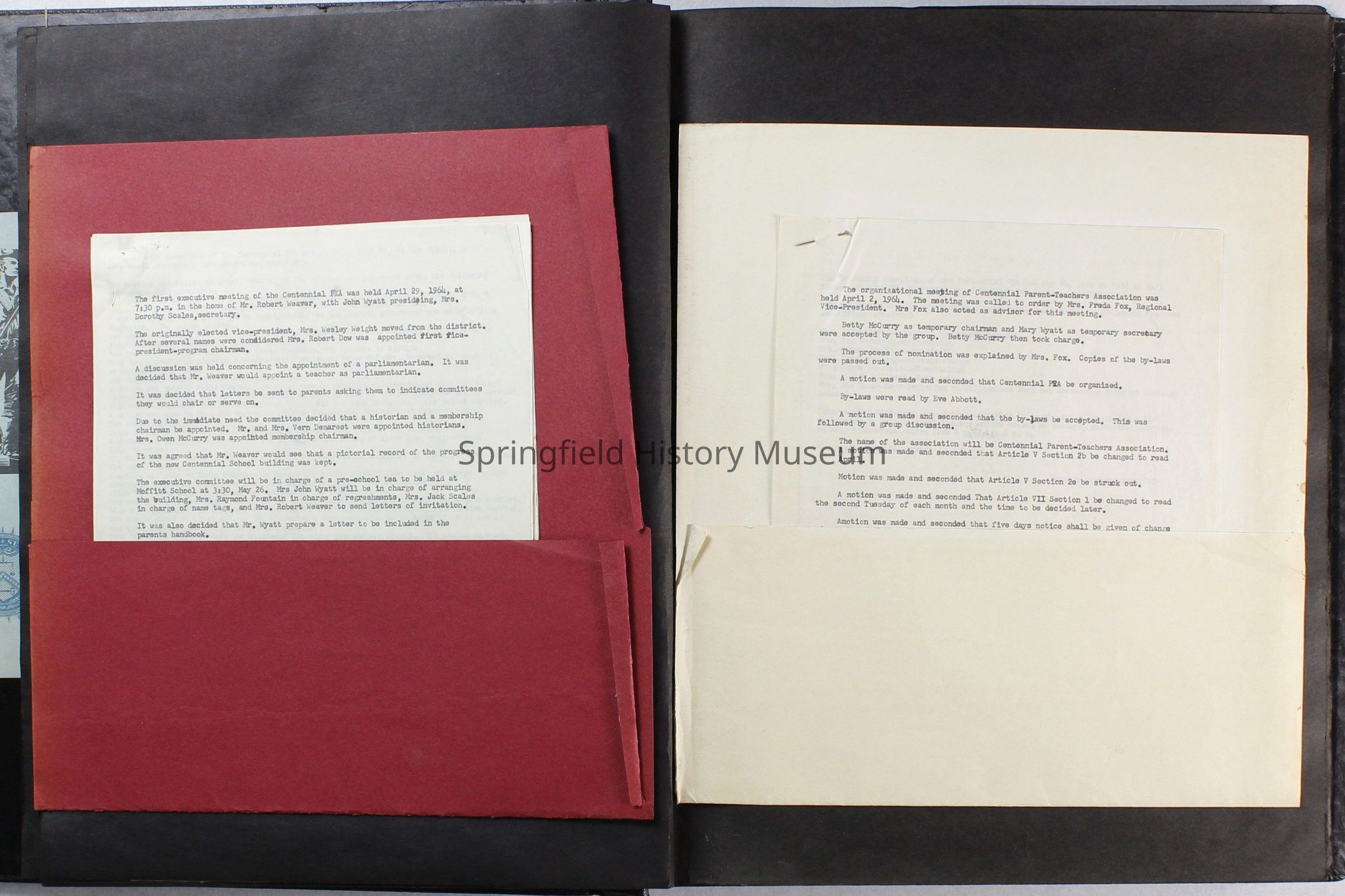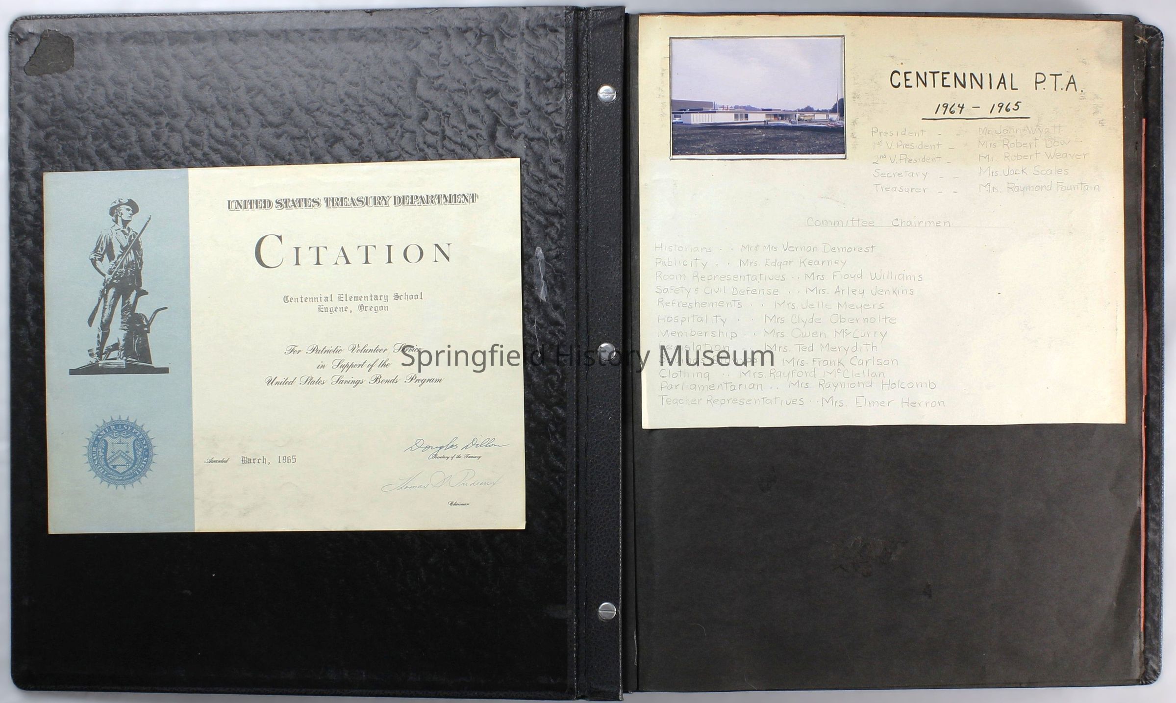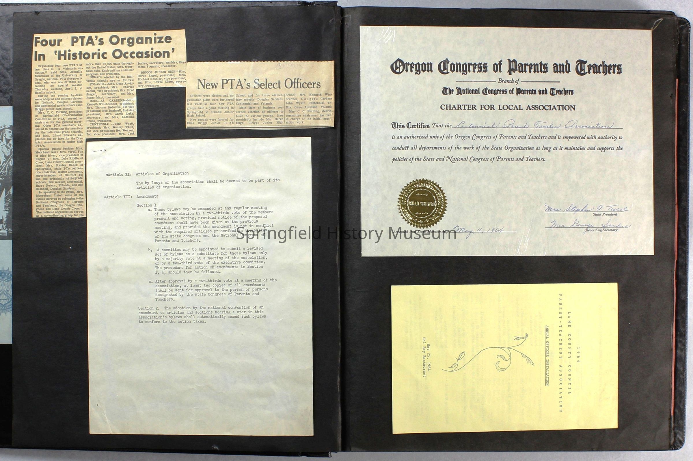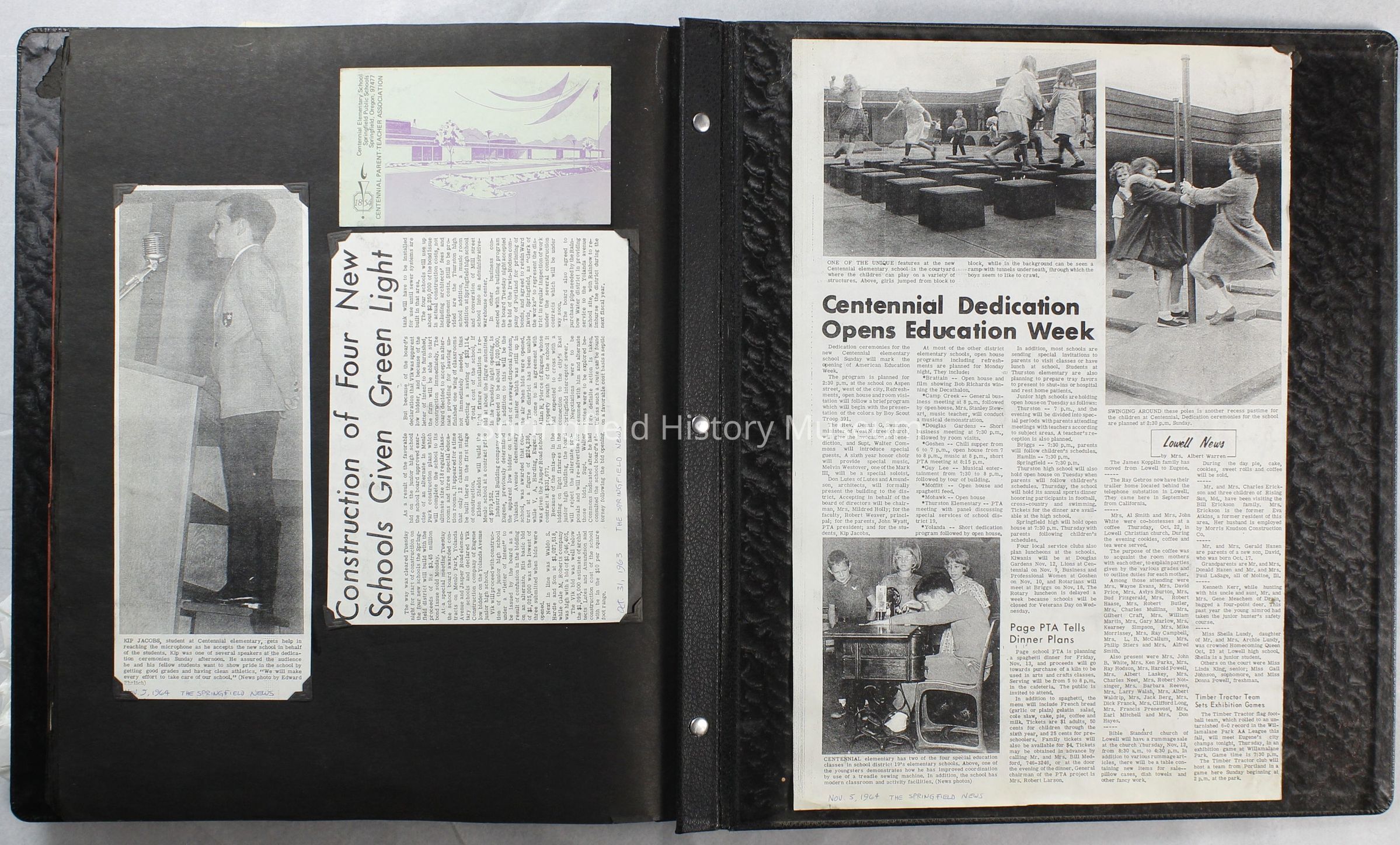 Scrapbook covering the history of the Centennial Elementary School Parent Teacher Association (PTA), circa 1964-1985. Holds photographs, letters, meeting minutes, handbooks, programming, clippings. Black cover and 80 pages.Collection