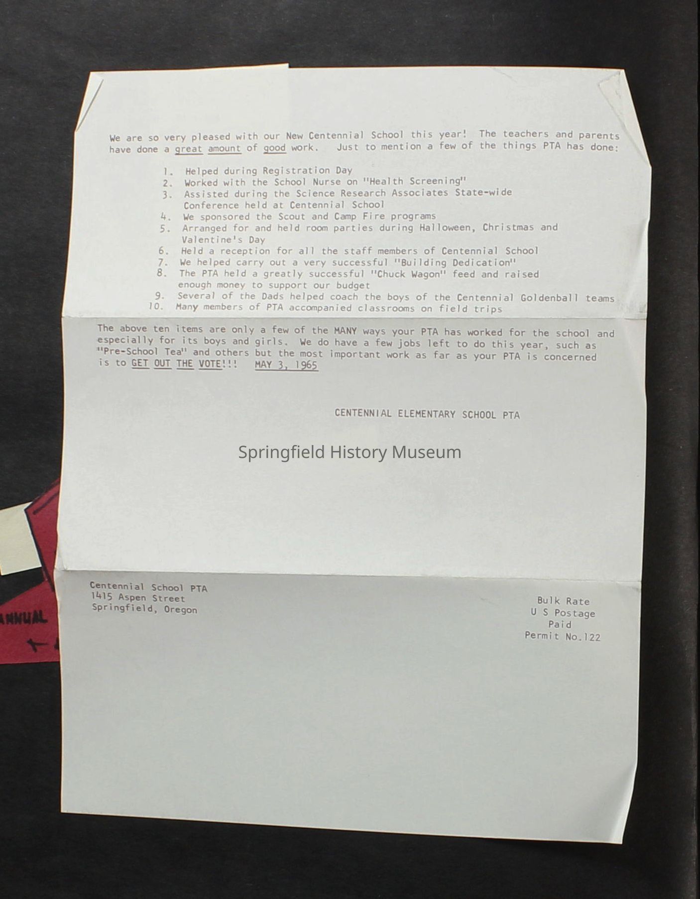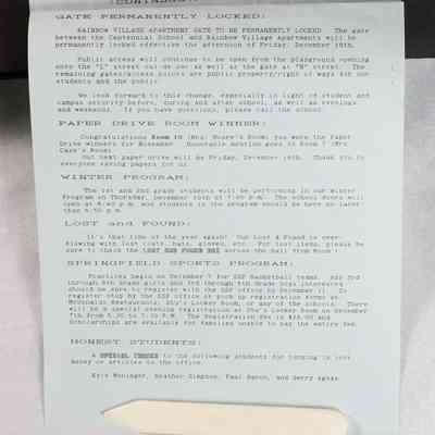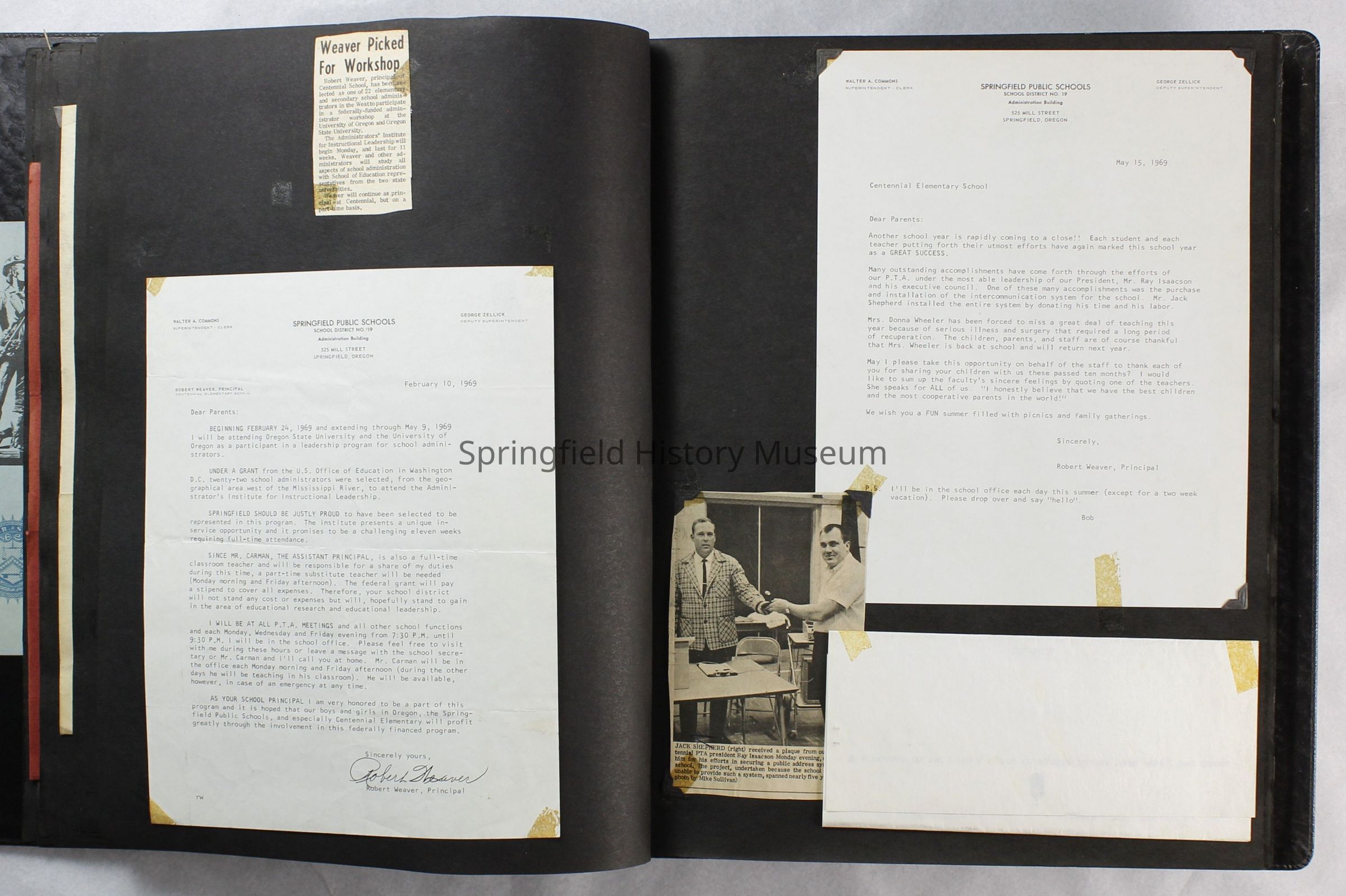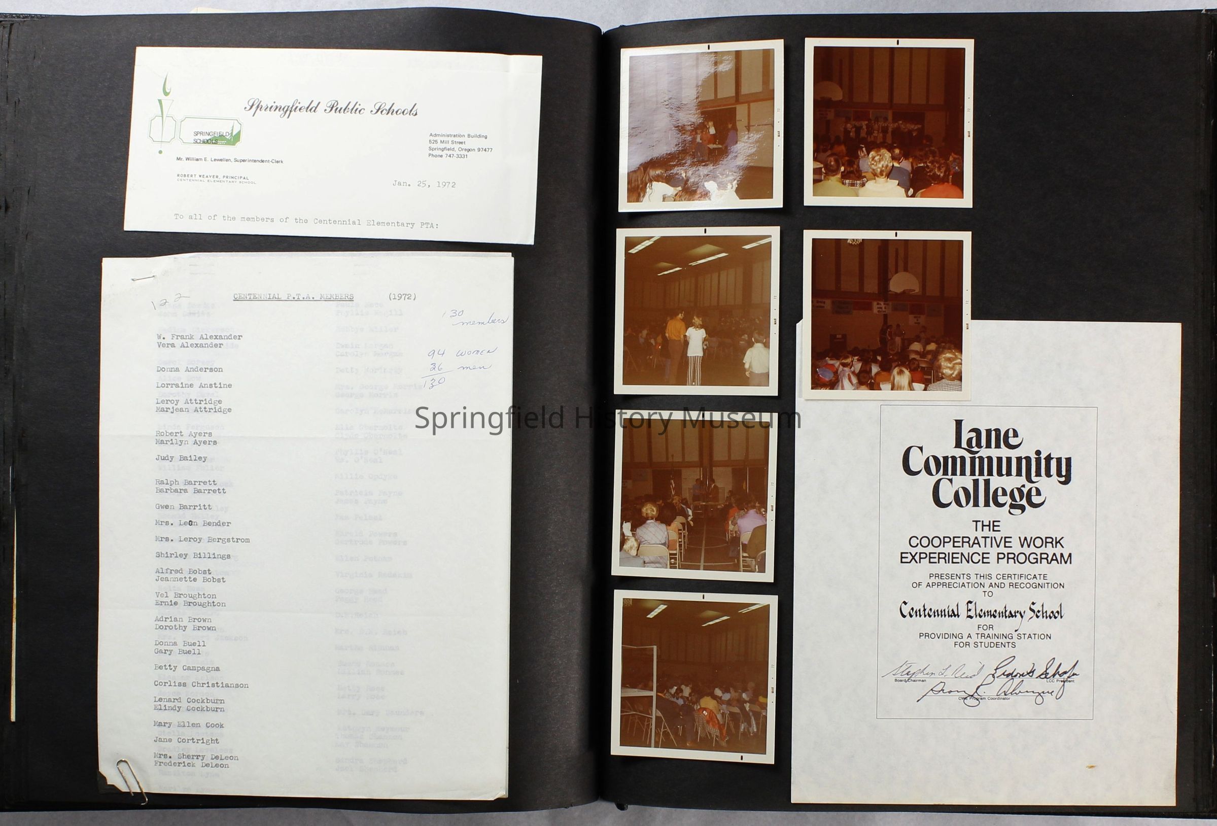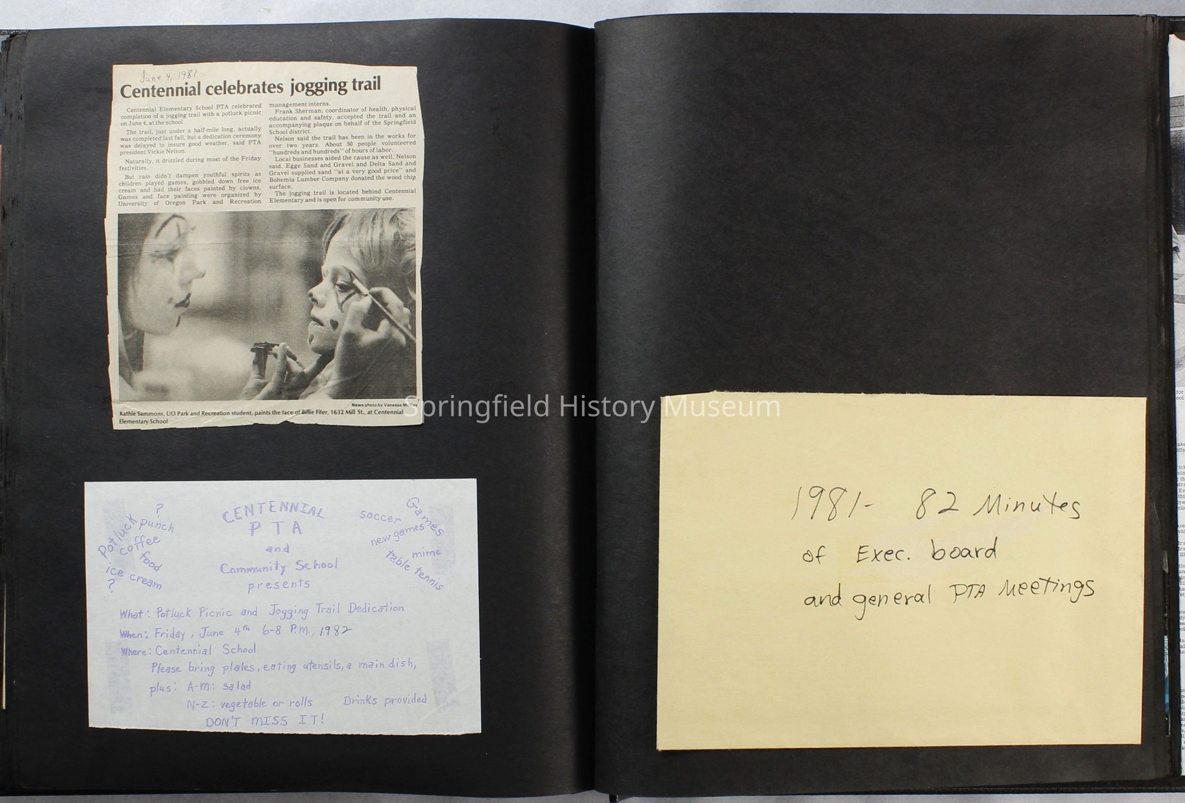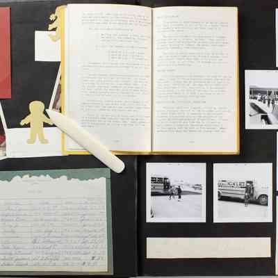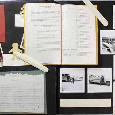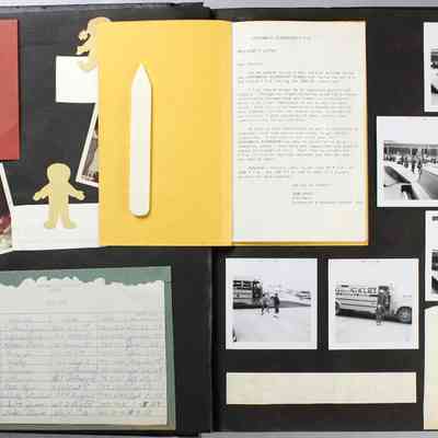 Scrapbook covering the history of the Centennial Elementary School Parent Teacher Association (PTA), circa 1964-1985. Holds photographs, letters, meeting minutes, handbooks, programming, clippings. Black cover and 80 pages.Collection