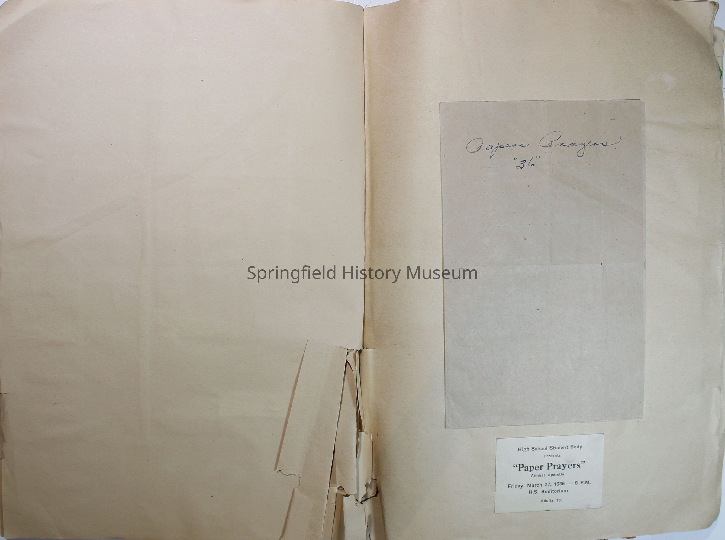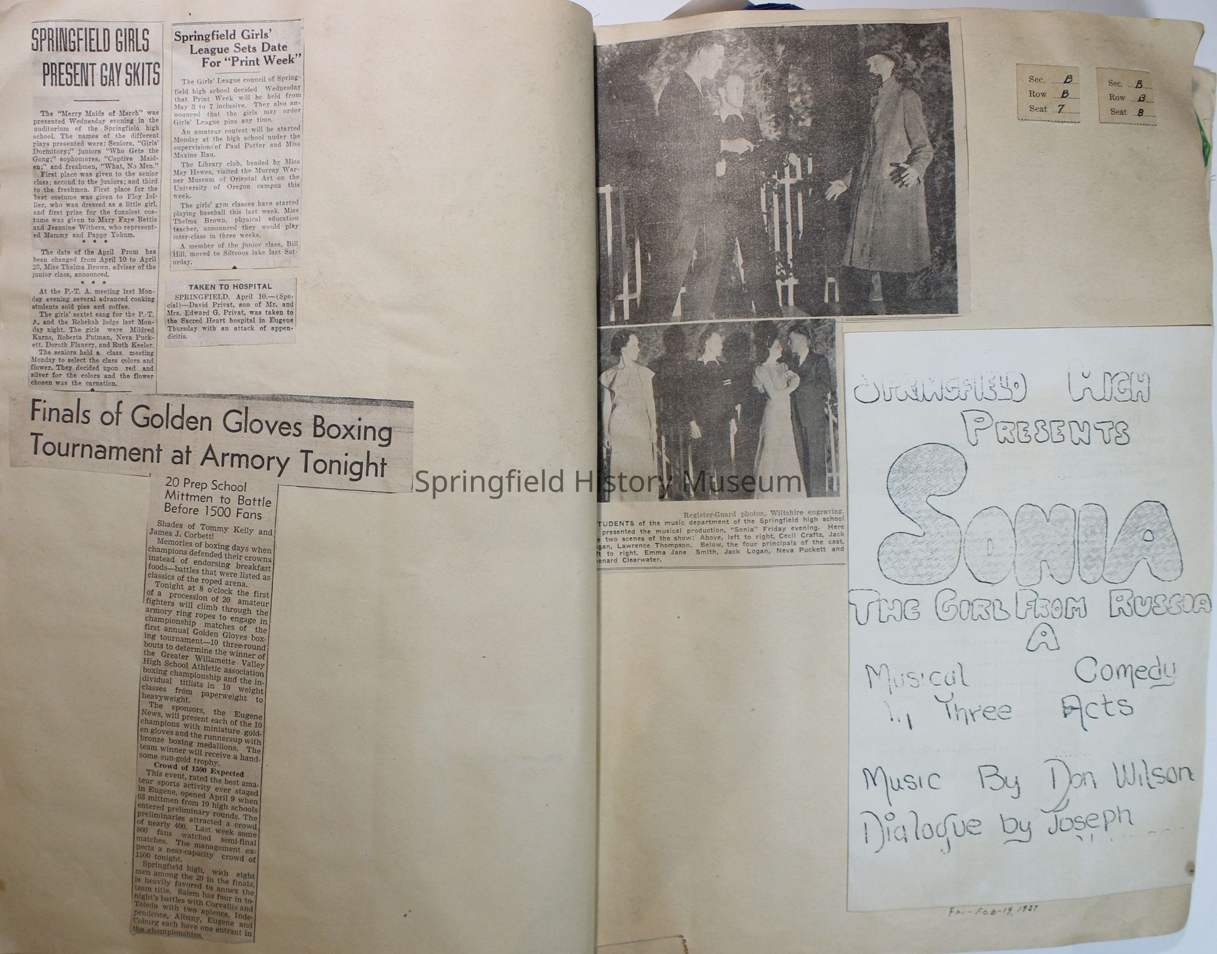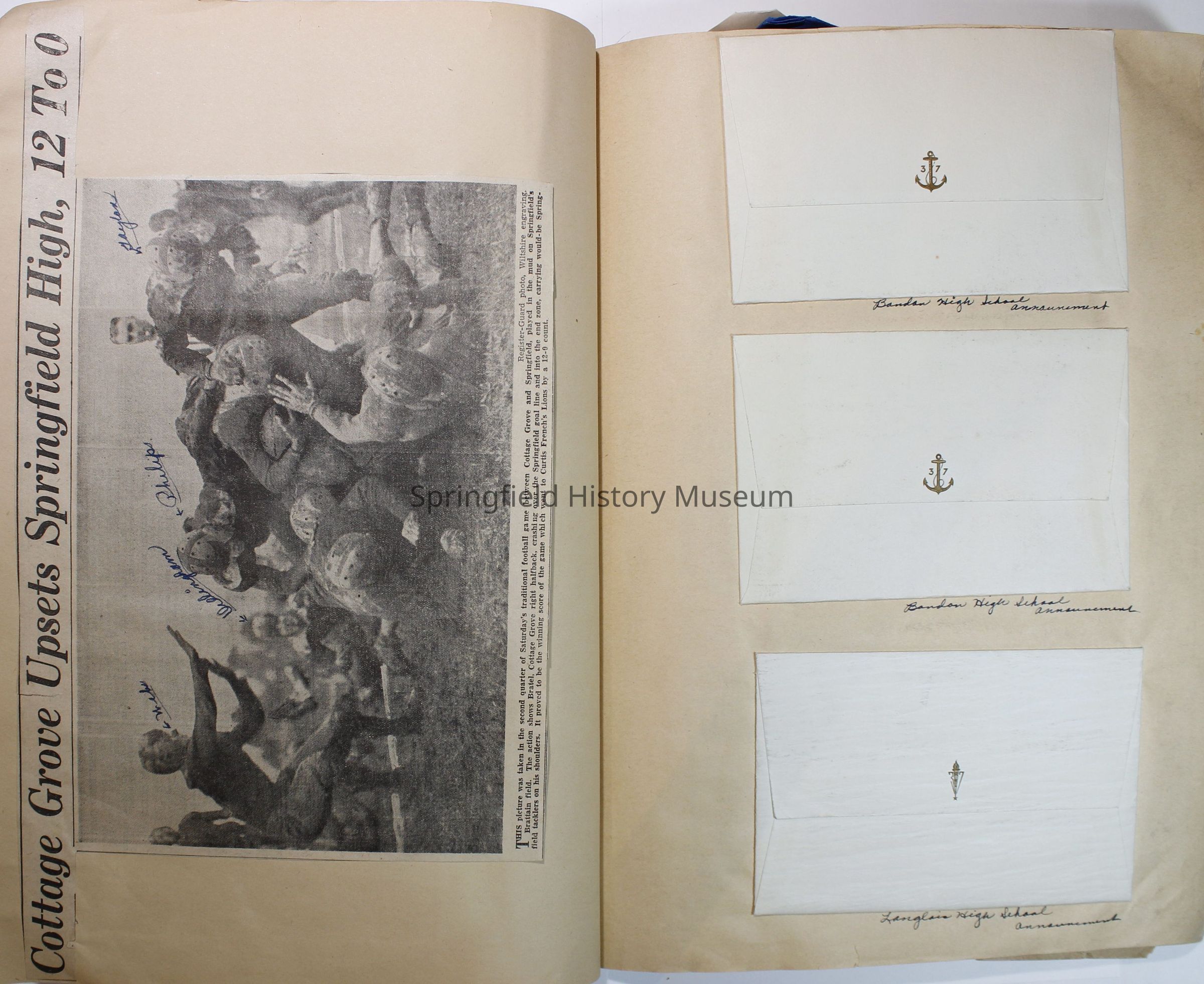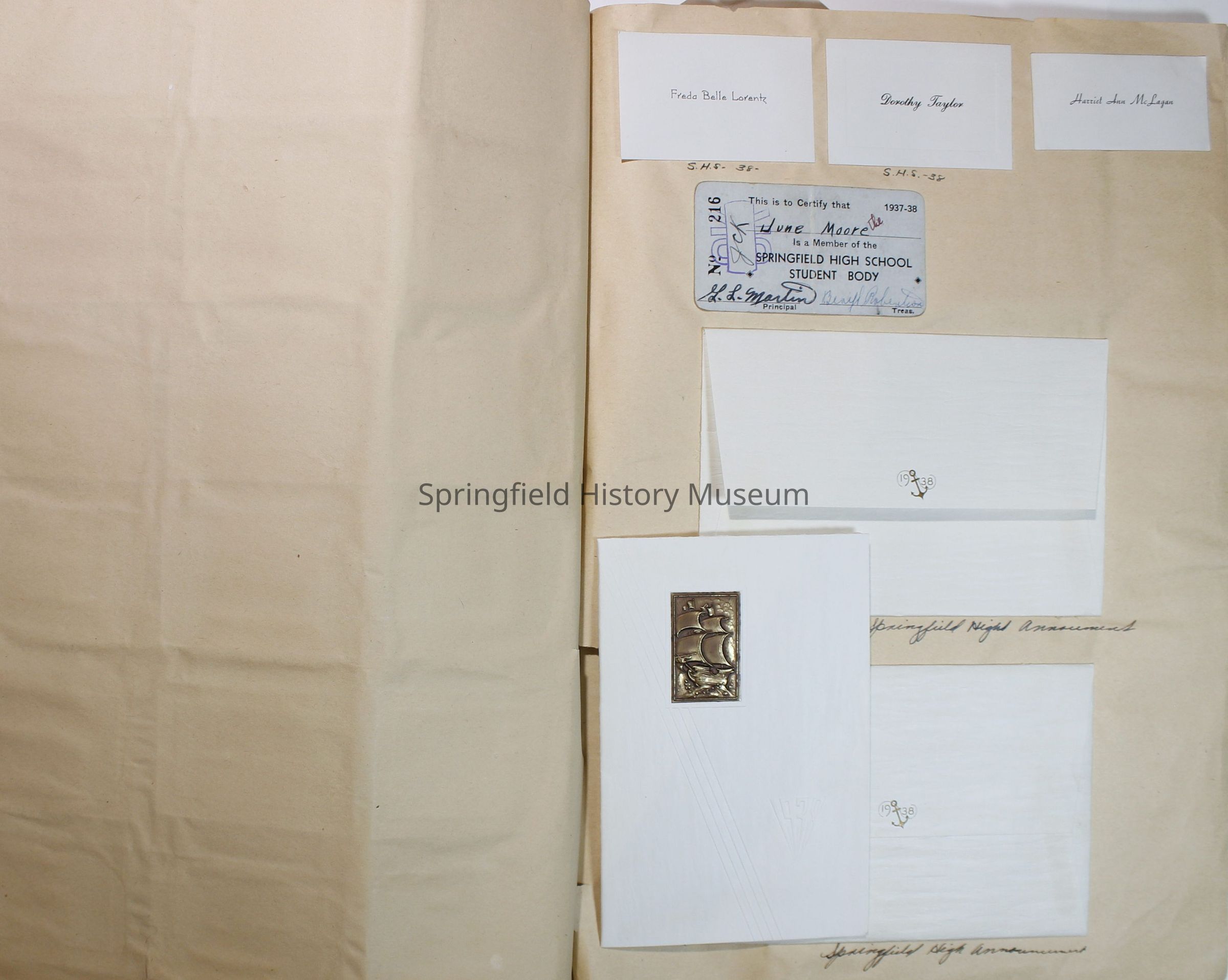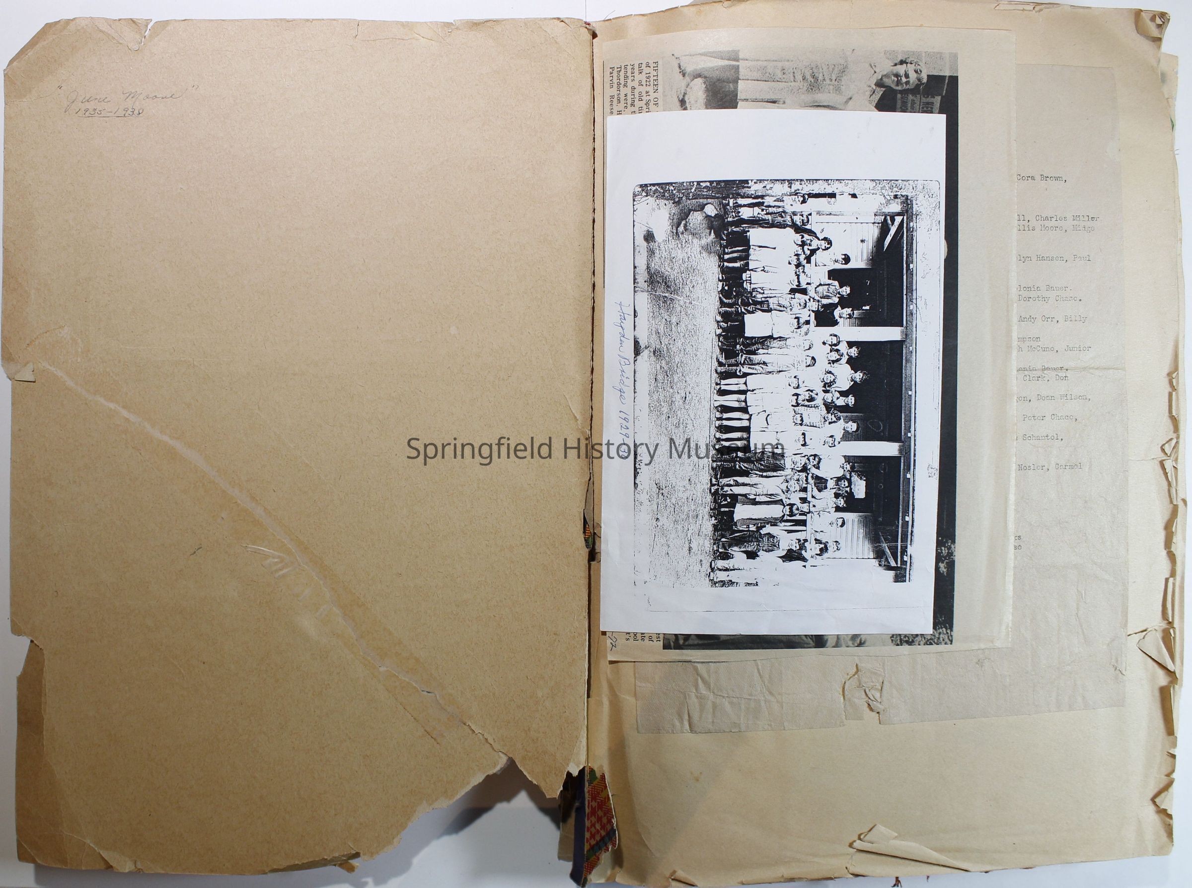 Scrapbook created by June Moore McPherson during her time at Springfield High School. This is volume one of two volumes of scrapbooks. Includes newspaper clippings, postcards, paper ephemera, and other artifacts related to Springfield High School beginning with her freshman year in 1935.