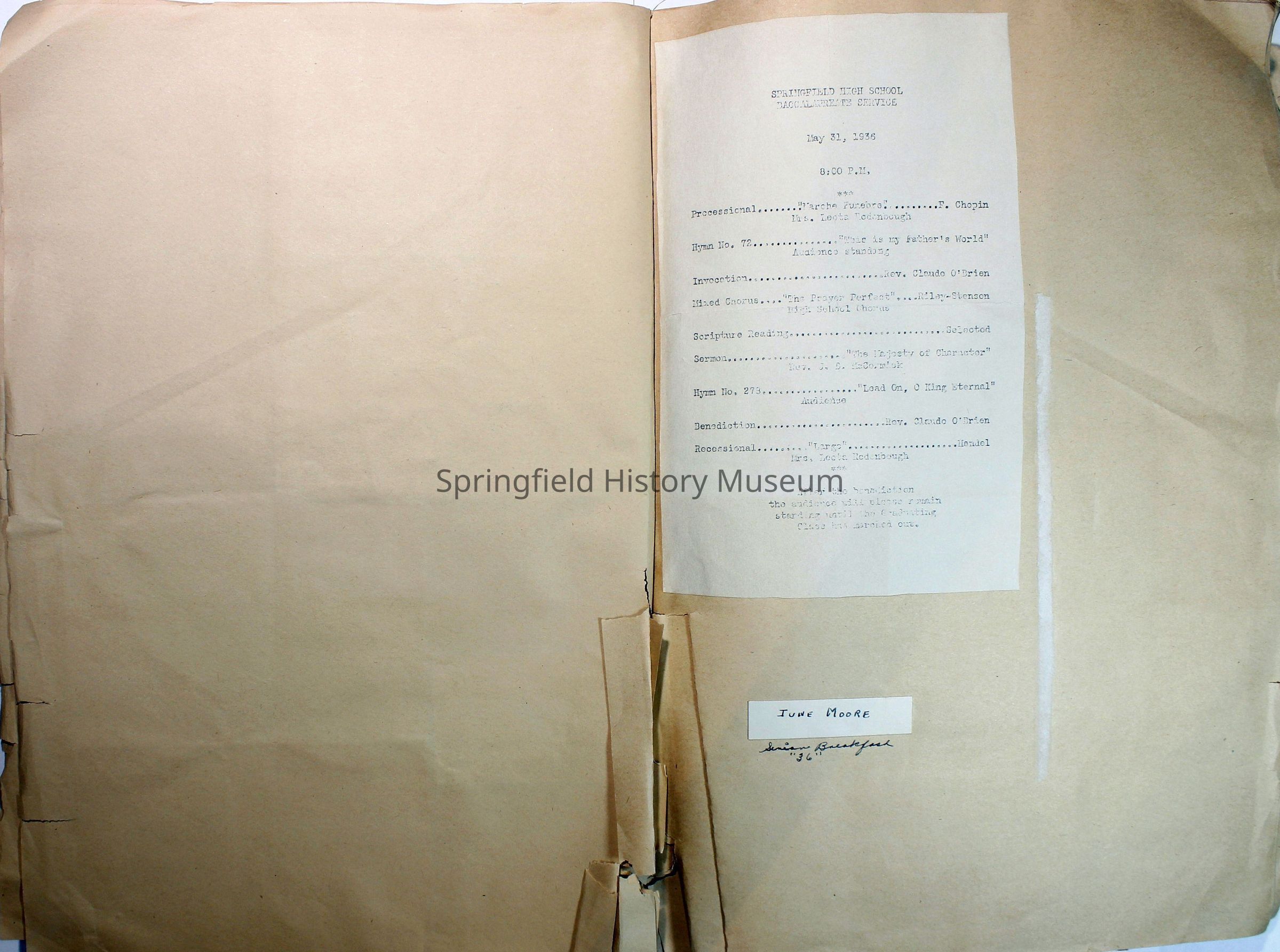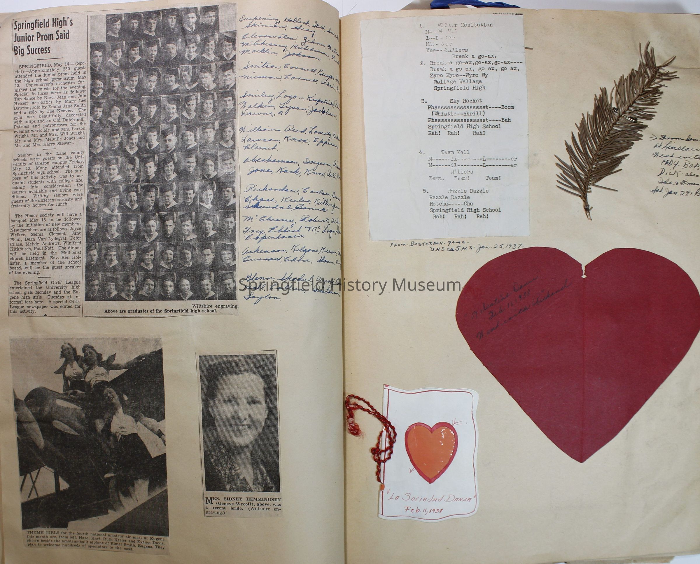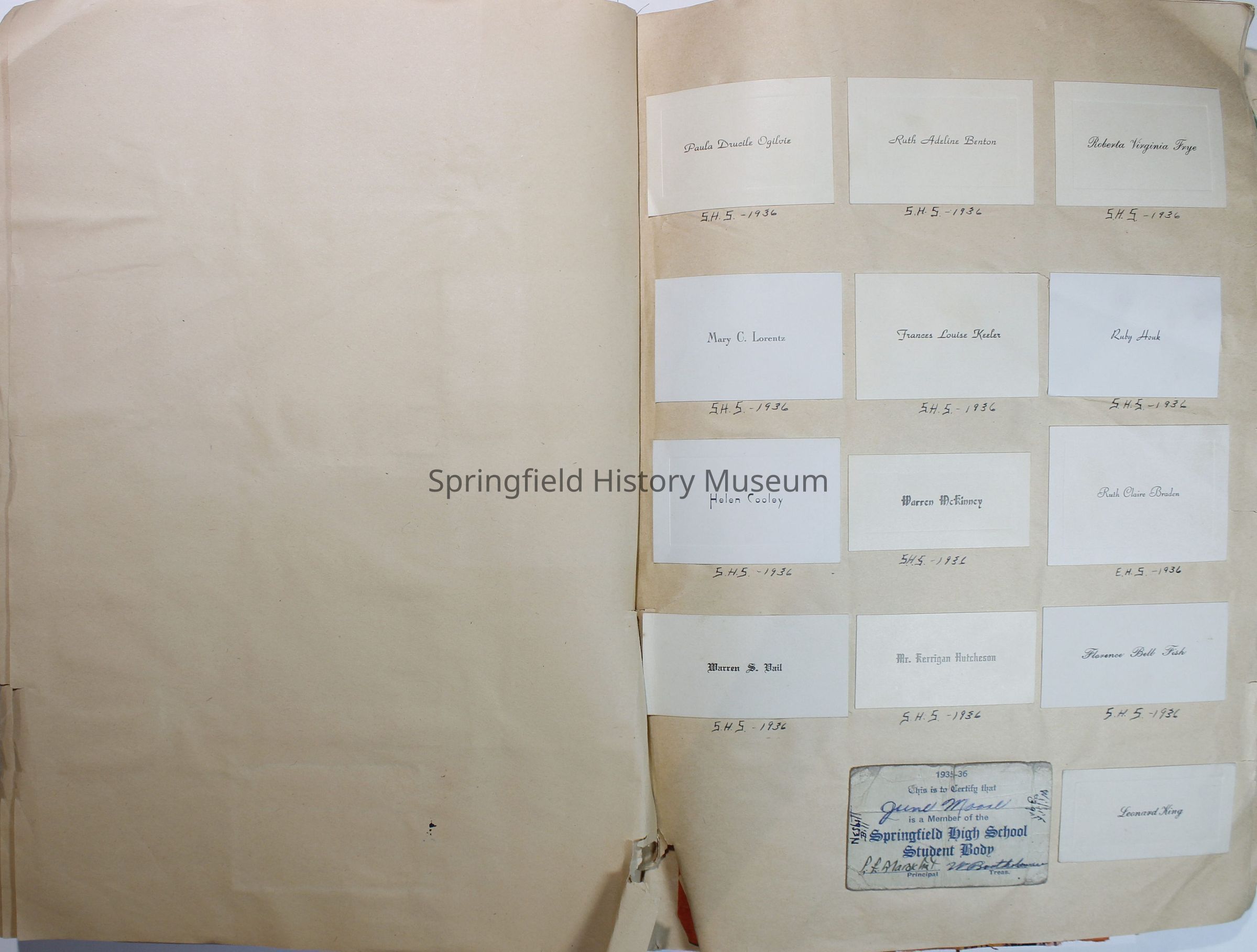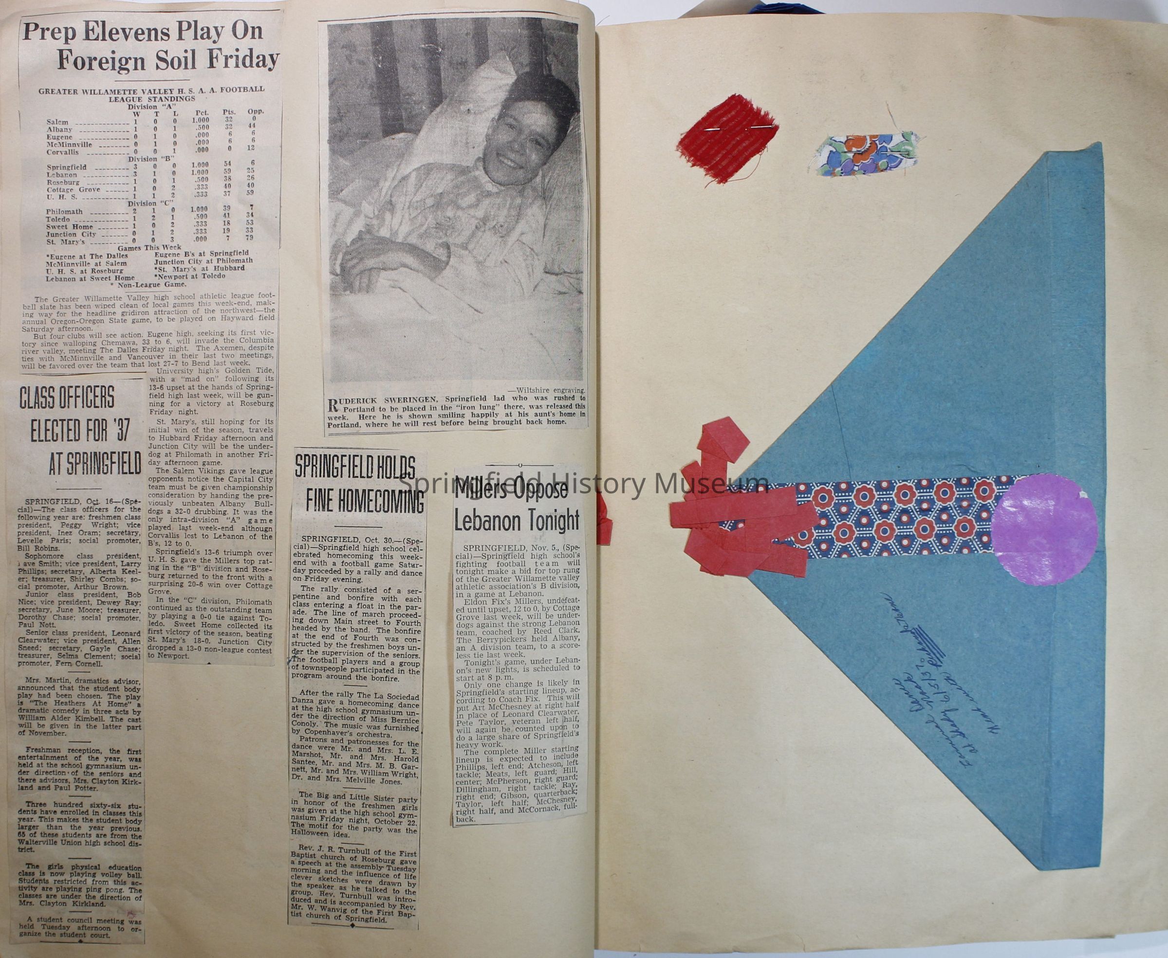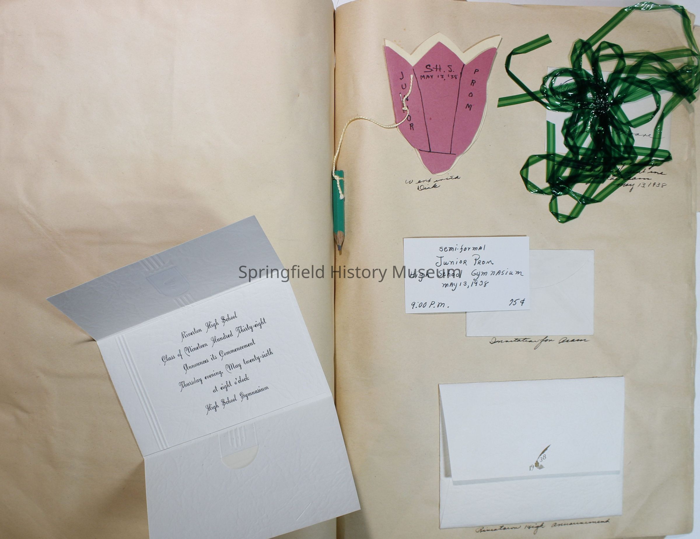 Scrapbook created by June Moore McPherson during her time at Springfield High School. This is volume one of two volumes of scrapbooks. Includes newspaper clippings, postcards, paper ephemera, and other artifacts related to Springfield High School beginning with her freshman year in 1935.