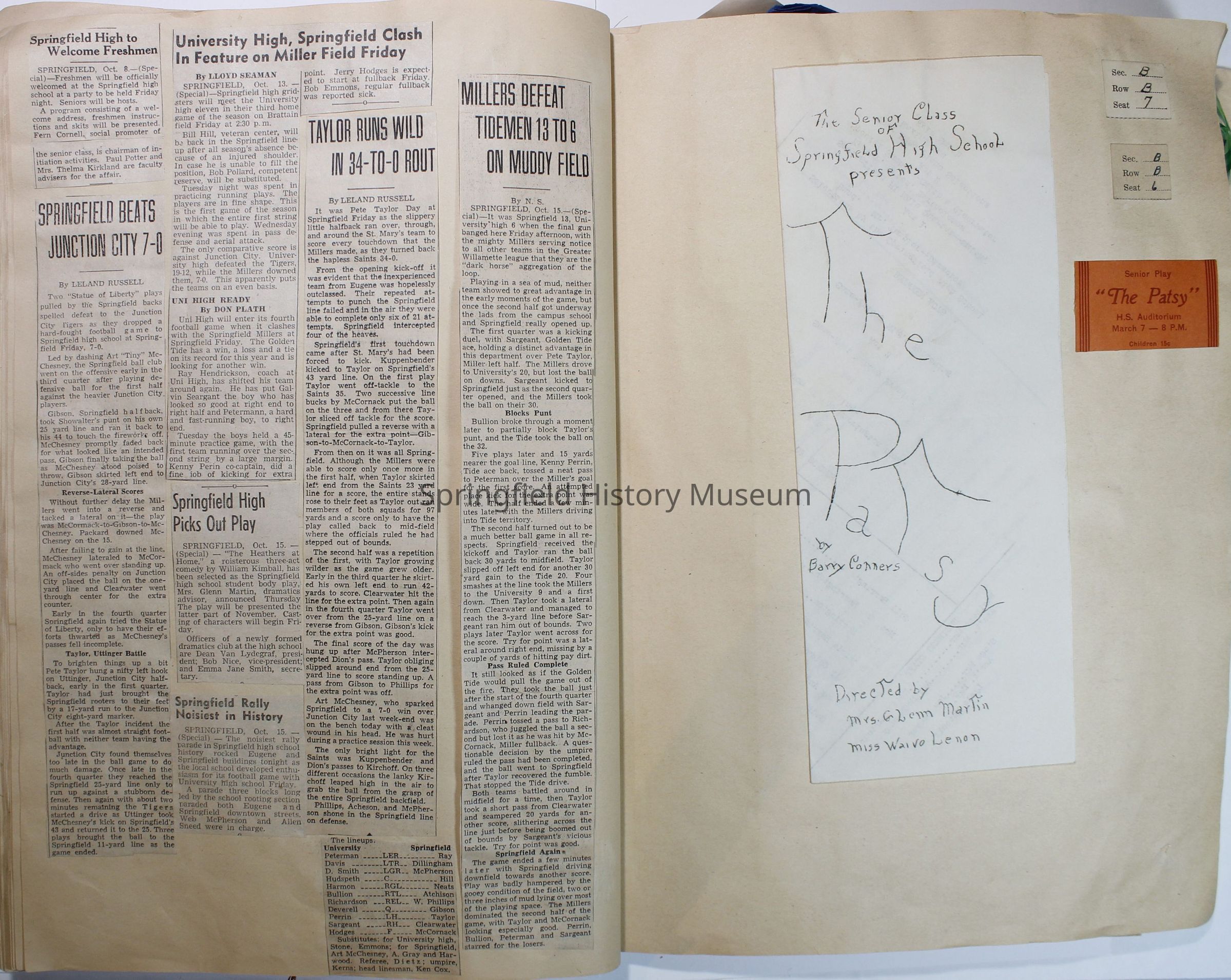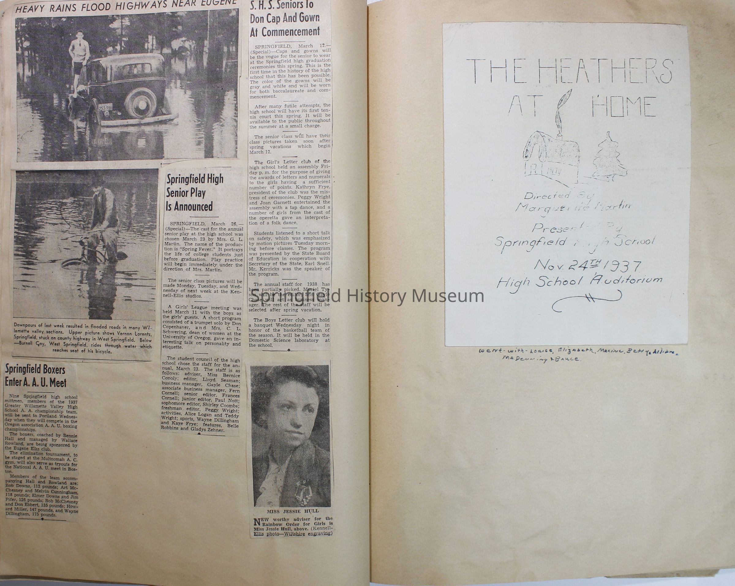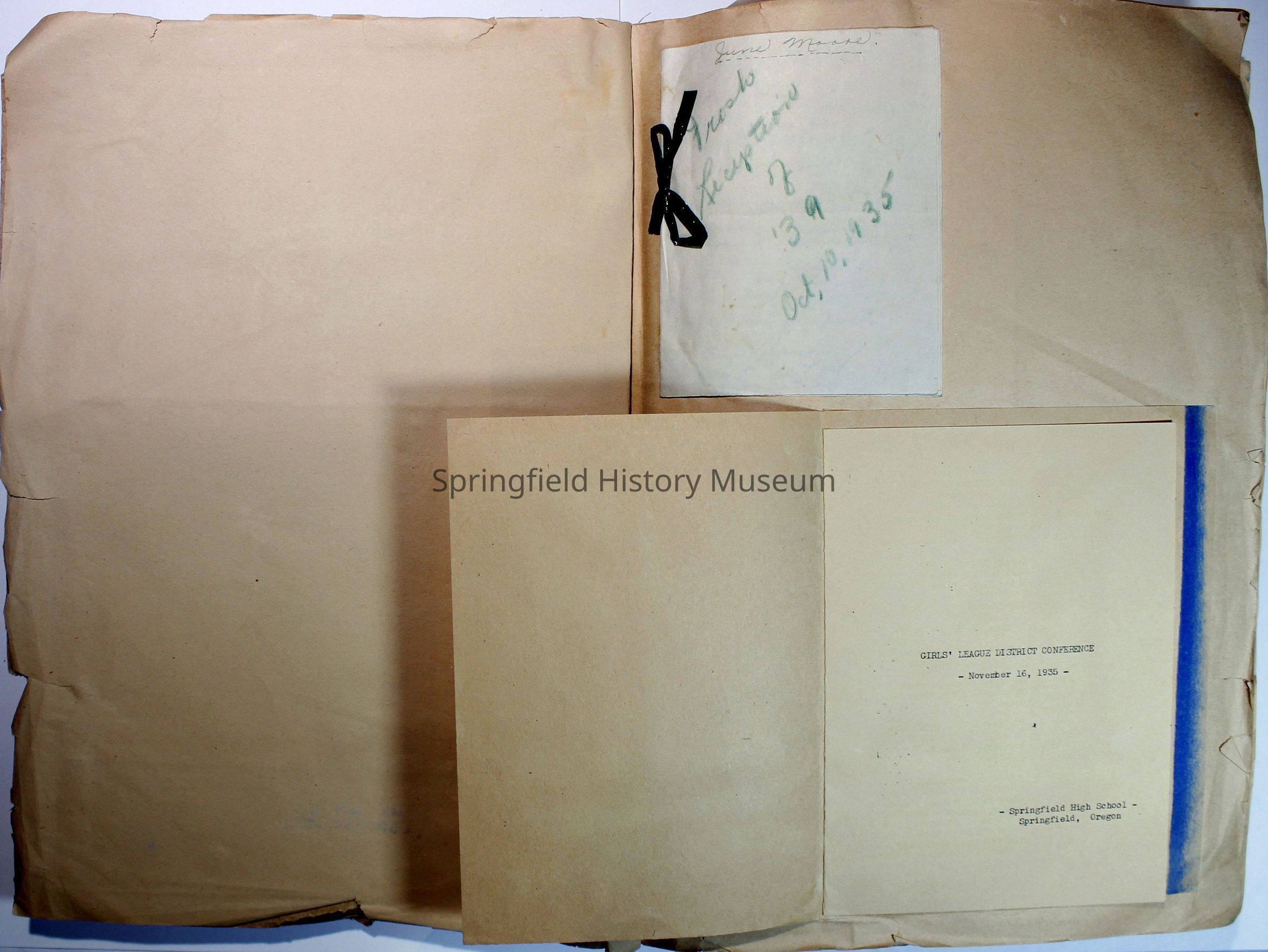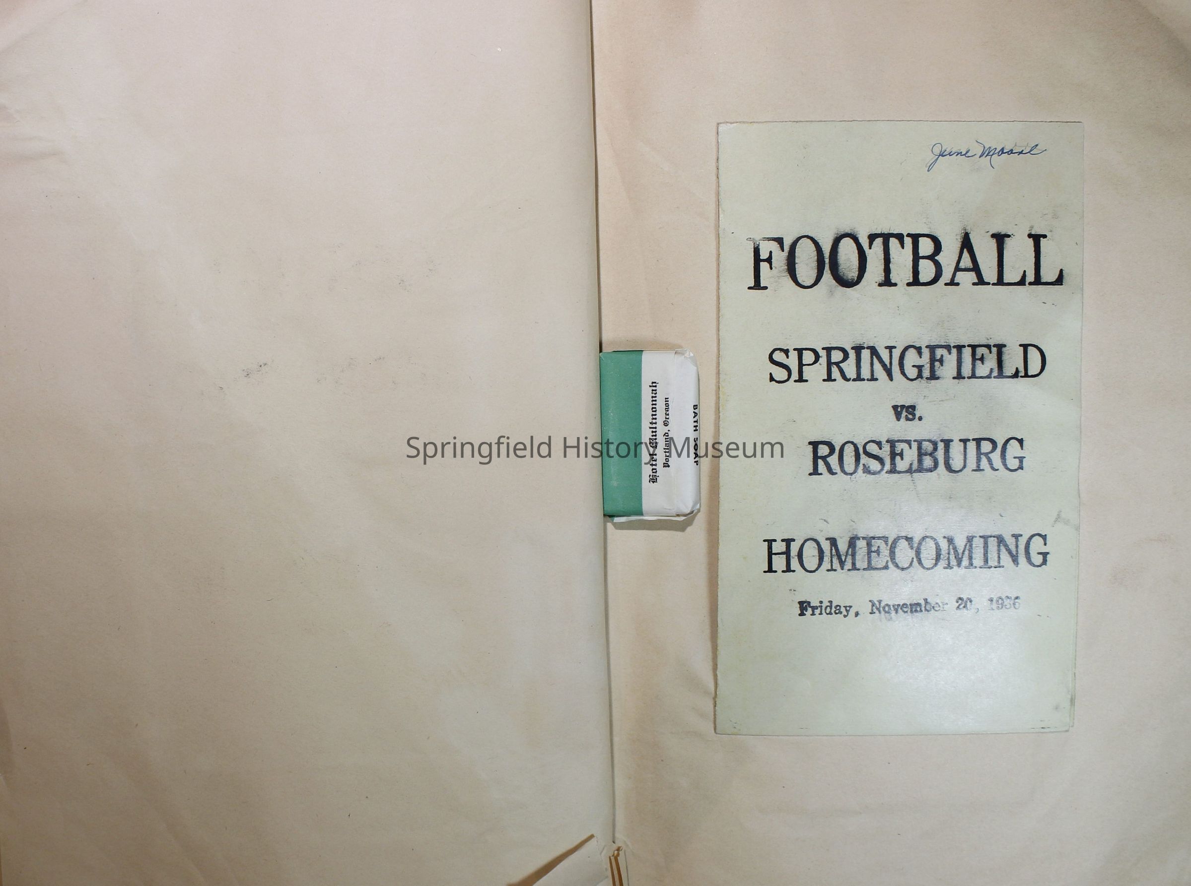 Scrapbook created by June Moore McPherson during her time at Springfield High School. This is volume one of two volumes of scrapbooks. Includes newspaper clippings, postcards, paper ephemera, and other artifacts related to Springfield High School beginning with her freshman year in 1935.