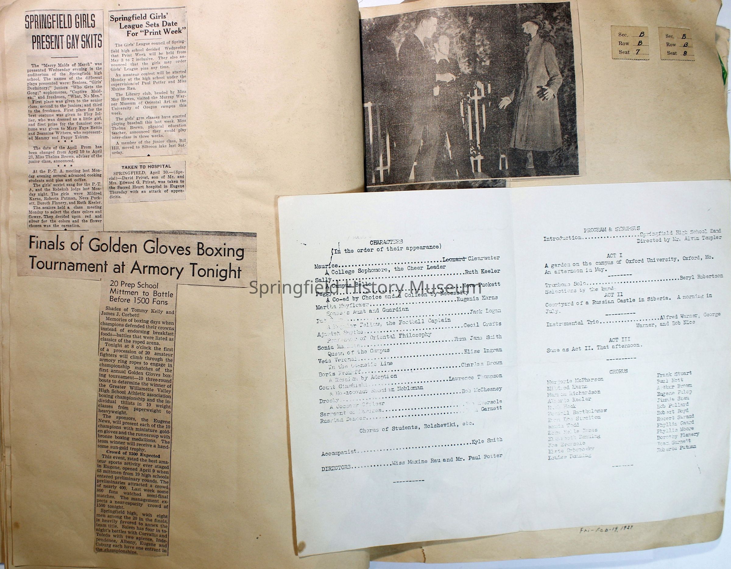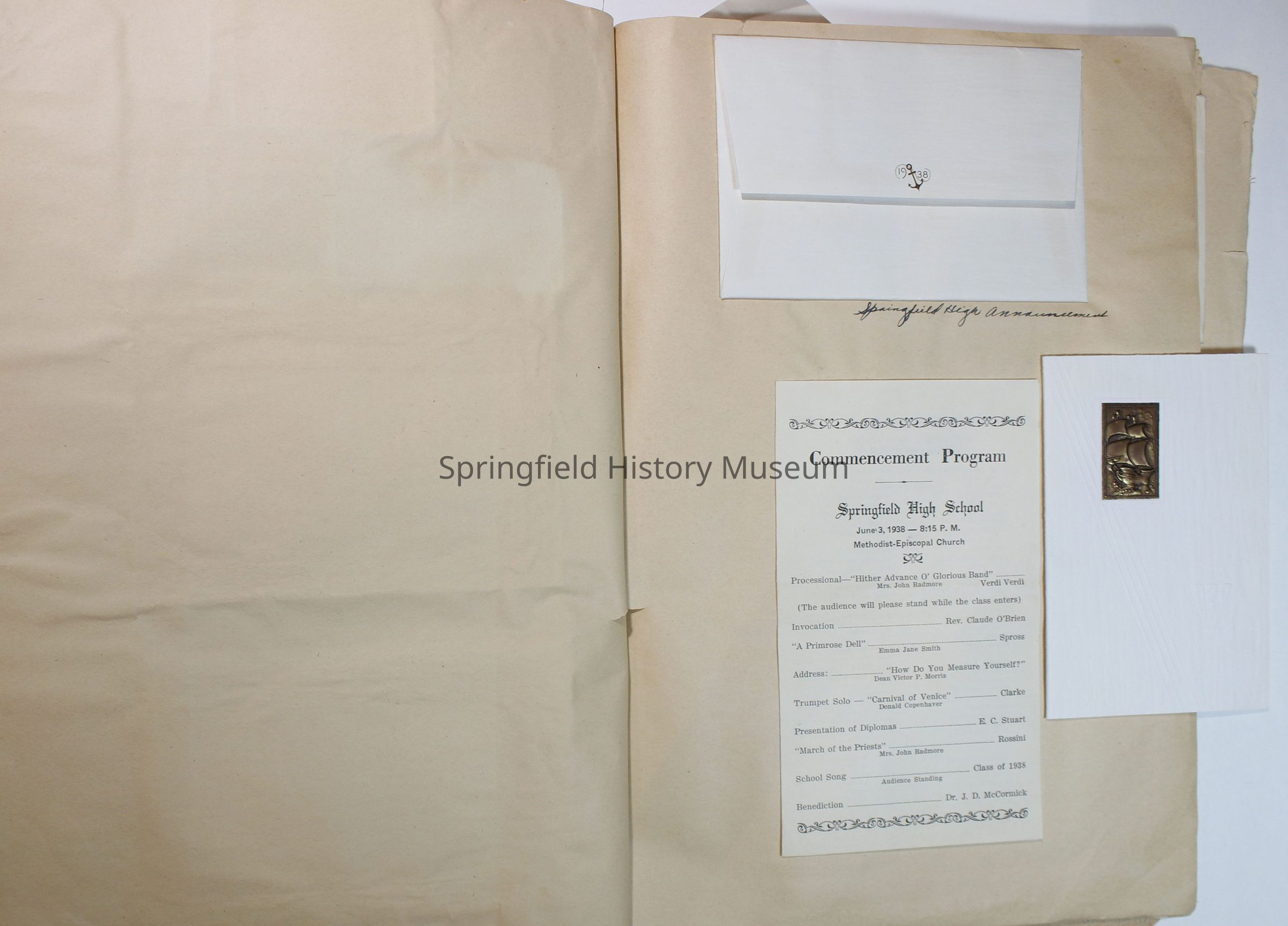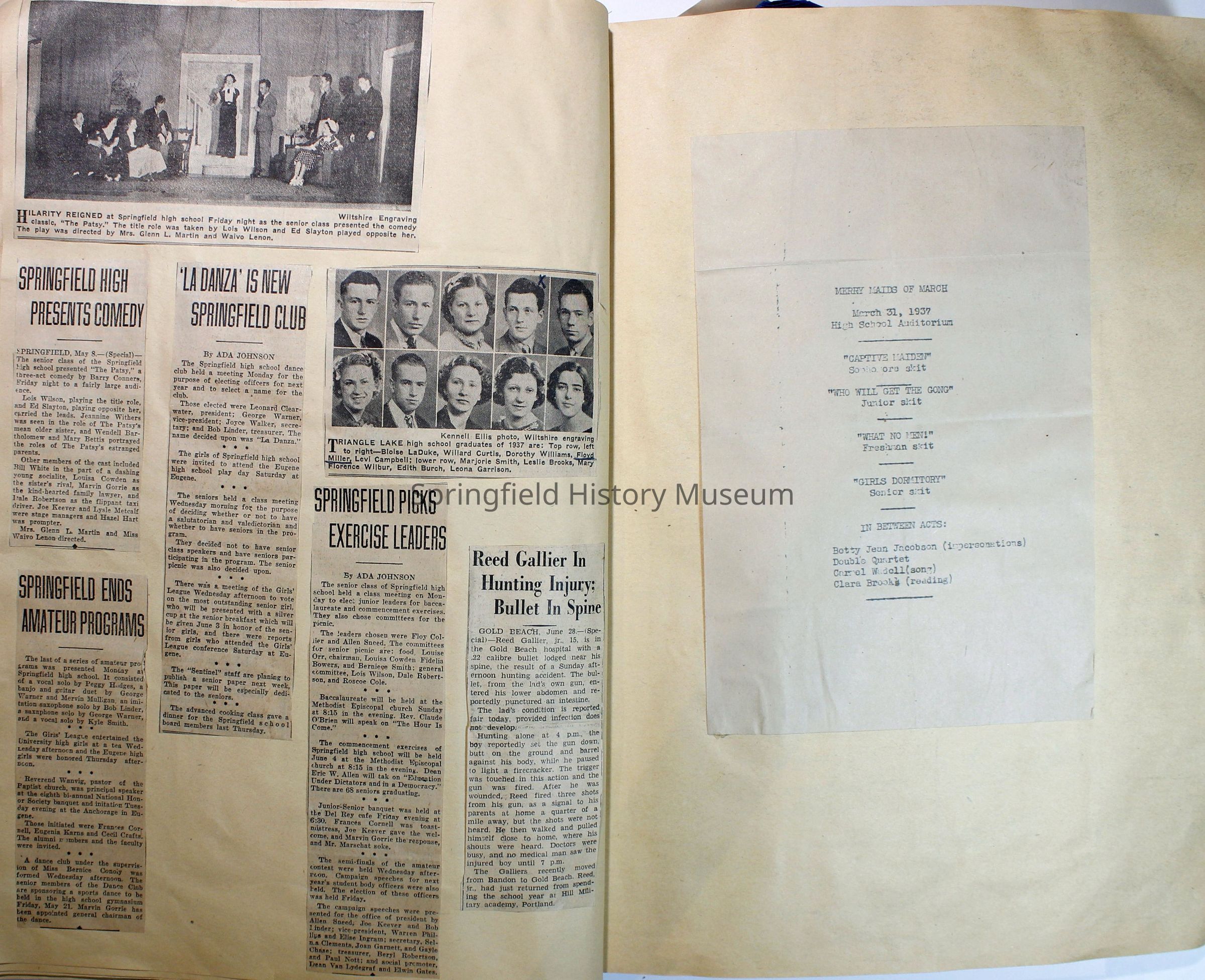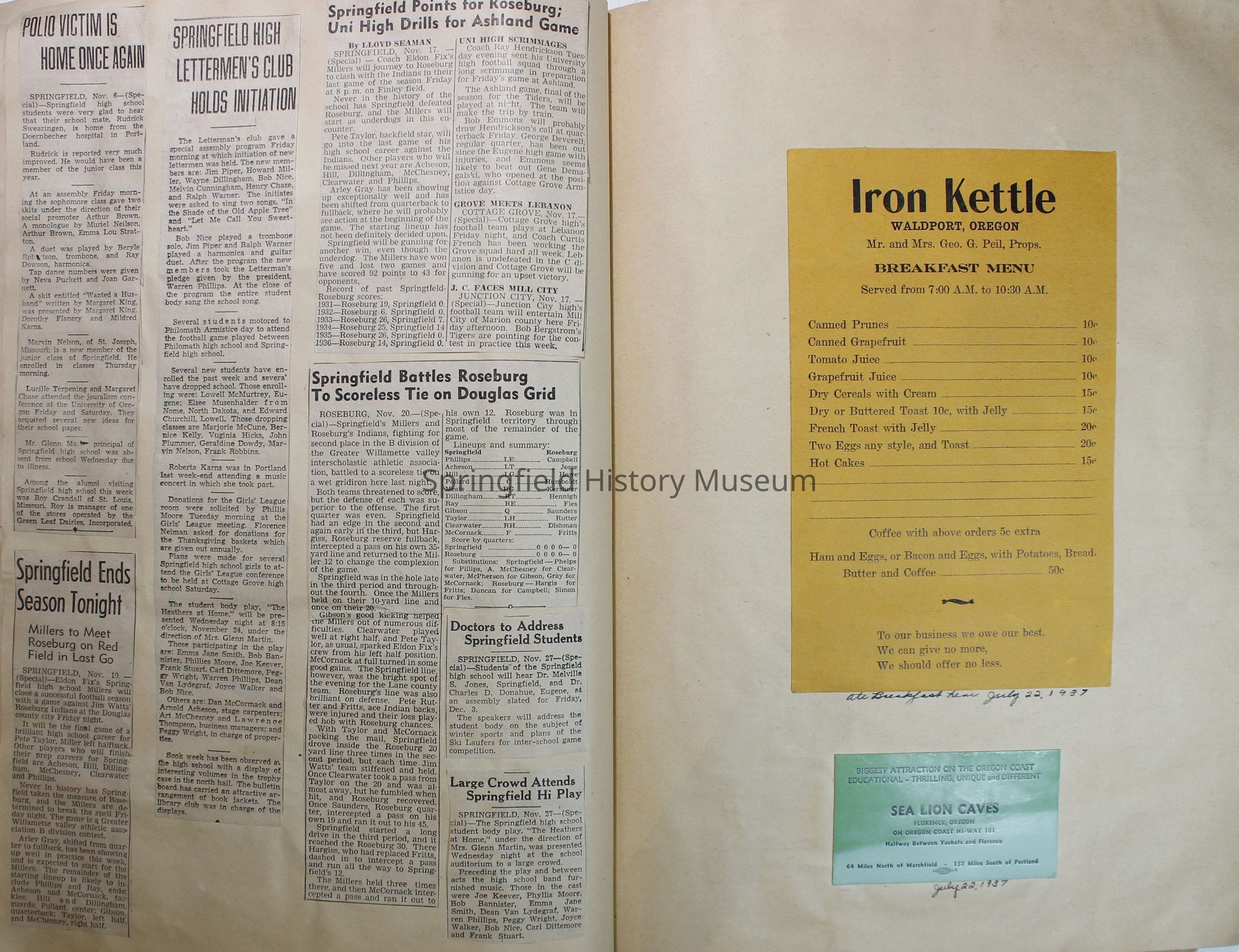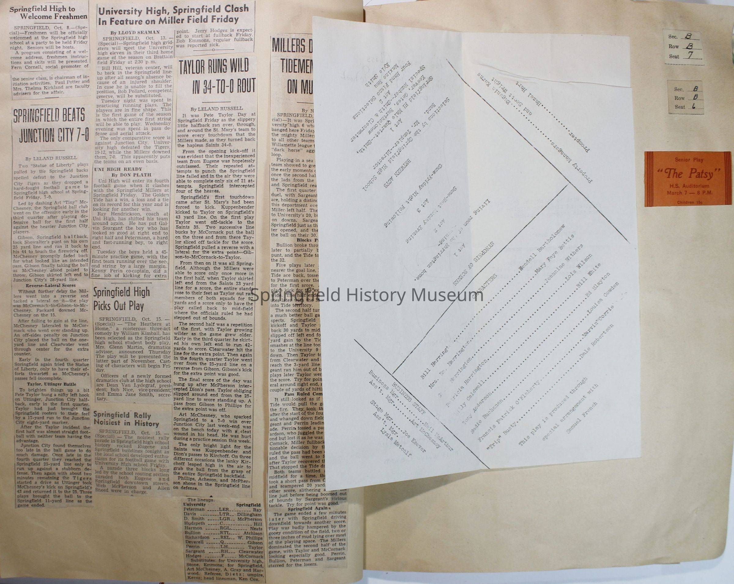 Scrapbook created by June Moore McPherson during her time at Springfield High School. This is volume one of two volumes of scrapbooks. Includes newspaper clippings, postcards, paper ephemera, and other artifacts related to Springfield High School beginning with her freshman year in 1935.