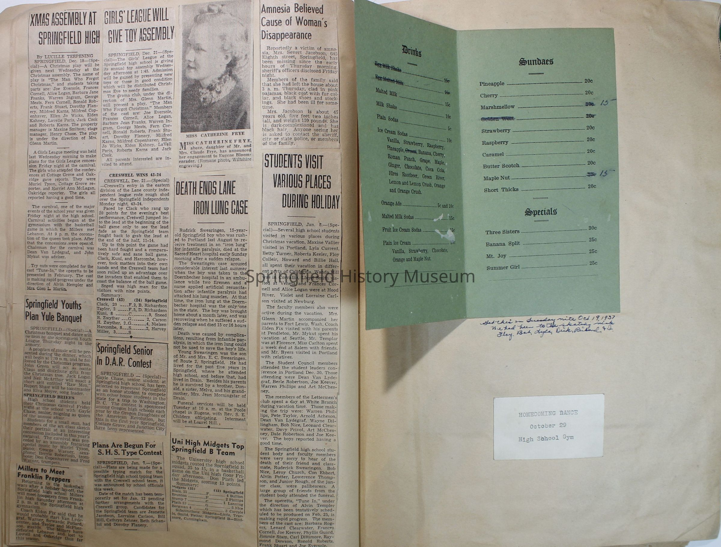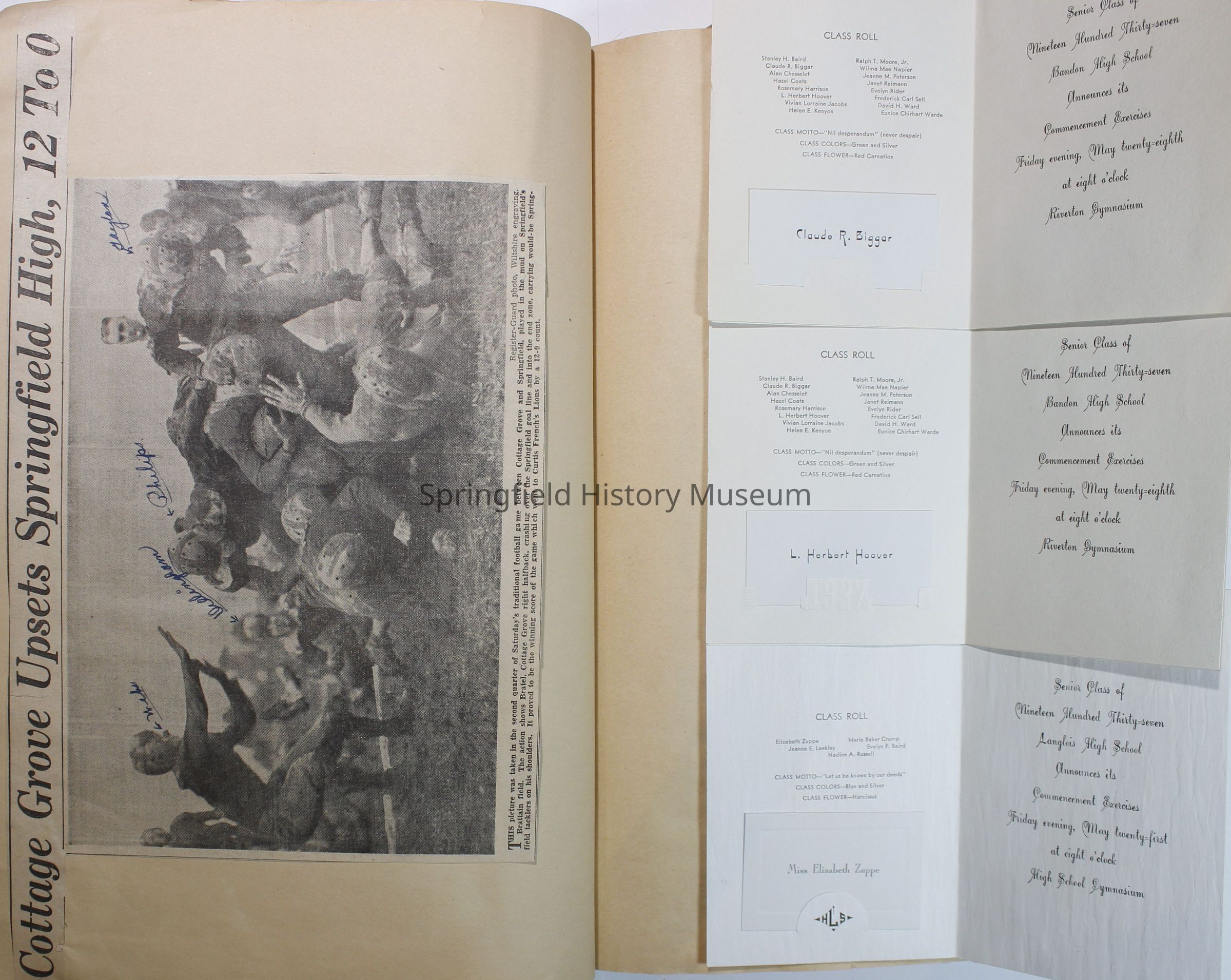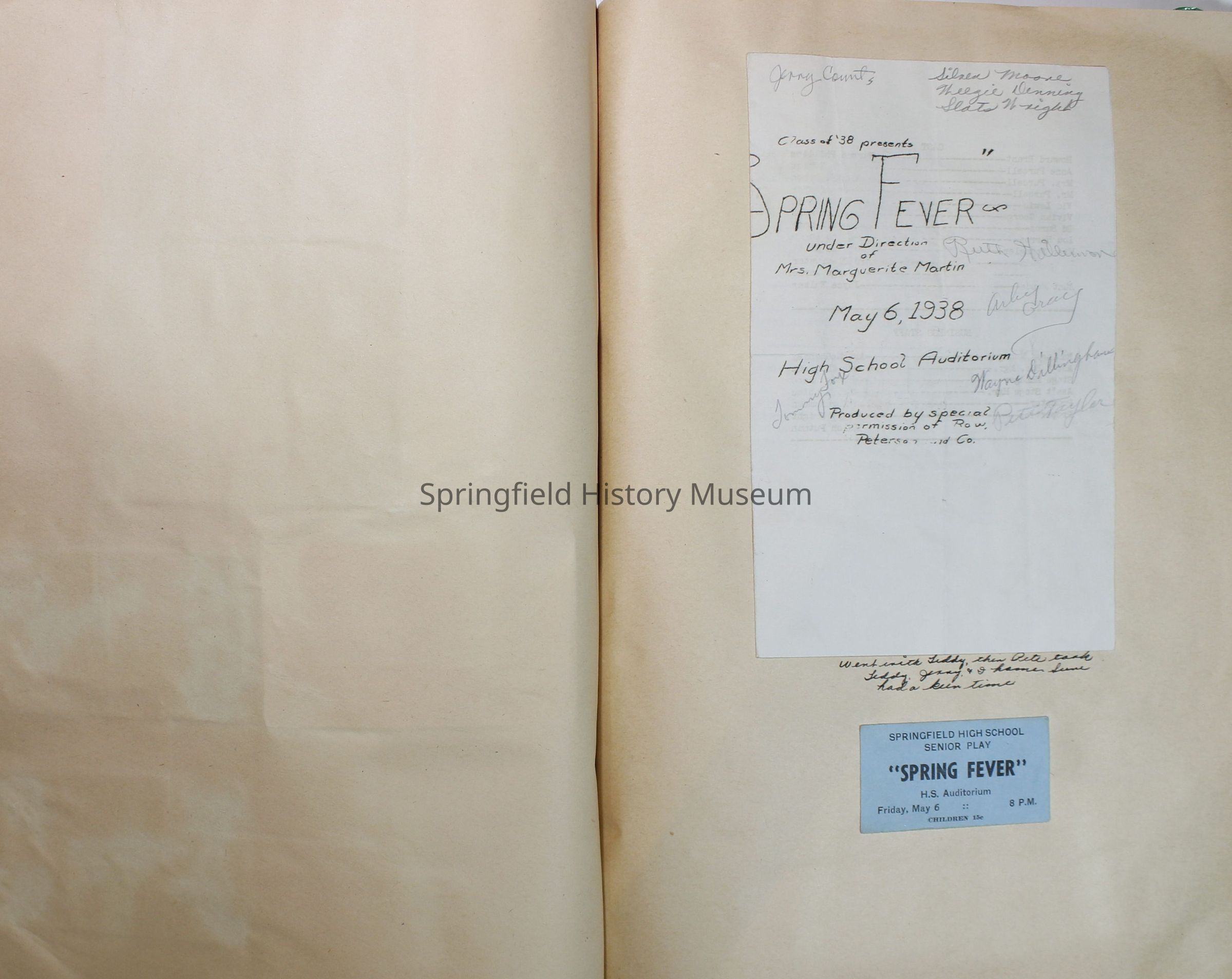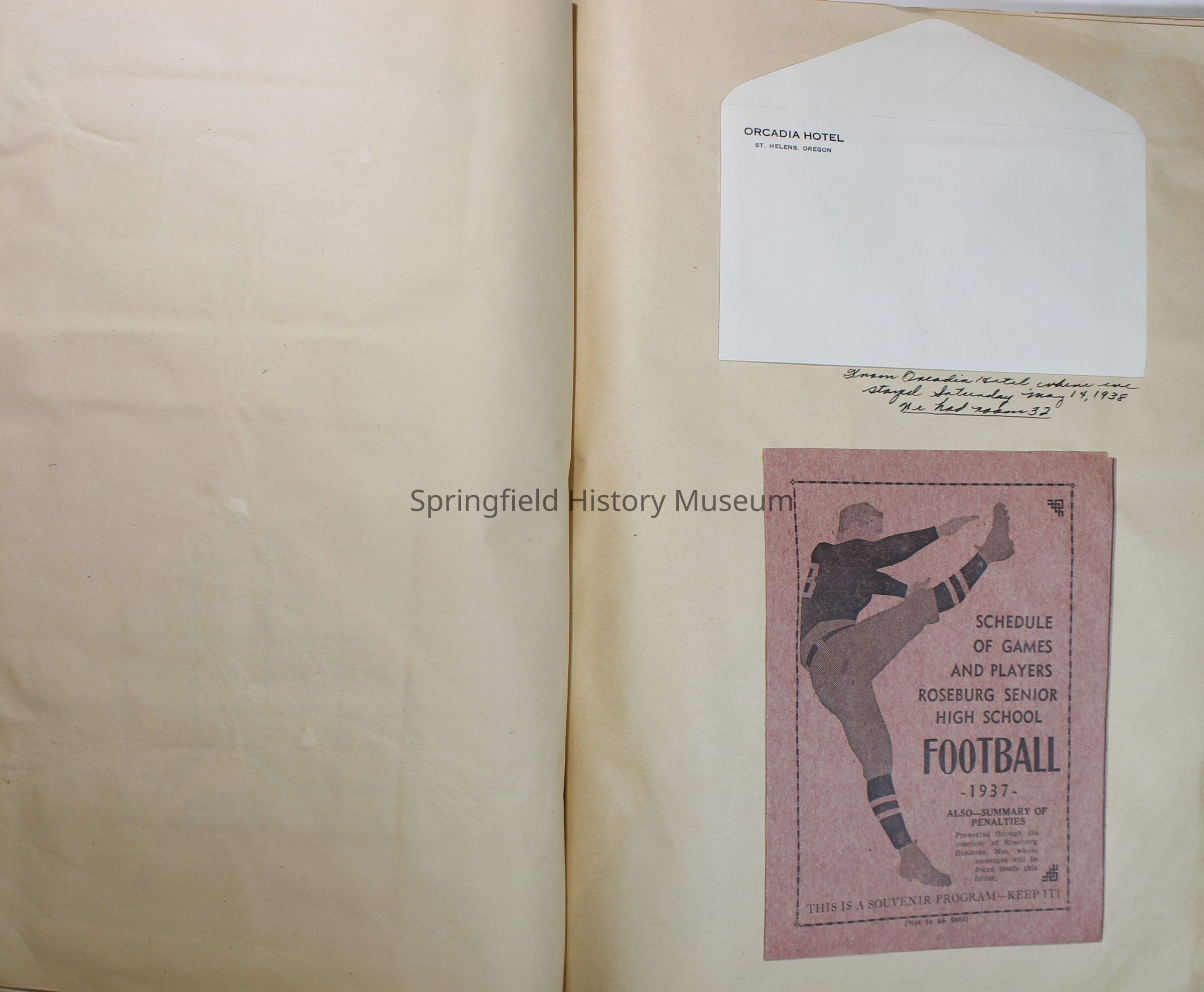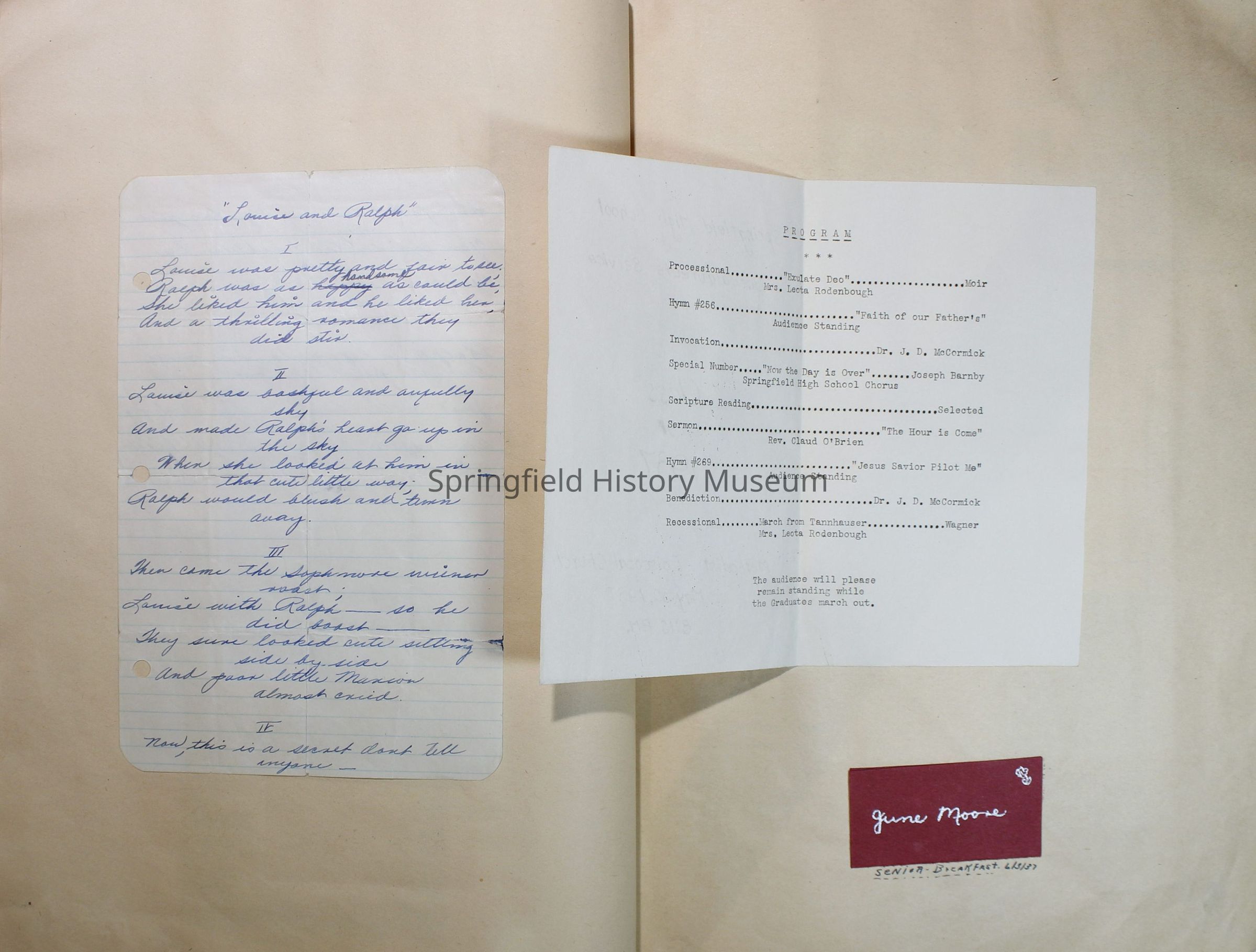 Scrapbook created by June Moore McPherson during her time at Springfield High School. This is volume one of two volumes of scrapbooks. Includes newspaper clippings, postcards, paper ephemera, and other artifacts related to Springfield High School beginning with her freshman year in 1935.