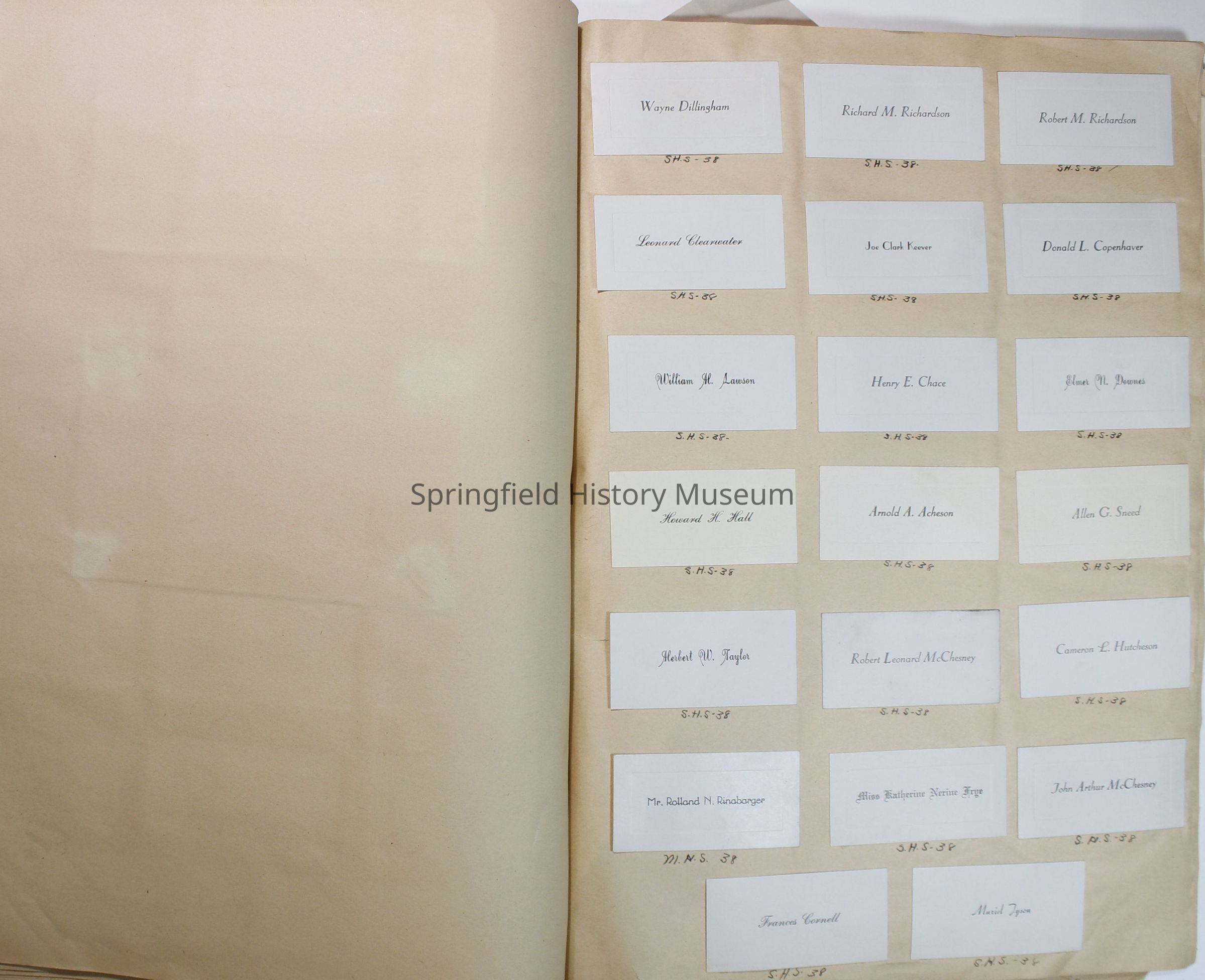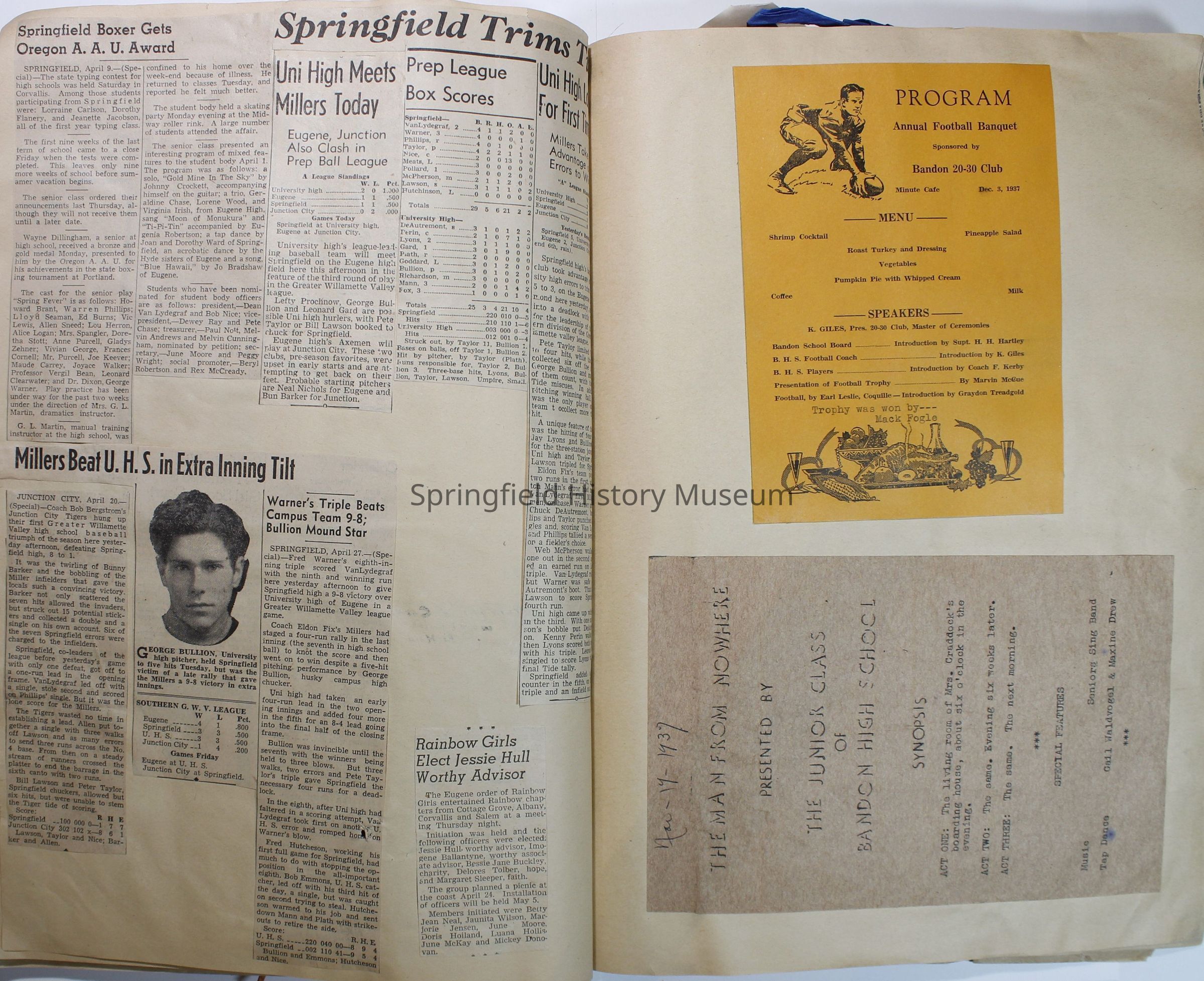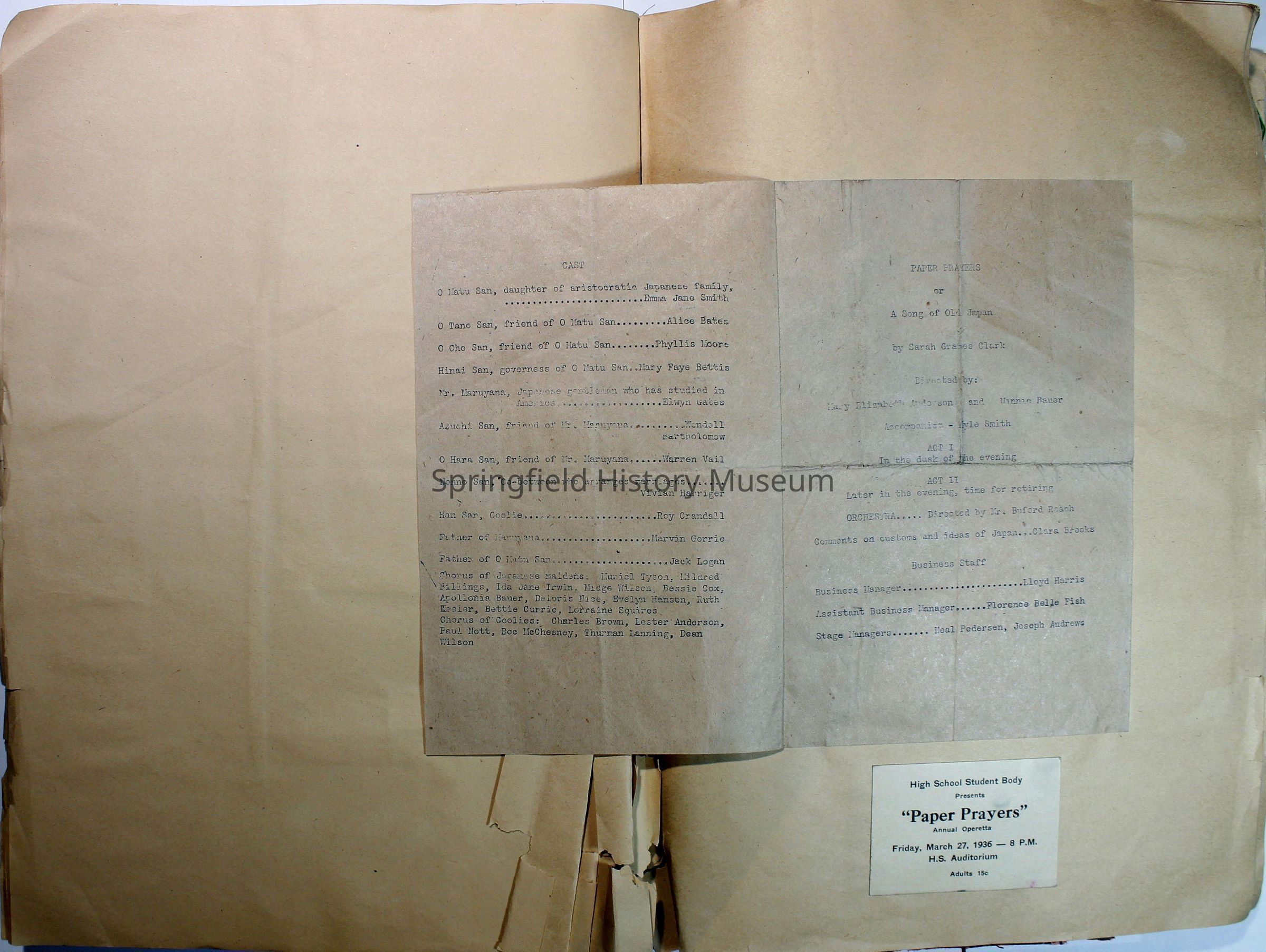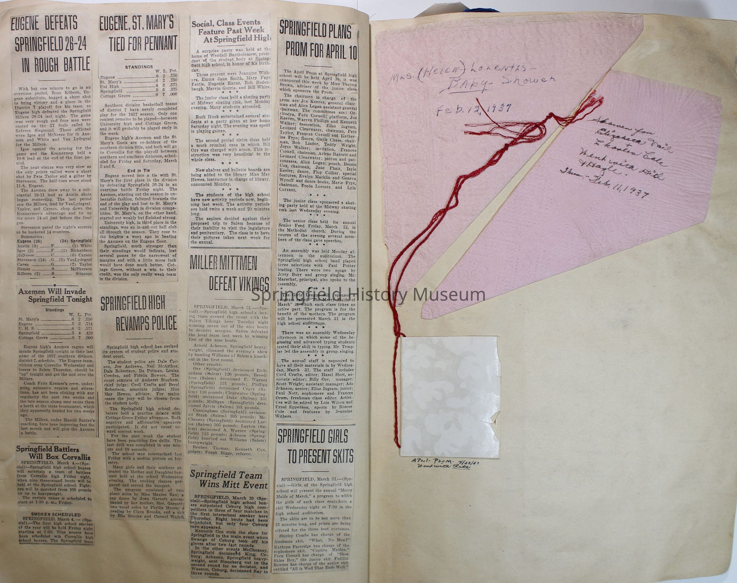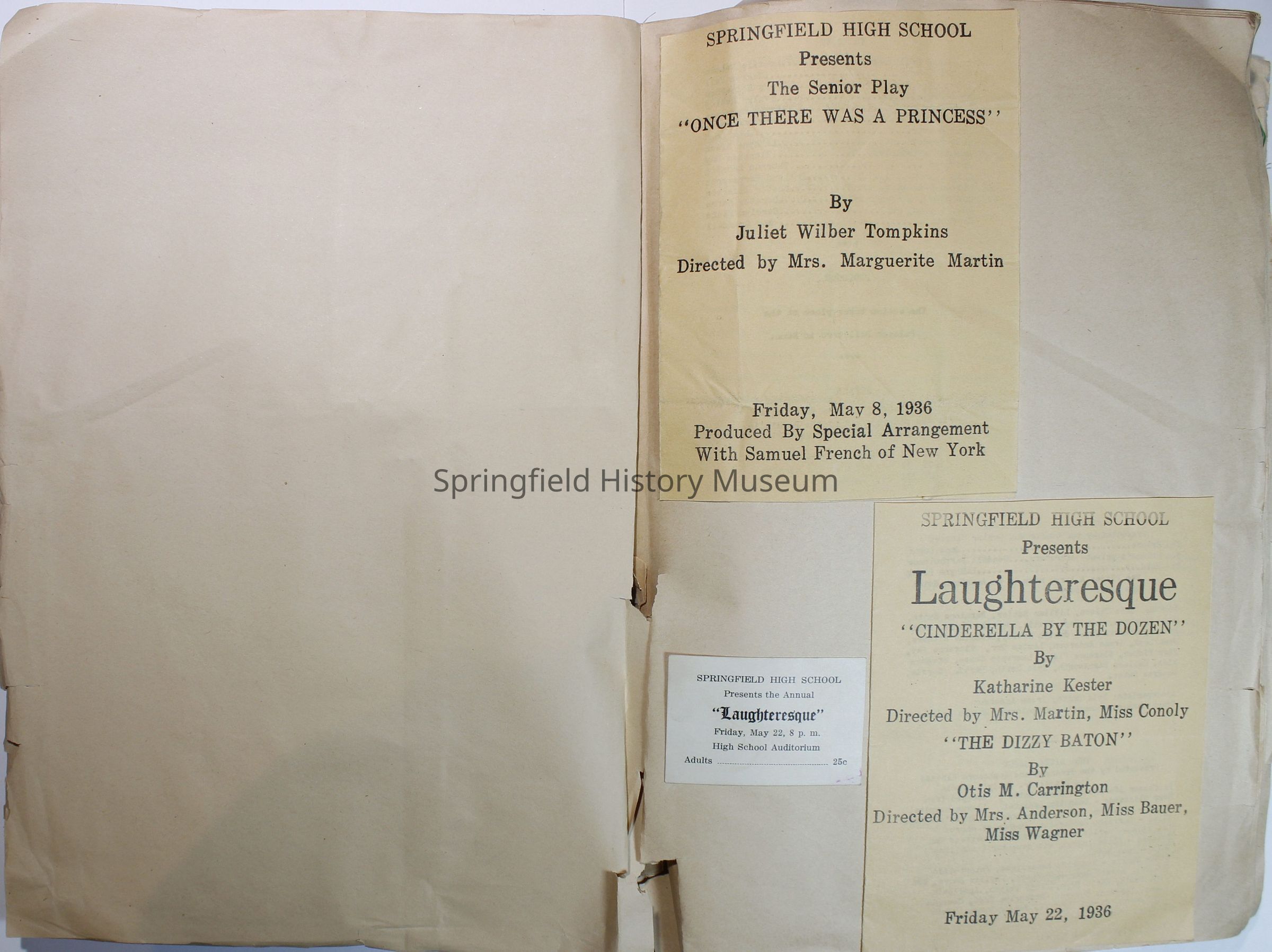 Scrapbook created by June Moore McPherson during her time at Springfield High School. This is volume one of two volumes of scrapbooks. Includes newspaper clippings, postcards, paper ephemera, and other artifacts related to Springfield High School beginning with her freshman year in 1935.