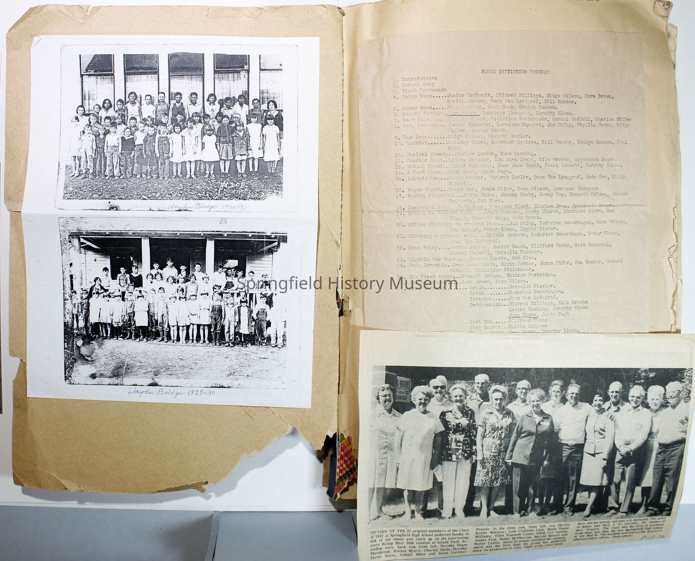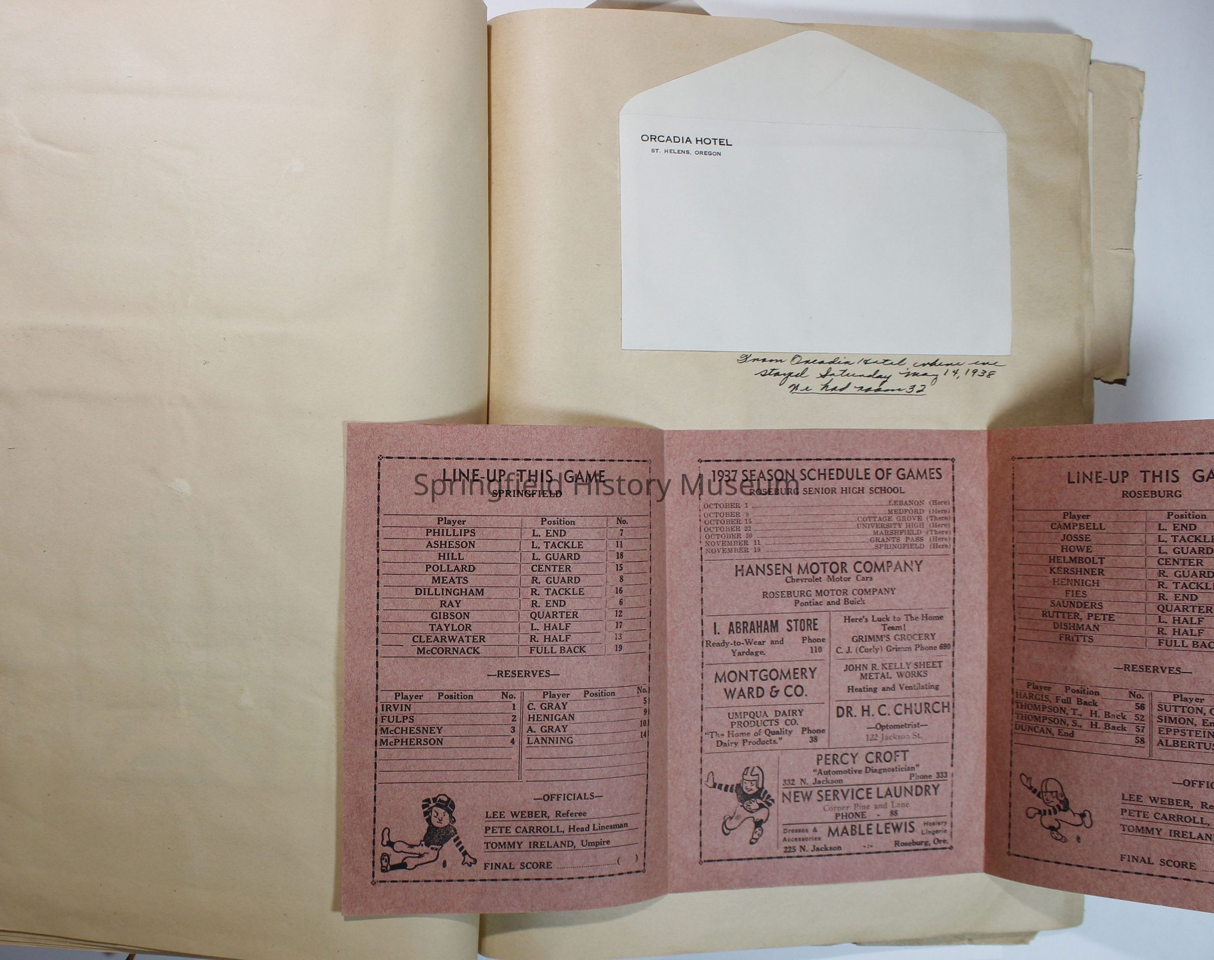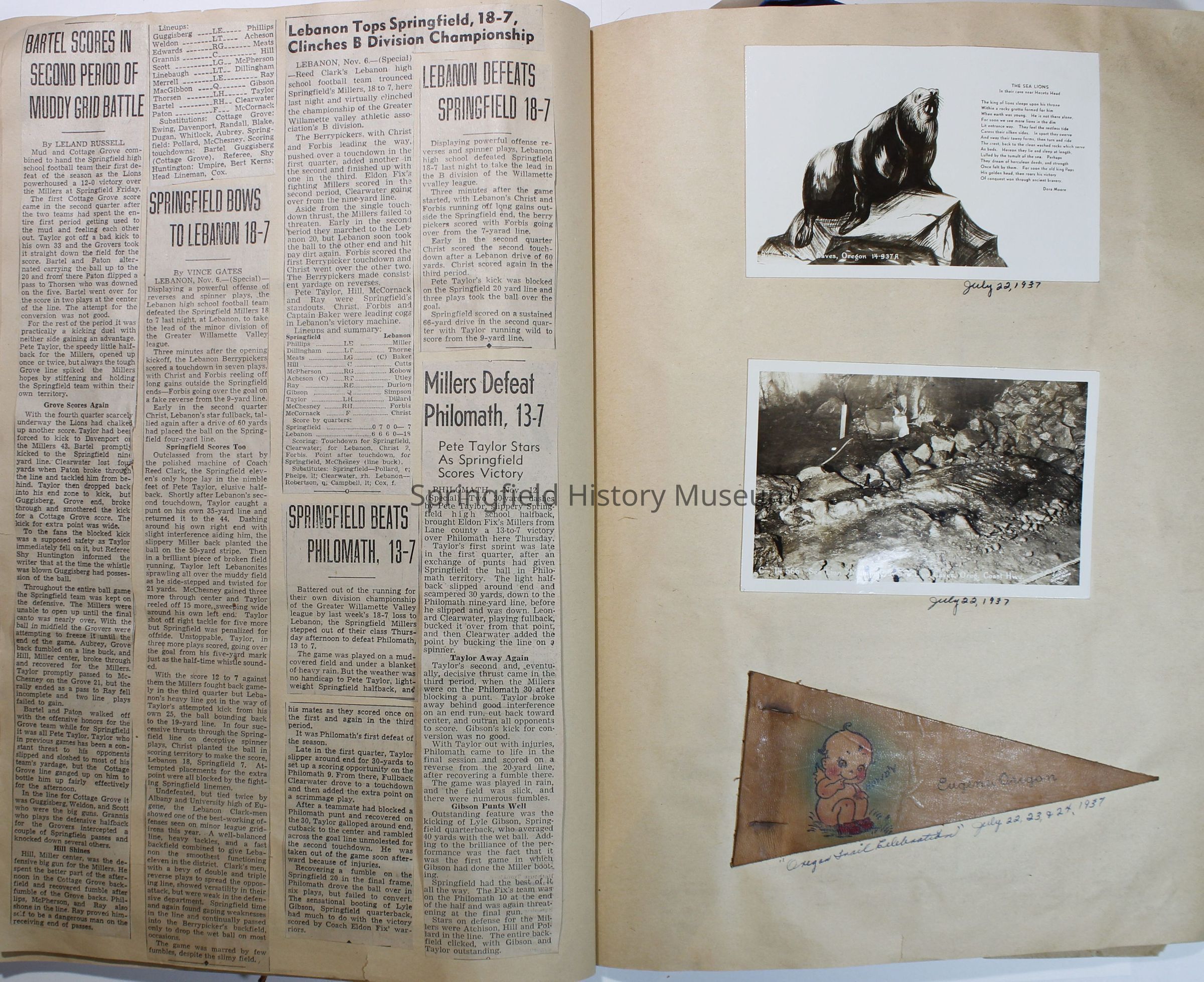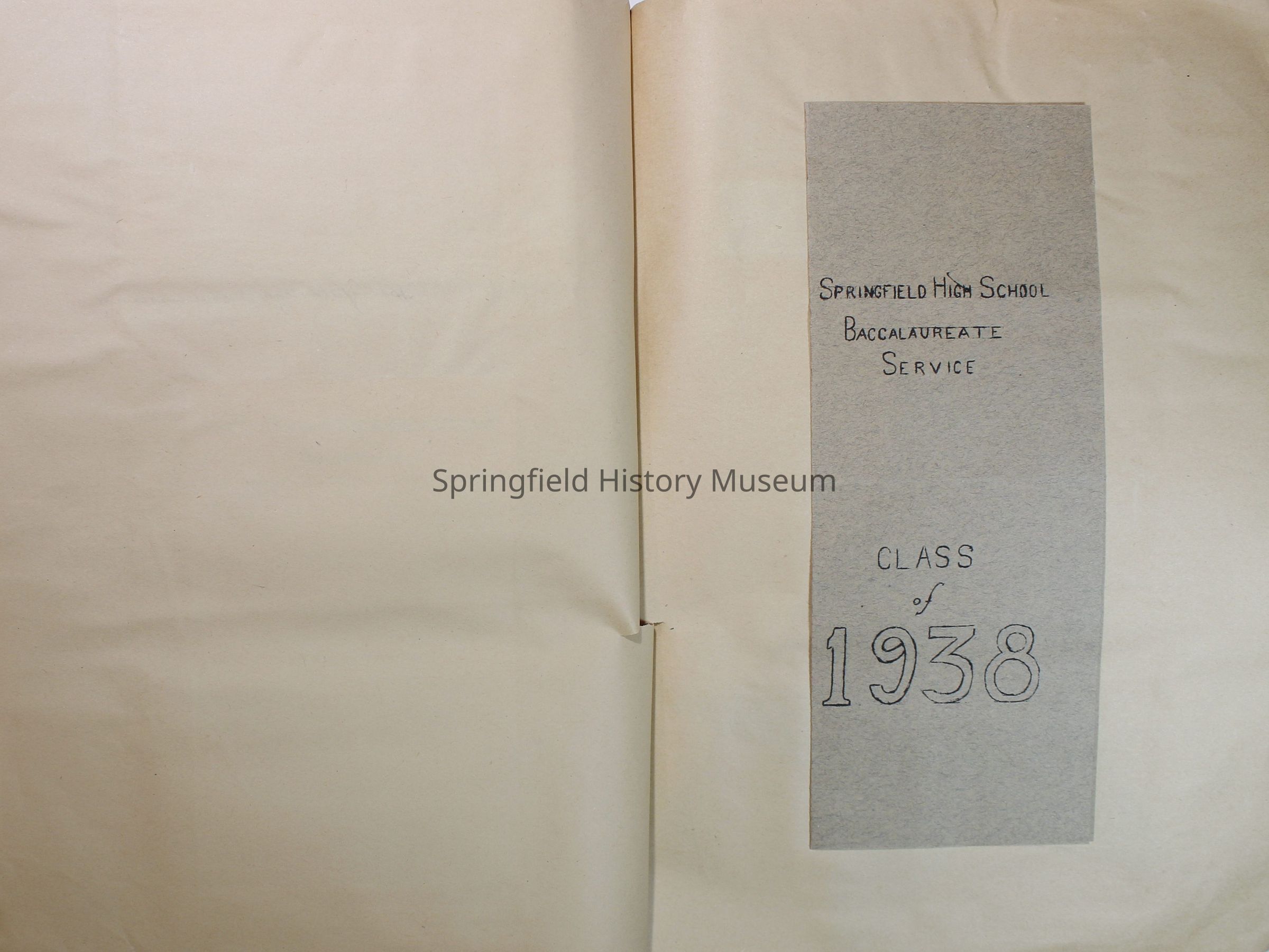 Scrapbook created by June Moore McPherson during her time at Springfield High School. This is volume one of two volumes of scrapbooks. Includes newspaper clippings, postcards, paper ephemera, and other artifacts related to Springfield High School beginning with her freshman year in 1935.