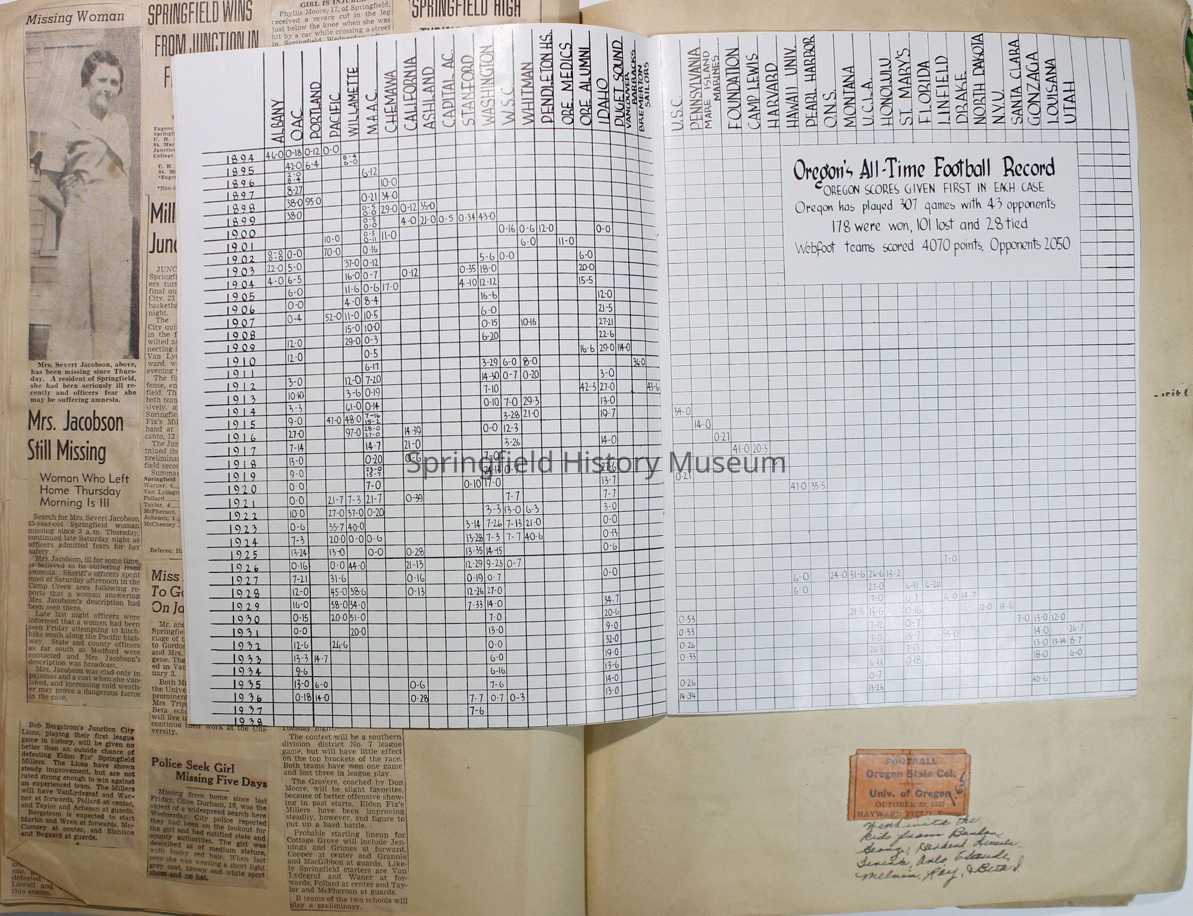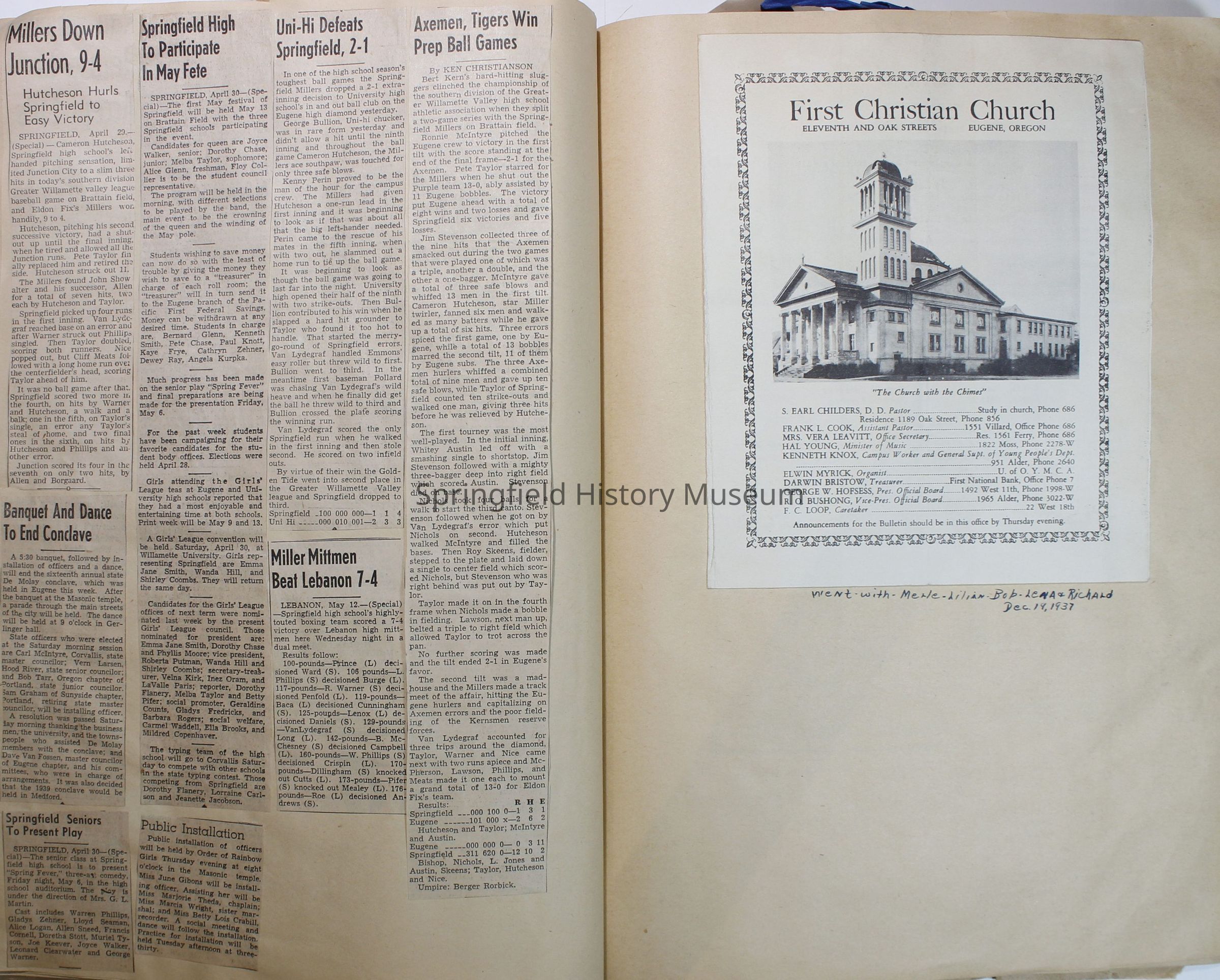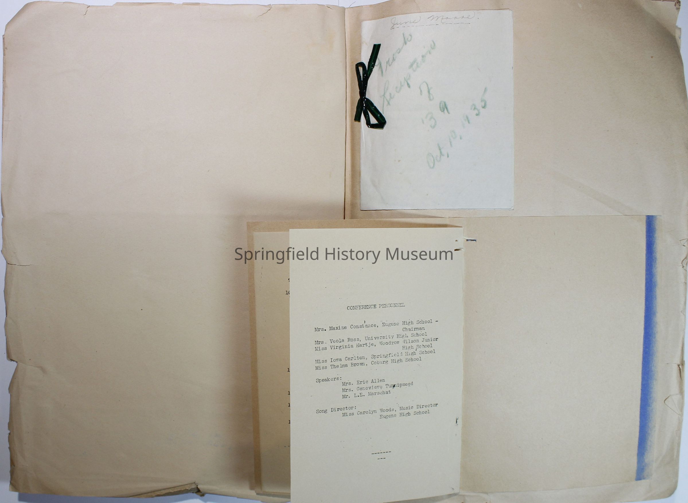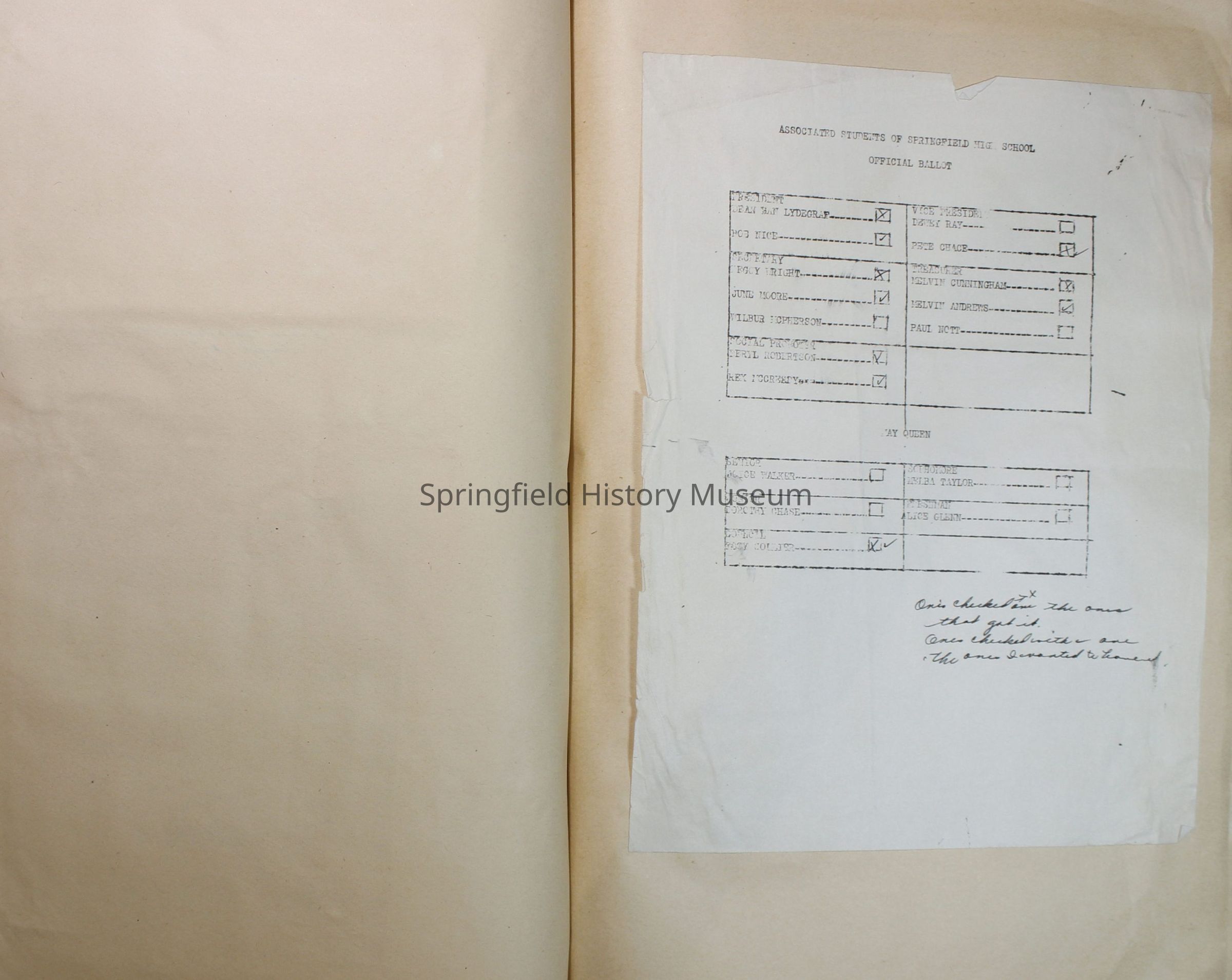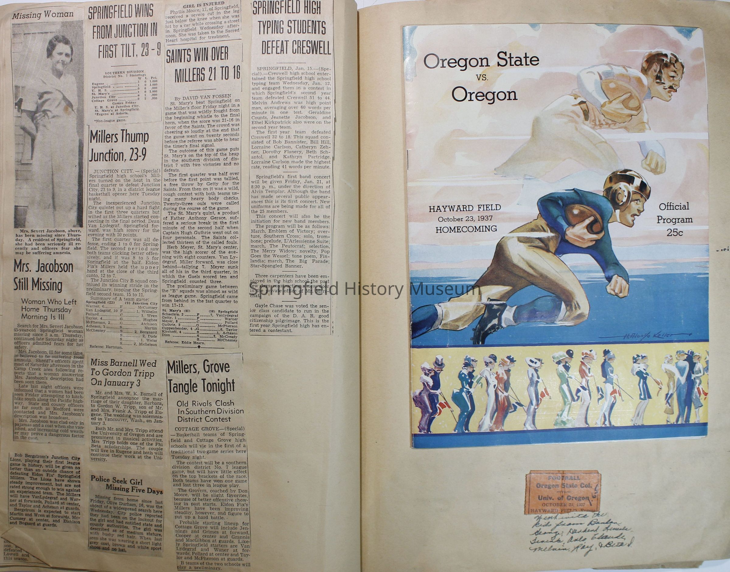 Scrapbook created by June Moore McPherson during her time at Springfield High School. This is volume one of two volumes of scrapbooks. Includes newspaper clippings, postcards, paper ephemera, and other artifacts related to Springfield High School beginning with her freshman year in 1935.