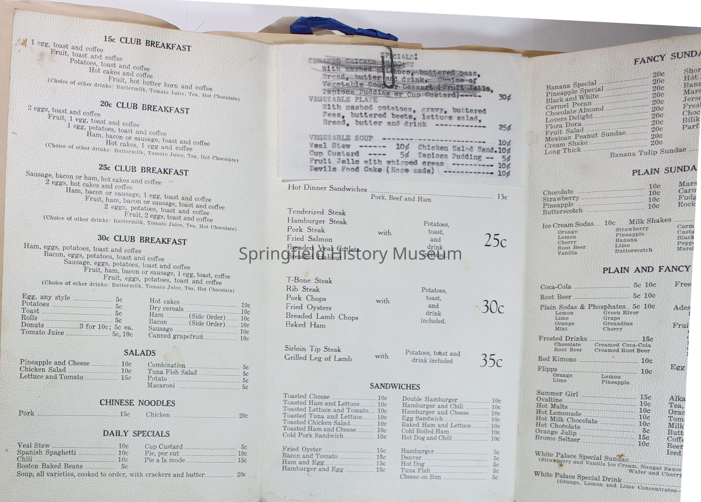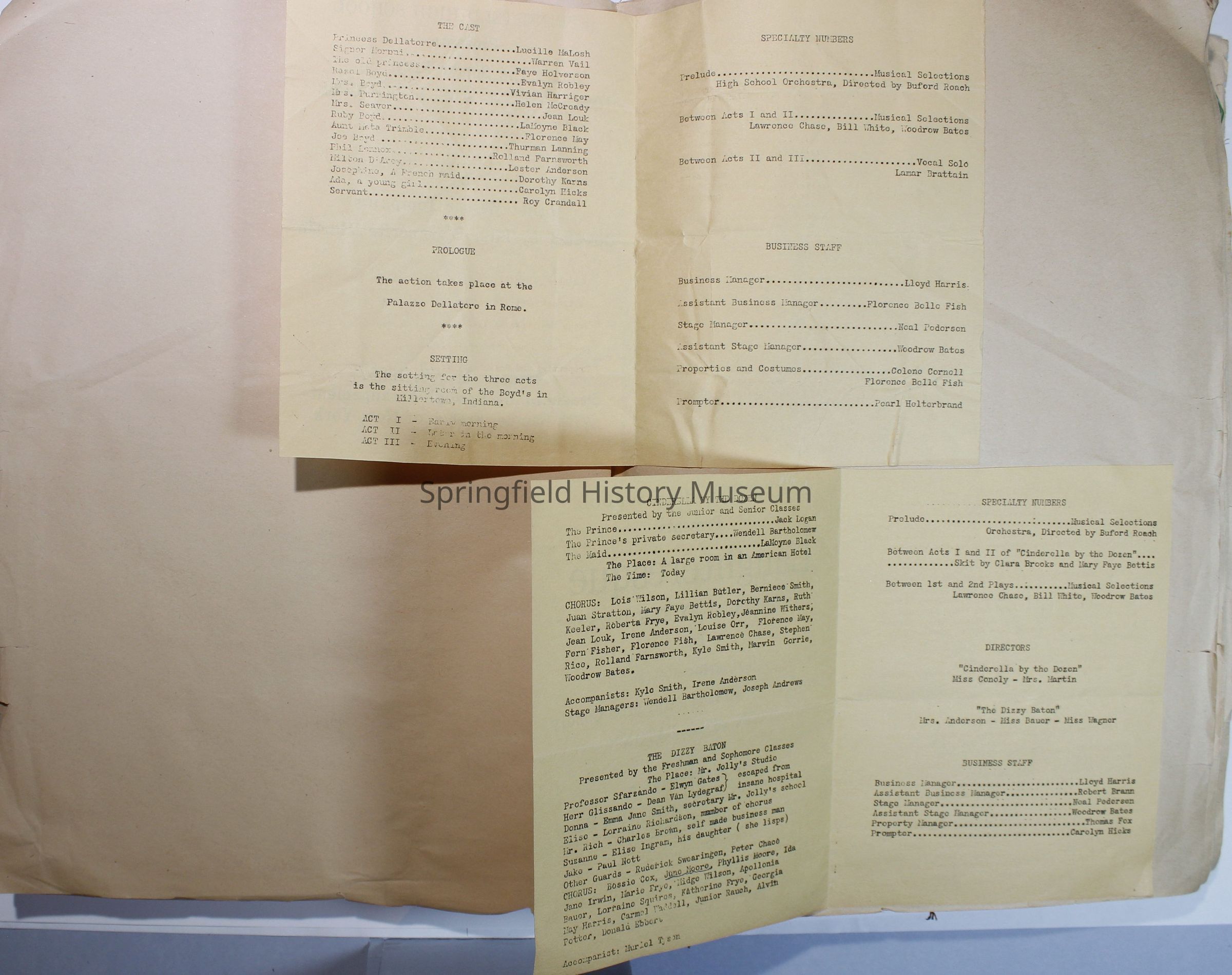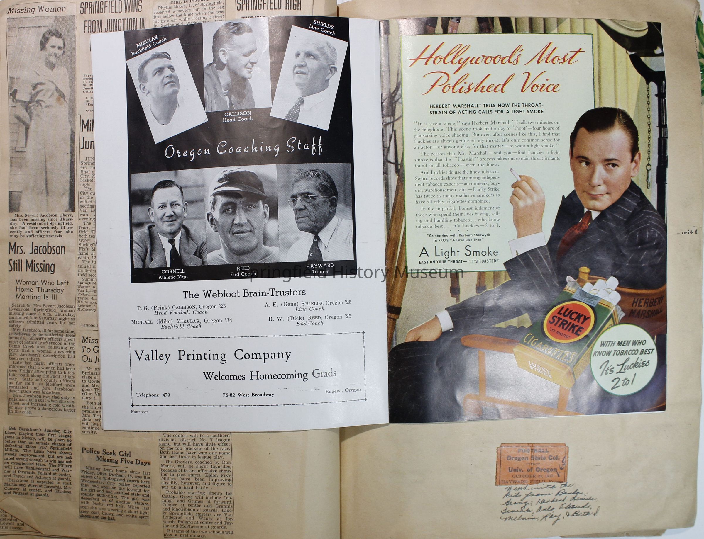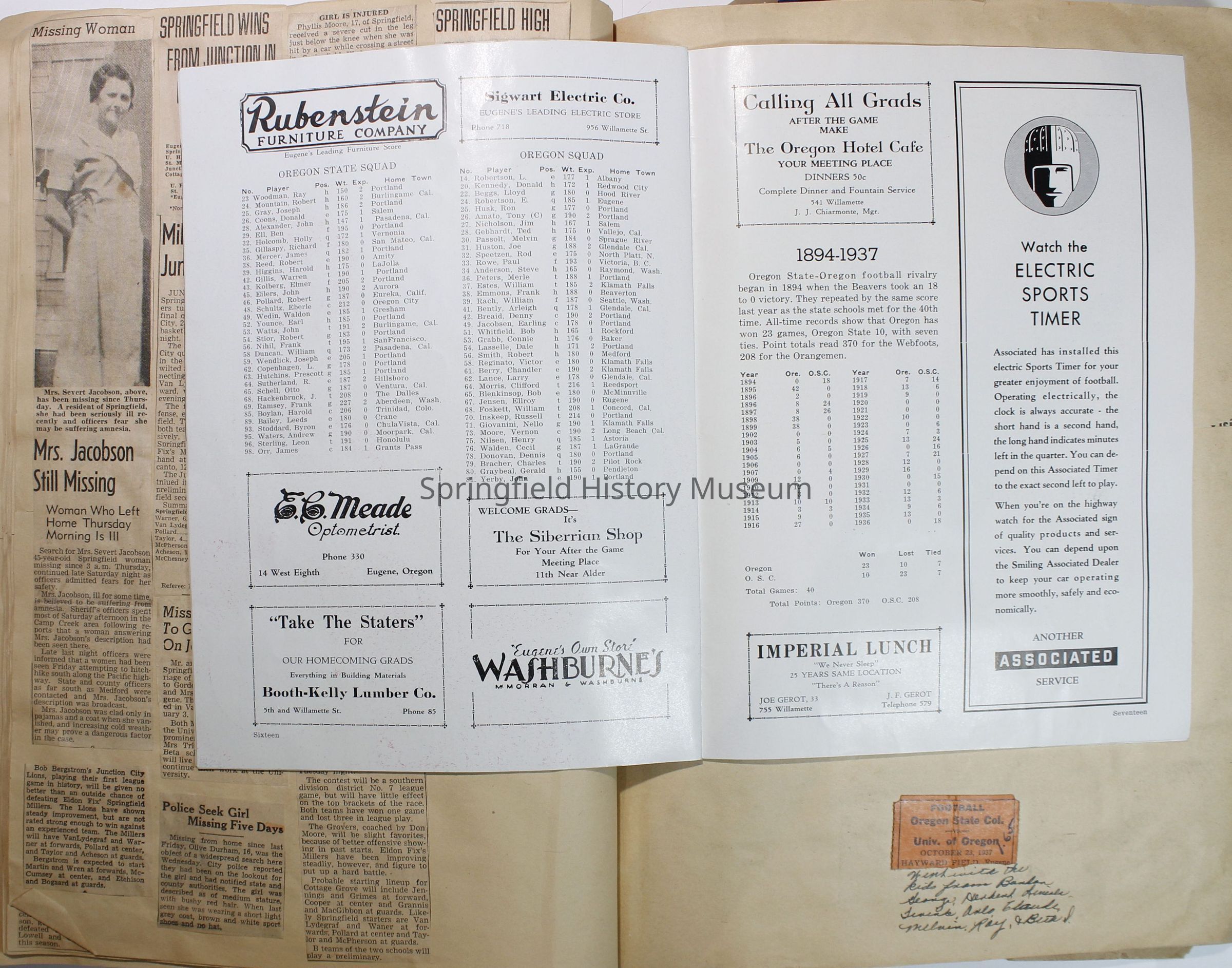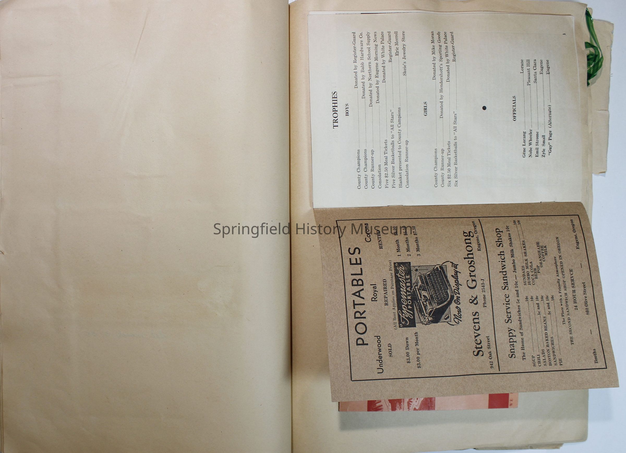 Scrapbook created by June Moore McPherson during her time at Springfield High School. This is volume one of two volumes of scrapbooks. Includes newspaper clippings, postcards, paper ephemera, and other artifacts related to Springfield High School beginning with her freshman year in 1935.