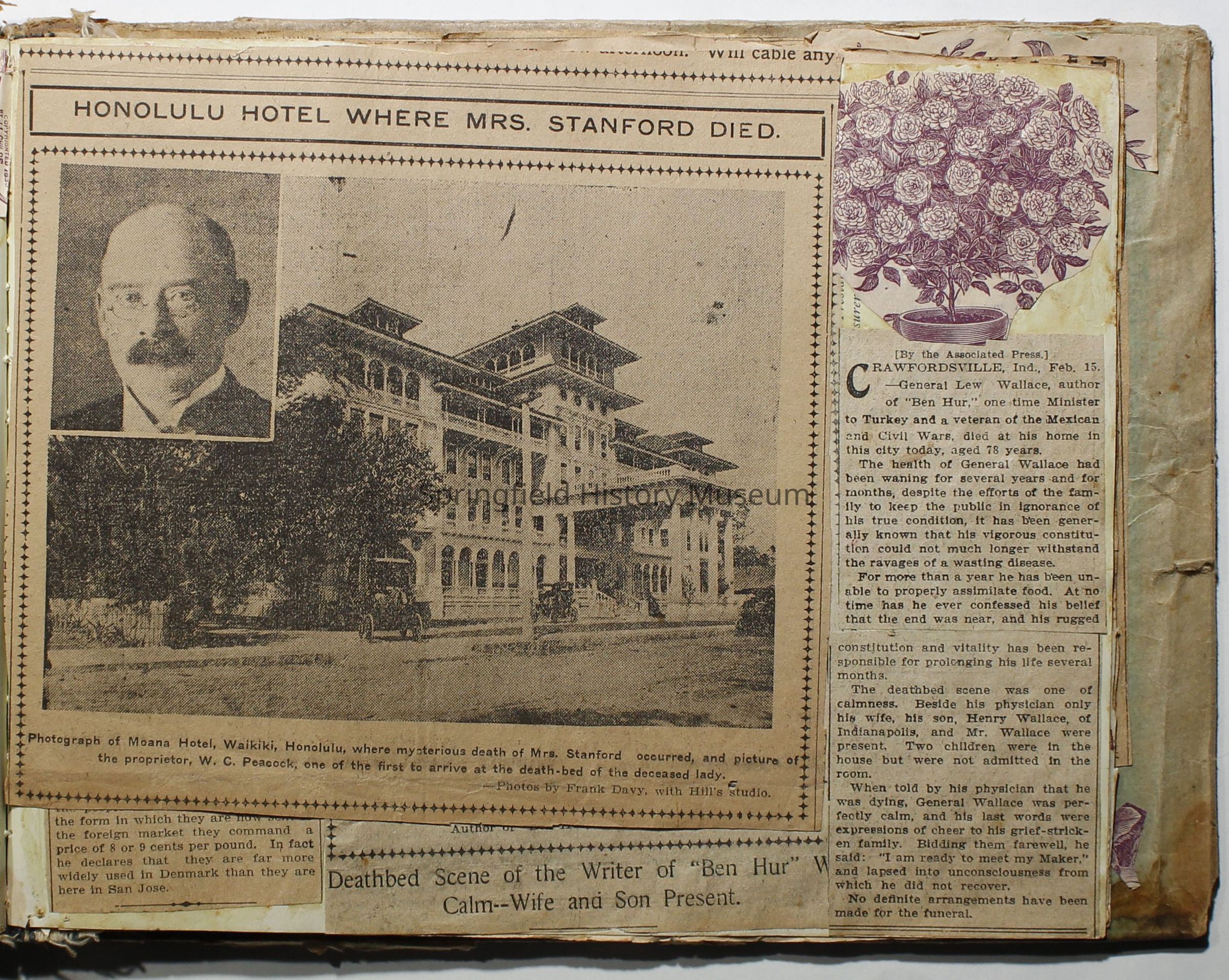 Scrapbook made by Virginia Reynolds with clippings about people and San Jose, CA, circa 1900. Cover is handmade of tissue with a pink rose glued in center. Flower cutouts used on every page.Collection