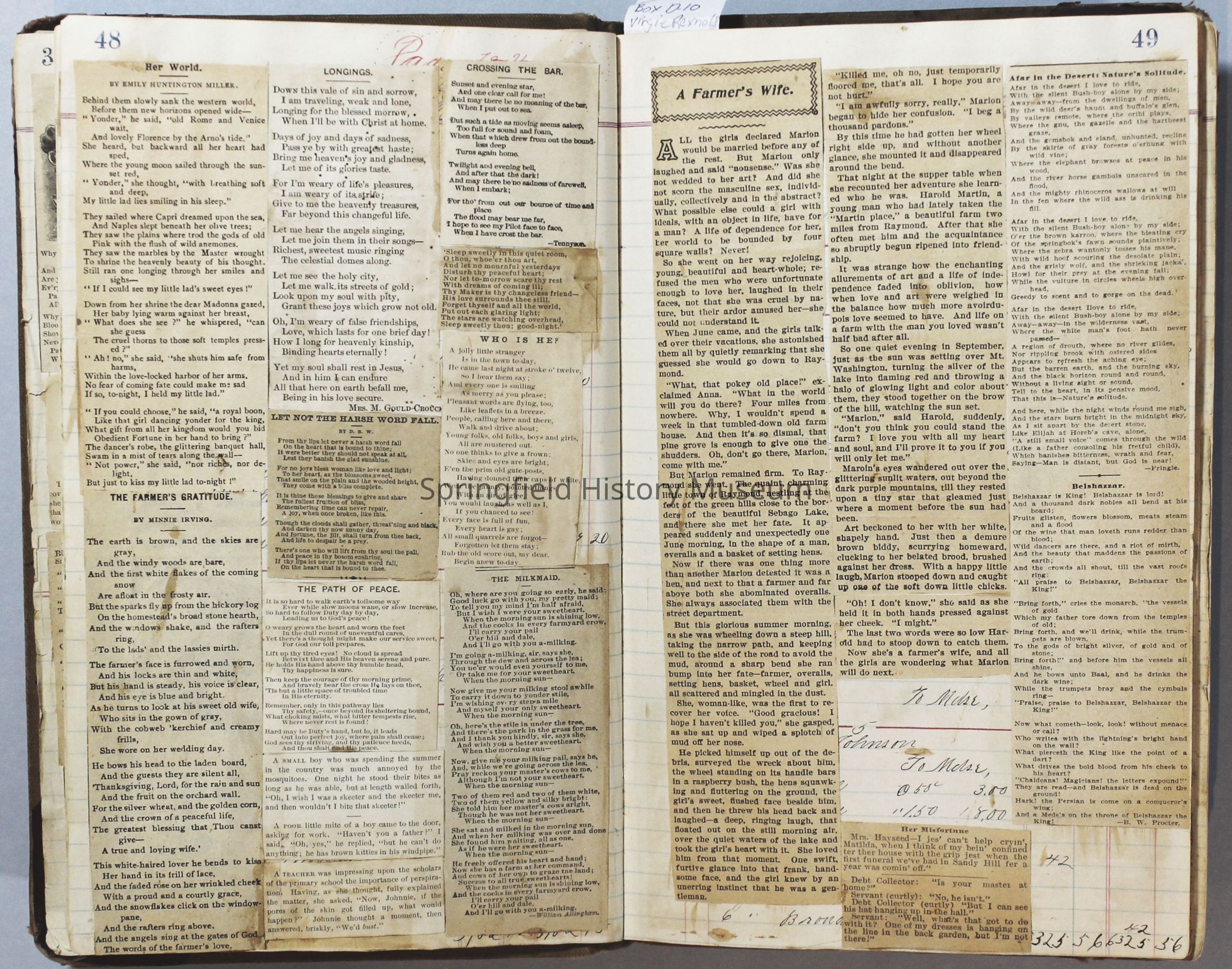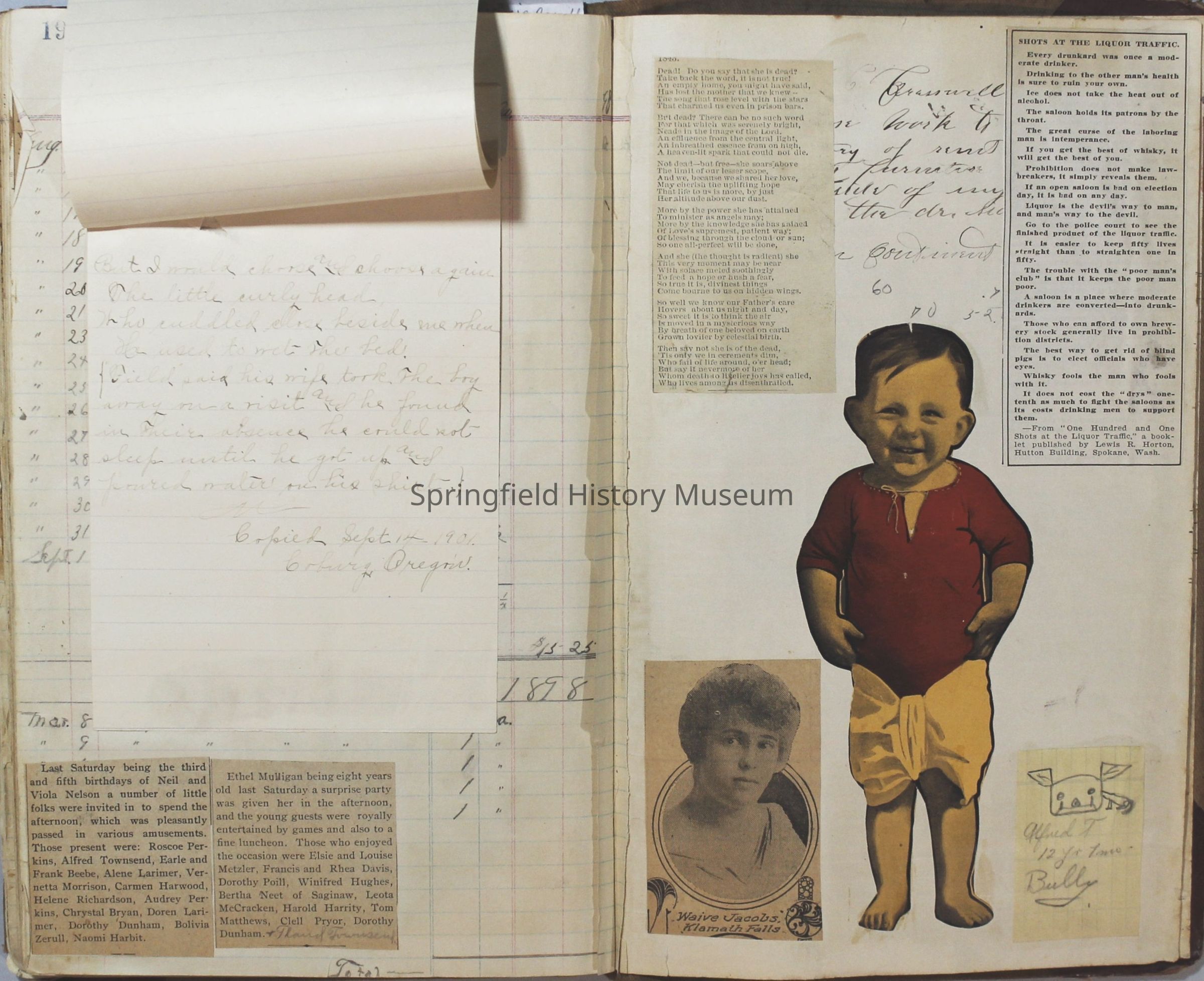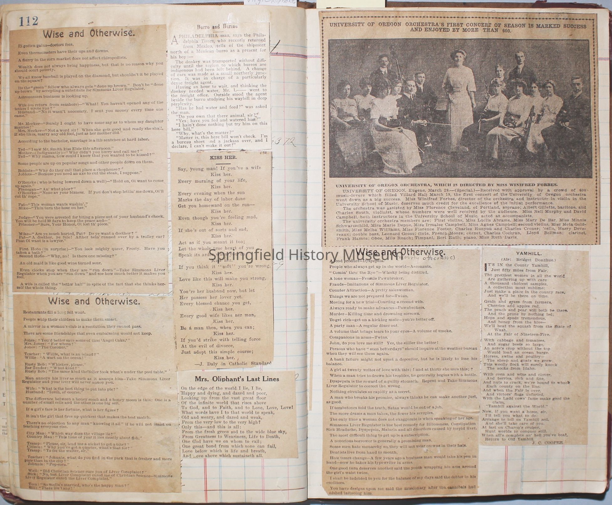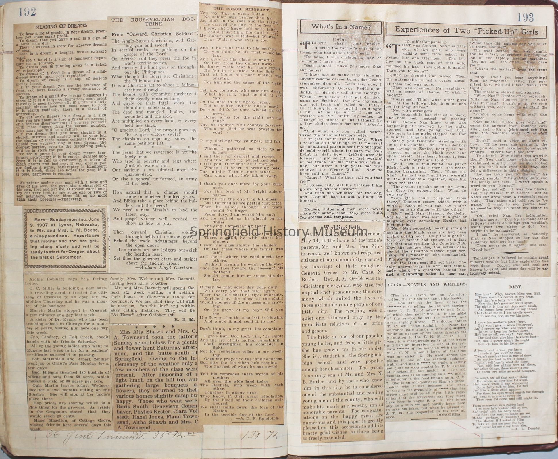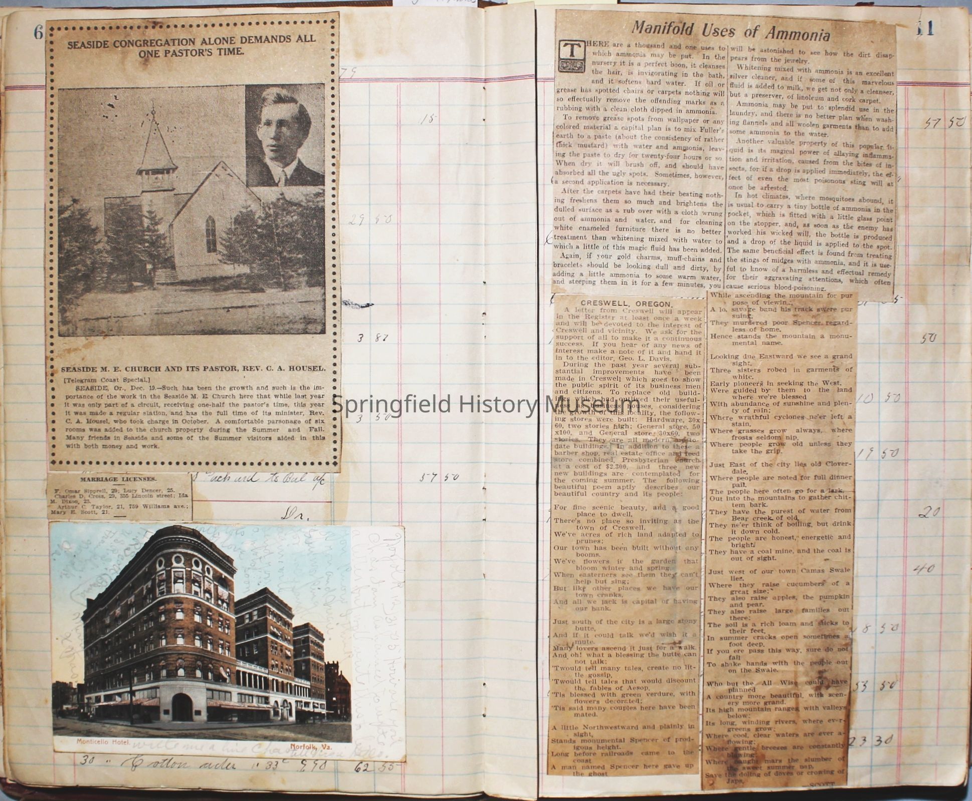 Content highlights: newspaper clippings about Cresswell, Springfield and surrounding area, Portland and a few national level articles (weddings, babies, obituaries, events, announcements, poems, songs, sayings, advertisements etc.). Many clippings about Townsend and Shaub families (family history resource). Also contains quilting and embroidery pattern clippings.