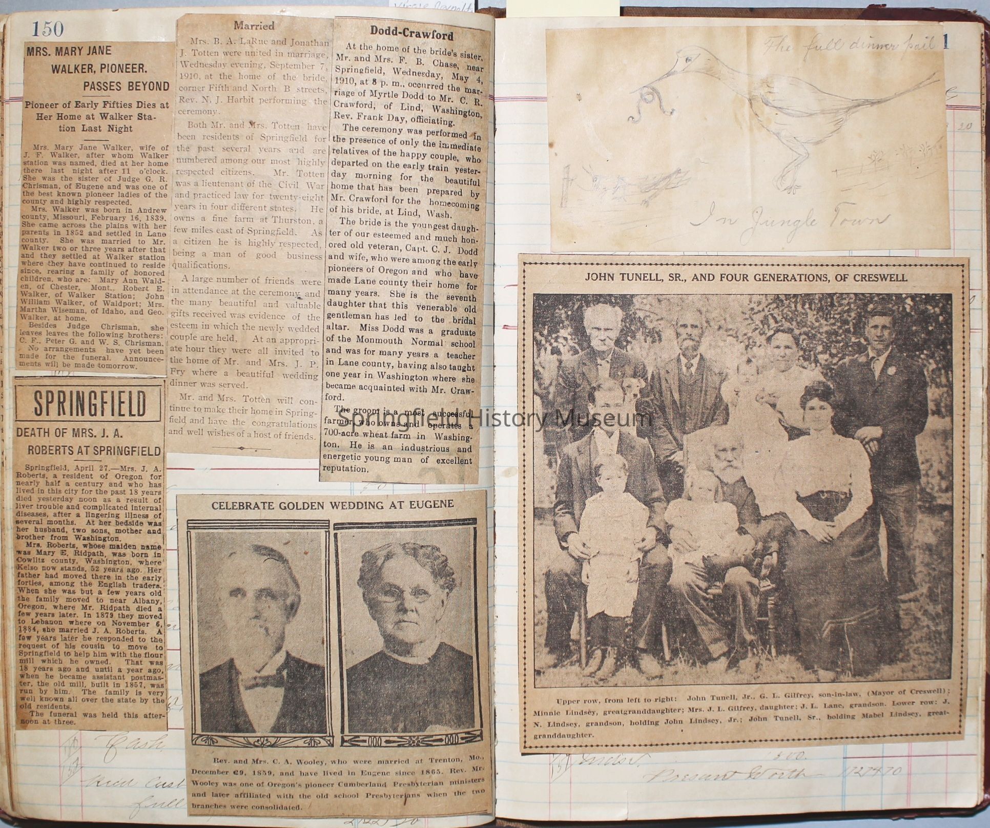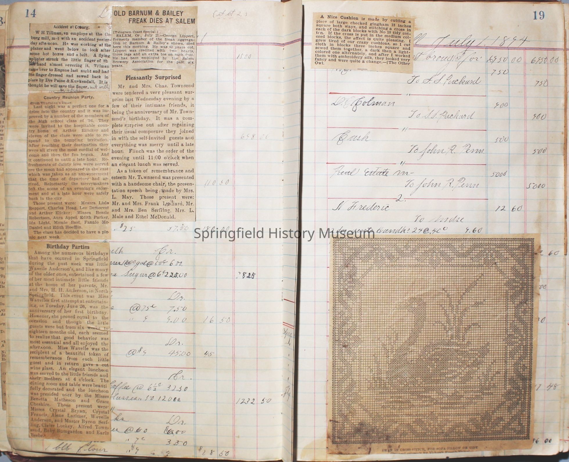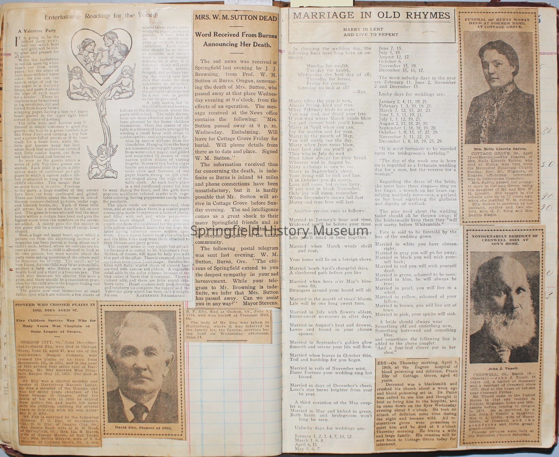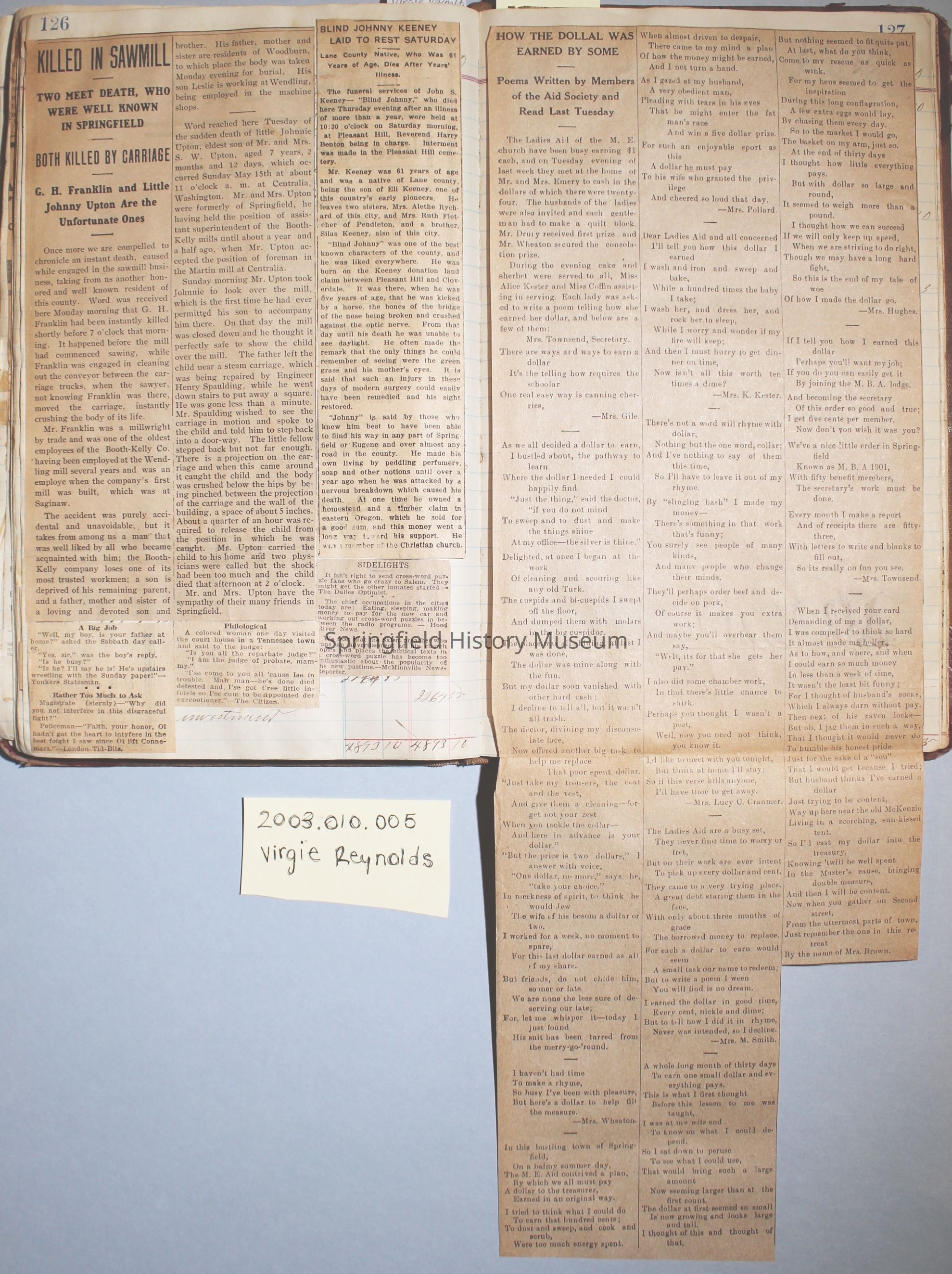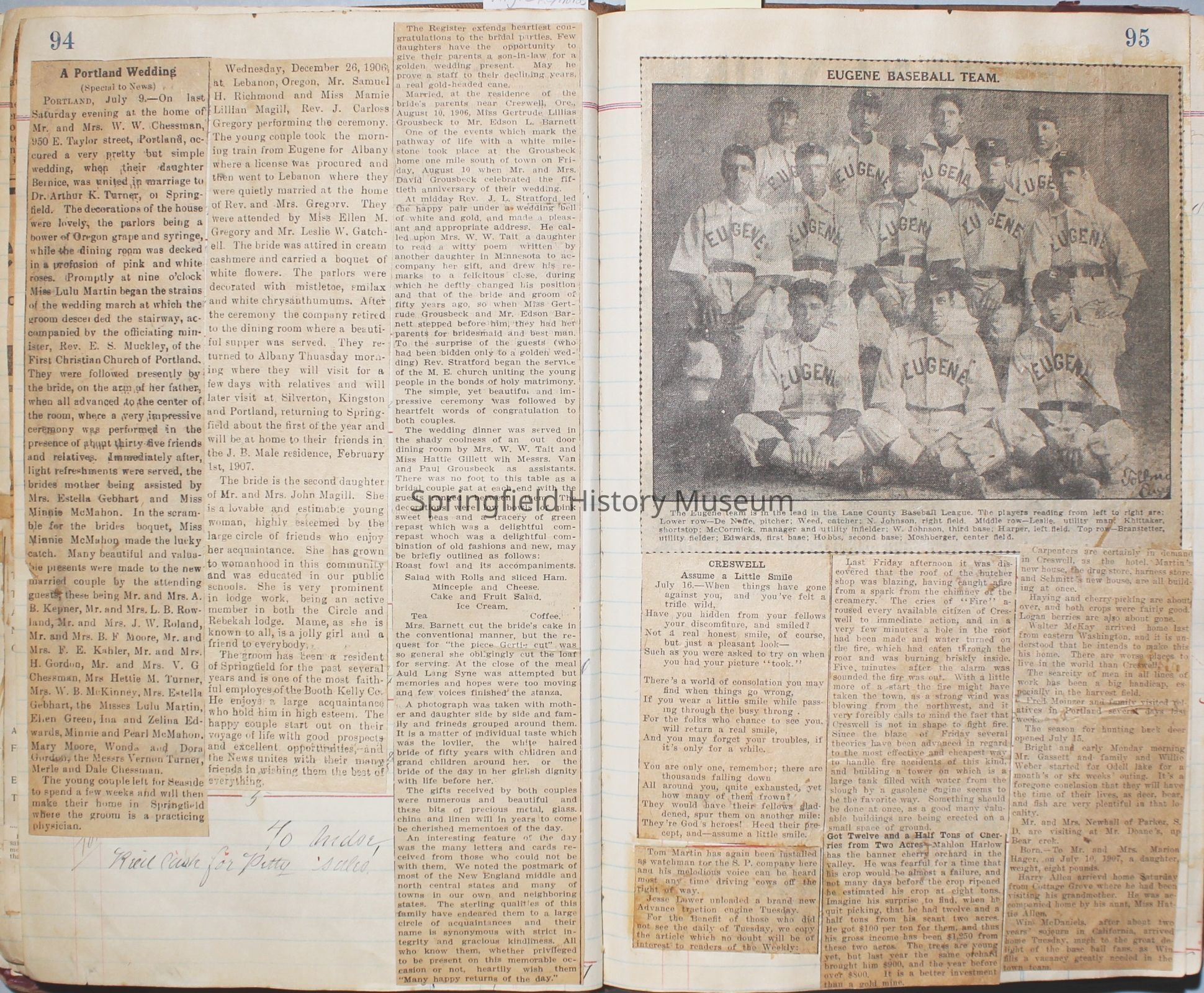 Content highlights: newspaper clippings about Cresswell, Springfield and surrounding area, Portland and a few national level articles (weddings, babies, obituaries, events, announcements, poems, songs, sayings, advertisements etc.). Many clippings about Townsend and Shaub families (family history resource). Also contains quilting and embroidery pattern clippings.