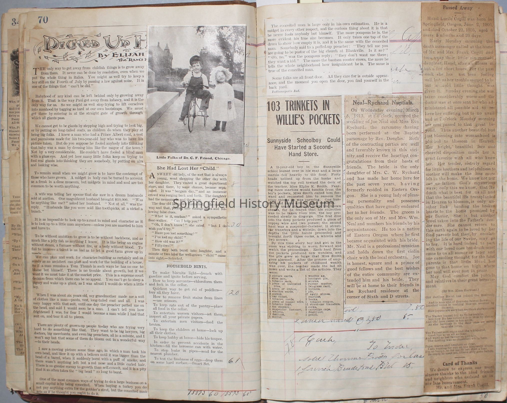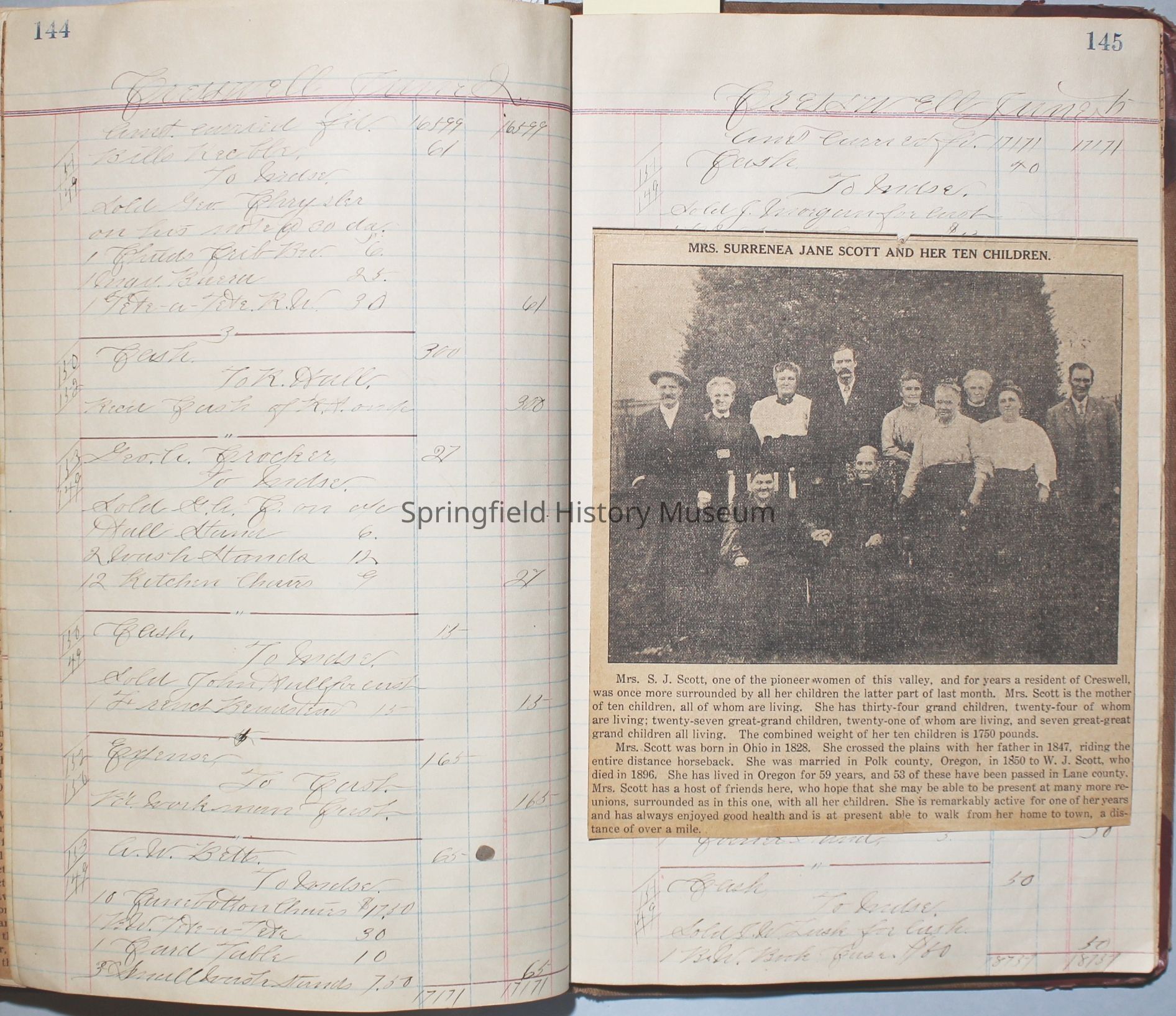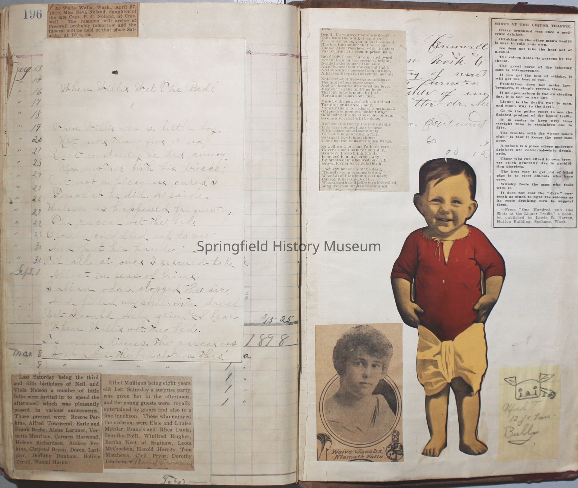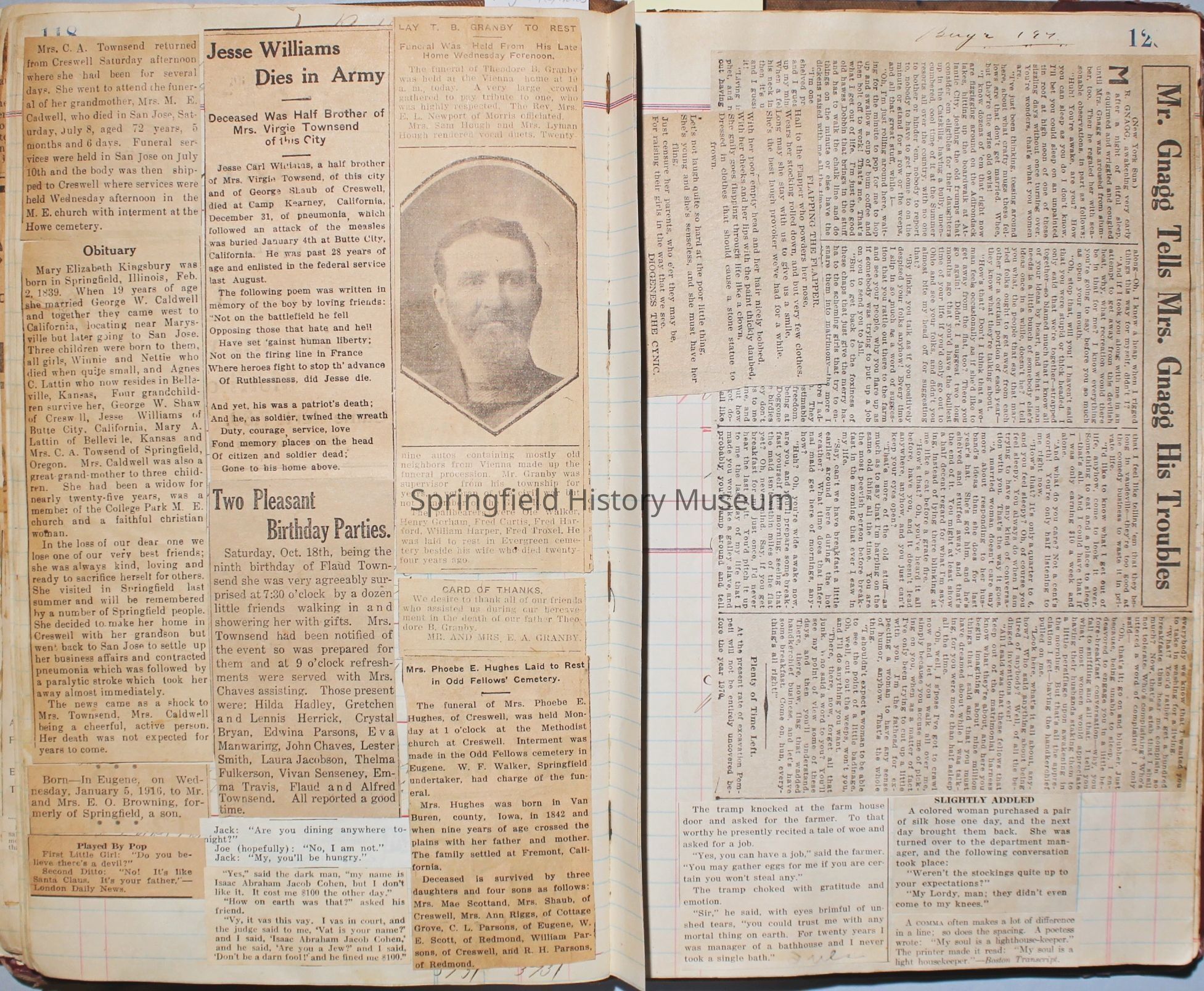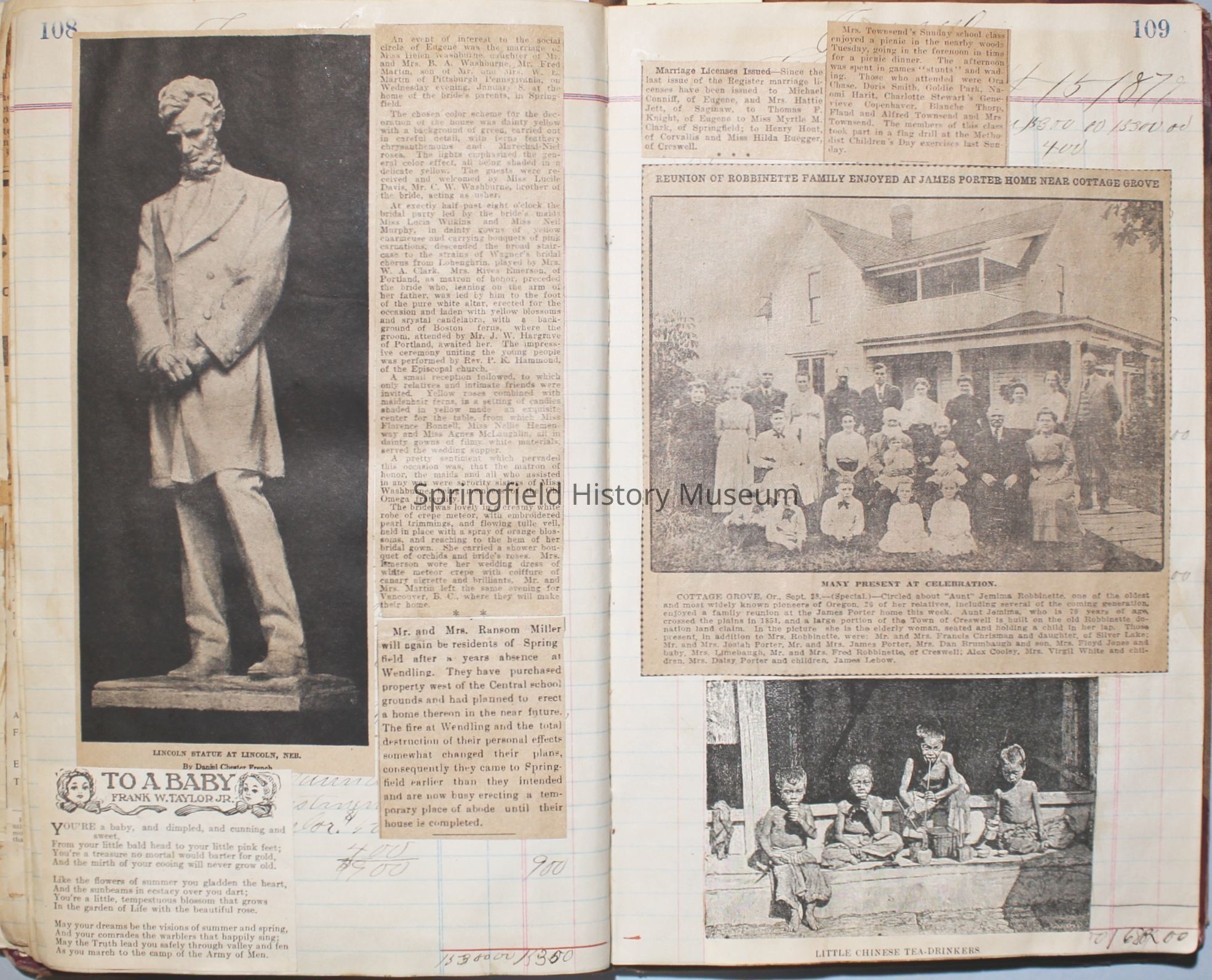 Content highlights: newspaper clippings about Cresswell, Springfield and surrounding area, Portland and a few national level articles (weddings, babies, obituaries, events, announcements, poems, songs, sayings, advertisements etc.). Many clippings about Townsend and Shaub families (family history resource). Also contains quilting and embroidery pattern clippings.