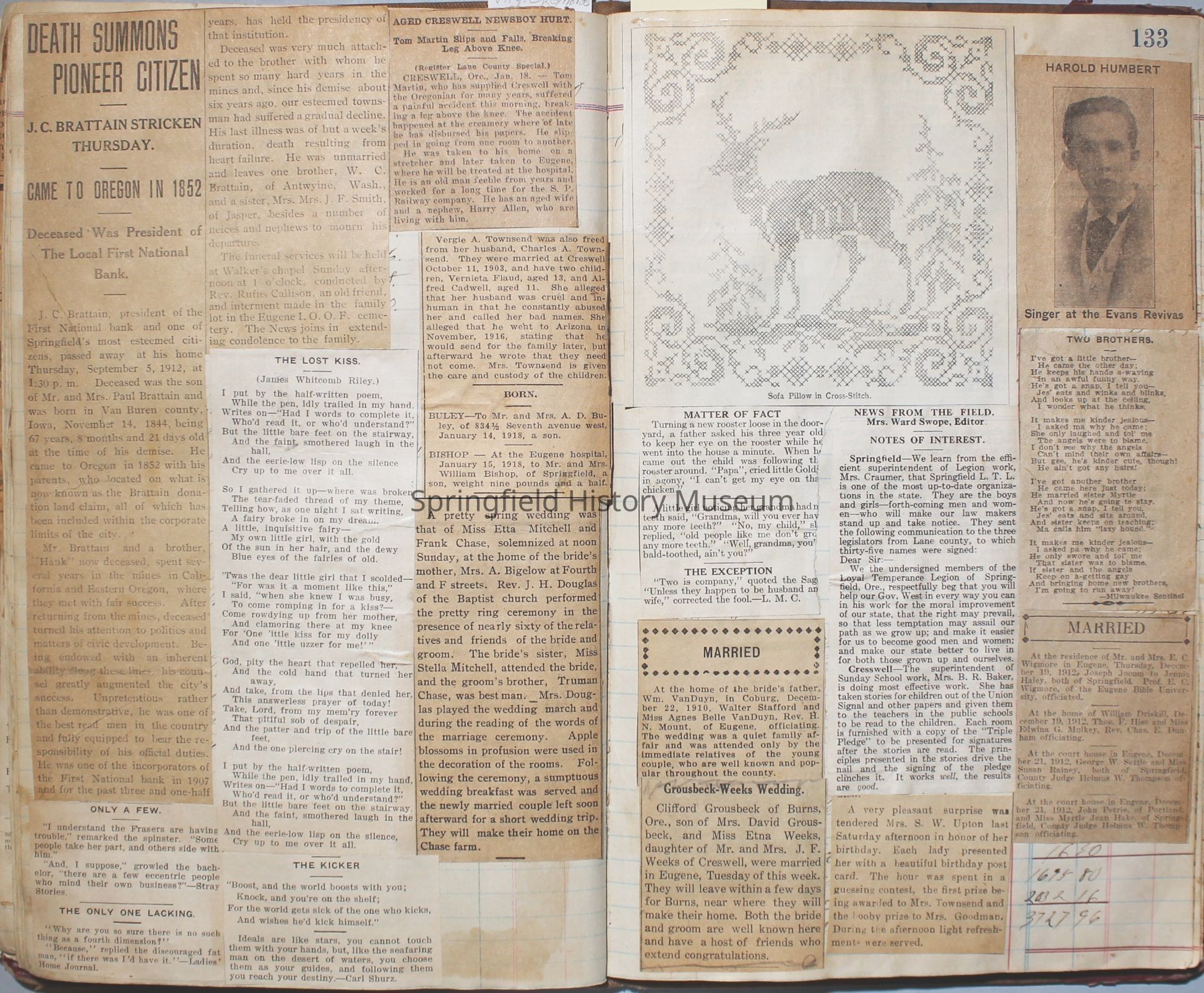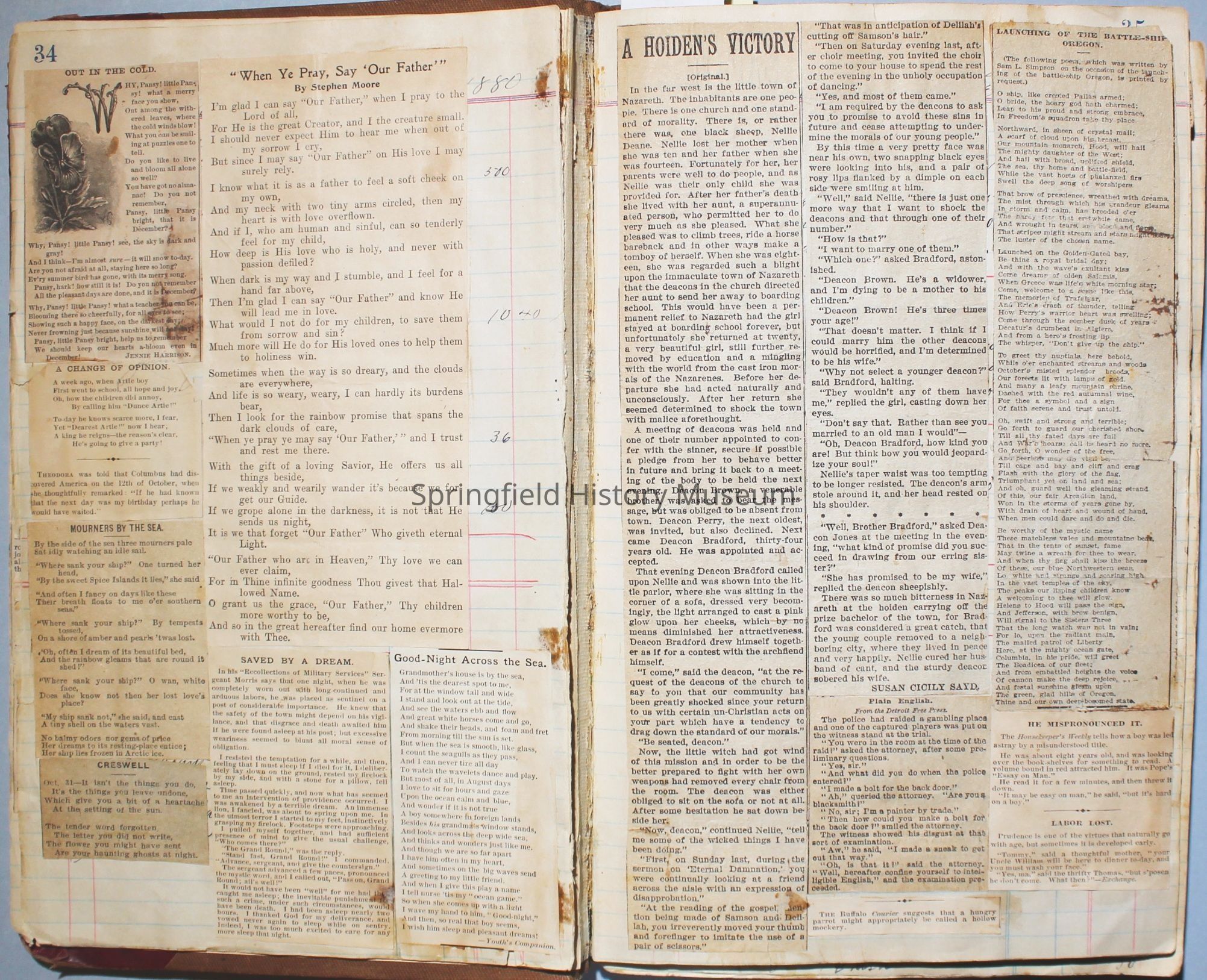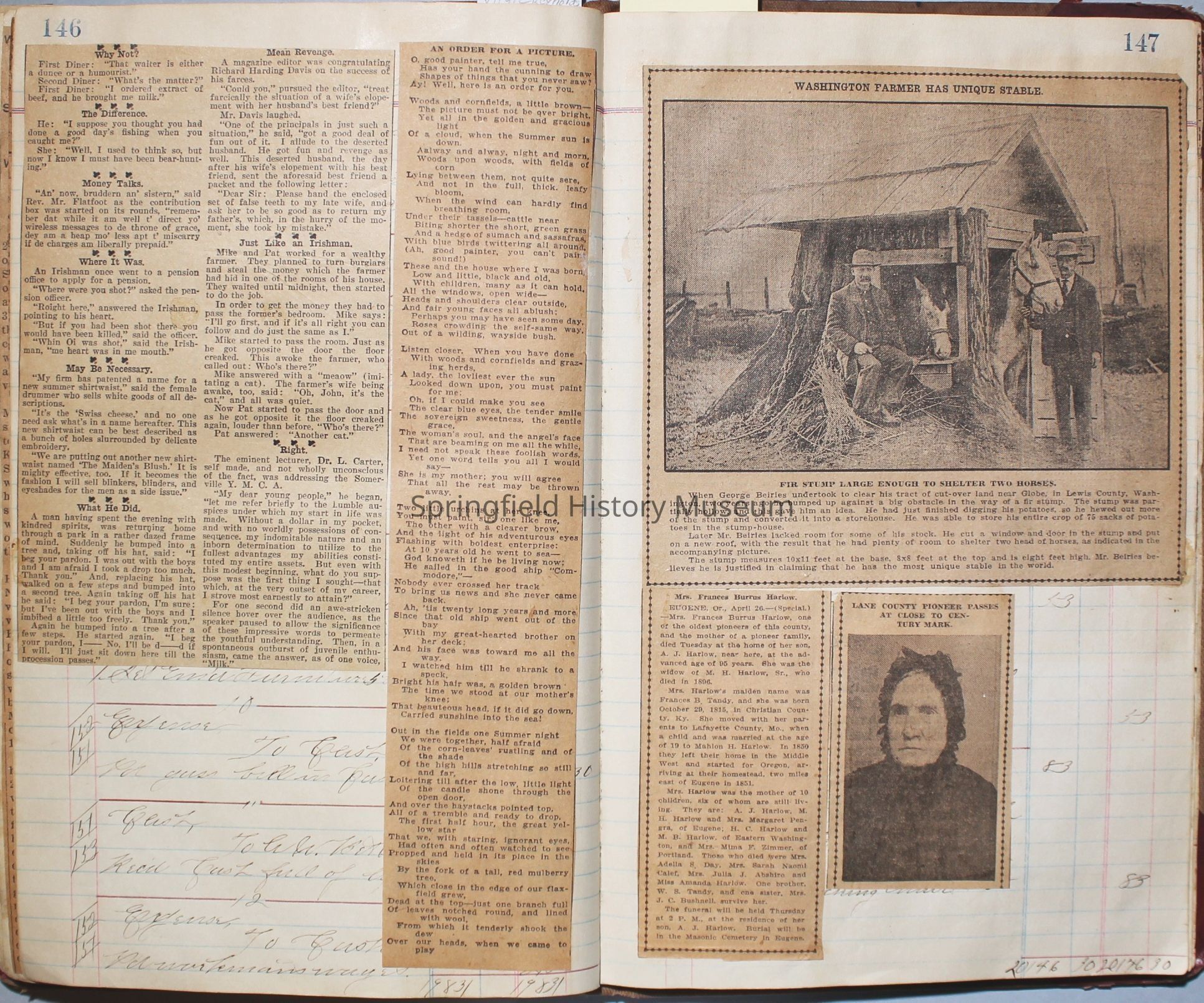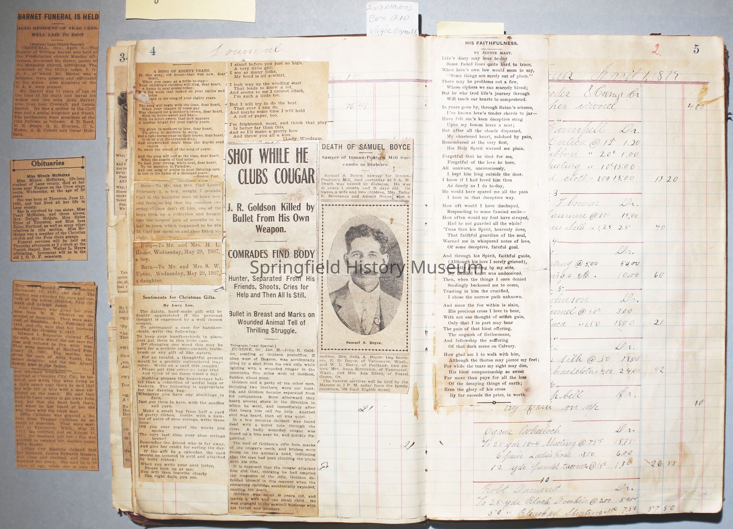Content highlights: newspaper clippings about Cresswell, Springfield and surrounding area, Portland and a few national level articles (weddings, babies, obituaries, events, announcements, poems, songs, sayings, advertisements etc.). Many clippings about Townsend and Shaub families (family history resource). Also contains quilting and embroidery pattern clippings.
