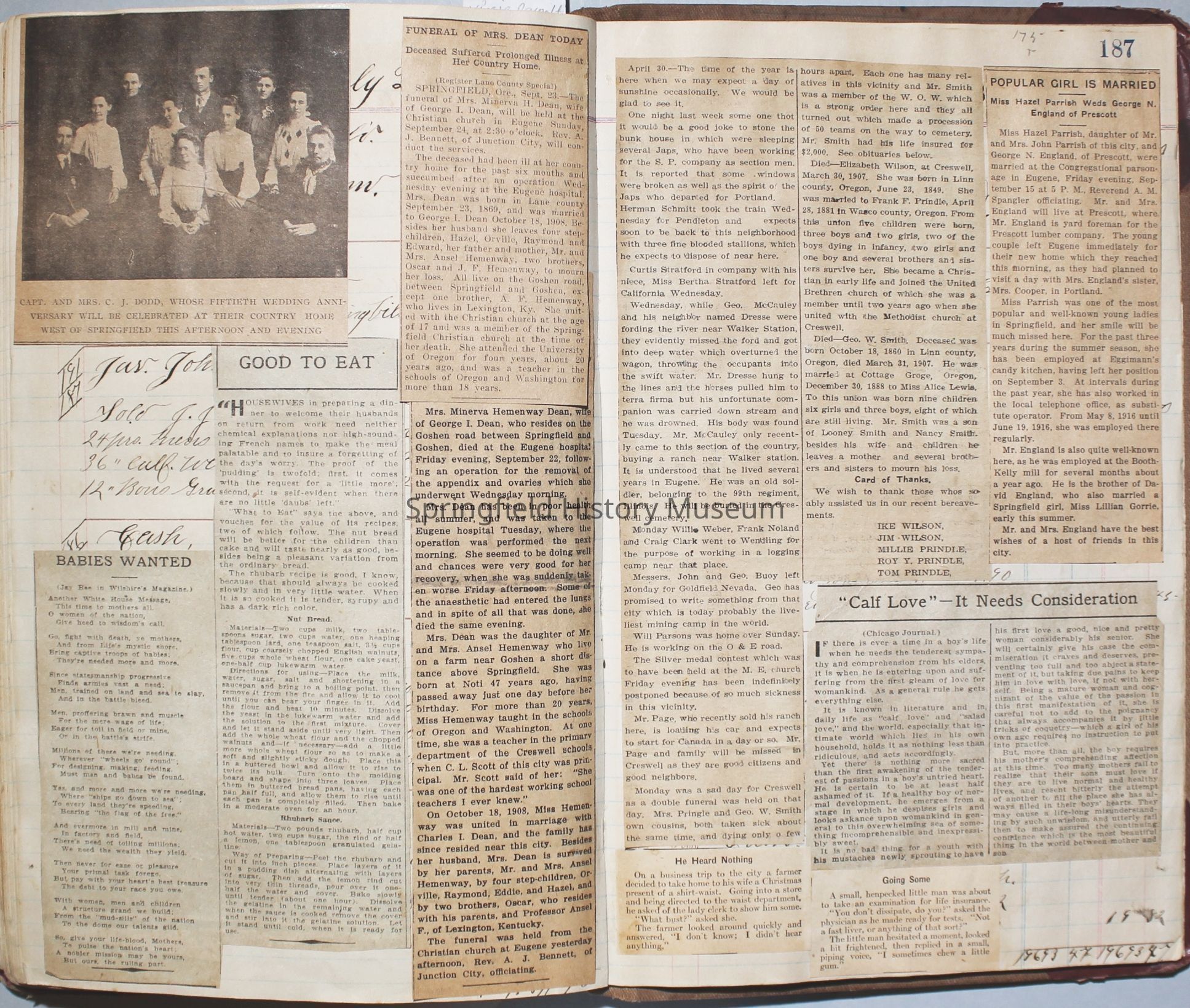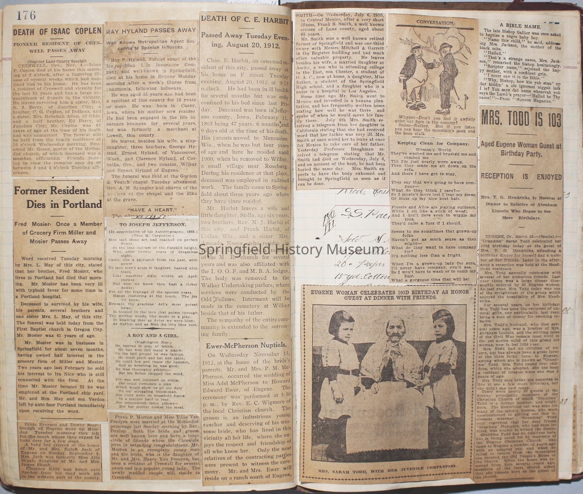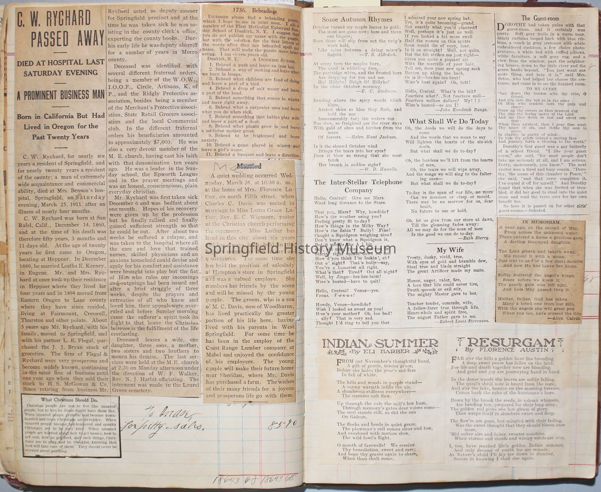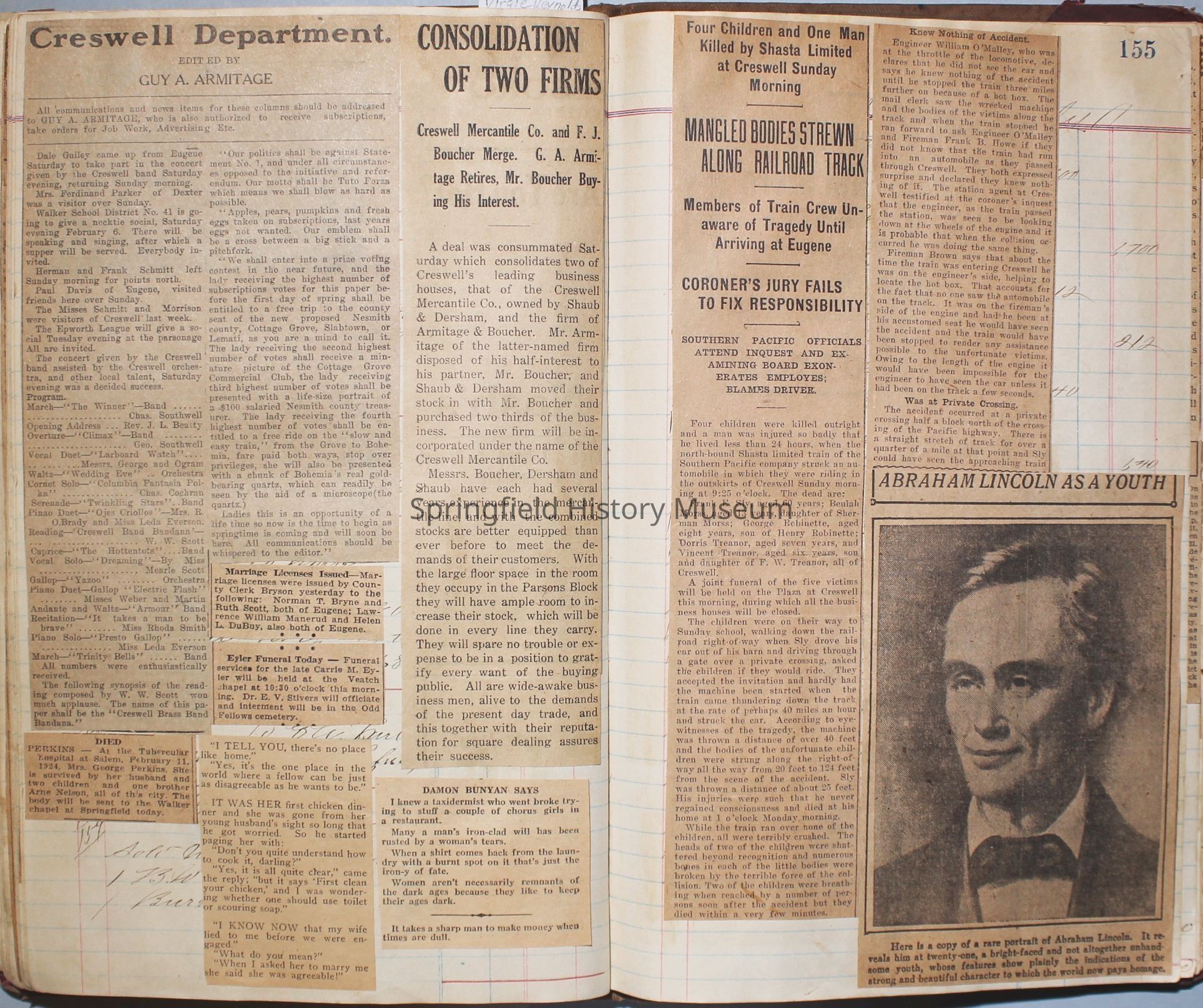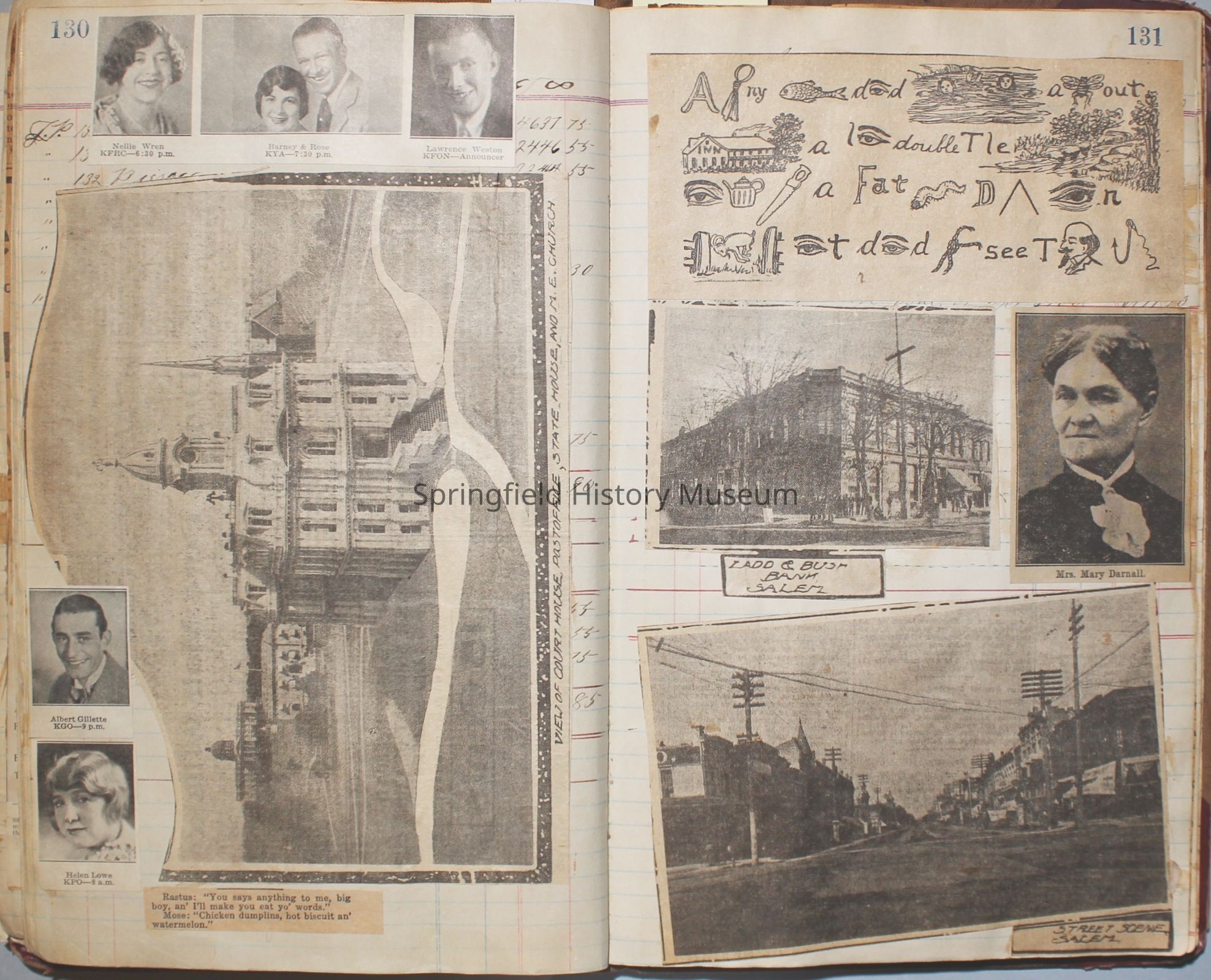 Content highlights: newspaper clippings about Cresswell, Springfield and surrounding area, Portland and a few national level articles (weddings, babies, obituaries, events, announcements, poems, songs, sayings, advertisements etc.). Many clippings about Townsend and Shaub families (family history resource). Also contains quilting and embroidery pattern clippings.